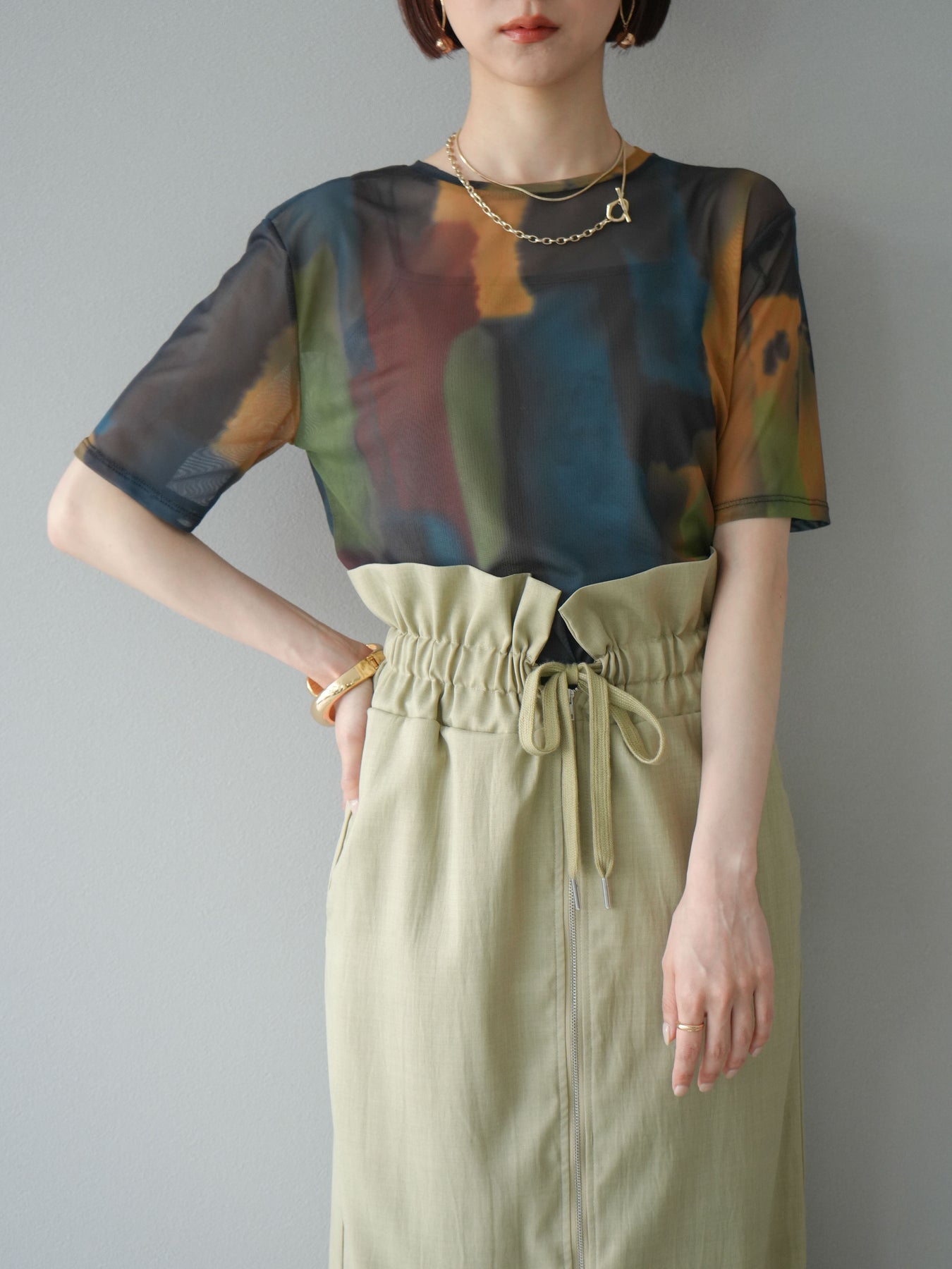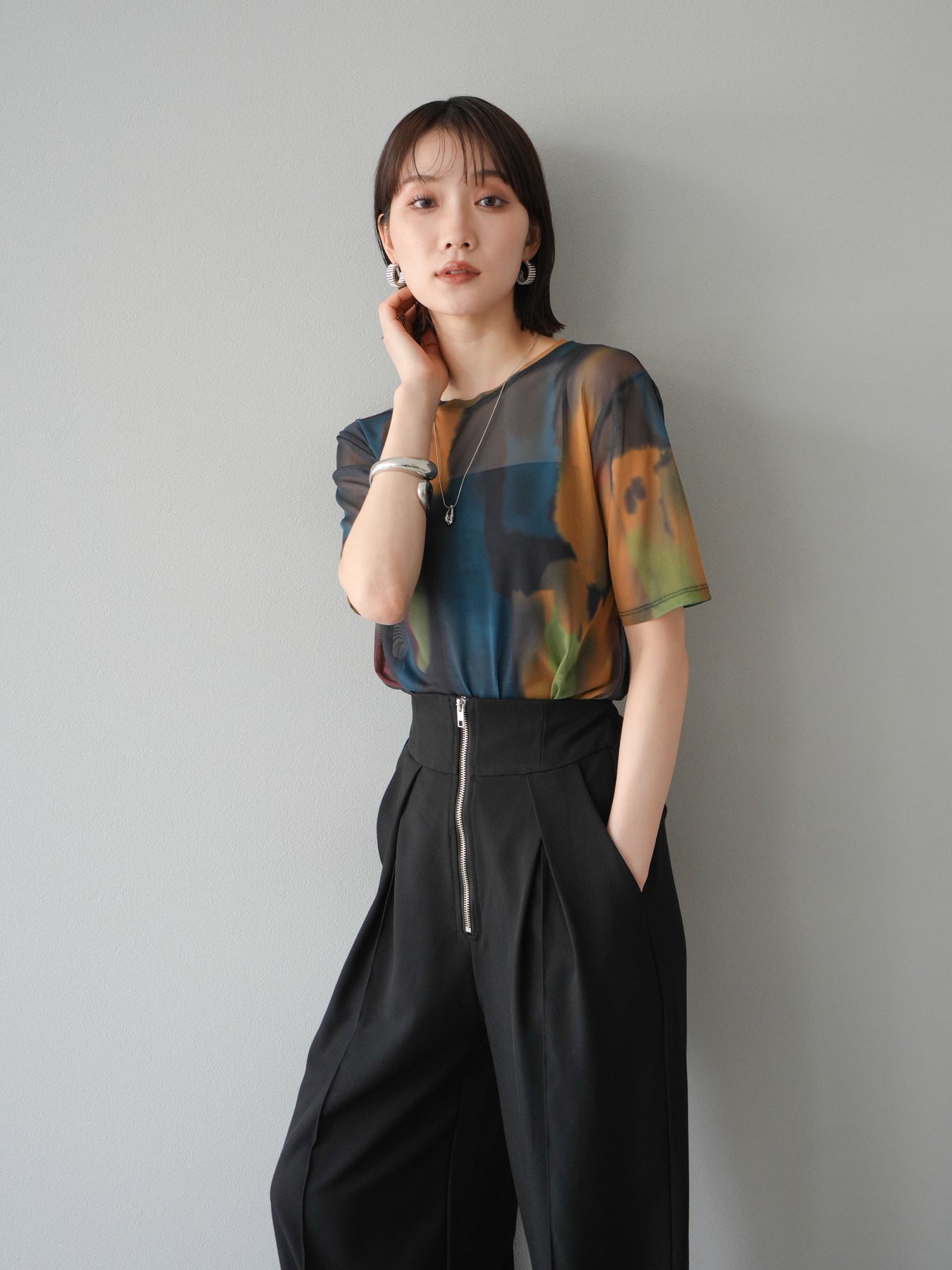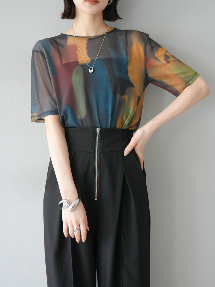 水彩画のような柔らかなタッチで描かれたアートプリントが目を惹く、水彩アートシアーTシャツ。軽やかな透け感のあるシアー素材が、トレンド感と抜け感を演出し、1枚でスタイリングに華やかさをプラスしてくれます。程よくフィットするシルエットで、インナーとのレイヤードも楽しめるアイテム。カジュアルなボトムと合わせても、どこか洗練された印象に仕上がる大人のためのデザインTシャツです。 ※ボトムス、キャミソール(インナー)以外の商品は一律でインナーは付属していません。
