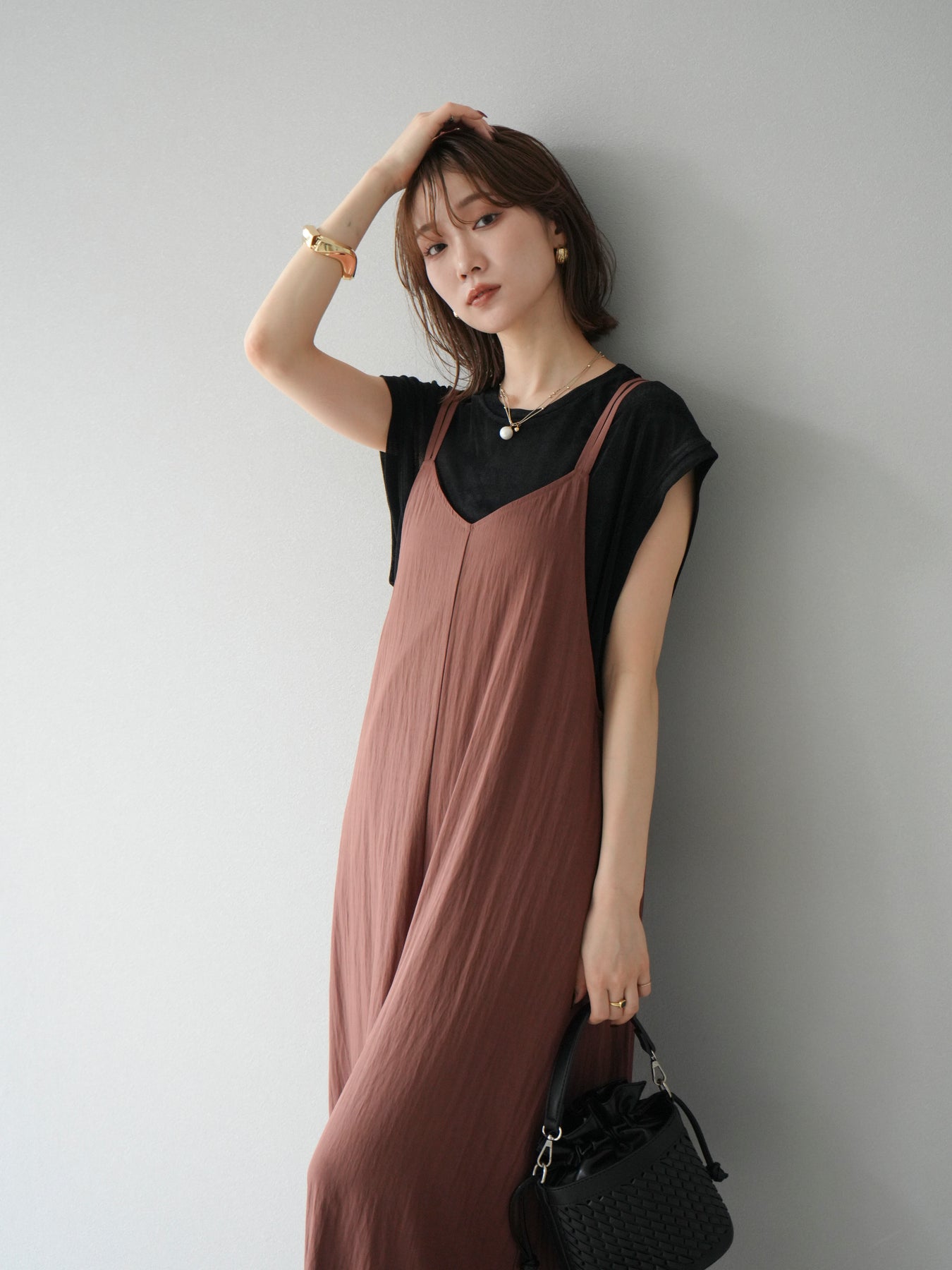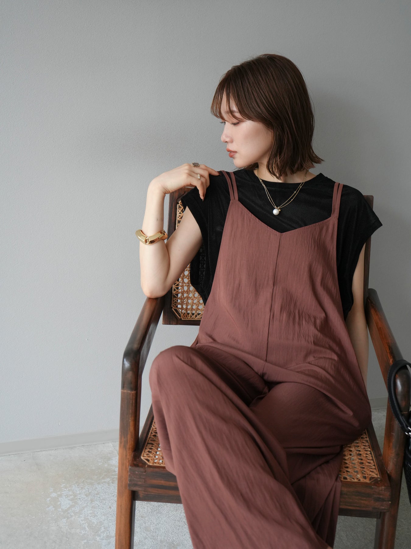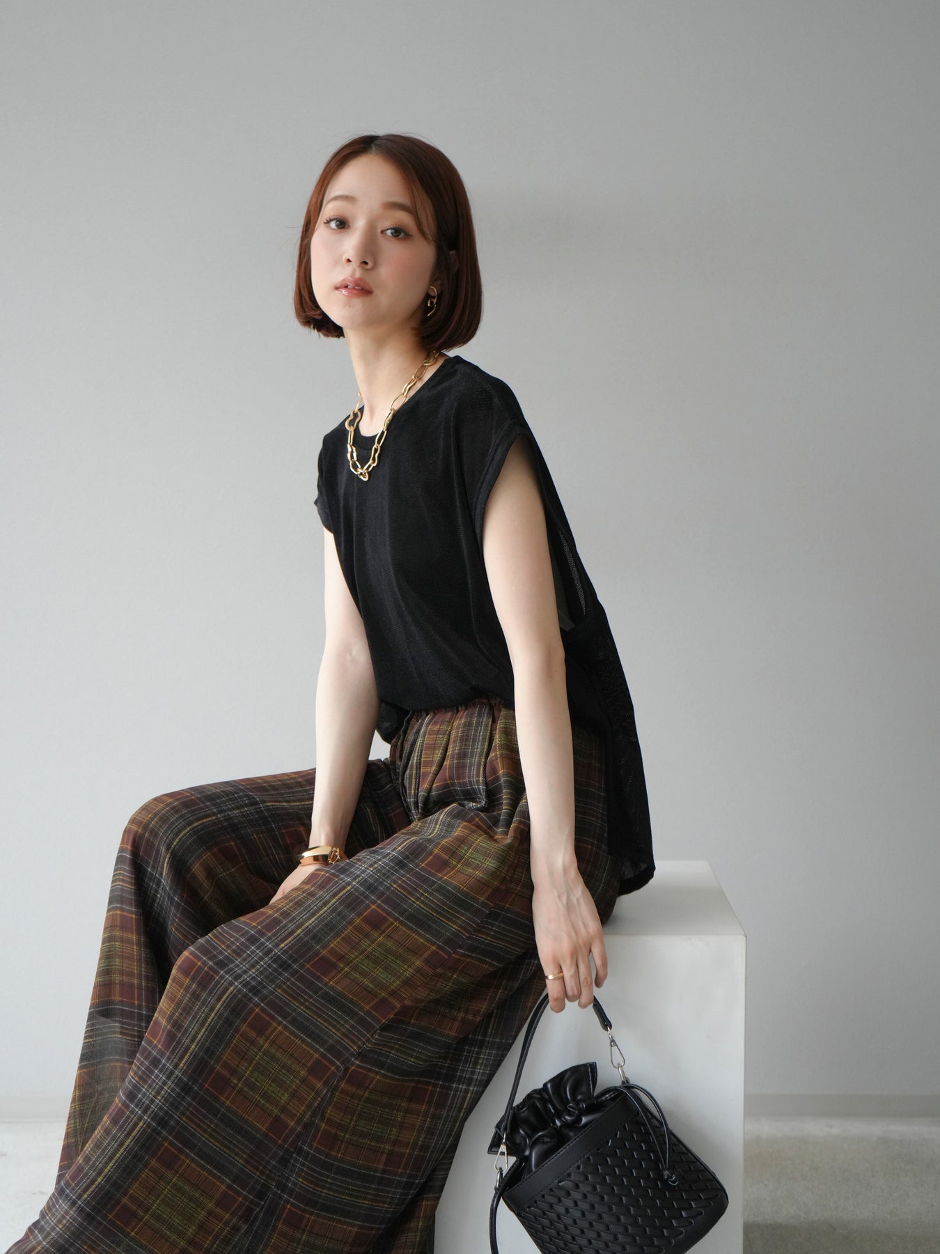 上品な透け感と繊細なフロッキー加工が魅力の、ルーズシルエットノースリーブTシャツ。 軽やかなシアーベロア素材に、マットなフロッキーを施すことで、華やかさとモード感を両立。ほどよく身体から離れるルーズなシルエットが、リラクシーながらも抜け感のあるスタイルを演出します。 Tシャツ感覚でさらりと着られつつ、インナー使いにもぴったりな1枚。ジャンプスーツやキャミワンピのインにレイヤードしても、モードな印象に仕上がります。 カジュアルとフェミニンの絶妙なバランスで、1枚で着映えする今季の主役トップスです。