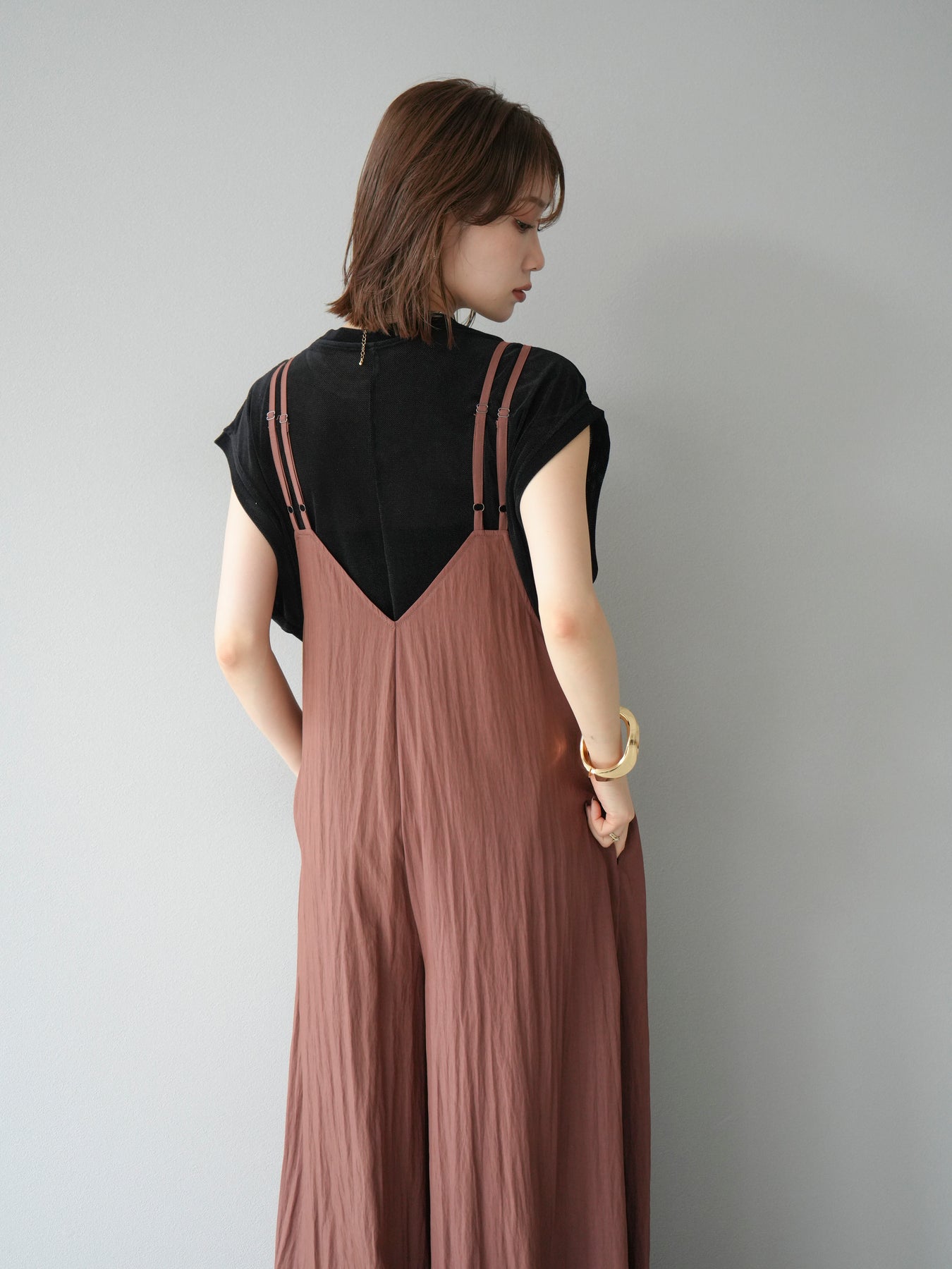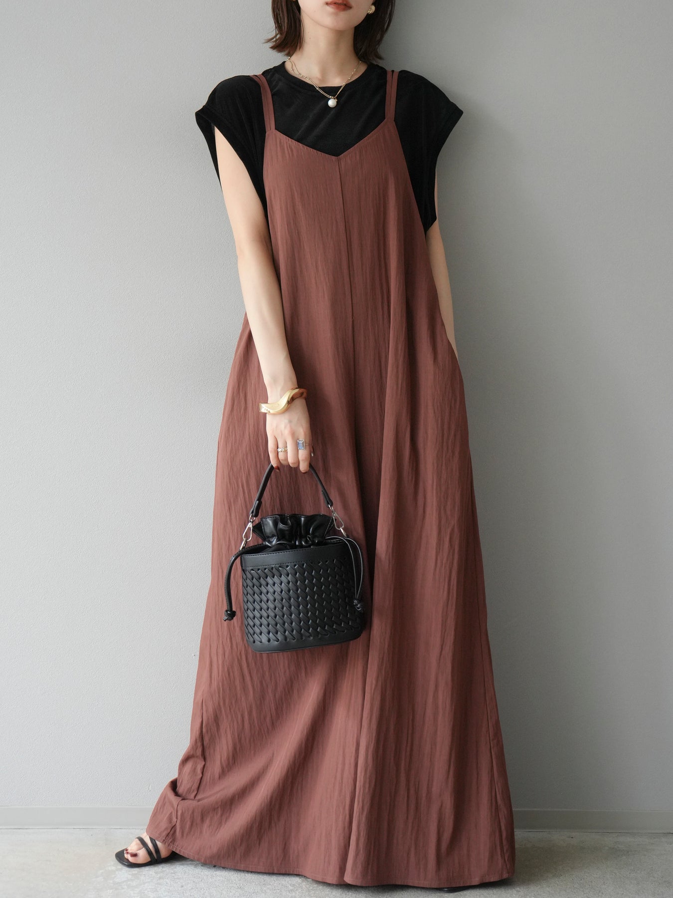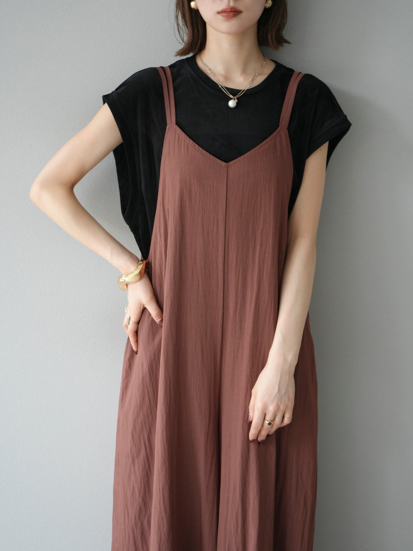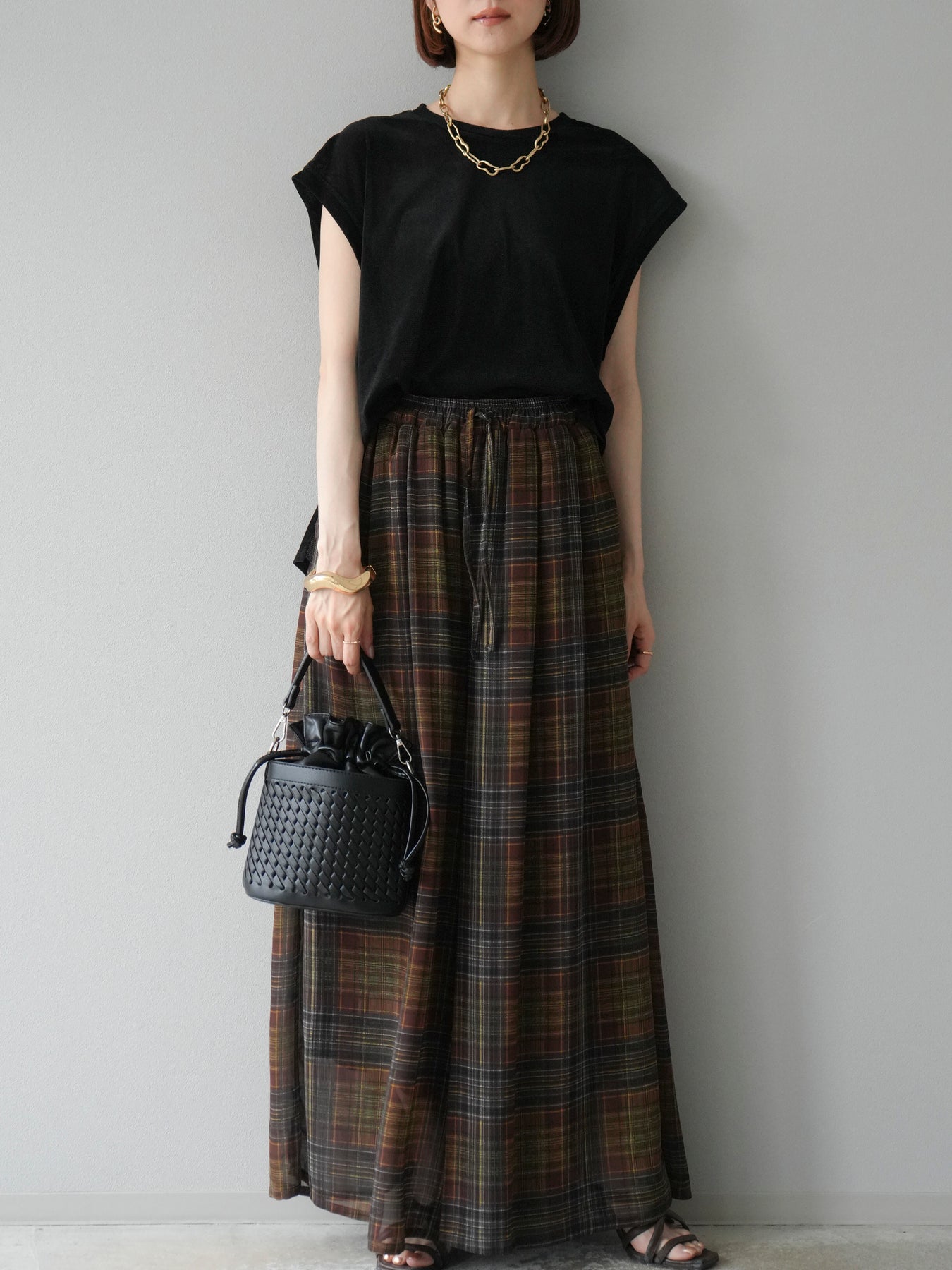 上品な透け感と繊細なフロッキー加工が魅力の、ルーズシルエットノースリーブTシャツ。 軽やかなシアーベロア素材に、マットなフロッキーを施すことで、華やかさとモード感を両立。ほどよく身体から離れるルーズなシルエットが、リラクシーながらも抜け感のあるスタイルを演出します。 Tシャツ感覚でさらりと着られつつ、インナー使いにもぴったりな1枚。ジャンプスーツやキャミワンピのインにレイヤードしても、モードな印象に仕上がります。 カジュアルとフェミニンの絶妙なバランスで、1枚で着映えする今季の主役トップスです。