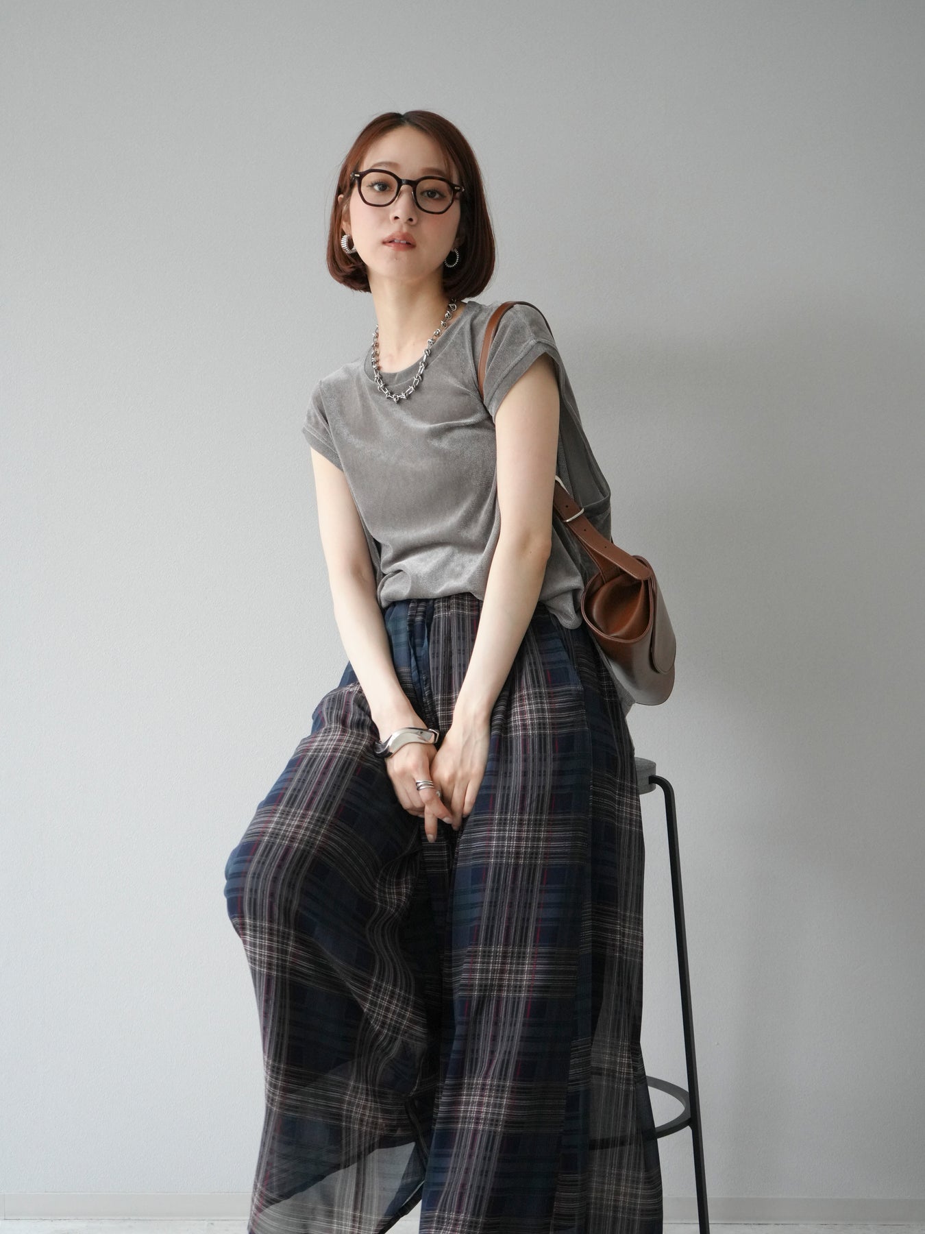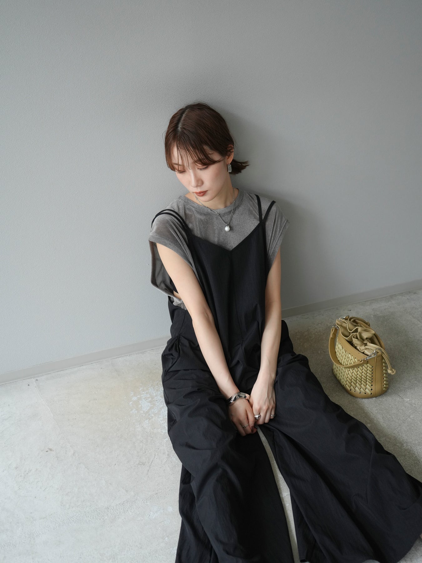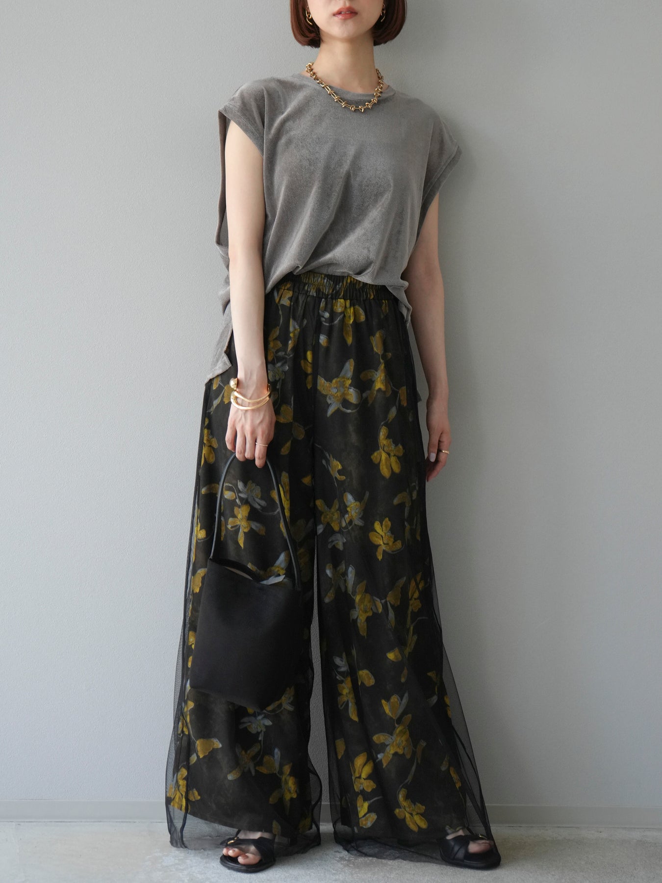 上品な透け感と繊細なフロッキー加工が魅力の、ルーズシルエットノースリーブTシャツ。 軽やかなシアーベロア素材に、マットなフロッキーを施すことで、華やかさとモード感を両立。ほどよく身体から離れるルーズなシルエットが、リラクシーながらも抜け感のあるスタイルを演出します。 Tシャツ感覚でさらりと着られつつ、インナー使いにもぴったりな1枚。ジャンプスーツやキャミワンピのインにレイヤードしても、モードな印象に仕上がります。 カジュアルとフェミニンの絶妙なバランスで、1枚で着映えする今季の主役トップスです。