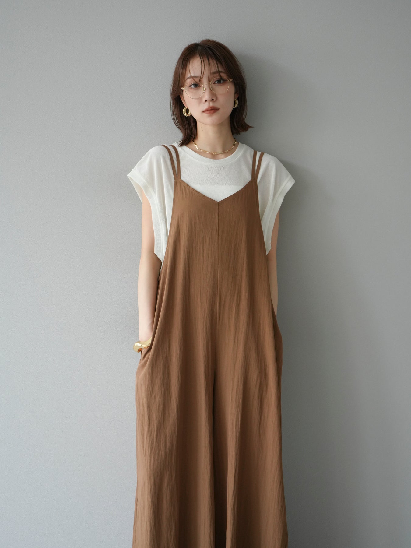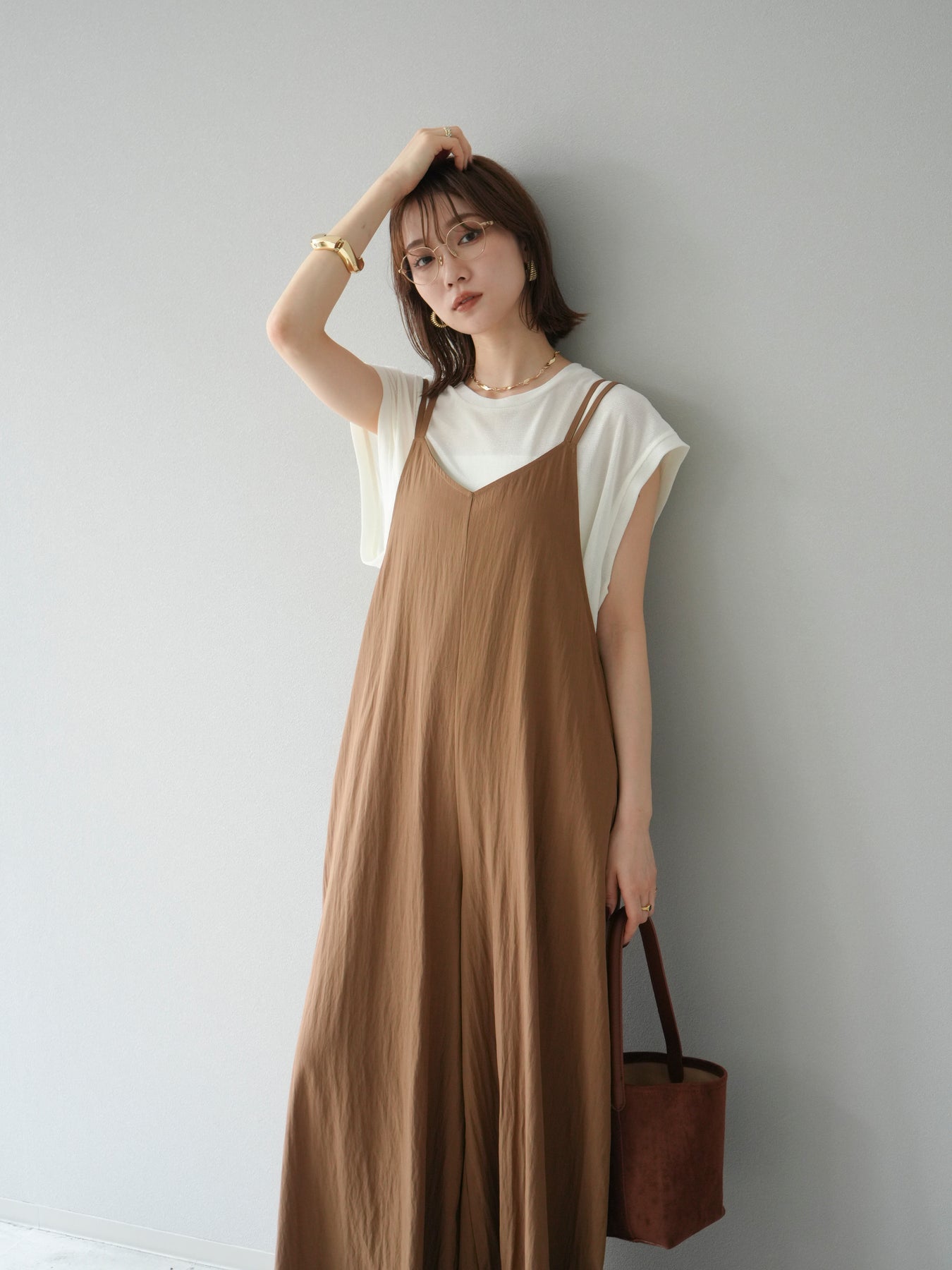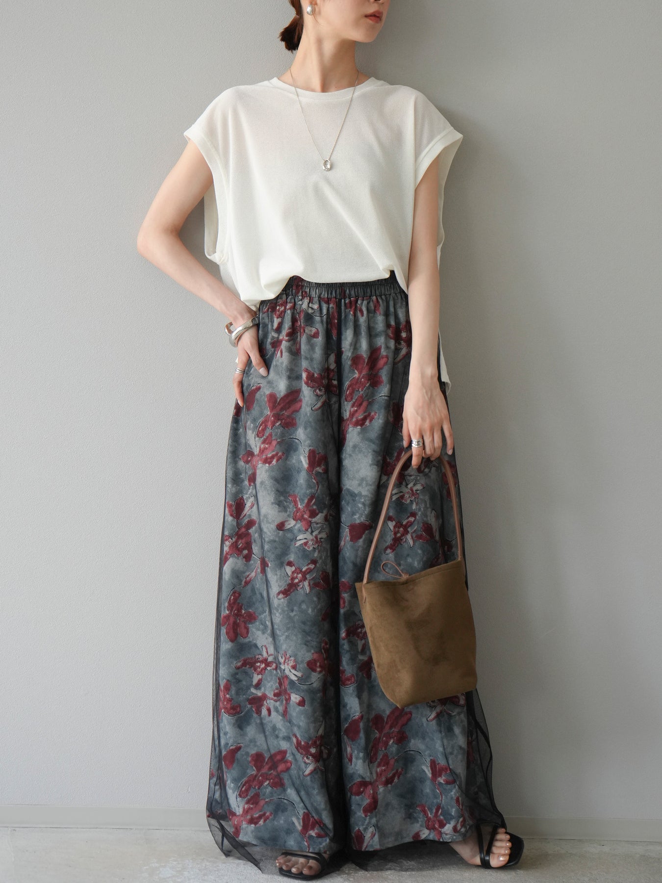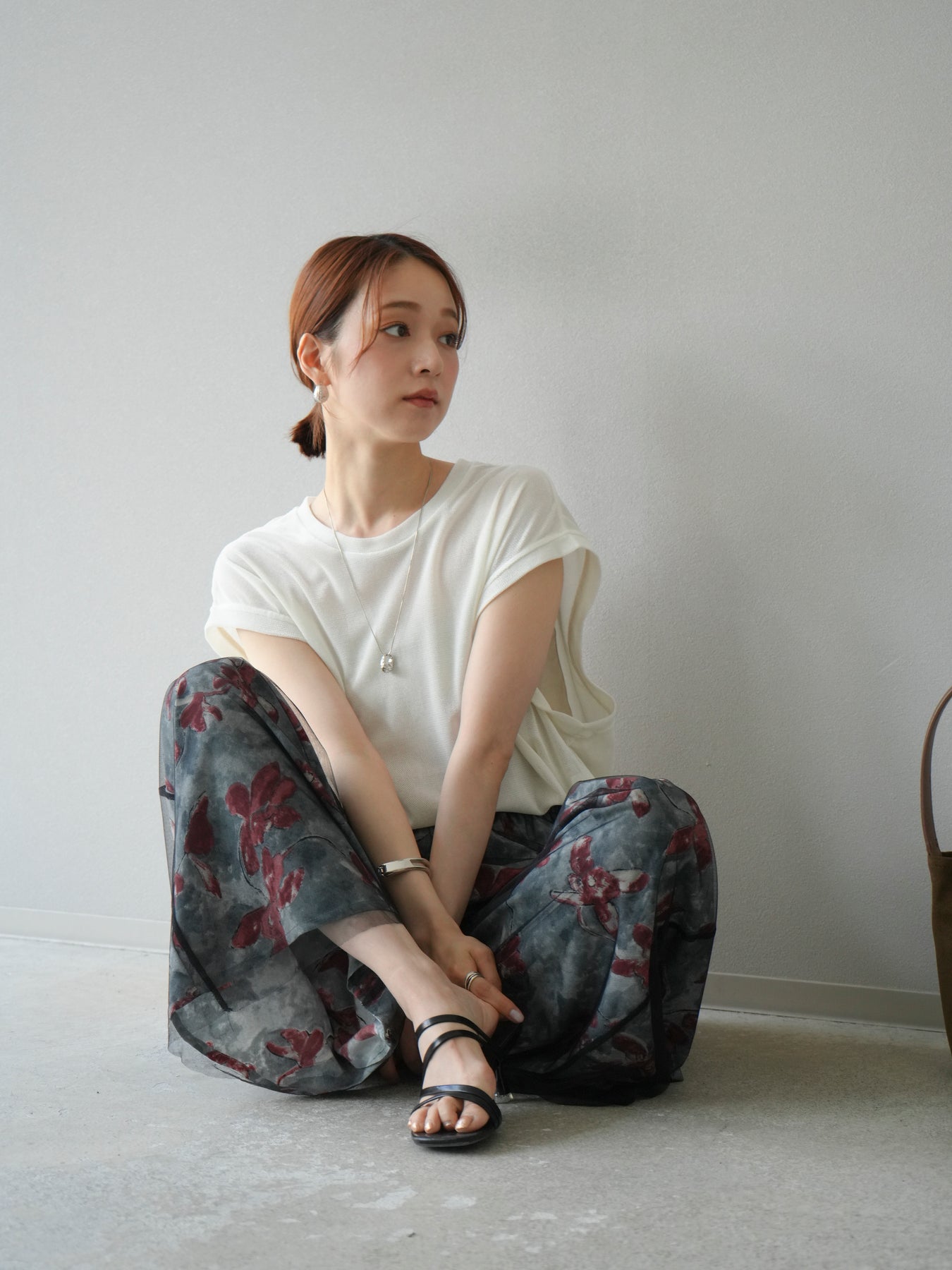 上品な透け感と繊細なフロッキー加工が魅力の、ルーズシルエットノースリーブTシャツ。 軽やかなシアーベロア素材に、マットなフロッキーを施すことで、華やかさとモード感を両立。ほどよく身体から離れるルーズなシルエットが、リラクシーながらも抜け感のあるスタイルを演出します。 Tシャツ感覚でさらりと着られつつ、インナー使いにもぴったりな1枚。ジャンプスーツやキャミワンピのインにレイヤードしても、モードな印象に仕上がります。 カジュアルとフェミニンの絶妙なバランスで、1枚で着映えする今季の主役トップスです。