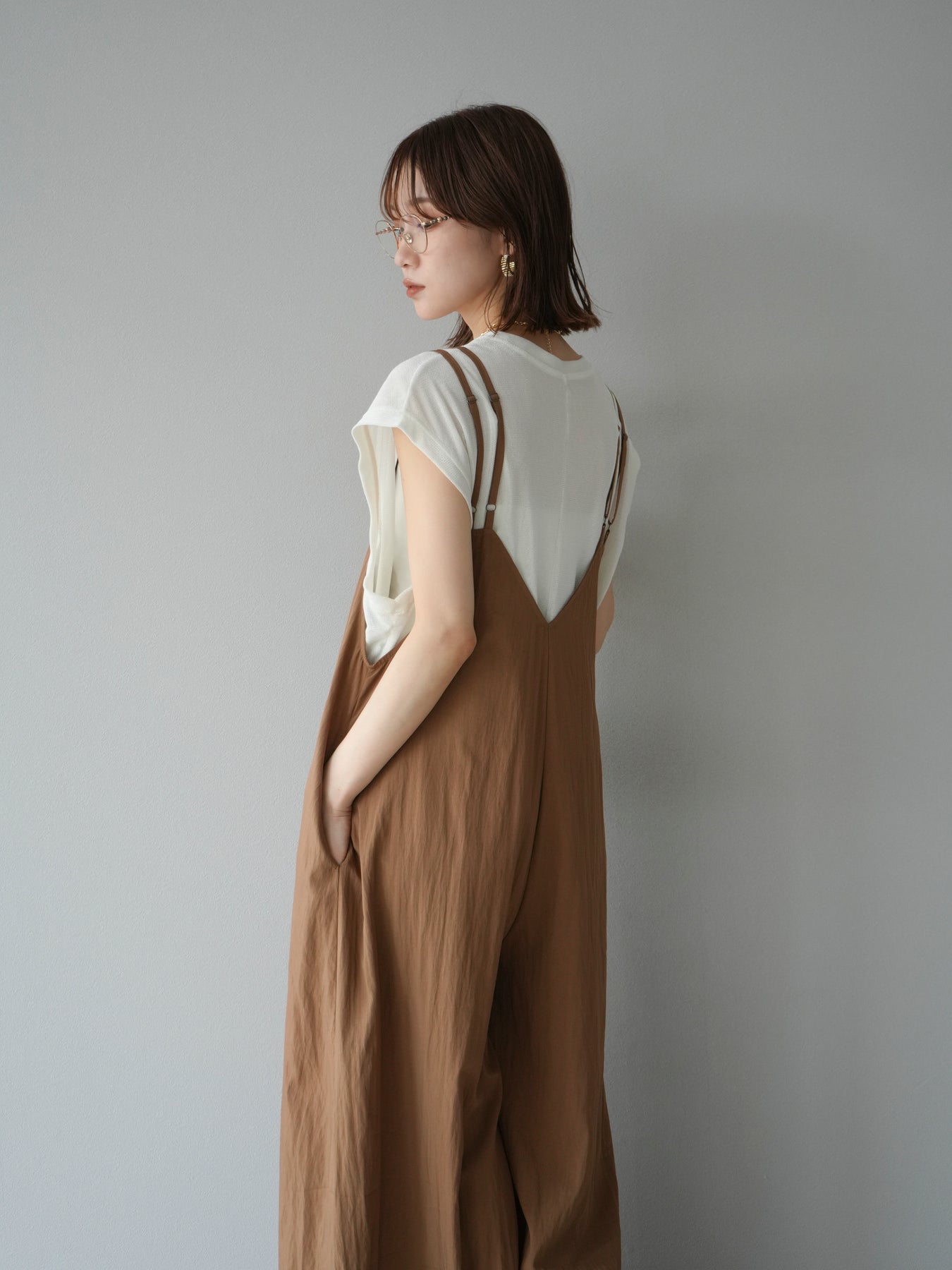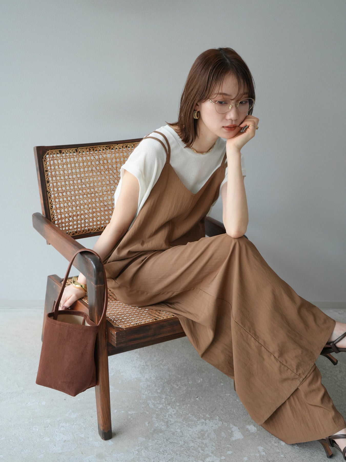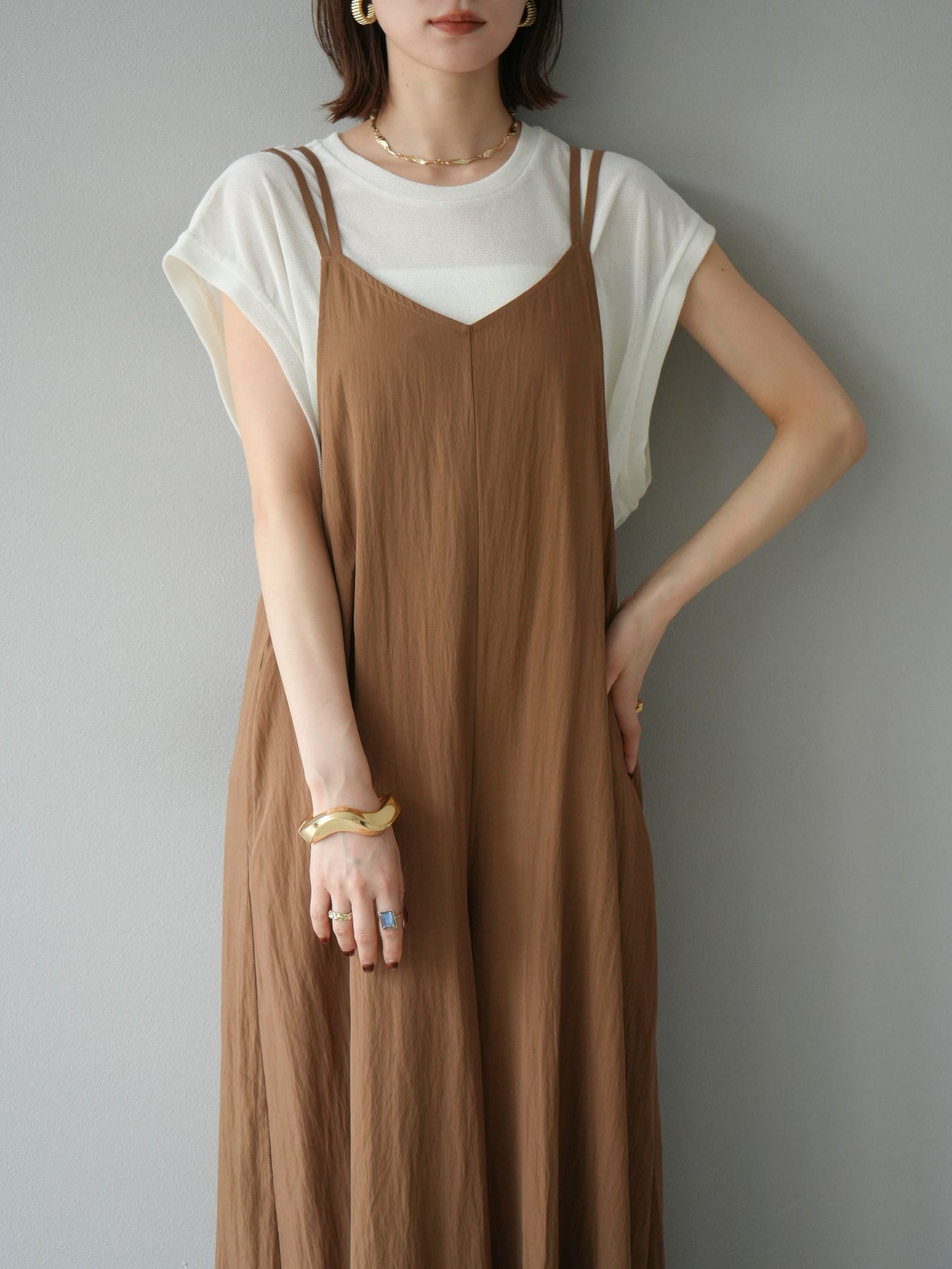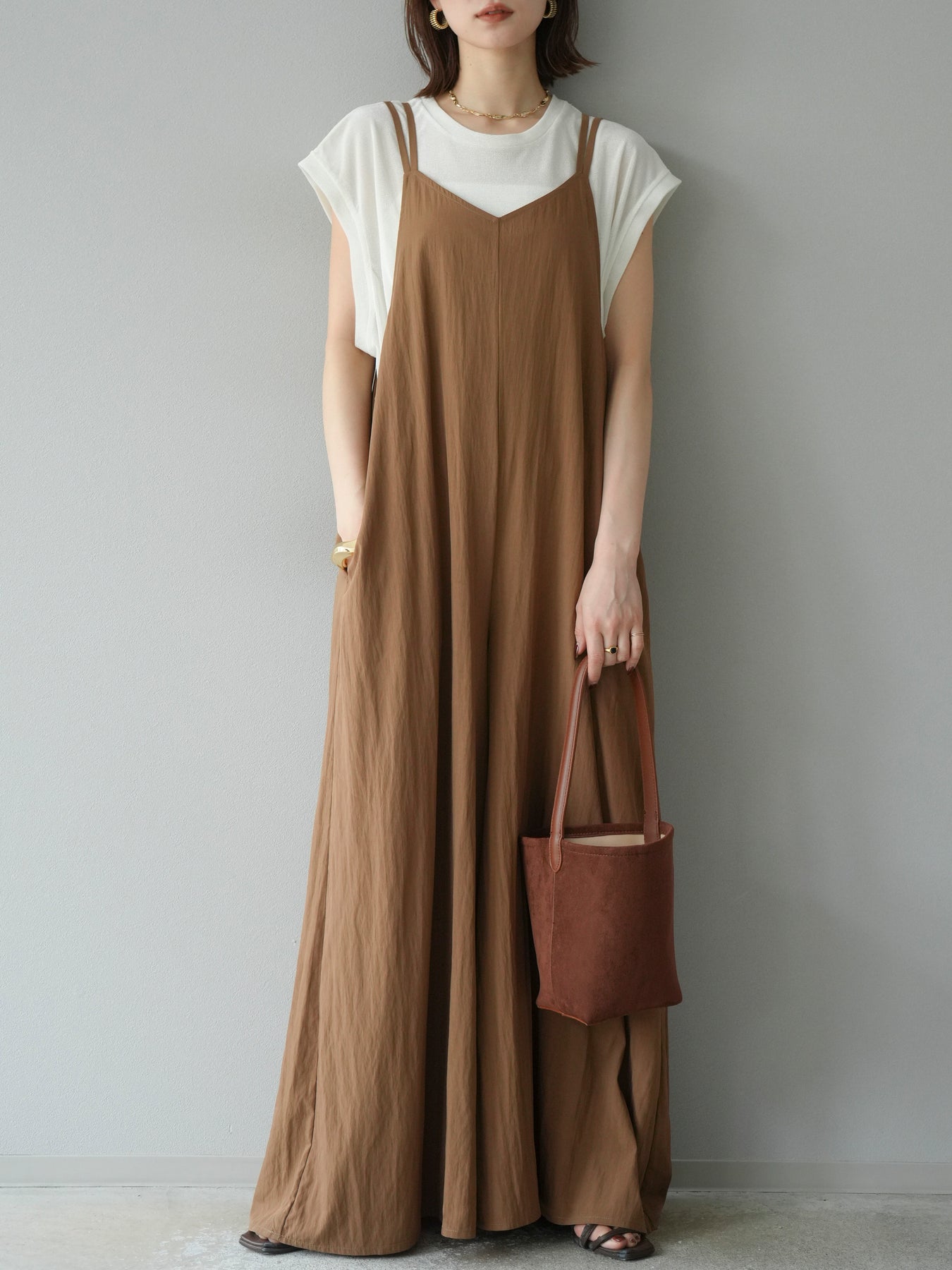 上品な透け感と繊細なフロッキー加工が魅力の、ルーズシルエットノースリーブTシャツ。 軽やかなシアーベロア素材に、マットなフロッキーを施すことで、華やかさとモード感を両立。ほどよく身体から離れるルーズなシルエットが、リラクシーながらも抜け感のあるスタイルを演出します。 Tシャツ感覚でさらりと着られつつ、インナー使いにもぴったりな1枚。ジャンプスーツやキャミワンピのインにレイヤードしても、モードな印象に仕上がります。 カジュアルとフェミニンの絶妙なバランスで、1枚で着映えする今季の主役トップスです。