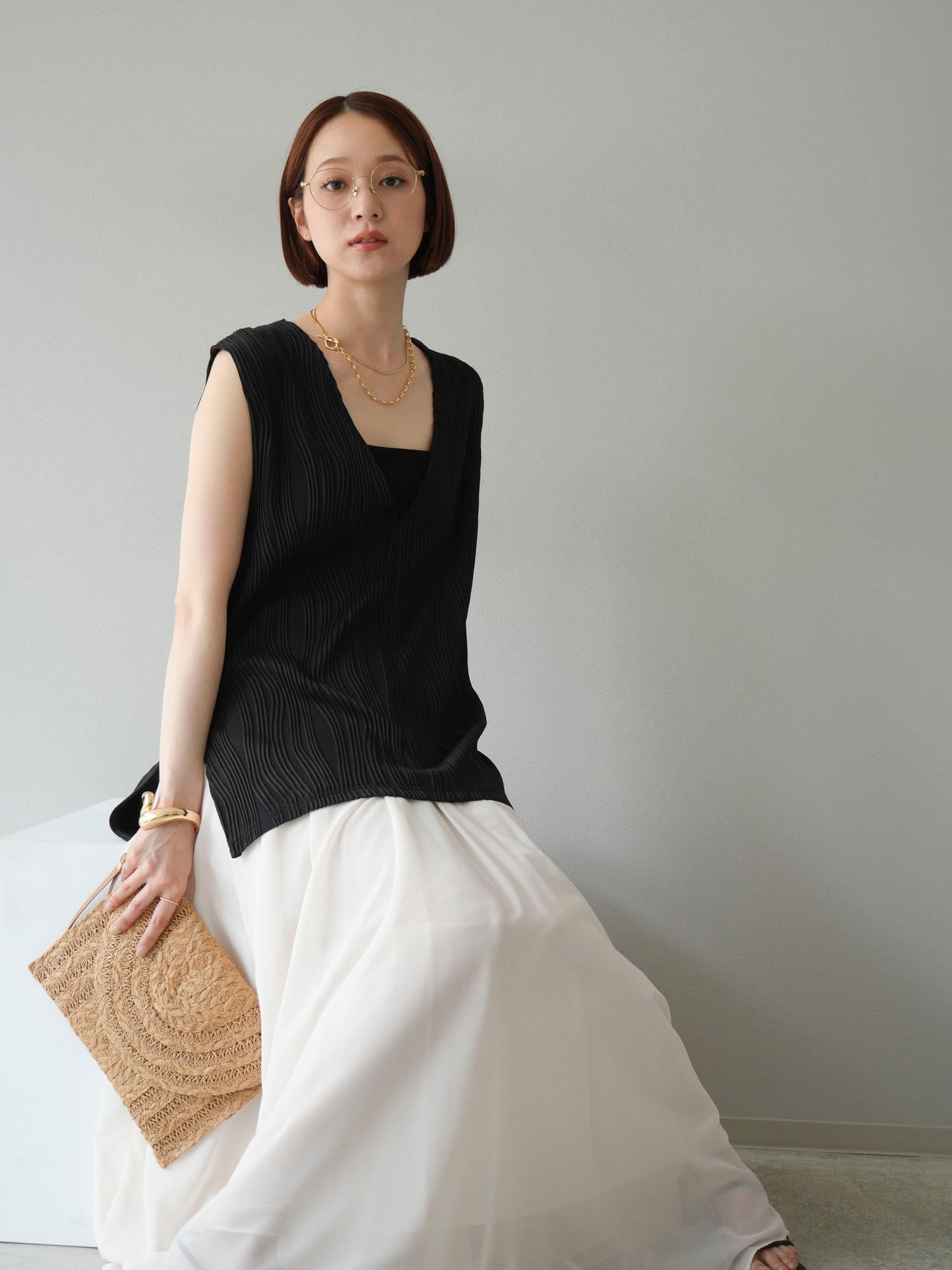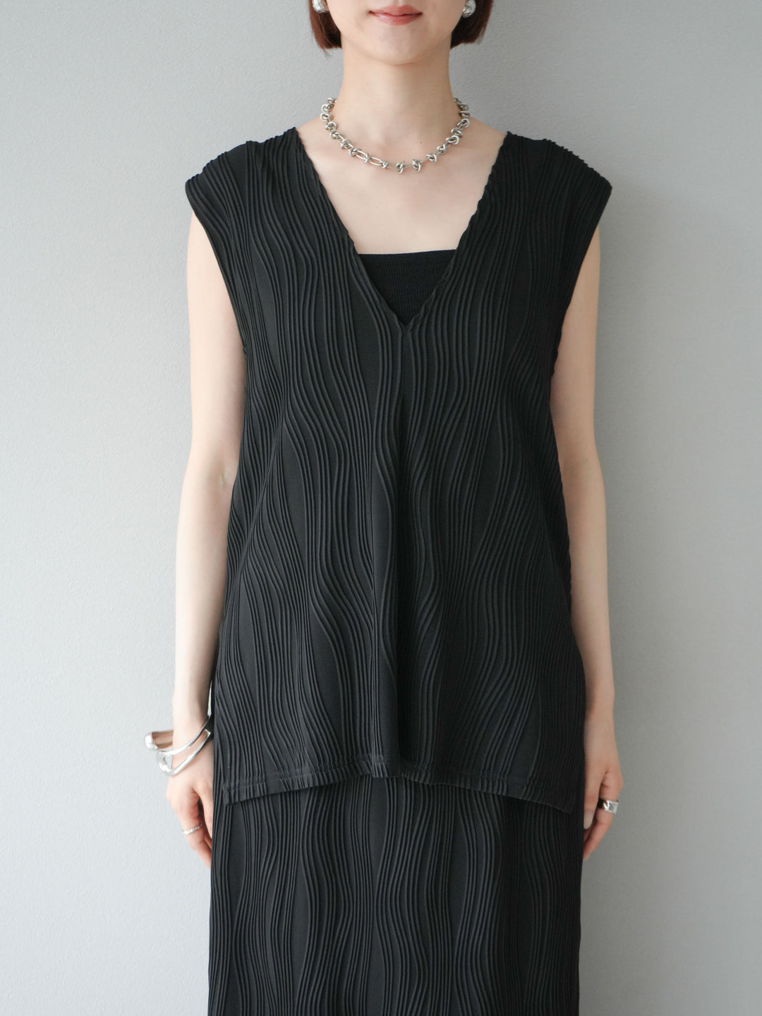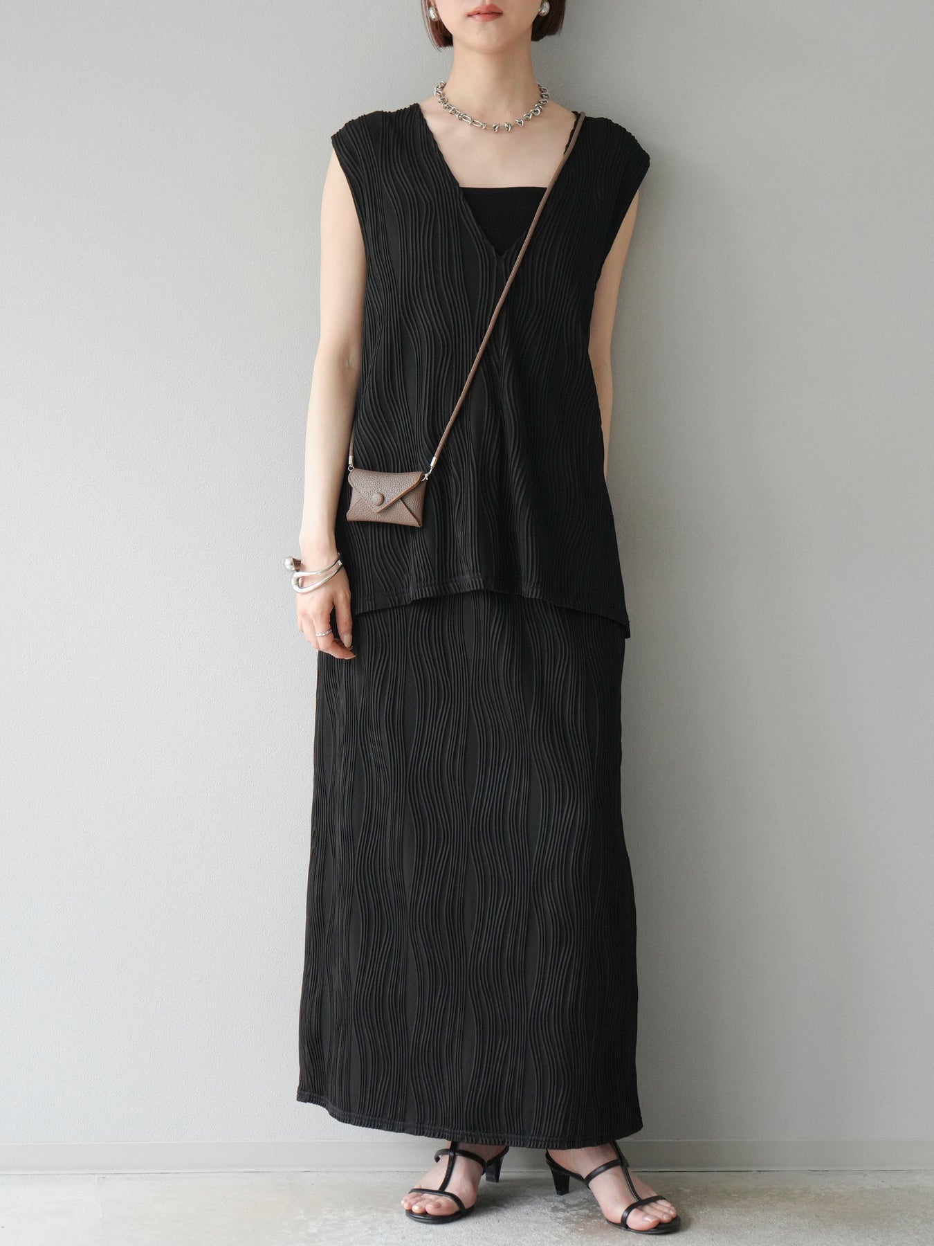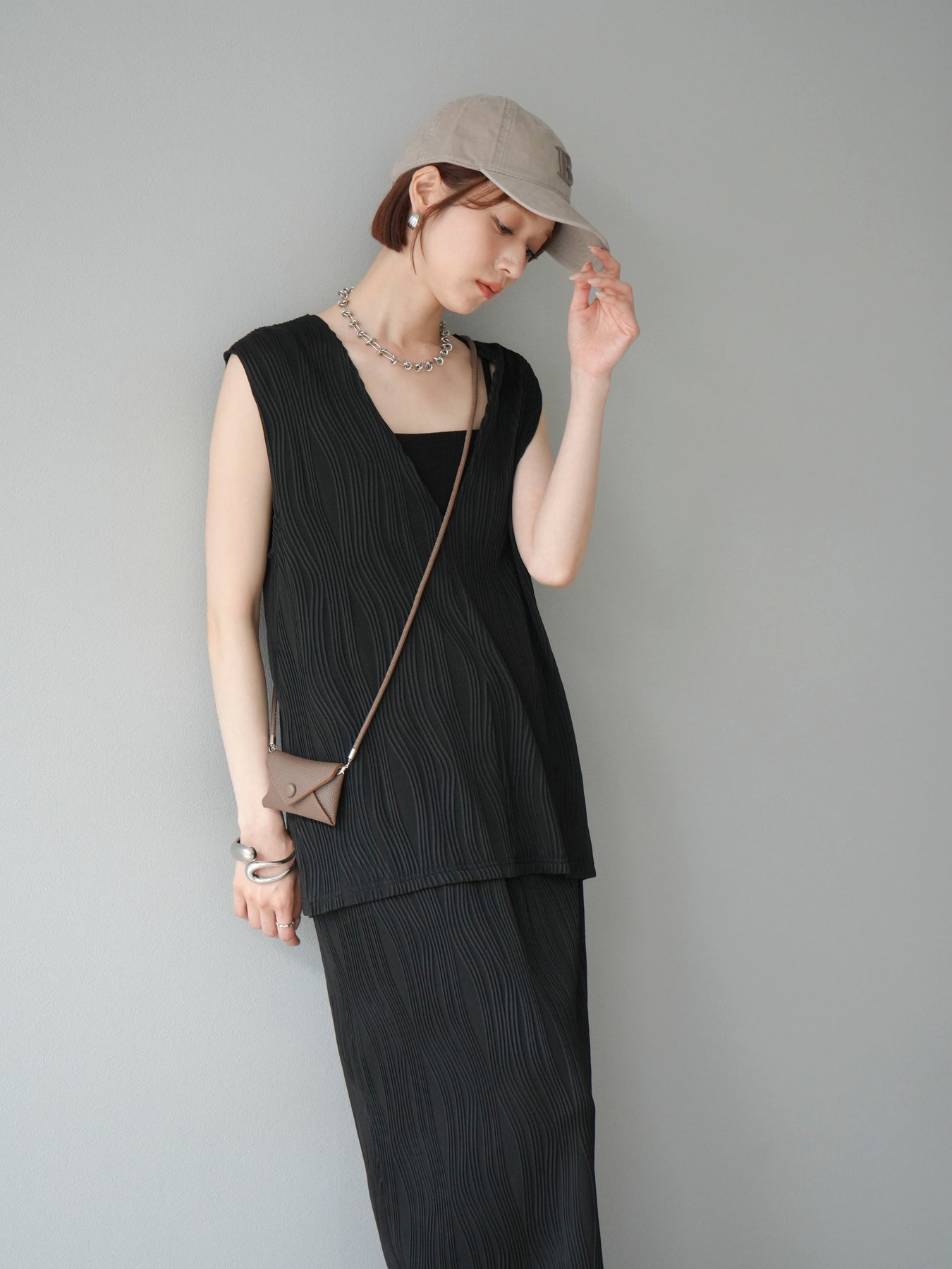 表情のあるウェーブ状のパイピング素材が目を引くVネックベスト。深めのVネックデザインがデコルテを美しく見せ、インナーとのレイヤードを楽しめる1枚です。程よくゆとりのあるシルエットで、リラックス感とモードな雰囲気を両立。ヒップまで隠れる丈感で体型カバーも◎。同素材のスカートやパンツとセットアップで着用すれば、洗練されたコーディネートに仕上がります。デイリーからオケージョンまで幅広く活躍するアイテム。 ※ボトムス、キャミソール(インナー)以外の商品は一律でインナーは付属していません。