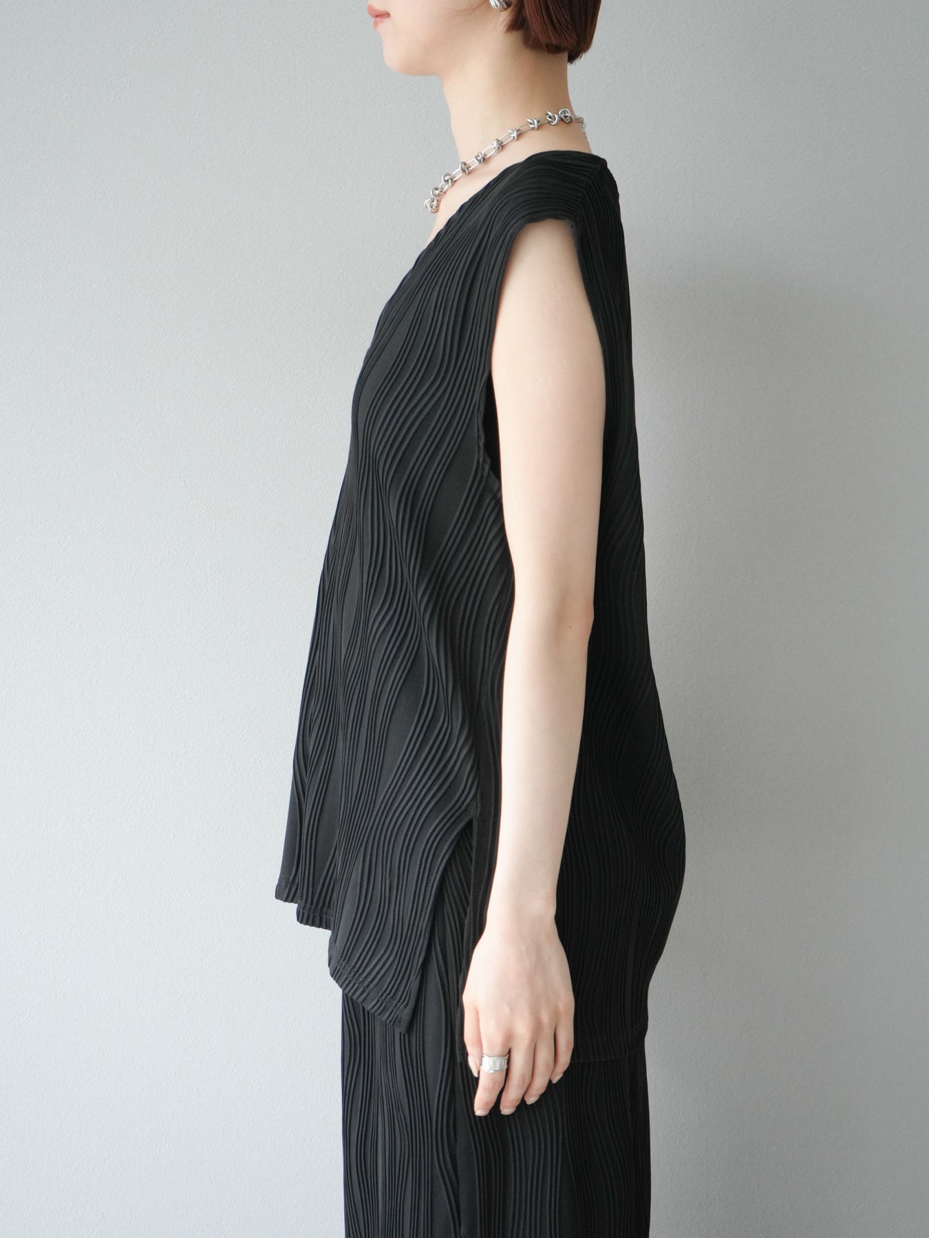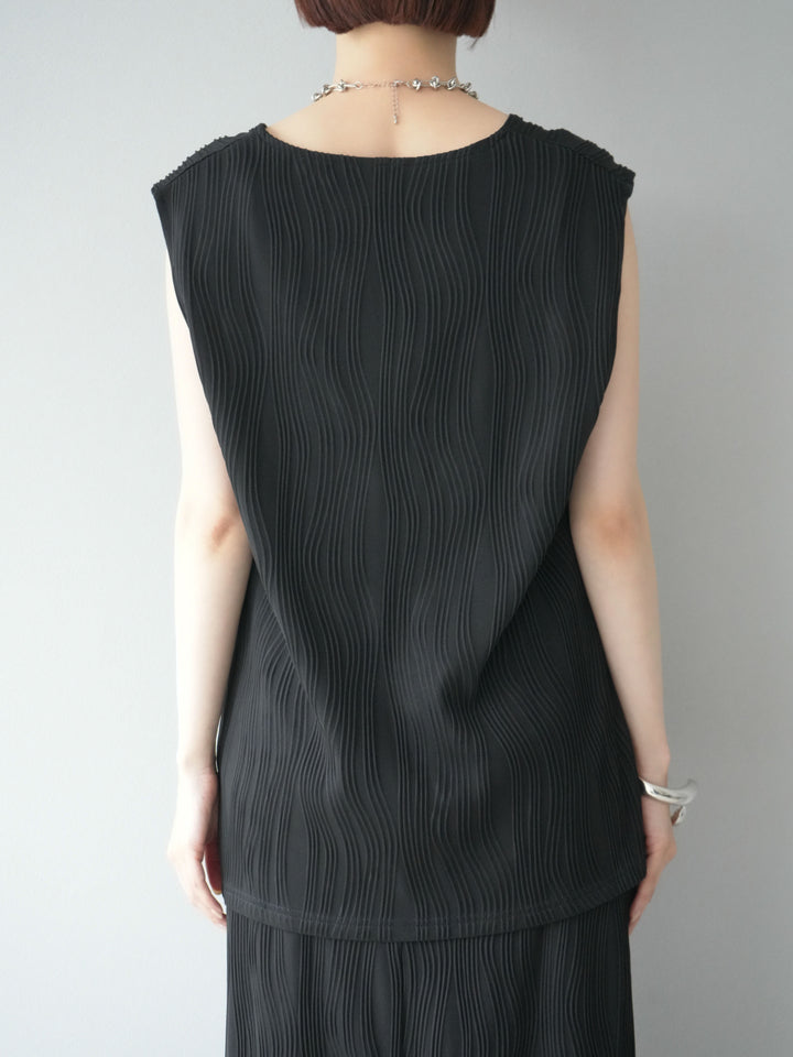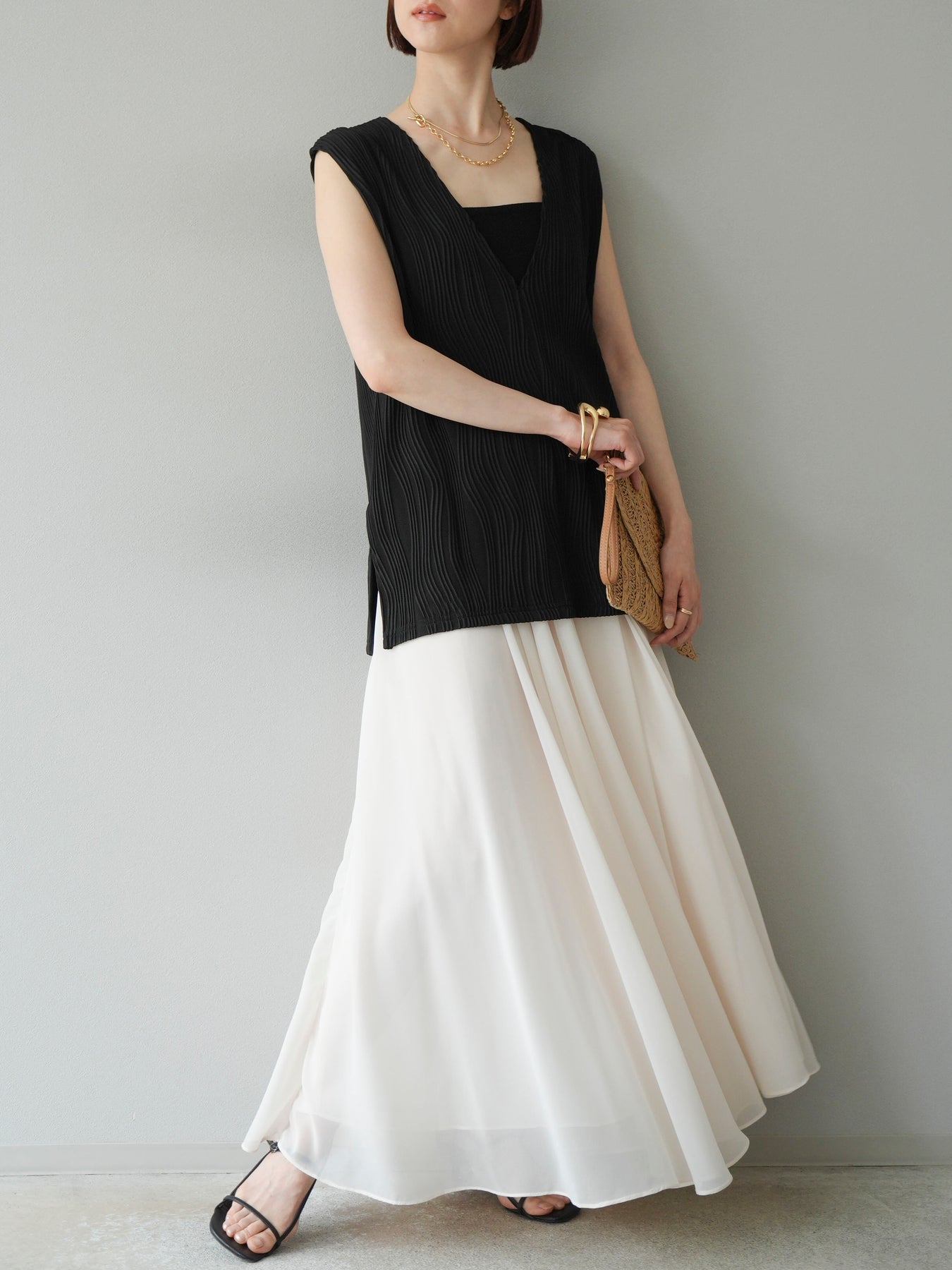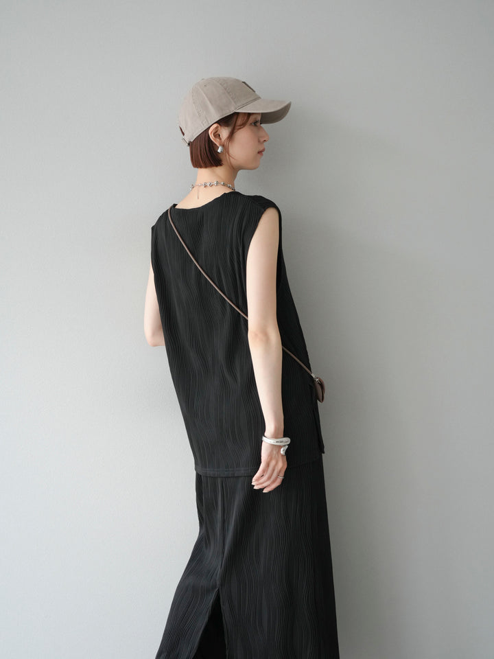 表情のあるウェーブ状のパイピング素材が目を引くVネックベスト。深めのVネックデザインがデコルテを美しく見せ、インナーとのレイヤードを楽しめる1枚です。程よくゆとりのあるシルエットで、リラックス感とモードな雰囲気を両立。ヒップまで隠れる丈感で体型カバーも◎。同素材のスカートやパンツとセットアップで着用すれば、洗練されたコーディネートに仕上がります。デイリーからオケージョンまで幅広く活躍するアイテム。 ※ボトムス、キャミソール(インナー)以外の商品は一律でインナーは付属していません。
