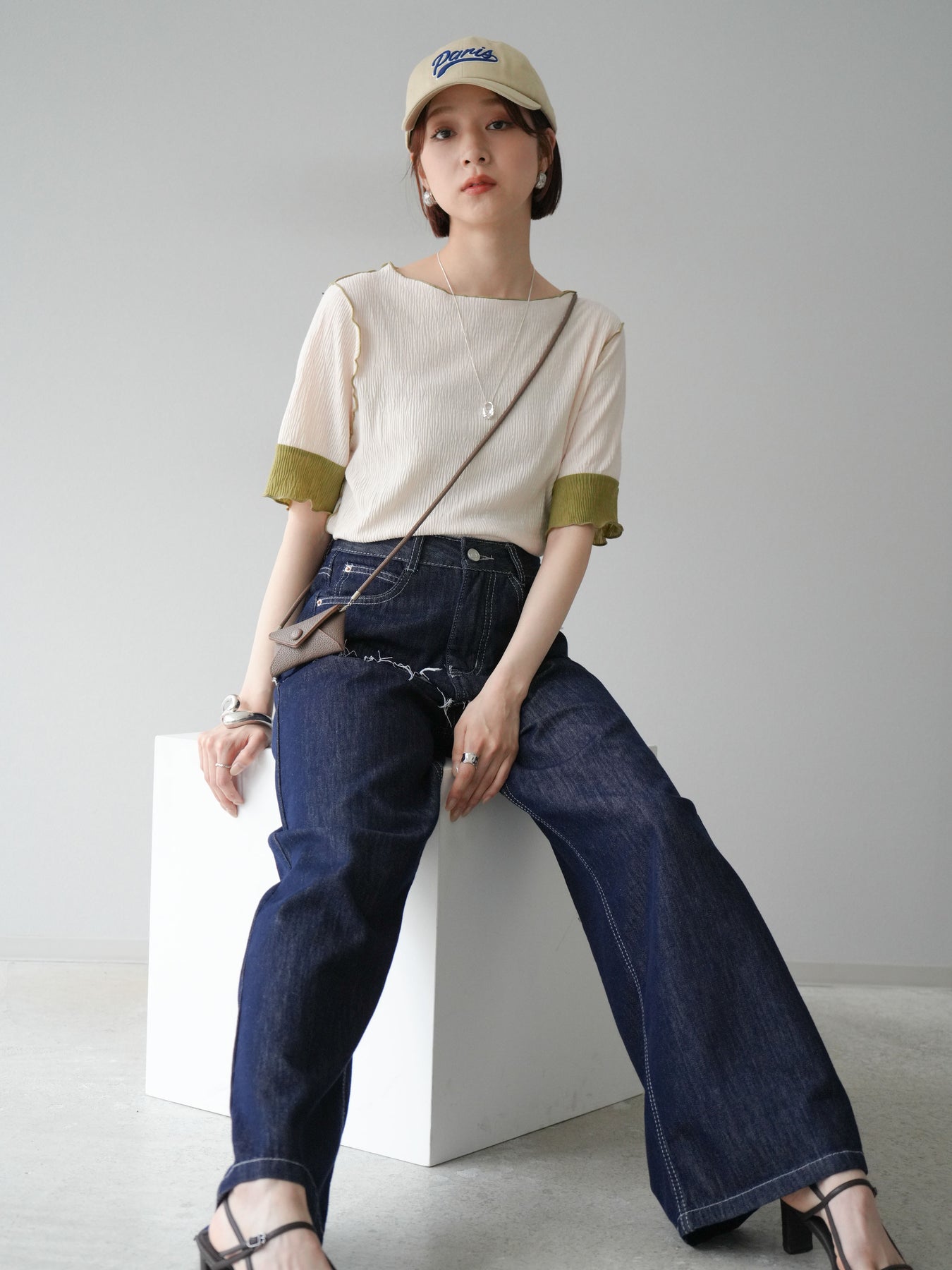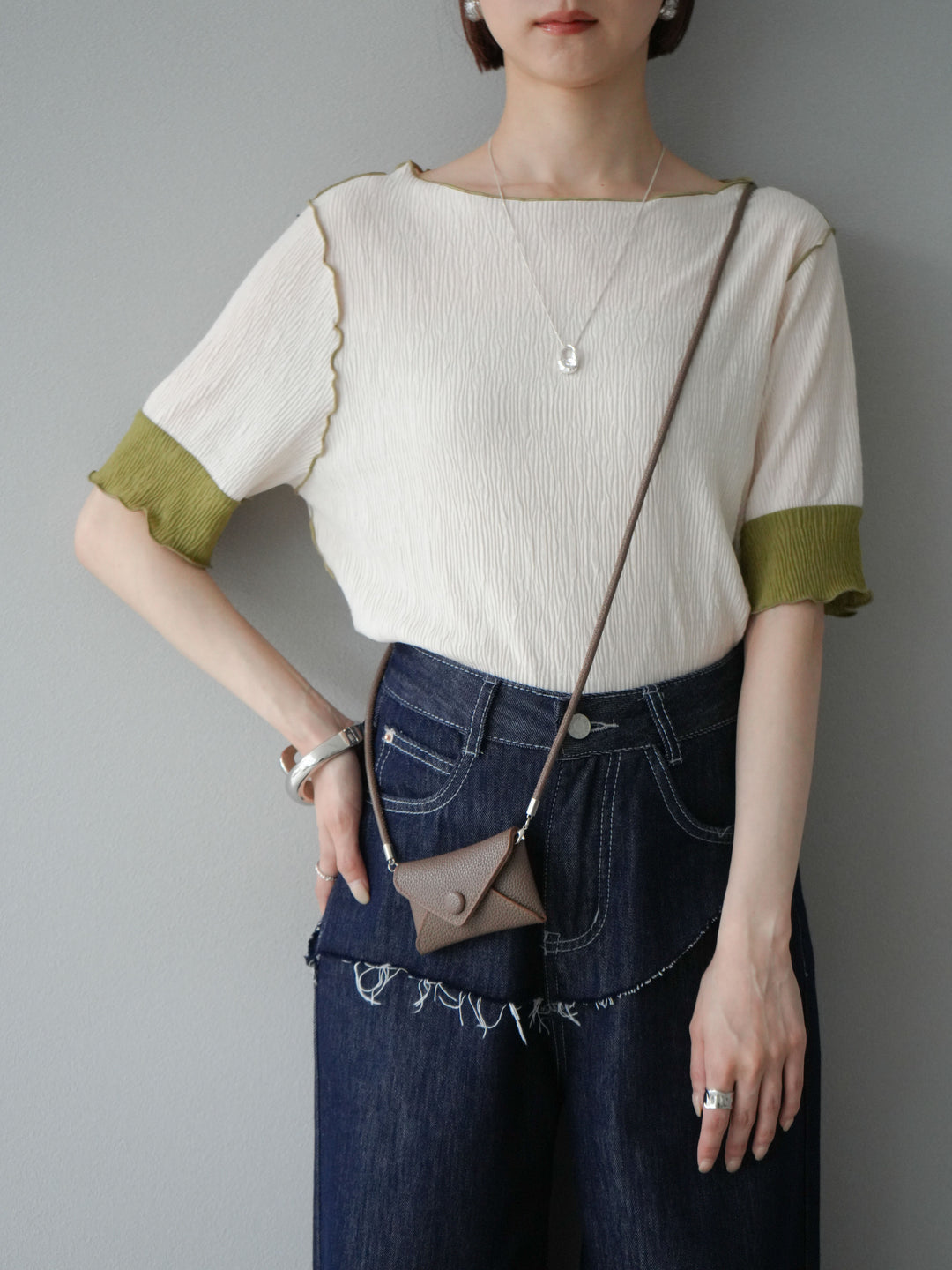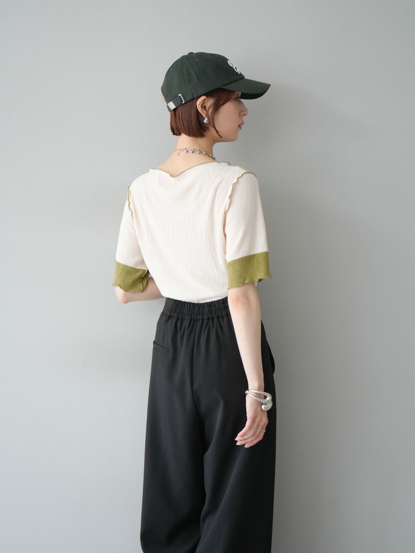 表情豊かなプリーツ素材に、配色の切替と配色ロックがアクセントを添え、1枚で洒落感のある着こなしが叶います。ボートネックがデコルテを美しく見せ、肩から袖にかけて程よくゆとりのあるシルエットがリラクシーな印象に。バックにはさりげないスリットとボタン付きで着脱もスムーズ。デニムやスラックスはもちろん、スカートとの合わせもおすすめで、デイリーからカジュアルシーンまで幅広く活躍します。 ※ボトムス、キャミソール(インナー)以外の商品は一律でインナーは付属していません。