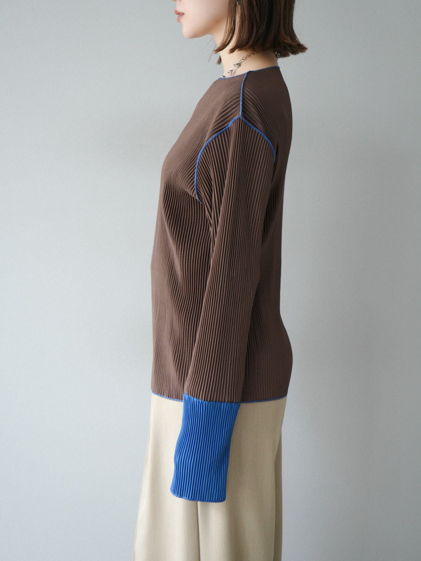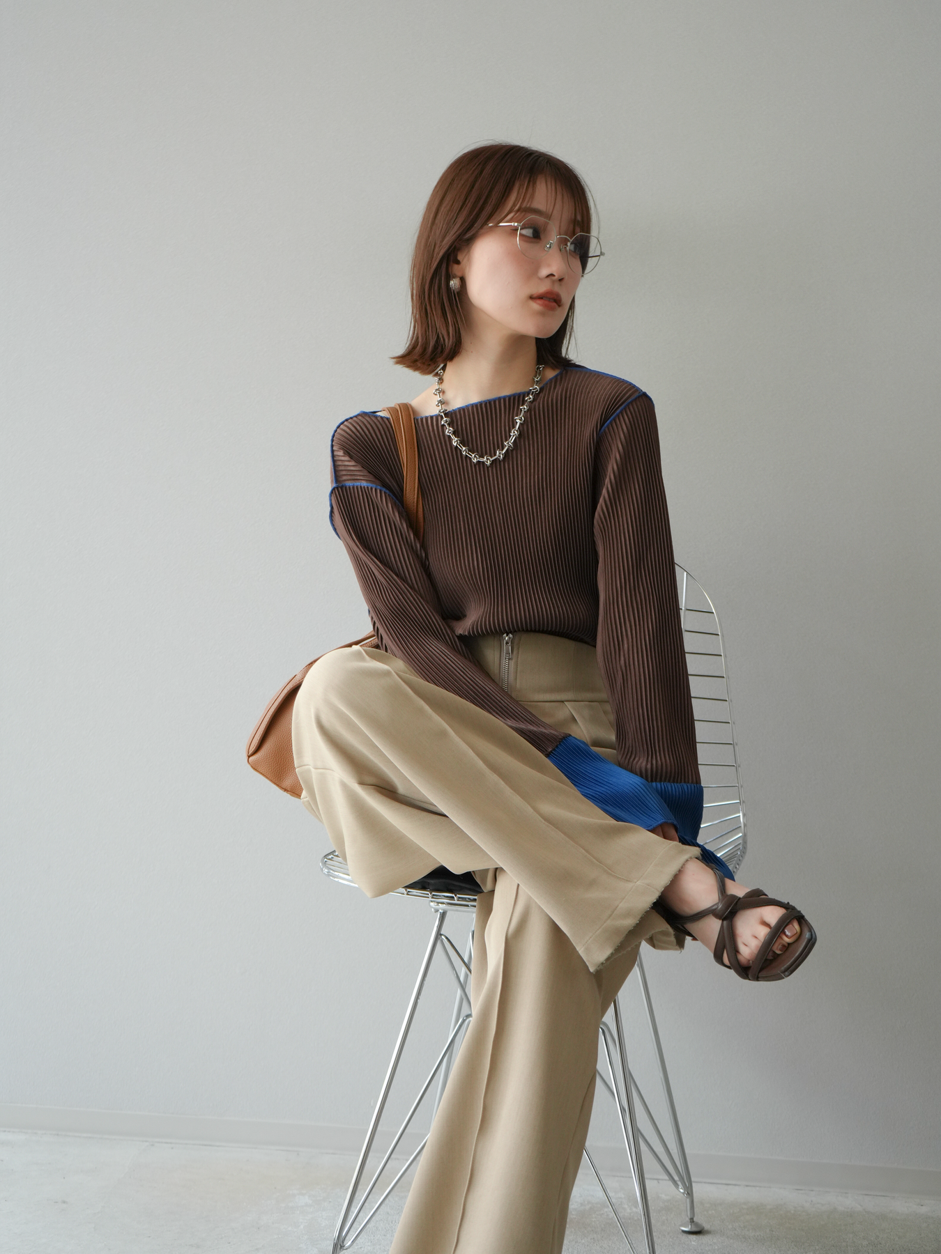 ランダムな配色切り替えと細かいプリーツ加工が特徴的な一枚で、着るだけでコーデの主役に。軽く伸縮性のある素材で着心地も良く、身体に程よくフィットするシルエットが女性らしさを引き立てます。袖口のアクセントカラーや配色ステッチが、シンプルながらも個性を感じさせるデザインに。デニムやスラックスなど、どんなボトムとも相性がよく、1枚でもレイヤードでも活躍する万能アイテムです。 ※ボトムス、キャミソール(インナー)以外の商品は一律でインナーは付属していません。