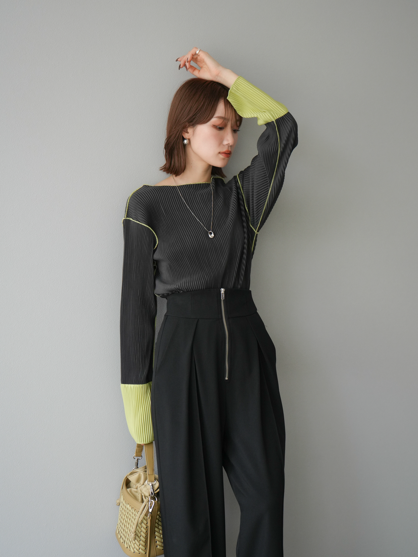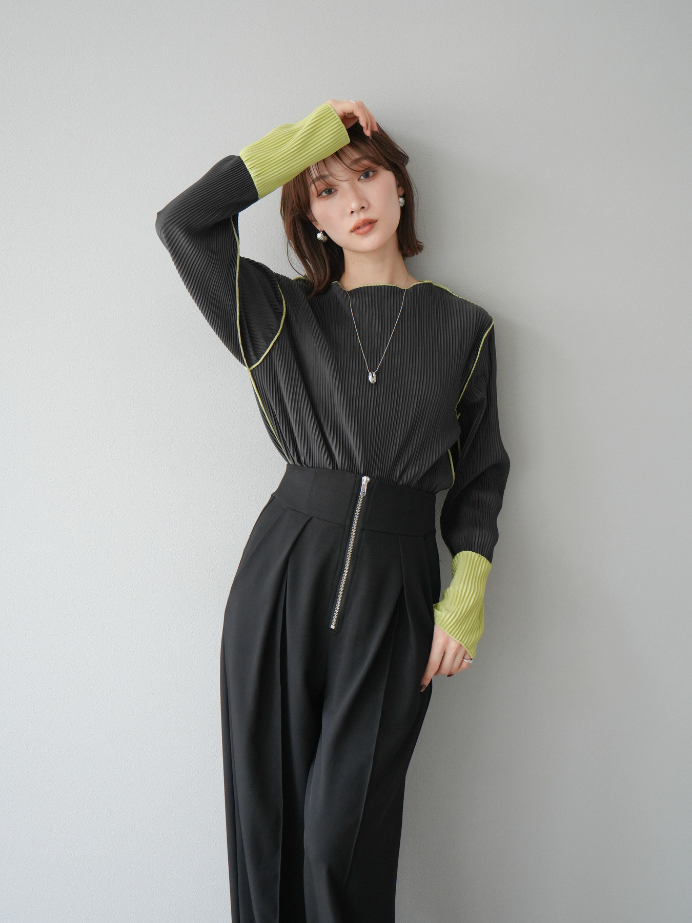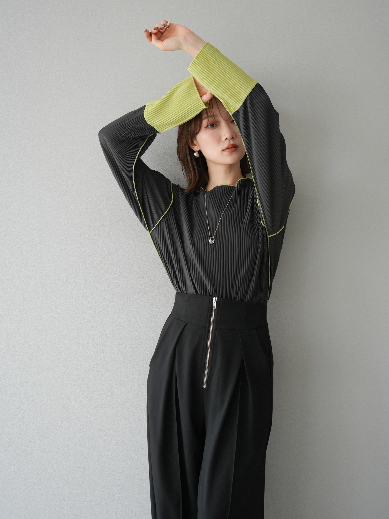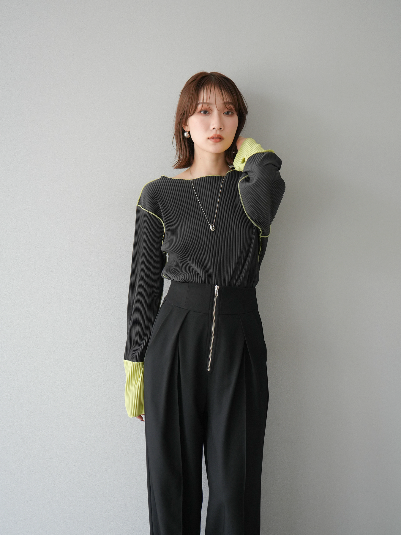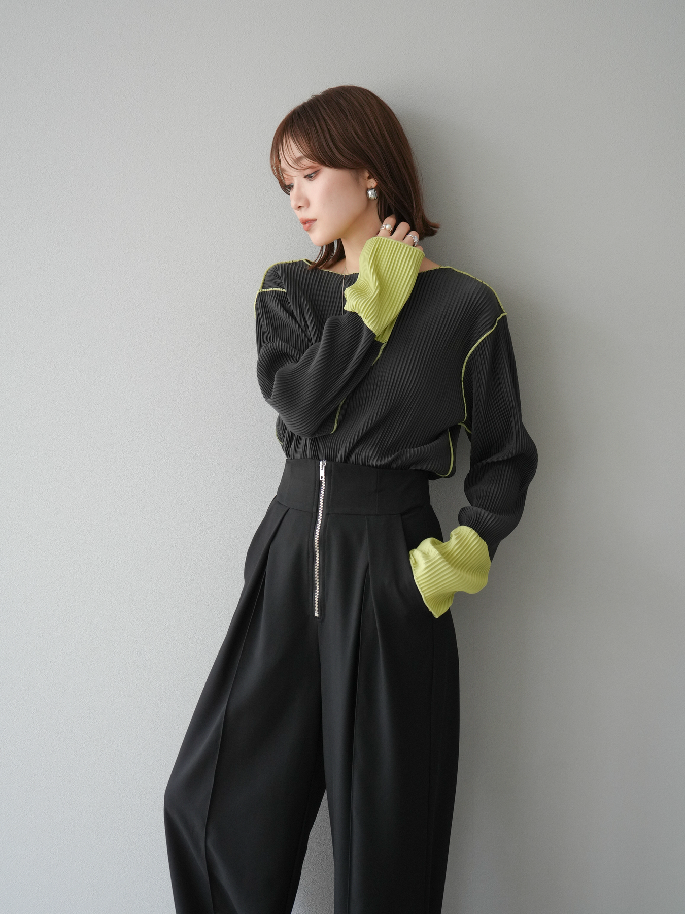 [予約]バイカラープリーツトップス/チャコール