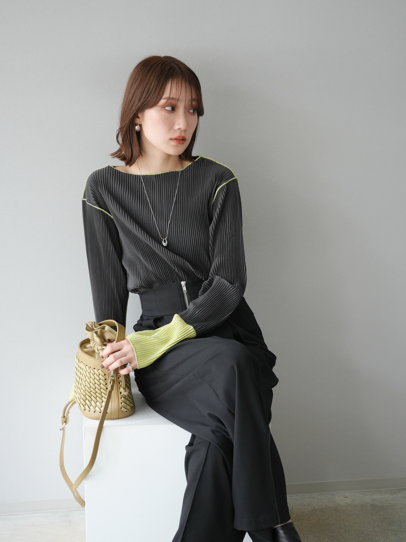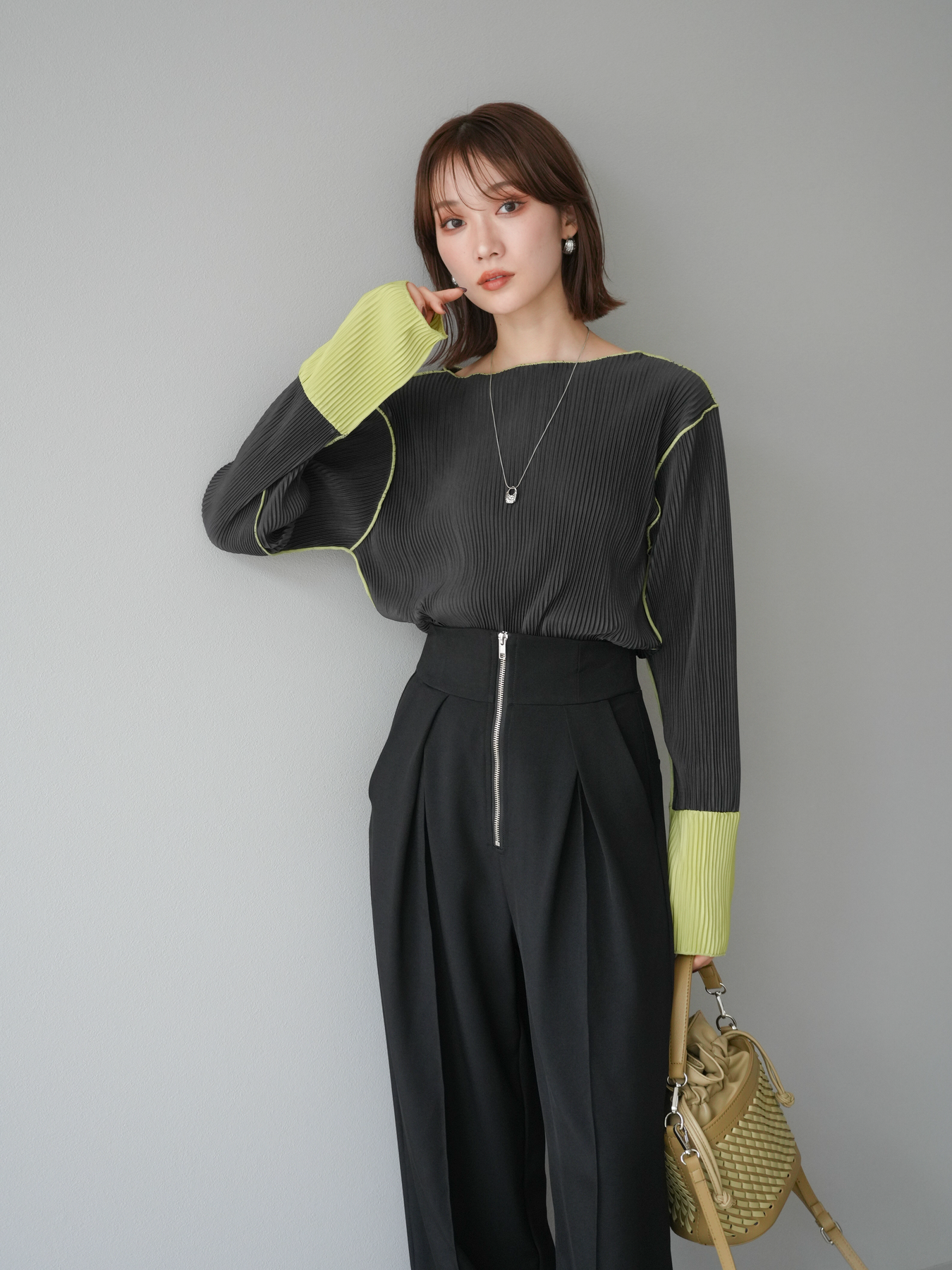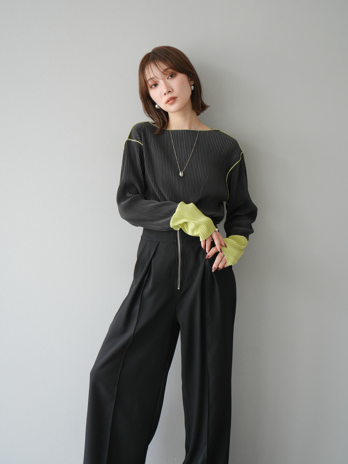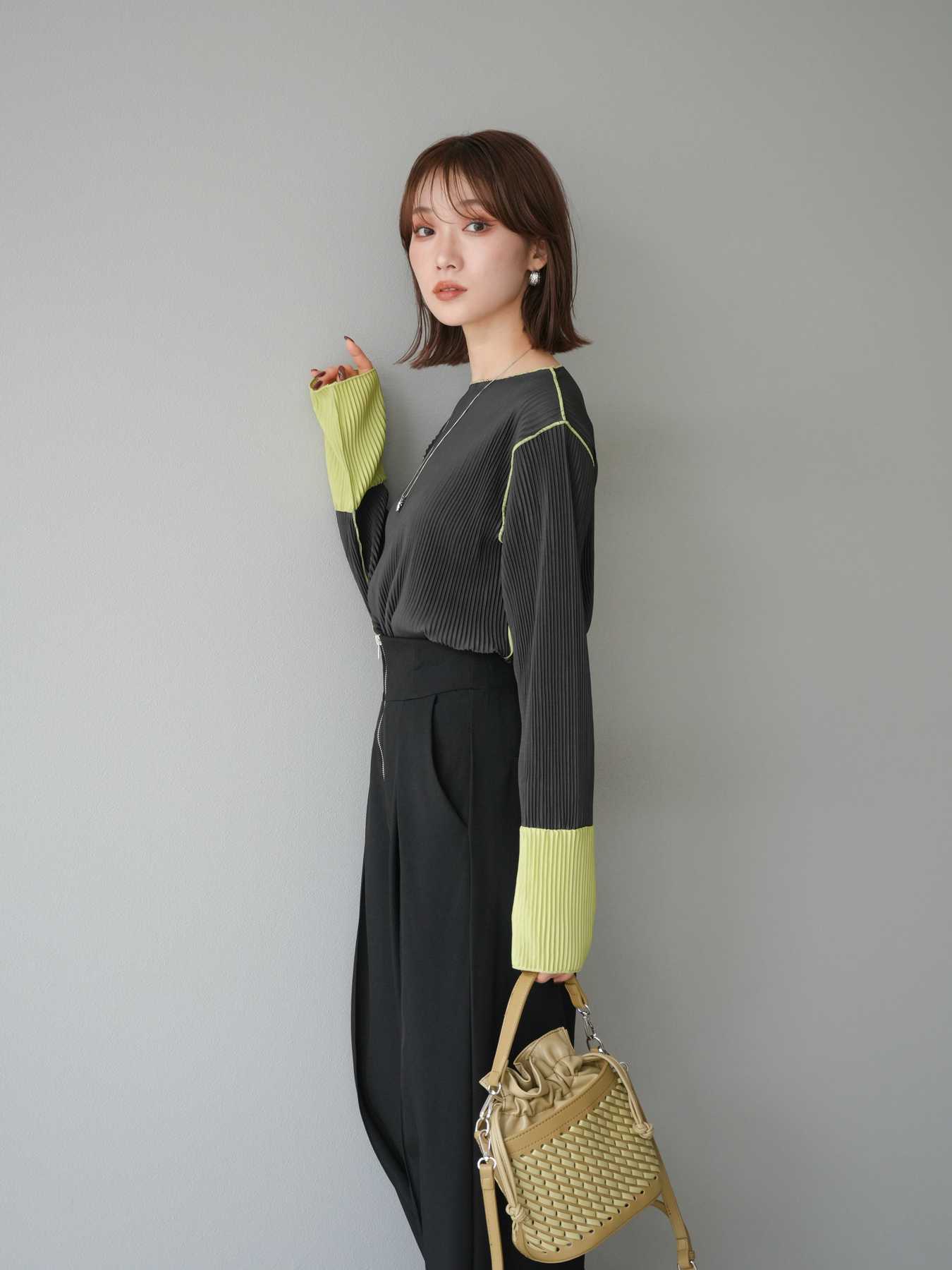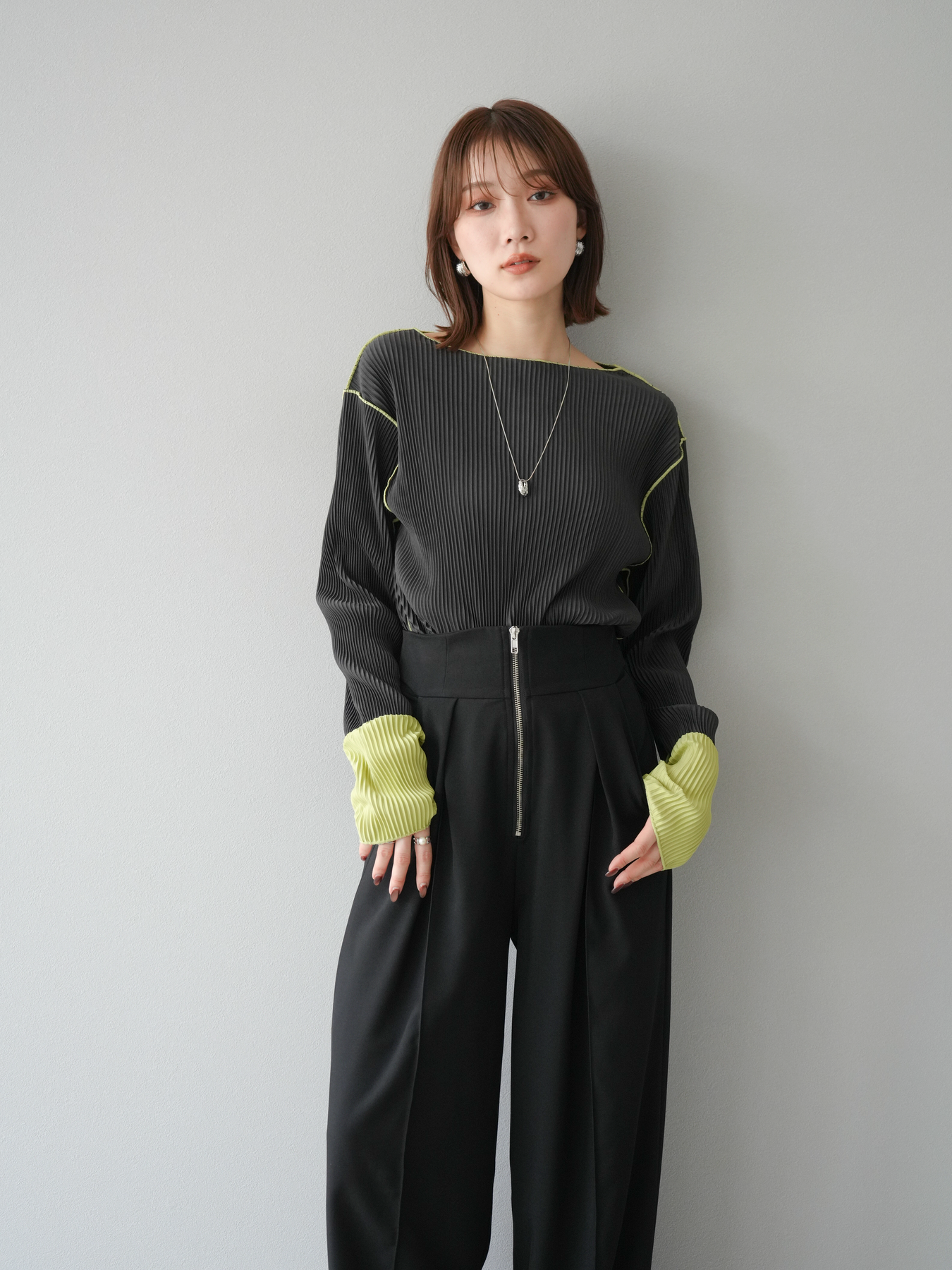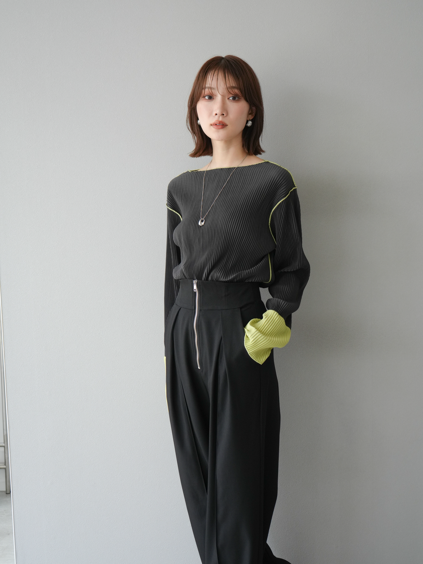 [予約]バイカラープリーツトップス/チャコール