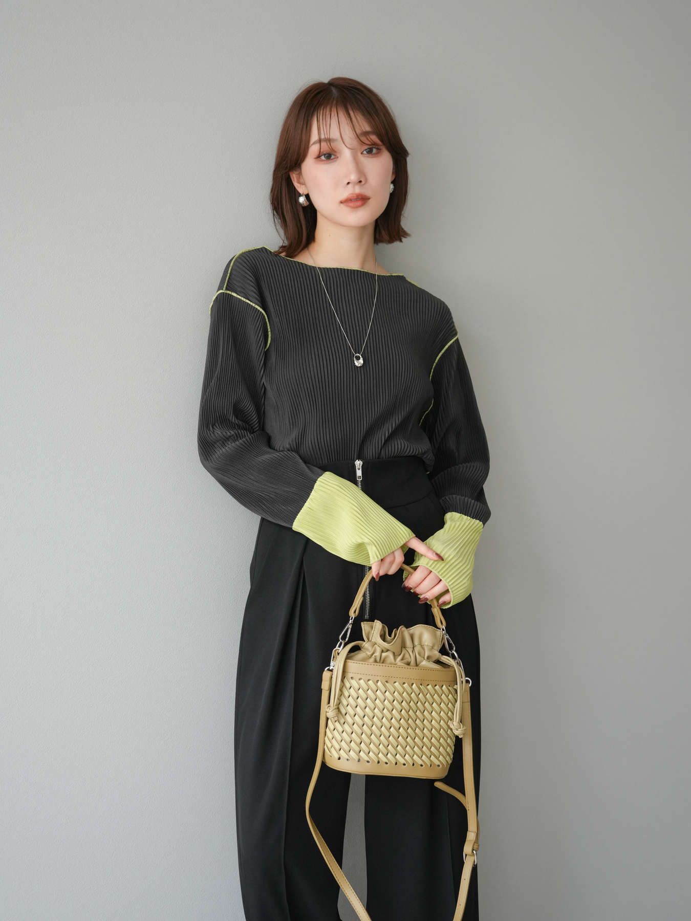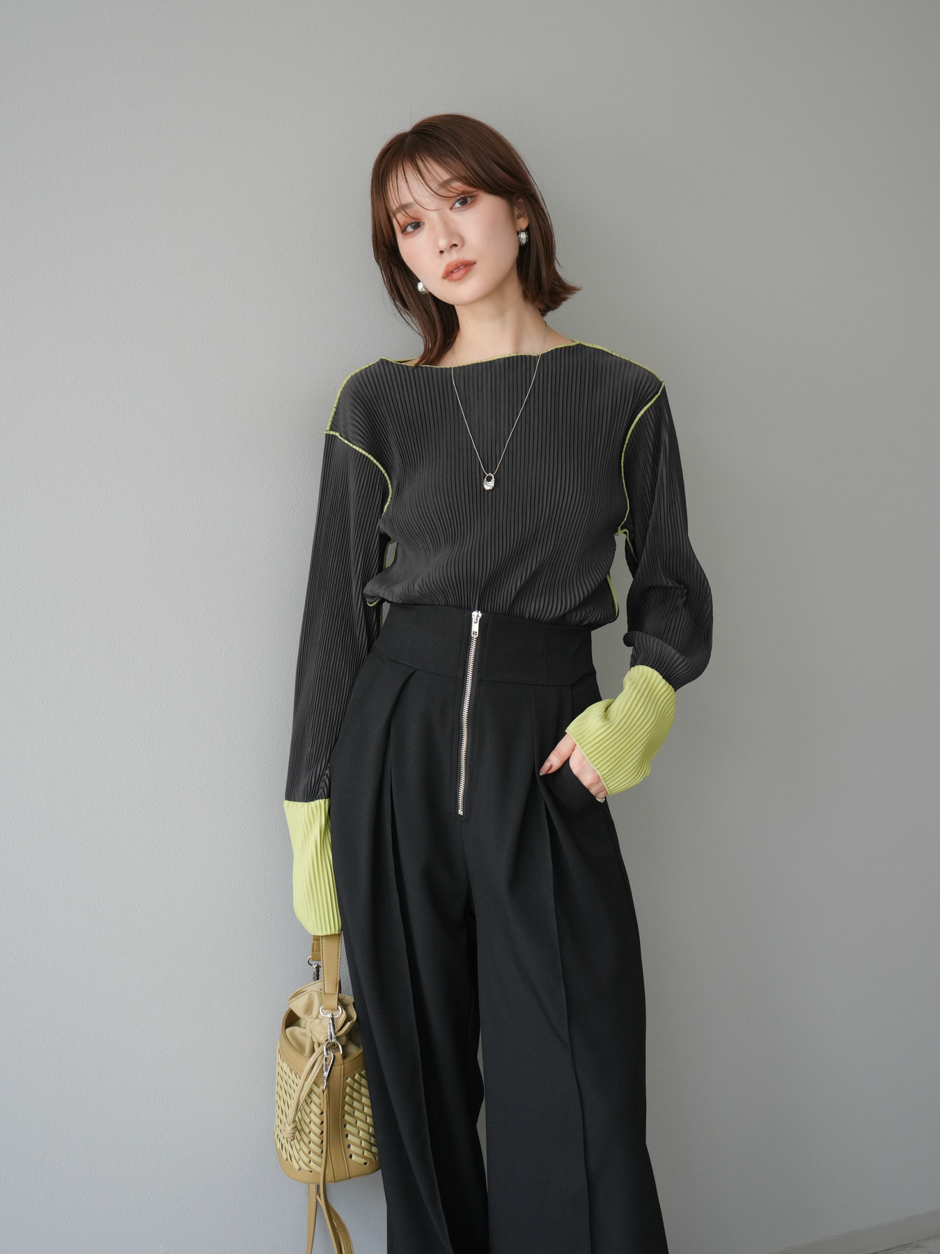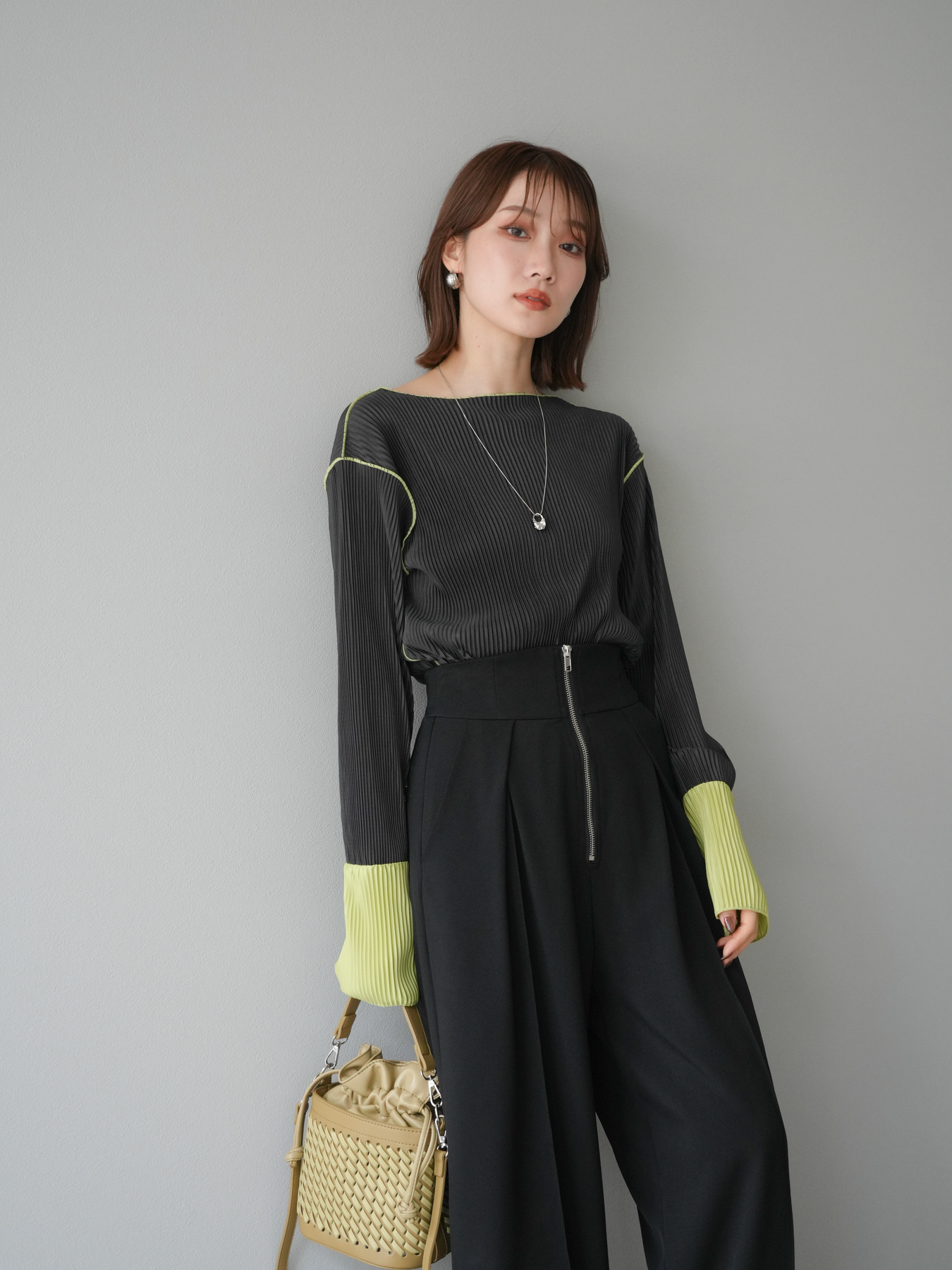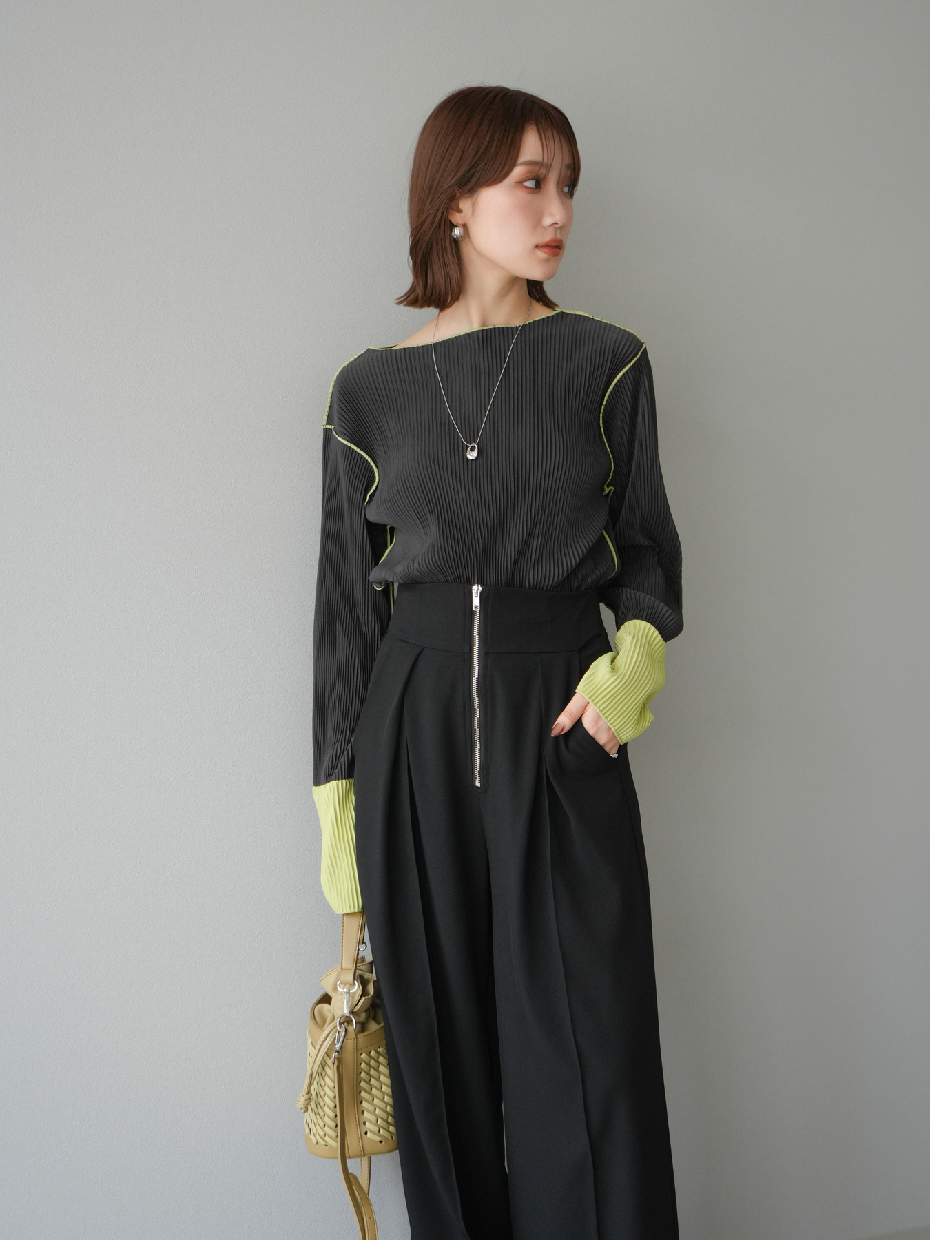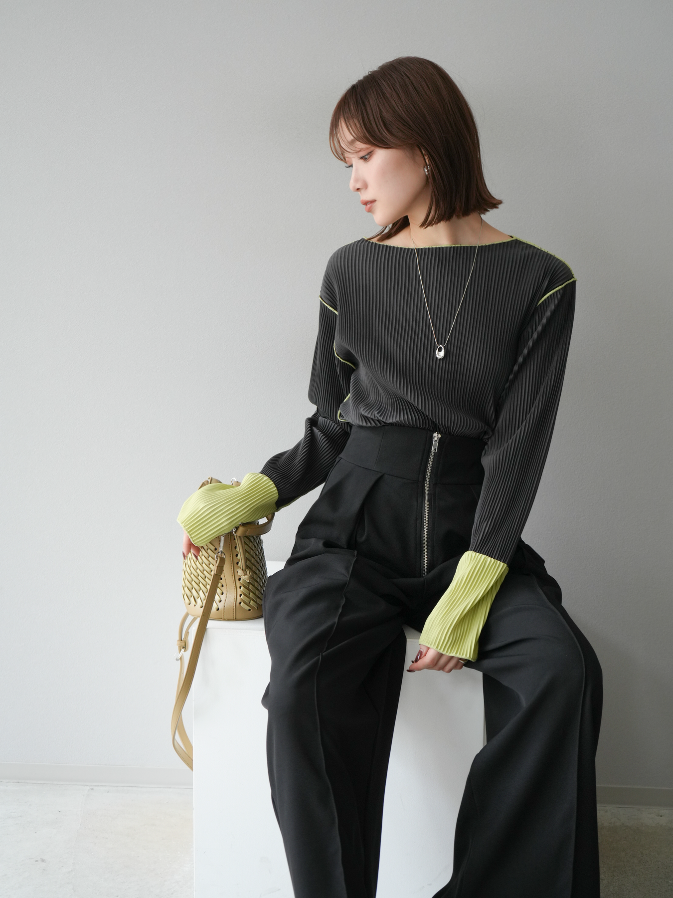 [予約]バイカラープリーツトップス/チャコール