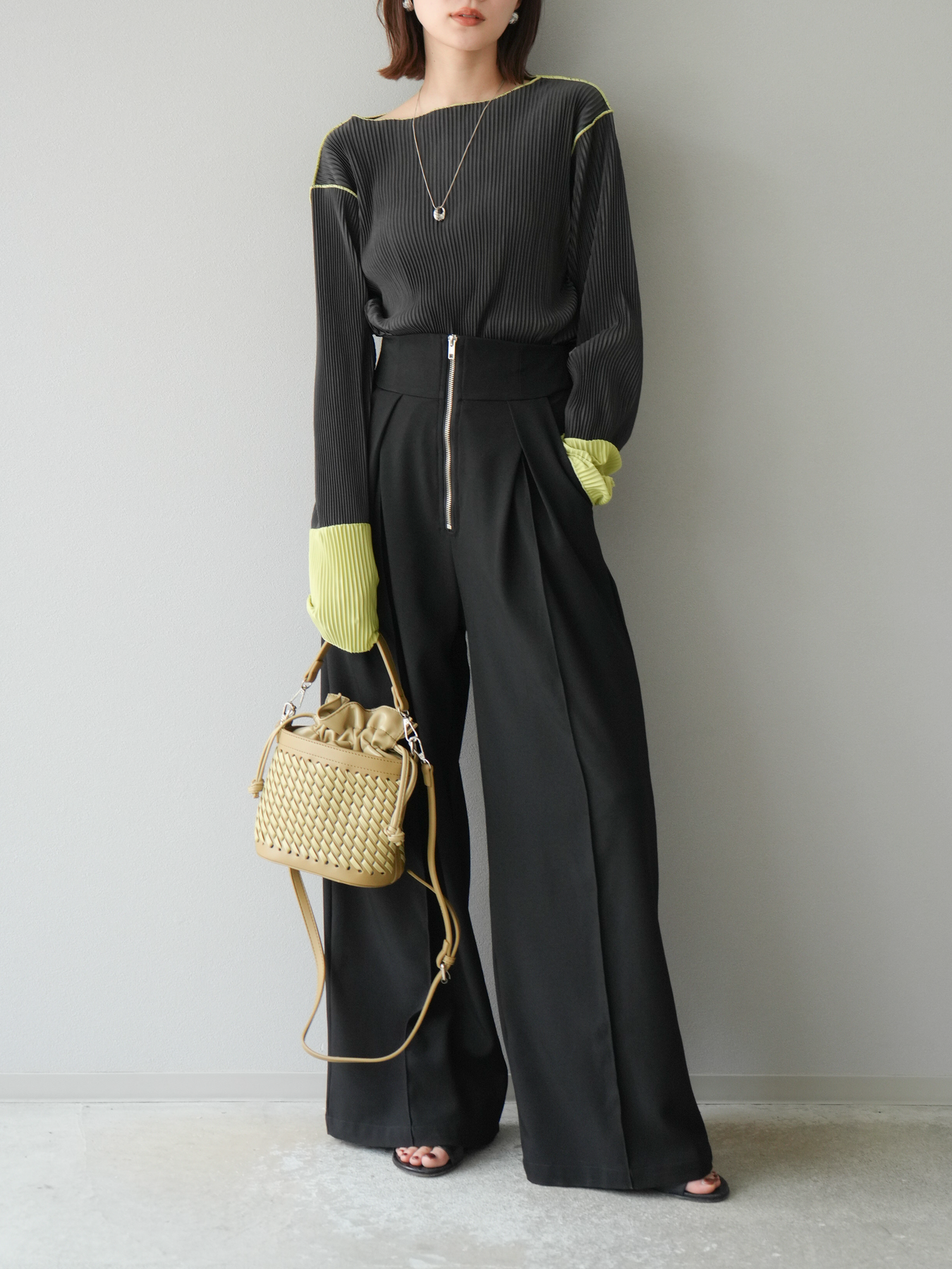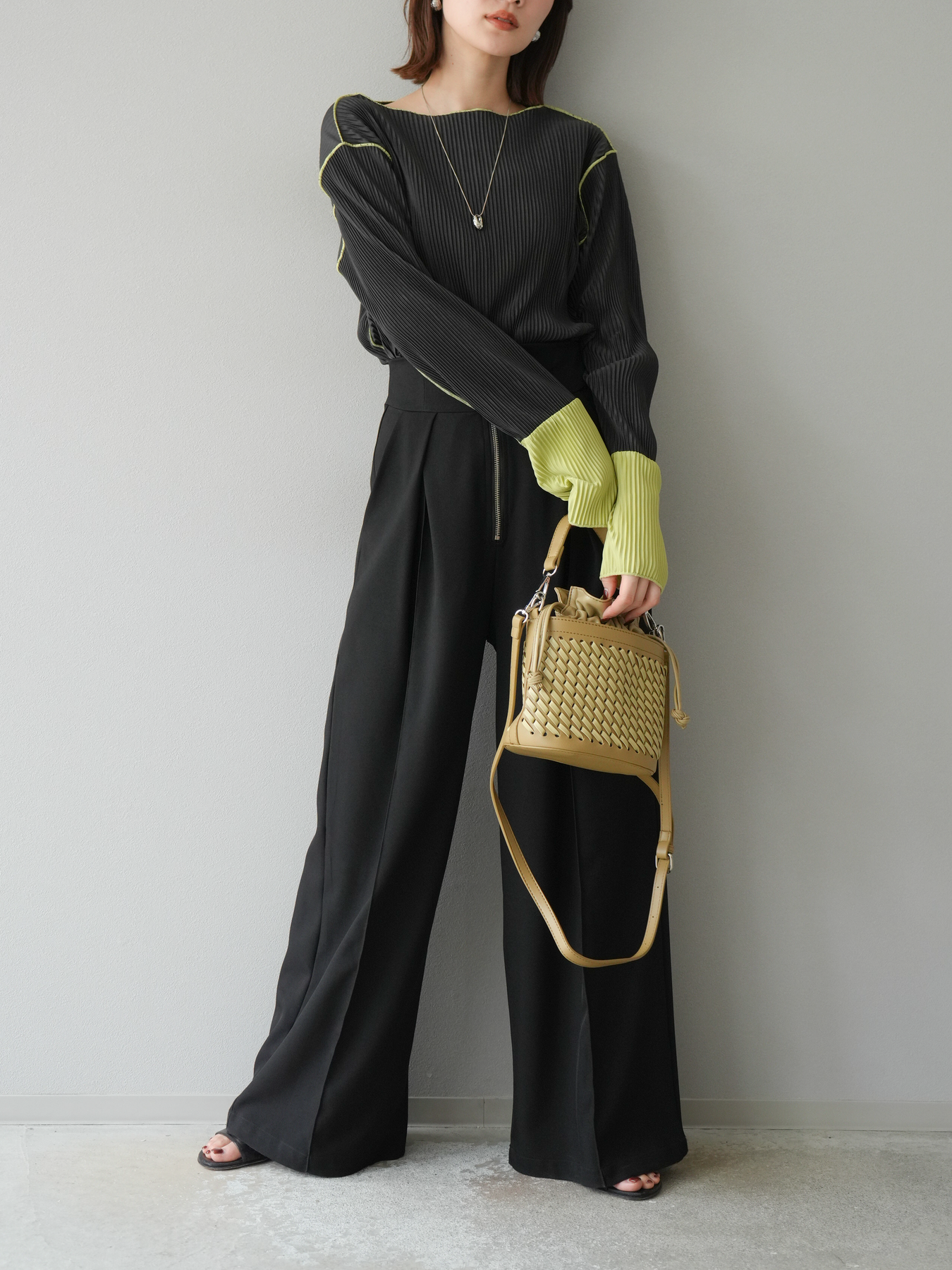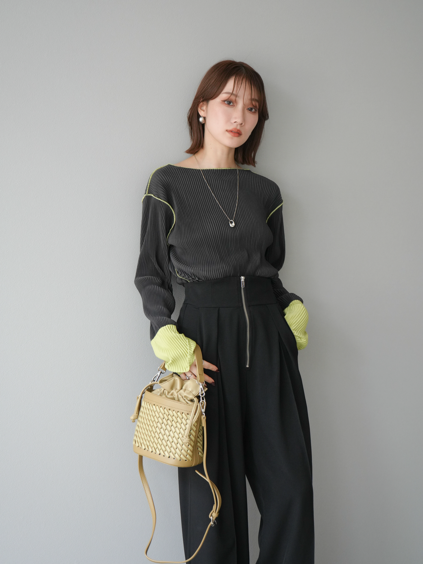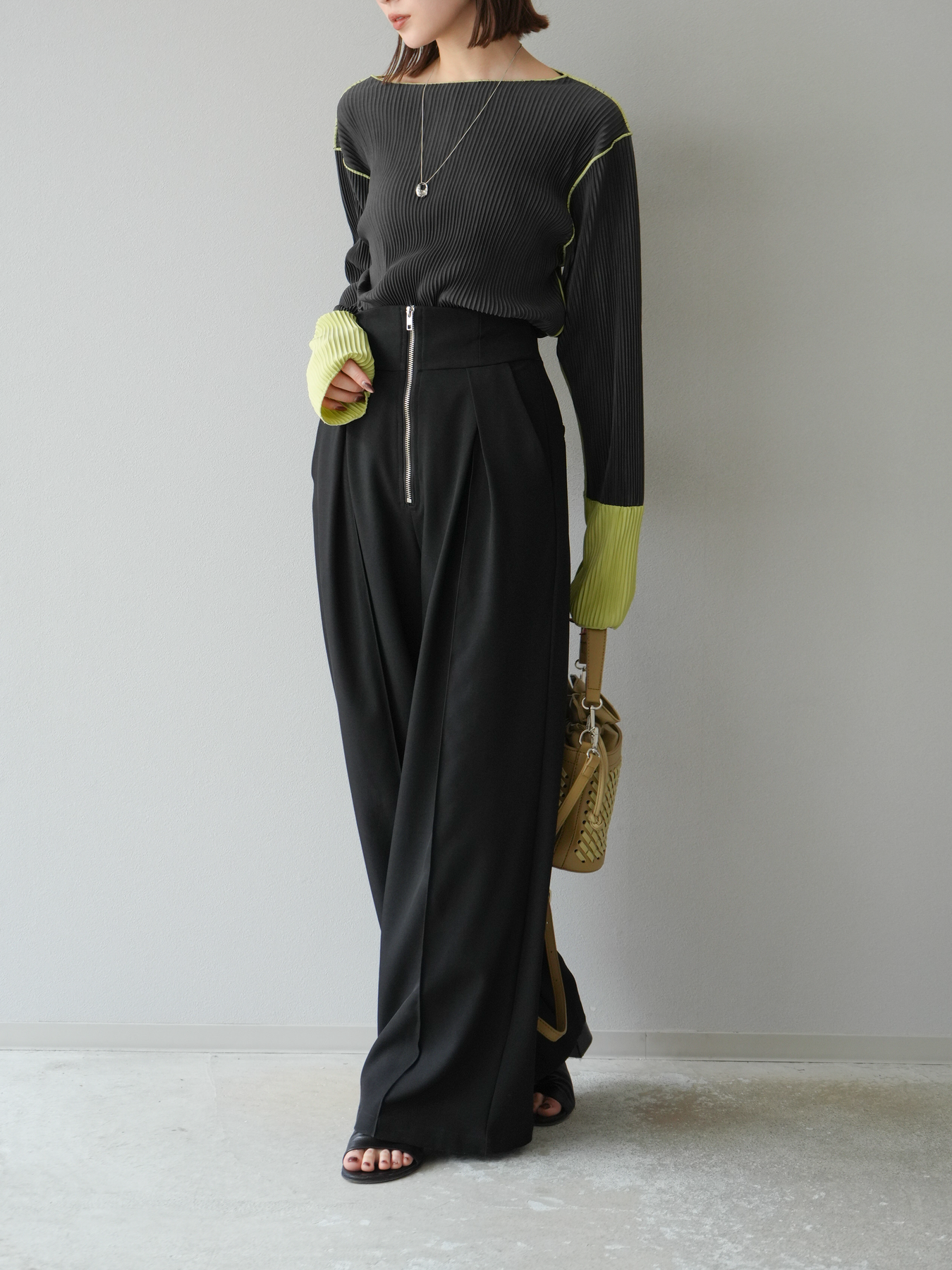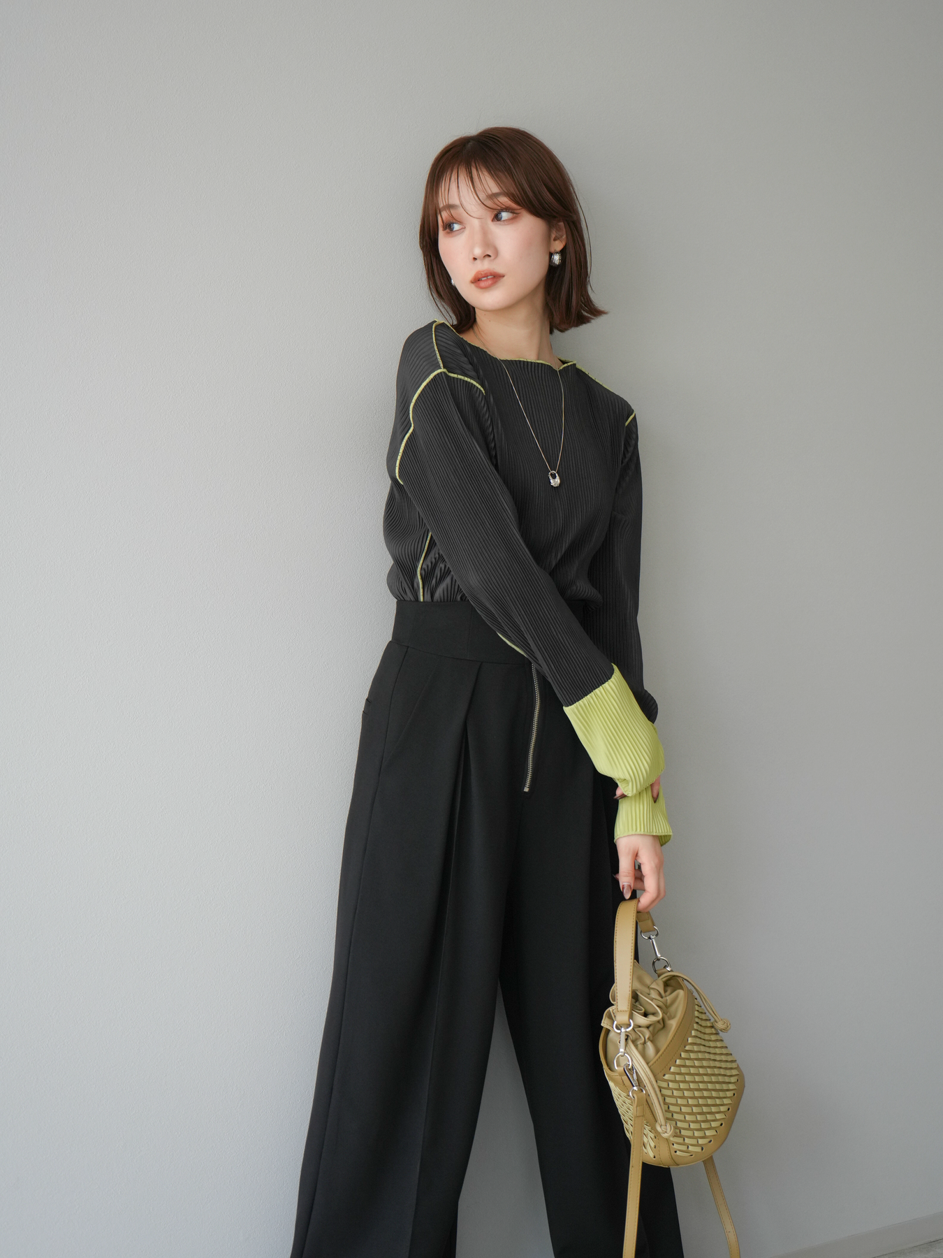 [予約]バイカラープリーツトップス/チャコール