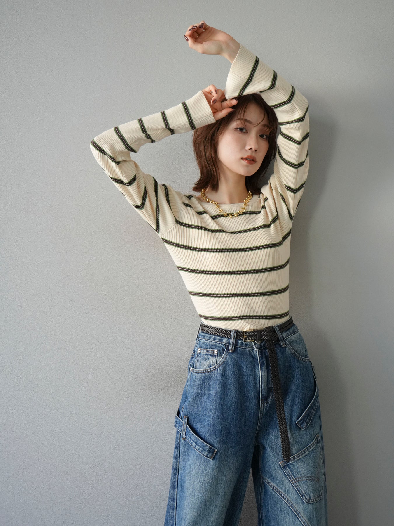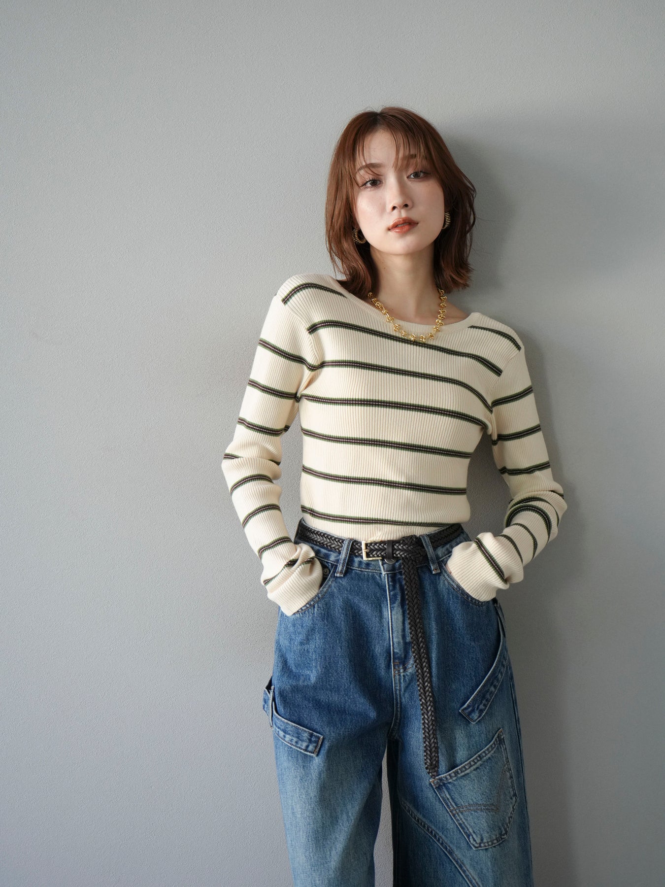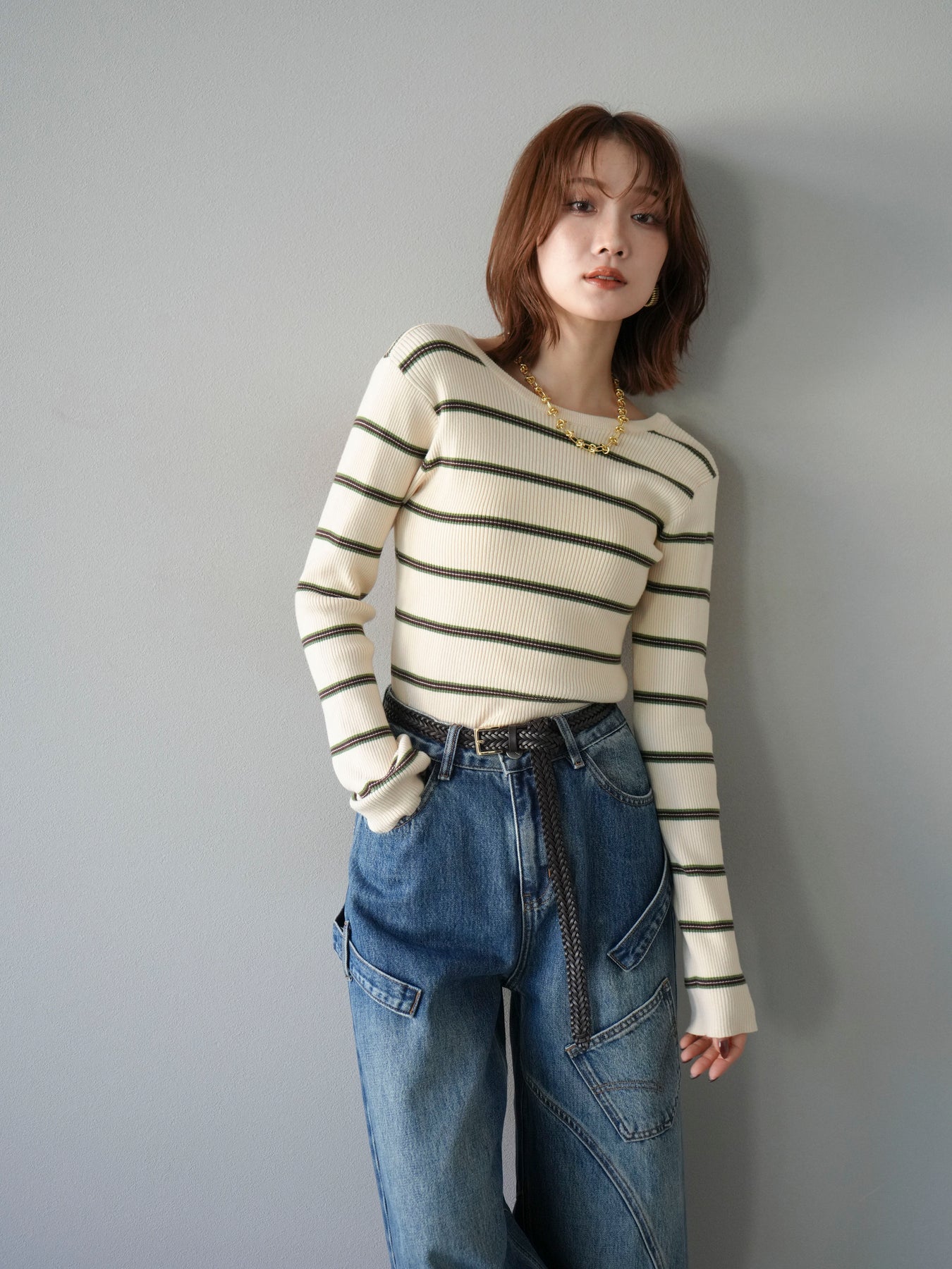 [予約]バックオープンボーダーテレコリブトップス/アイボリー