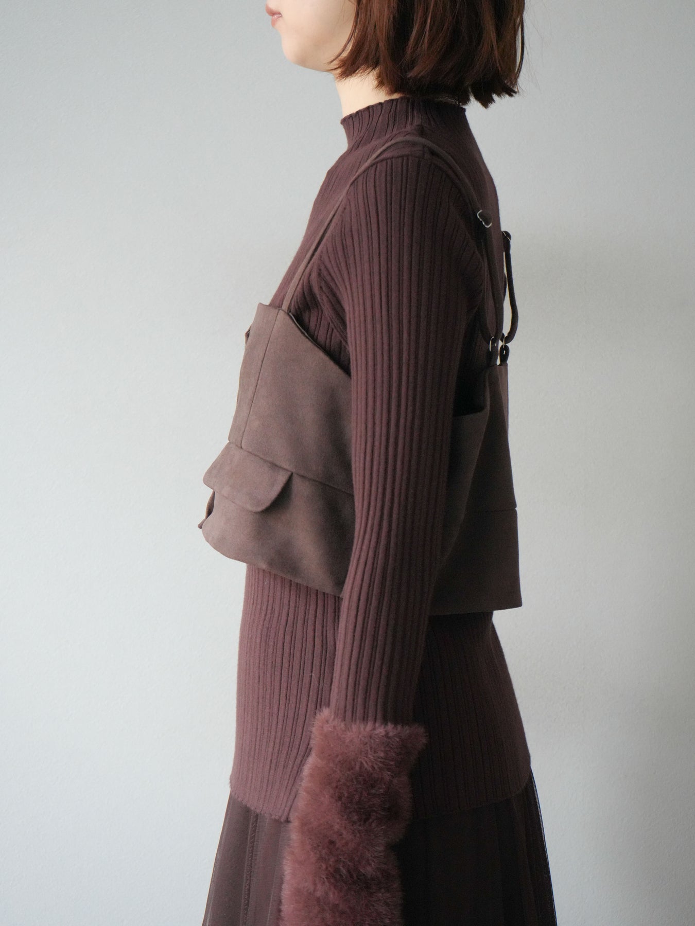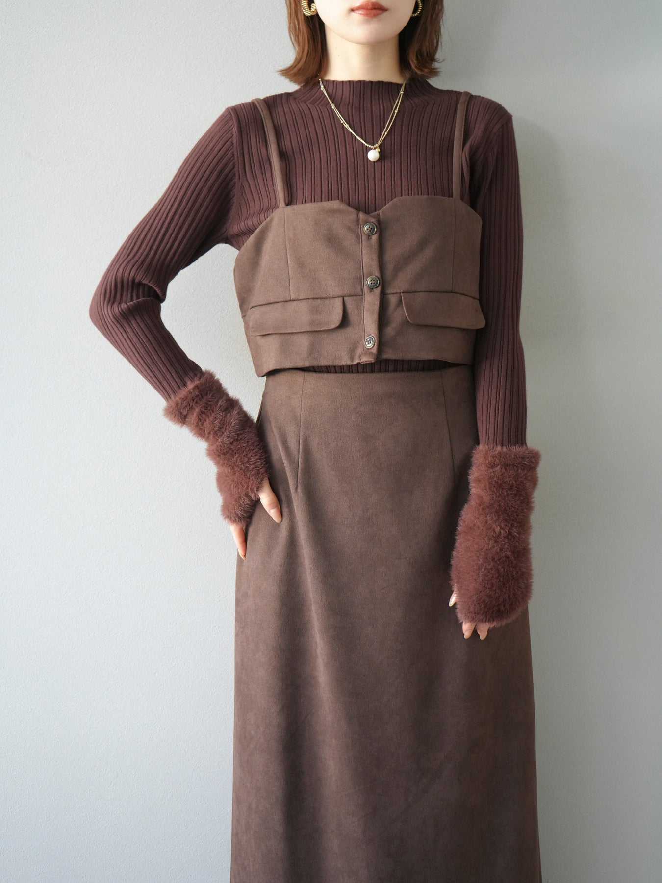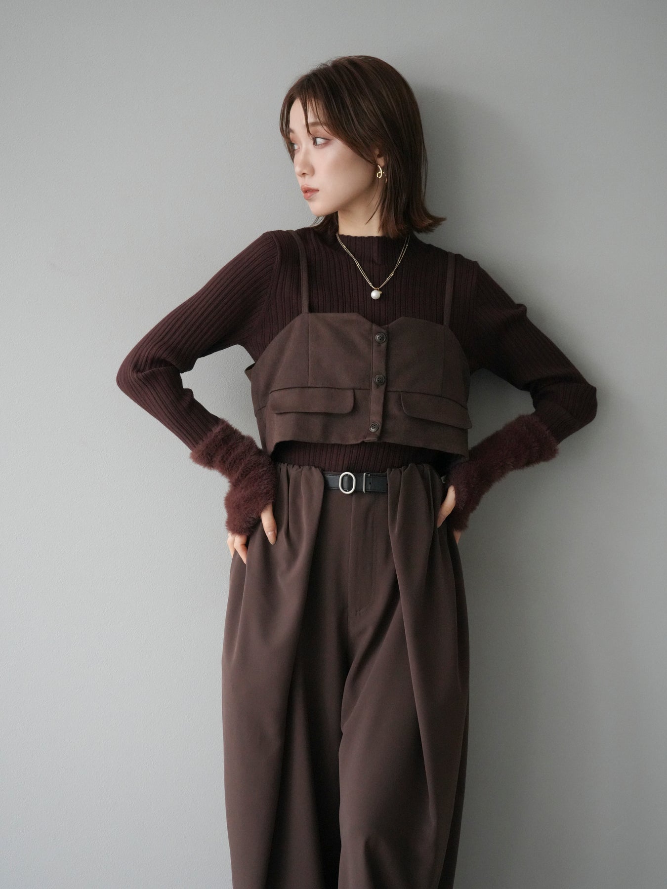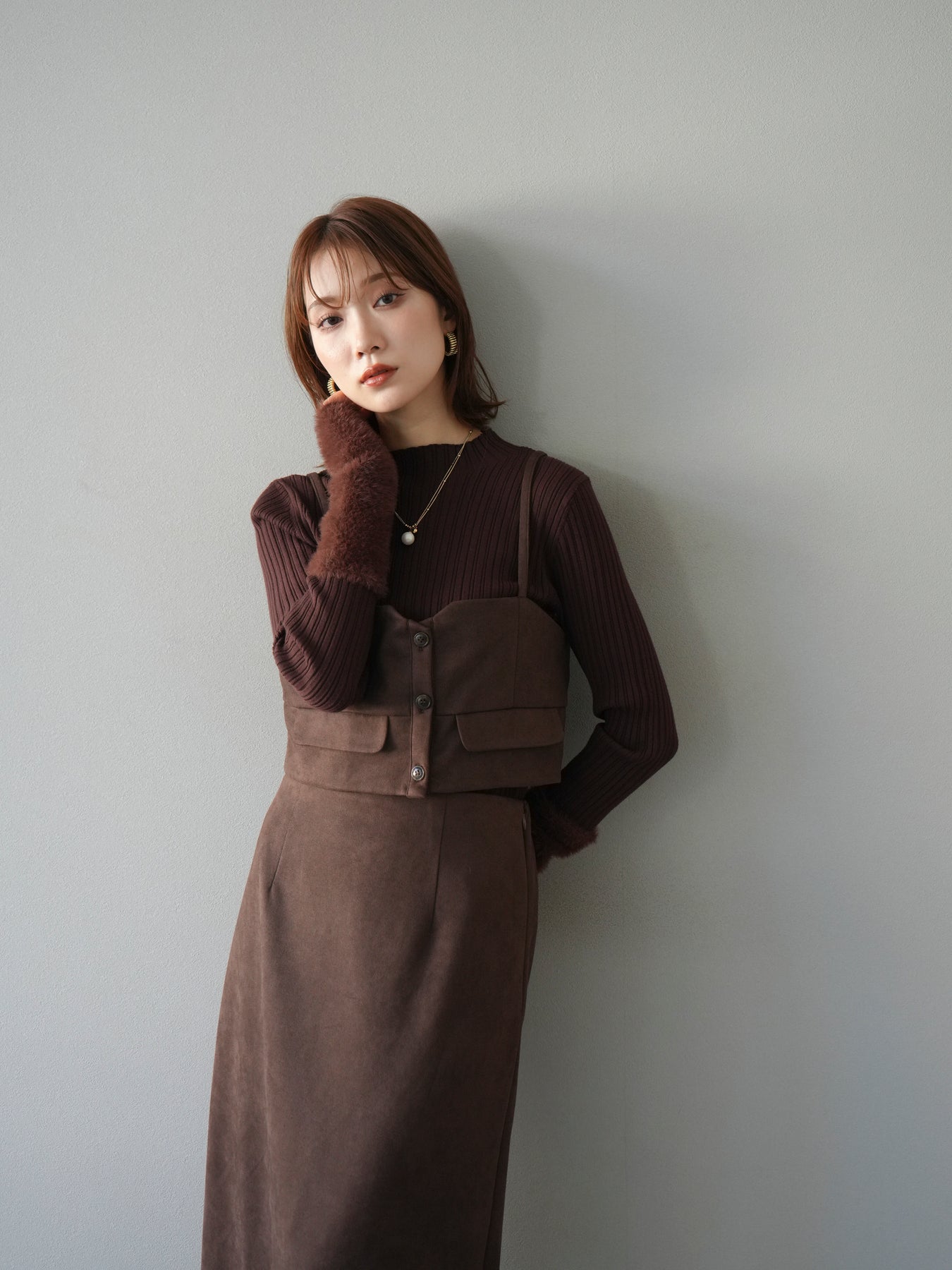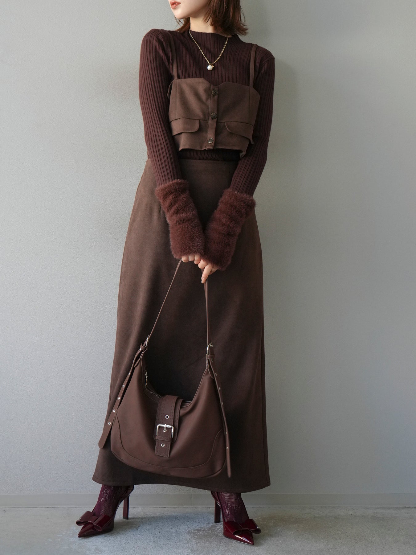 スウェード調素材を使用したビスチェは、シーズンムード漂う落ち着いた表情が魅力。コンパクトなシルエットながらも、フロントのボタンやポケットデザインがアクセントとなり、スタイリングに立体感をプラスしてくれます。シャツやカットソーに重ねればトレンド感のあるレイヤードスタイルに、ジャケットのインナーとして合わせればモードな印象に。ベーシックながらも存在感を放ち、コーディネートの幅を広げてくれるアイテムです。