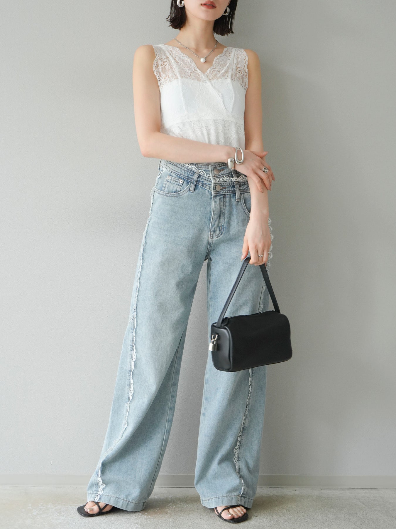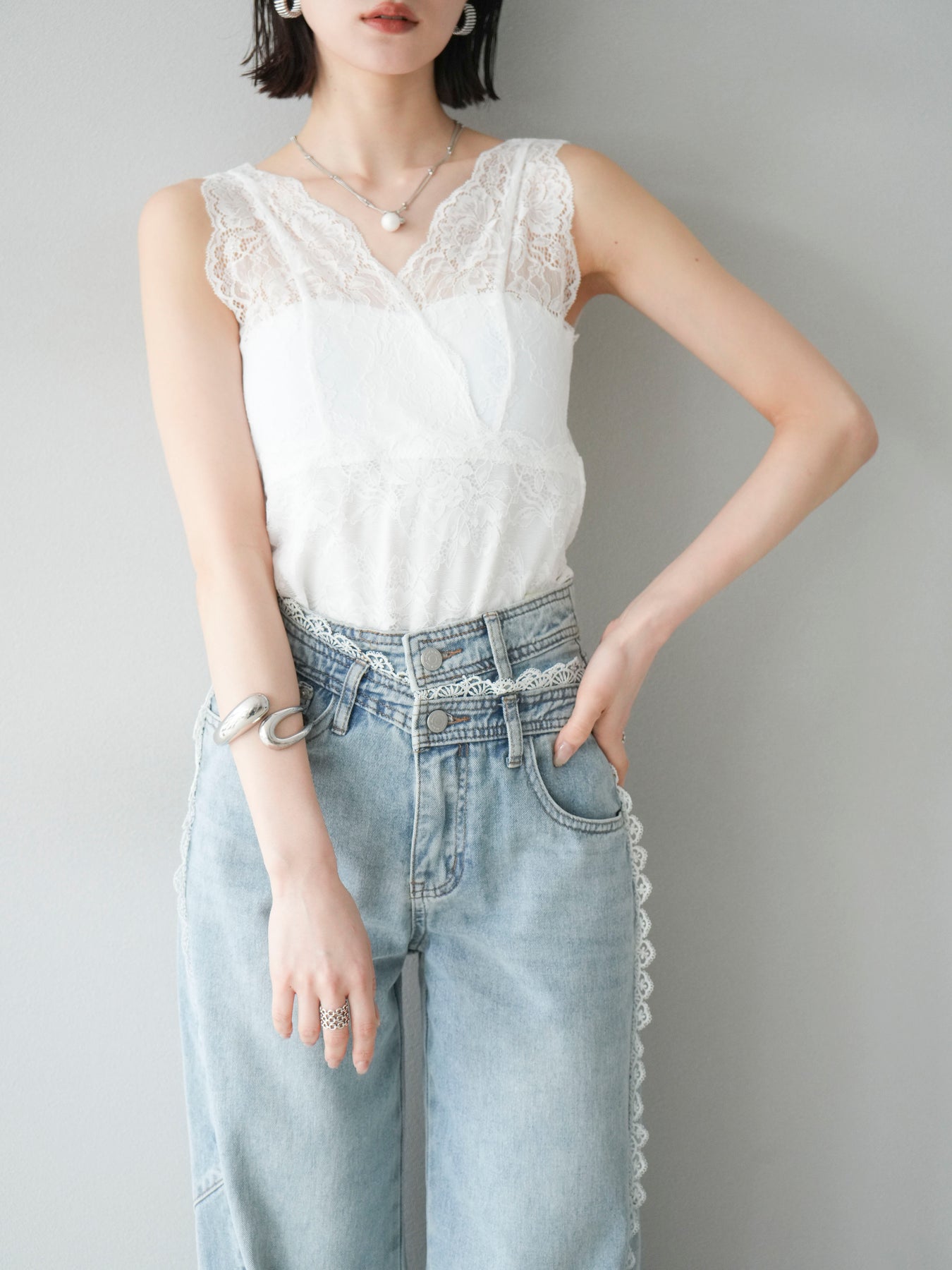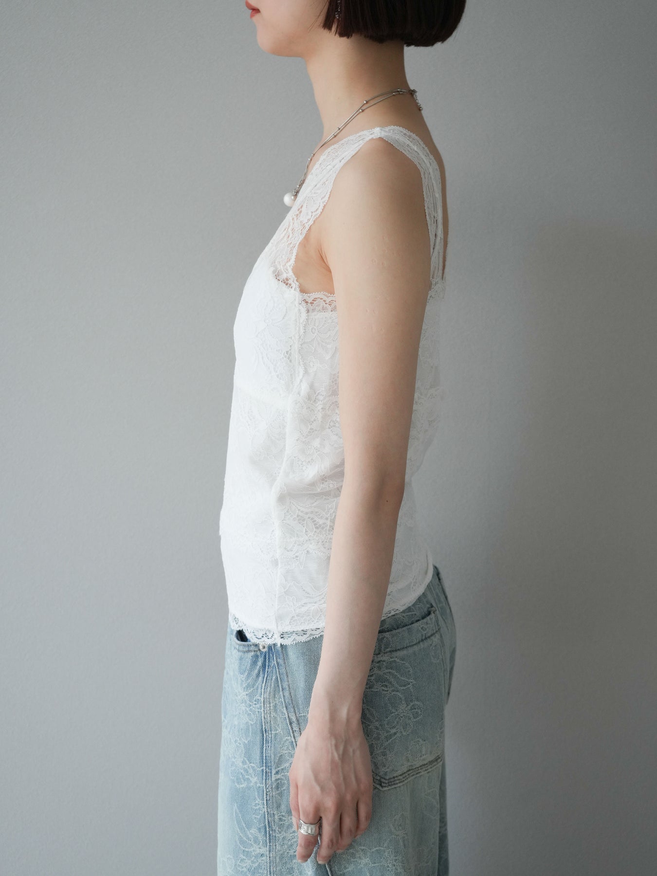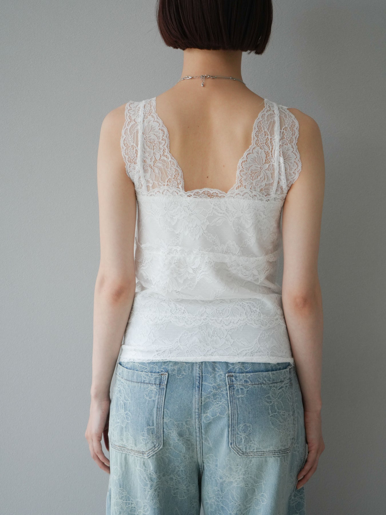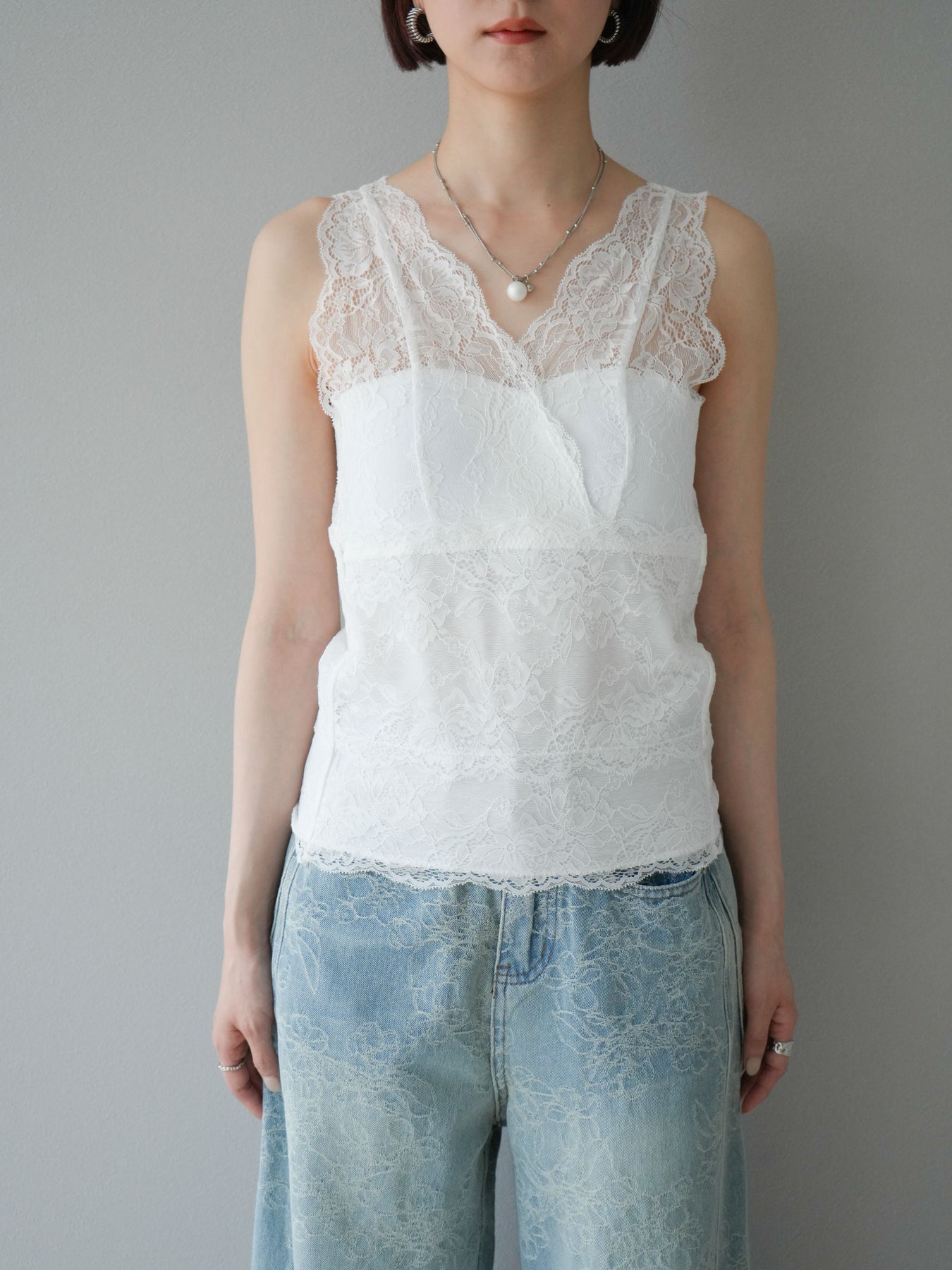 繊細な総レースが華やかさを演出する、カップ付きレースタンクトップ。ストレッチの効いた柔らかな素材でフィット感があり、1枚でさらっと着られる安心のカップイン仕様。深めのVネックデザインがデコルテを美しく見せ、レイヤードスタイルのインナーとしても活躍します。キャミワンピやシアーアイテムの下に合わせるのはもちろん、ジャケットやカーディガンとの相性も抜群。フェミニンさと実用性を兼ね備えた、大人のための万能インナーです。