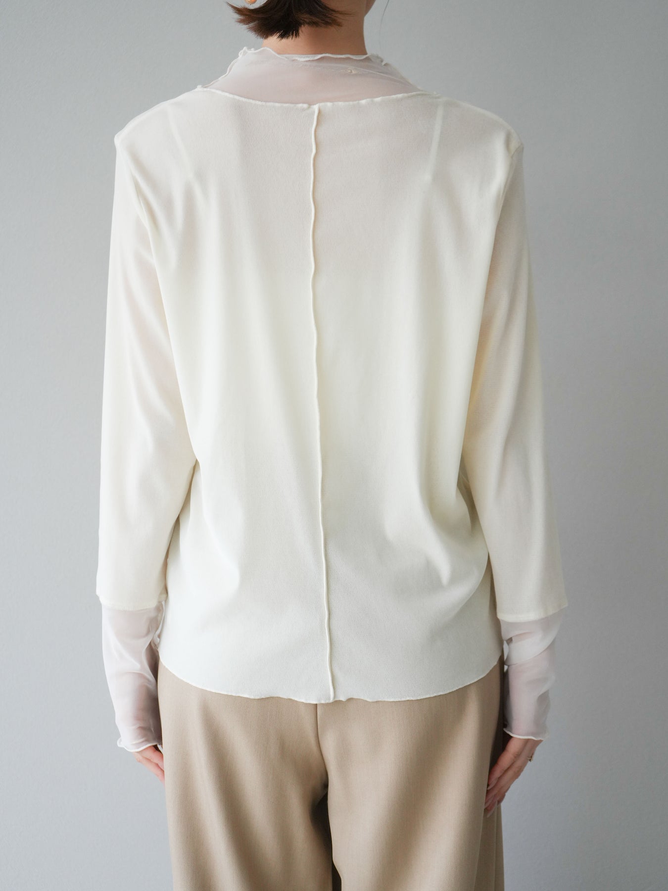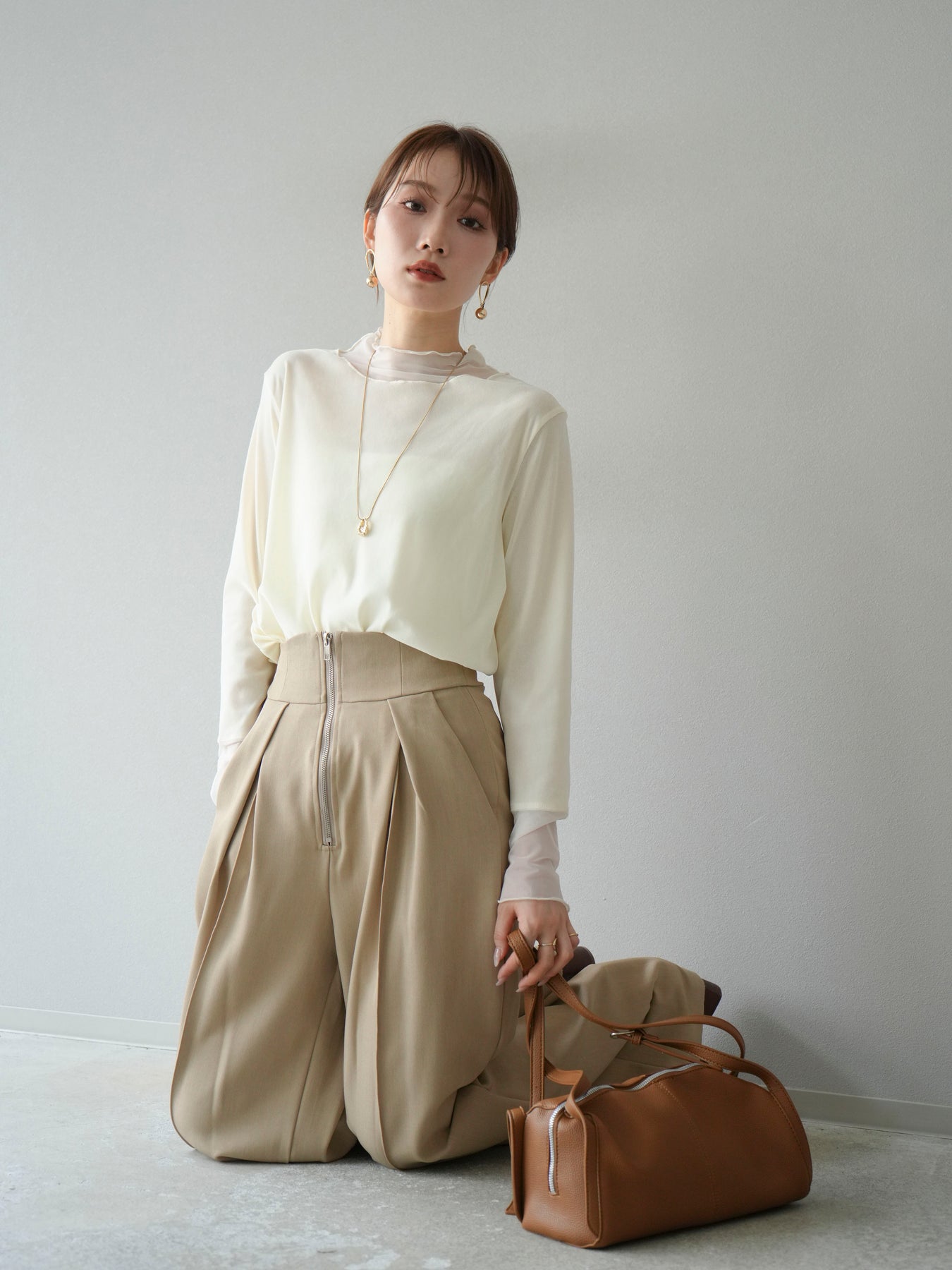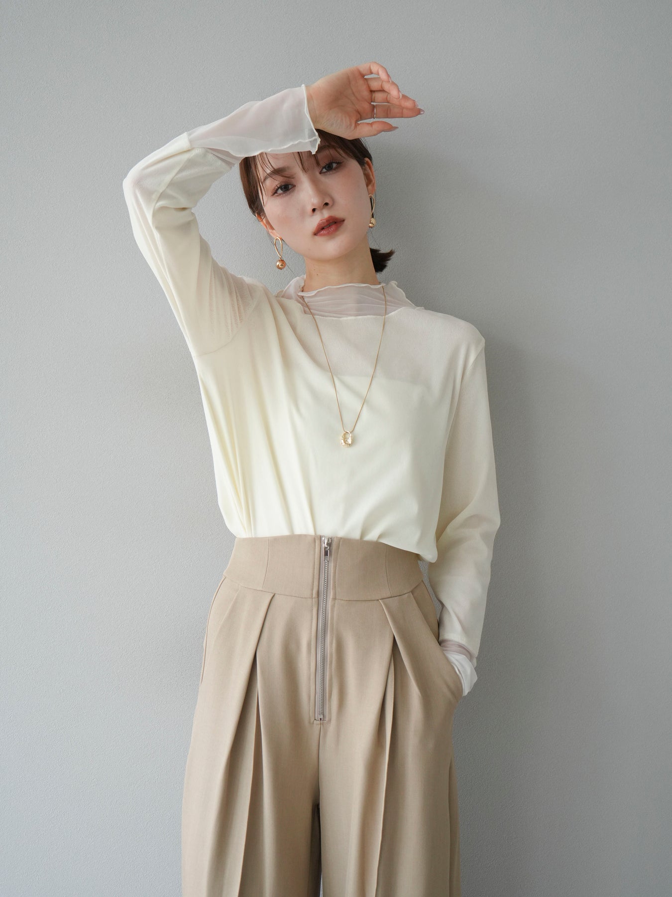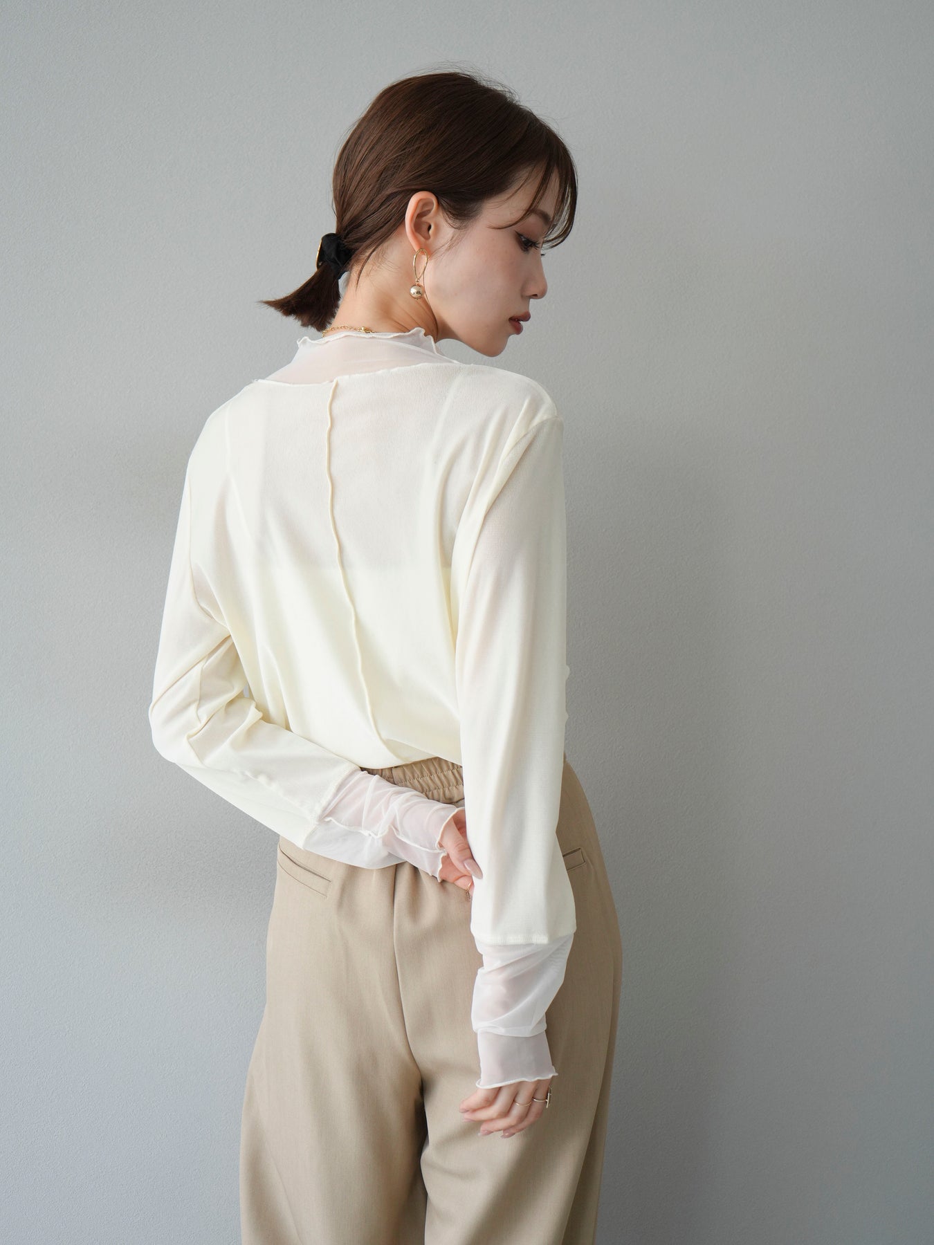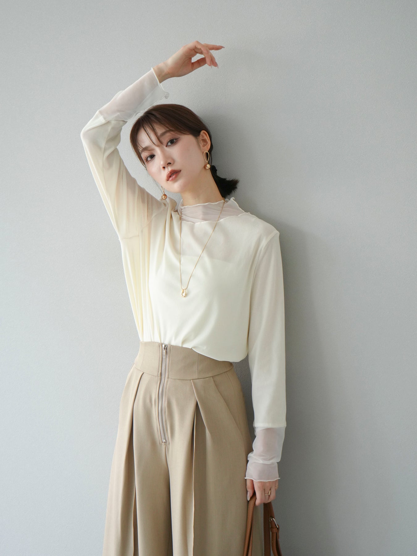 艶やかなベロア素材とシアー生地を切り替えたデザインが印象的なトップス。滑らかな質感のベロアがシーズンムードを高め、袖口やネックラインにあしらわれた透け感のあるディテールが女性らしい抜け感を演出します。コンパクトなシルエットでボトムスを選ばず、スカートにもパンツにも好相性。1枚で存在感を放ちながら、ジャケットやカーディガンのインナーとしても映える万能アイテムです。 ※ボトムス、キャミソール(インナー)以外の商品は一律でインナーは付属していません。