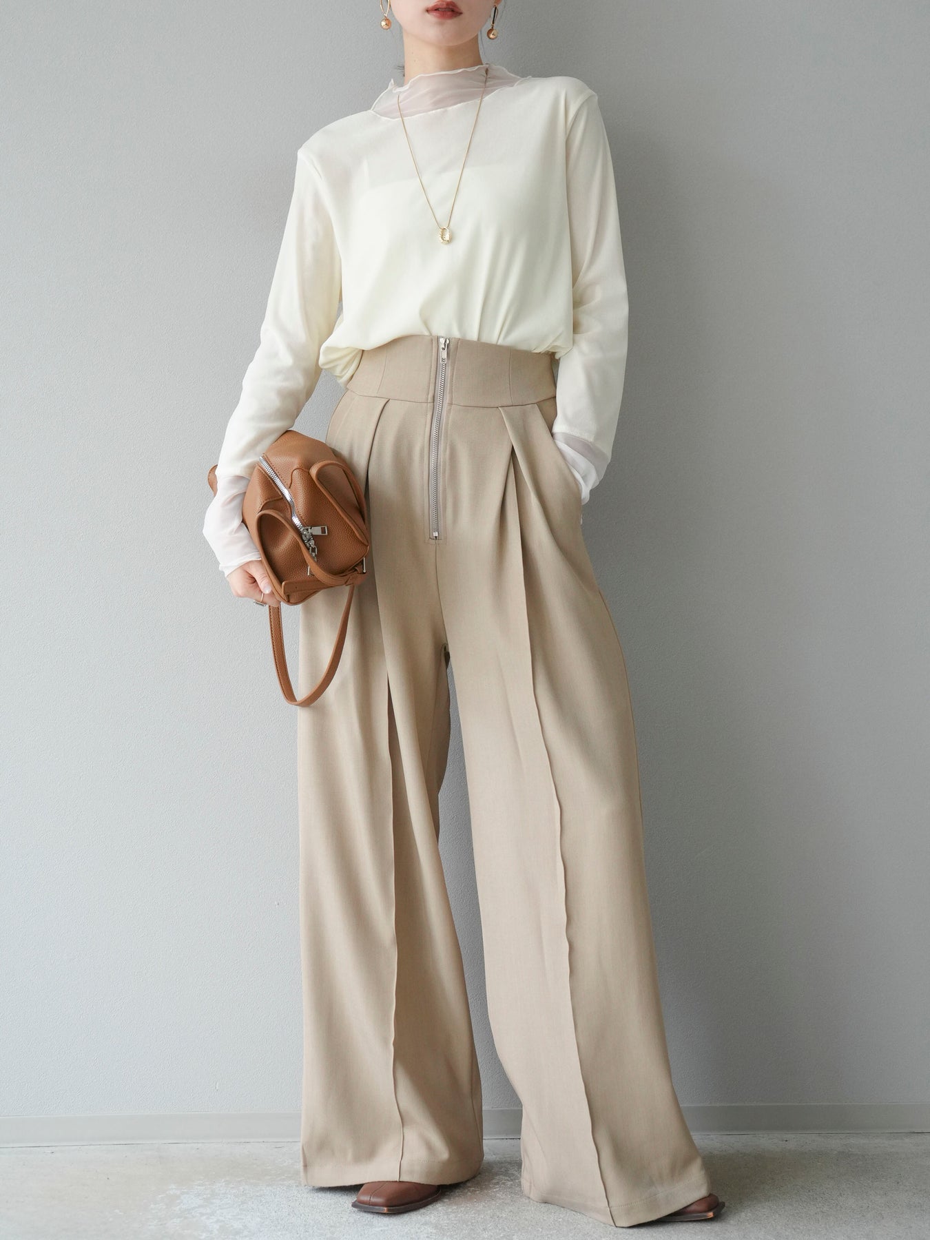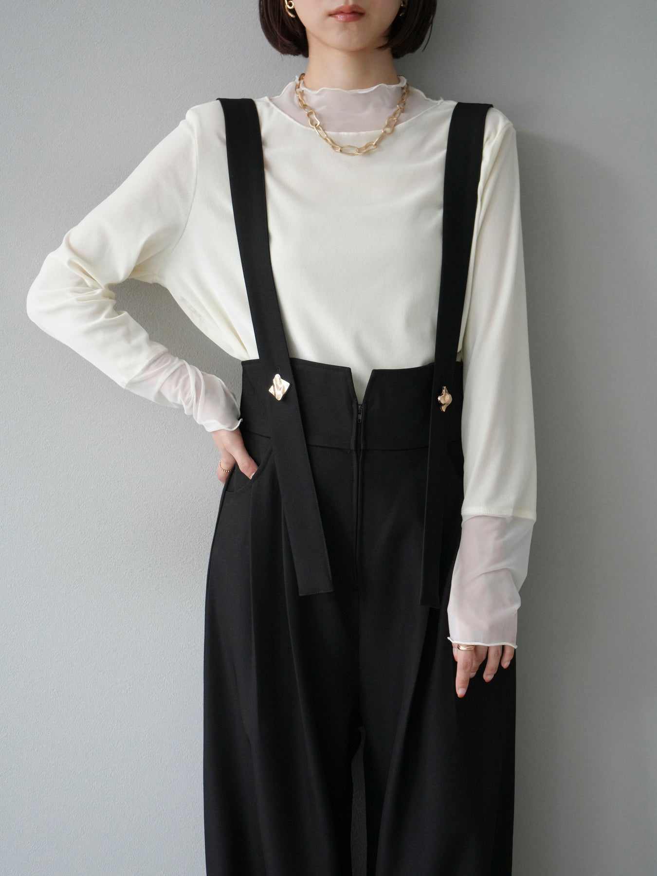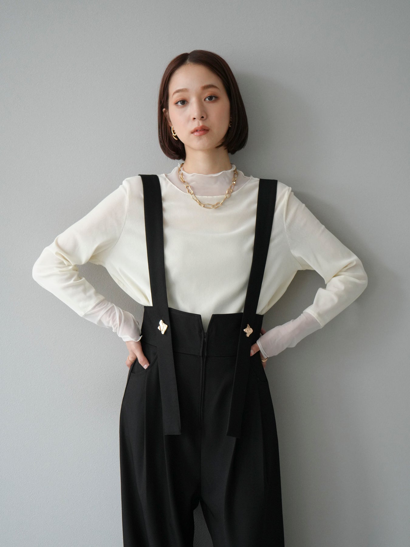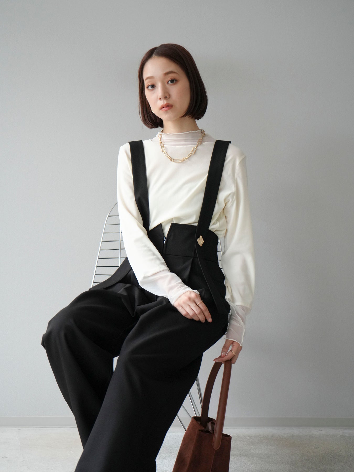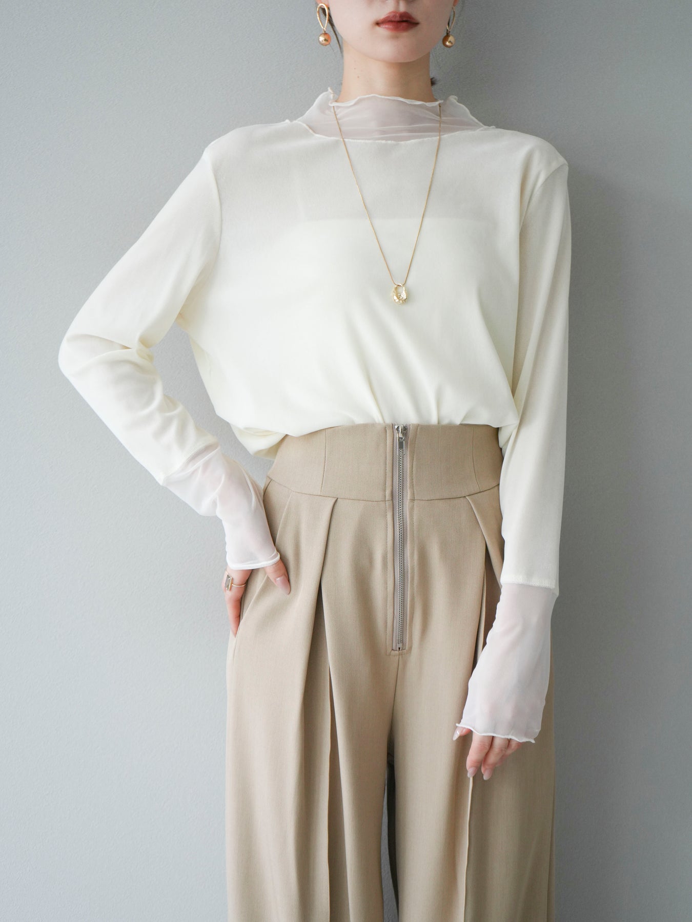 艶やかなベロア素材とシアー生地を切り替えたデザインが印象的なトップス。滑らかな質感のベロアがシーズンムードを高め、袖口やネックラインにあしらわれた透け感のあるディテールが女性らしい抜け感を演出します。コンパクトなシルエットでボトムスを選ばず、スカートにもパンツにも好相性。1枚で存在感を放ちながら、ジャケットやカーディガンのインナーとしても映える万能アイテムです。 ※ボトムス、キャミソール(インナー)以外の商品は一律でインナーは付属していません。