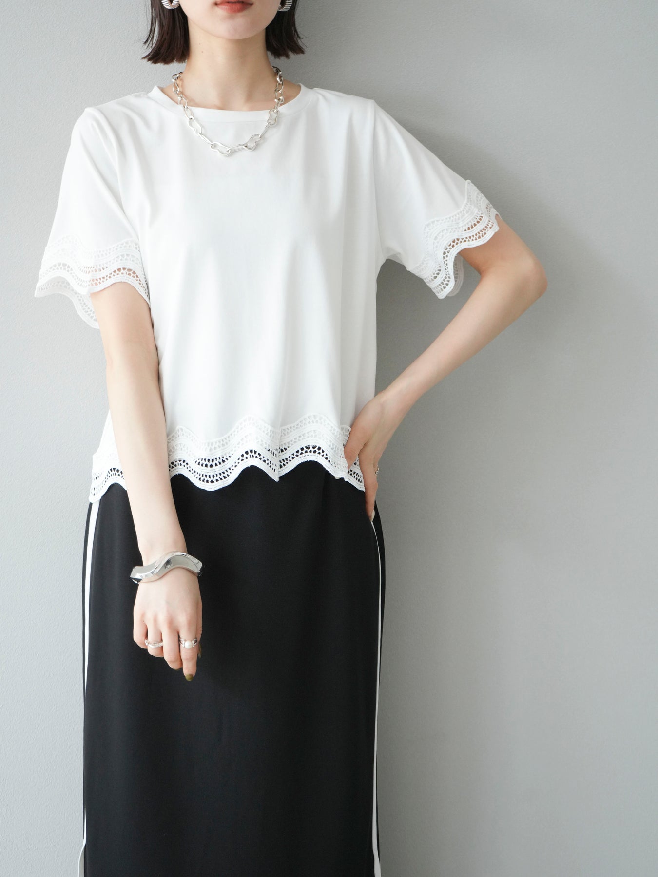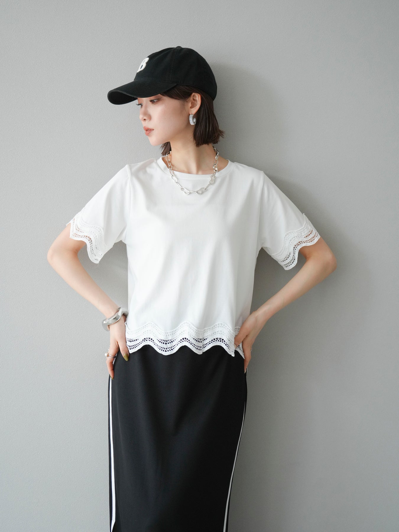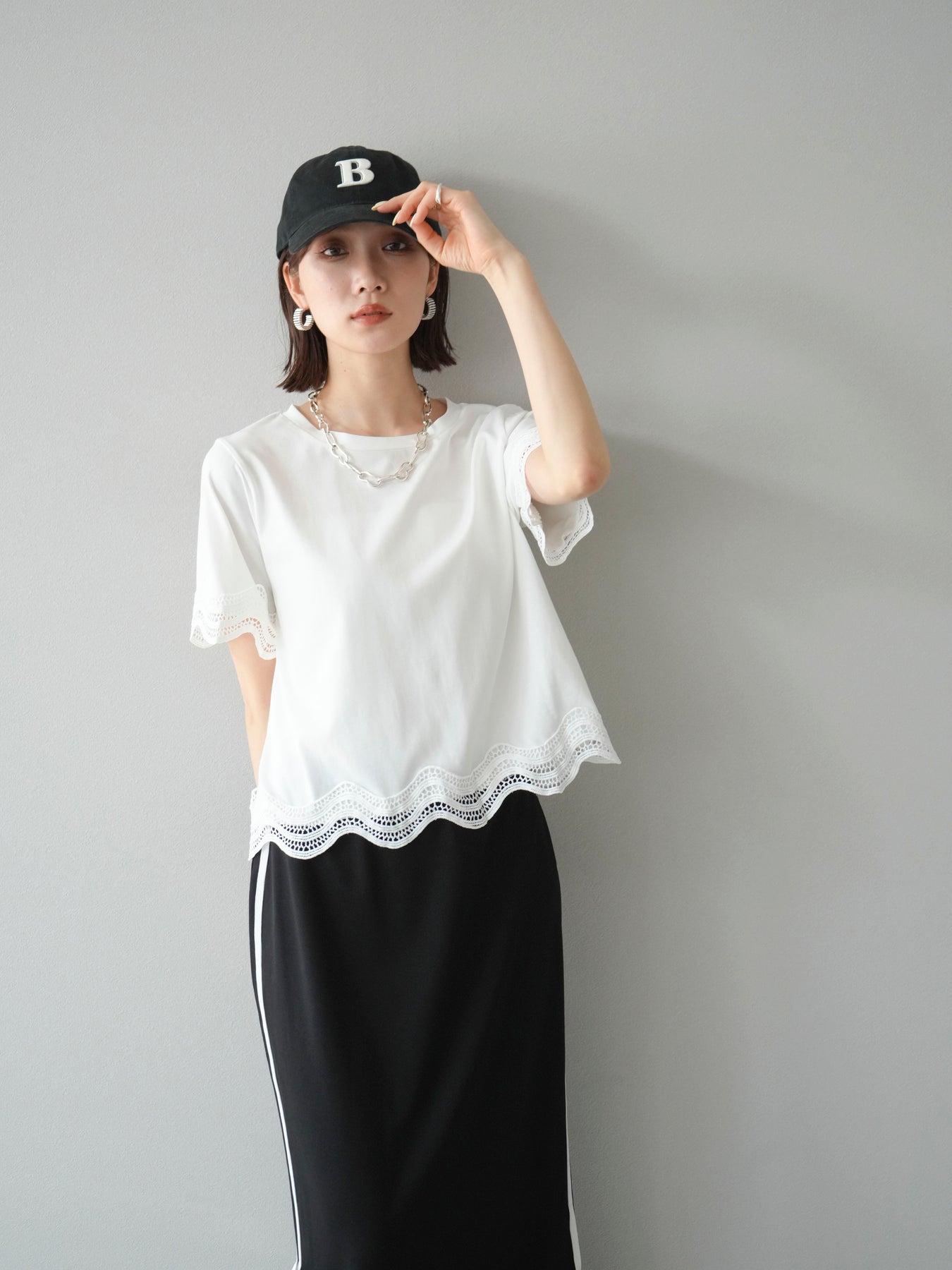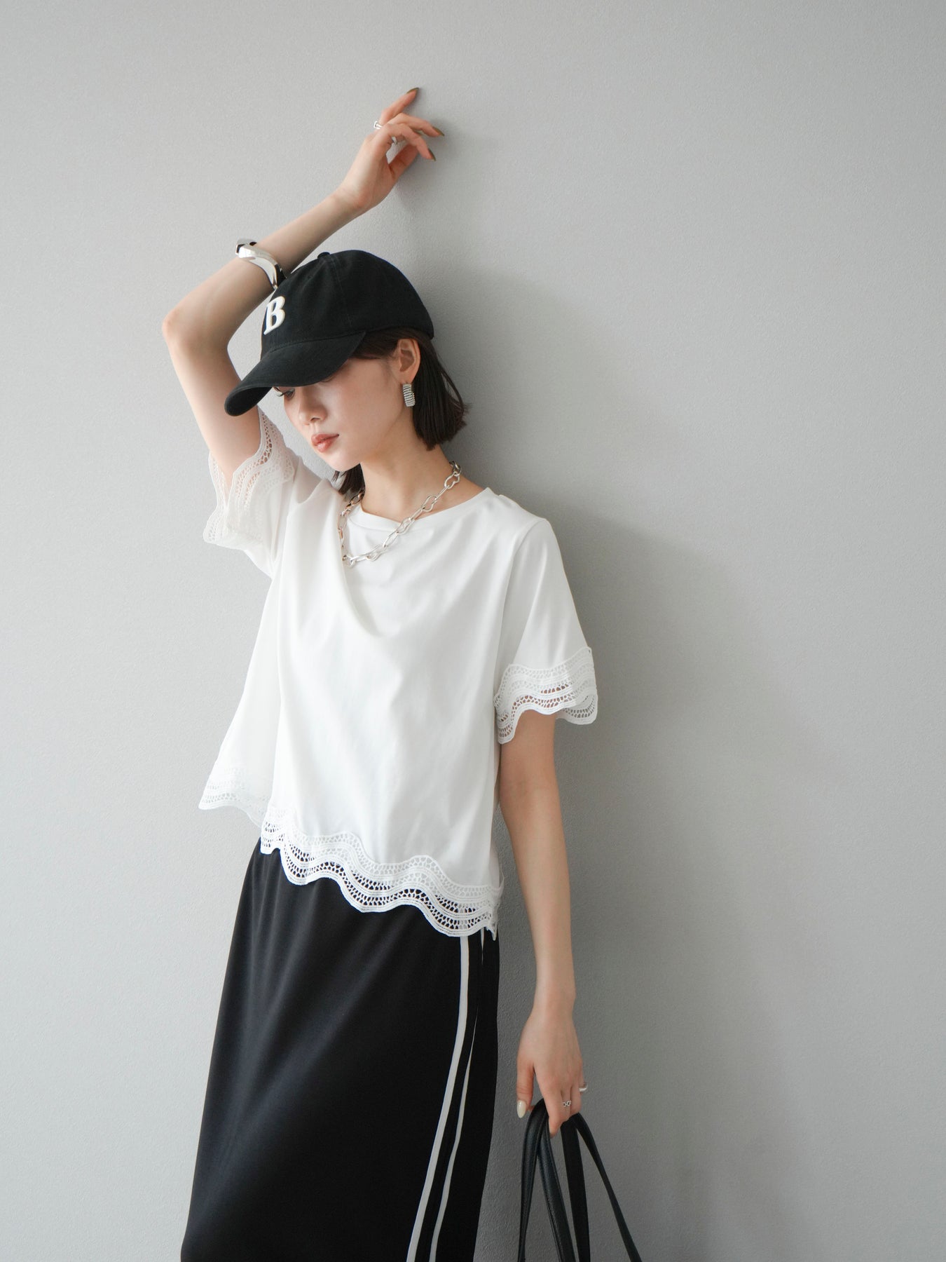 袖にあしらわれた繊細なレースが目を惹く、大人フェミニンなカットソー。 シンプルなボディに華やかなレースディテールをプラスし、1枚で着映えするデザインに仕上げました。 柔らかく肌触りの良いカット素材で、デイリーに着やすい快適な着心地。 レース部分は透けすぎず上品な印象を与え、甘すぎず洗練された雰囲気を演出します。 ジャンスカやサロペットのインナーとしてはもちろん、ボトムインしてもアウトで着ても様になる万能トップス。 カジュアルからきれいめまで、幅広いスタイリングにマッチします。