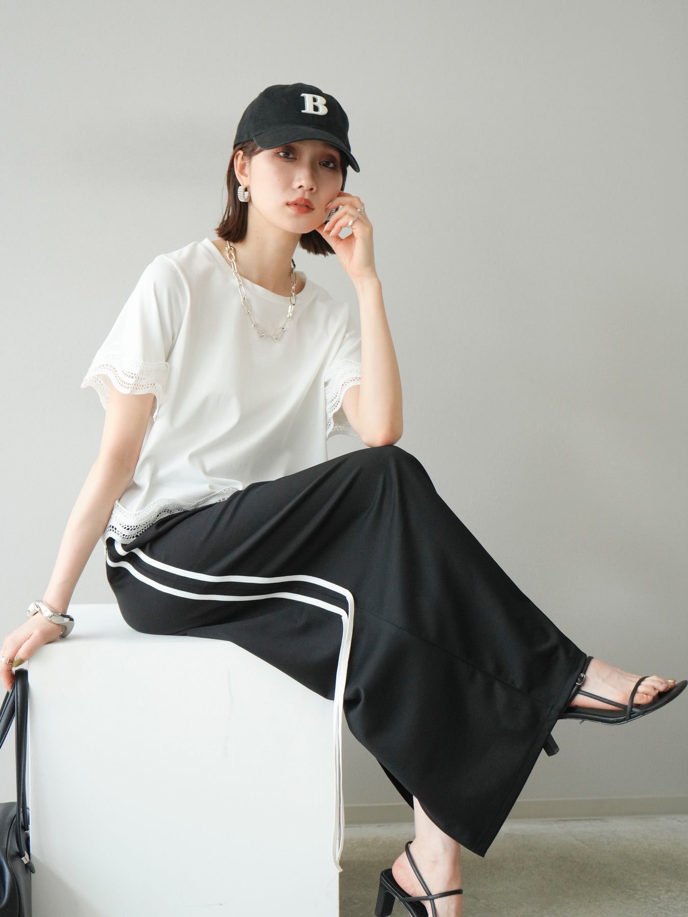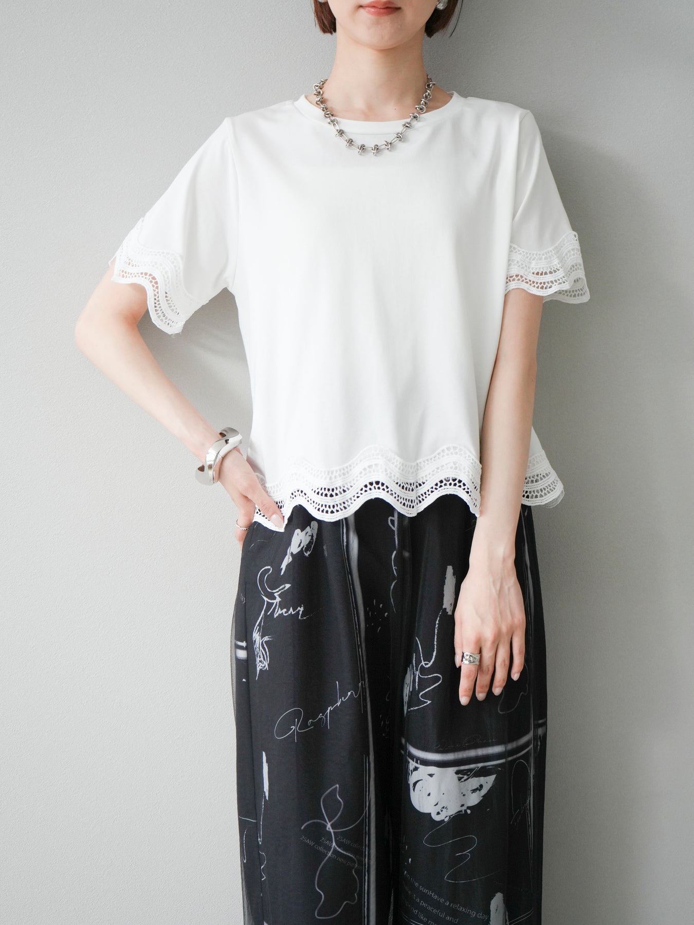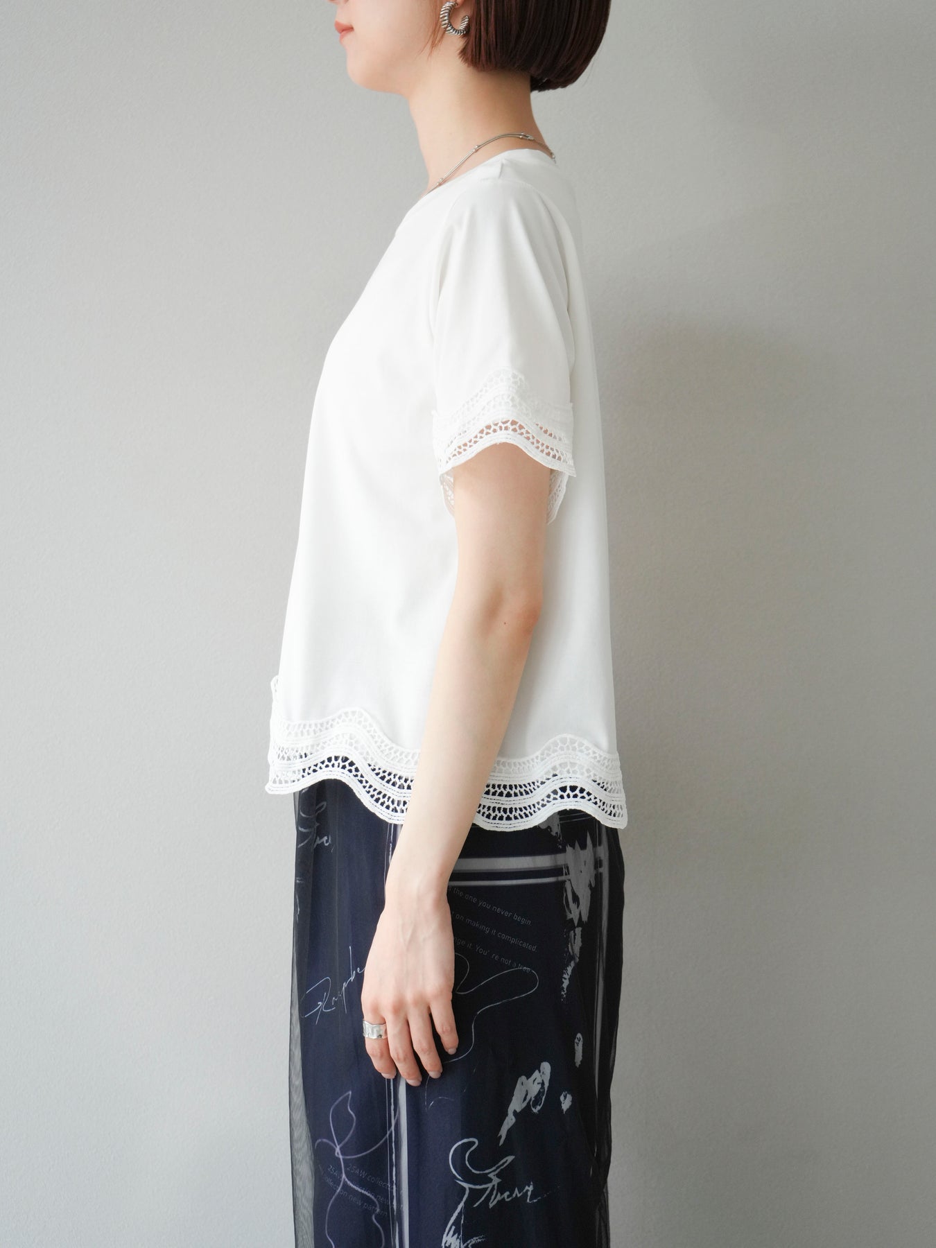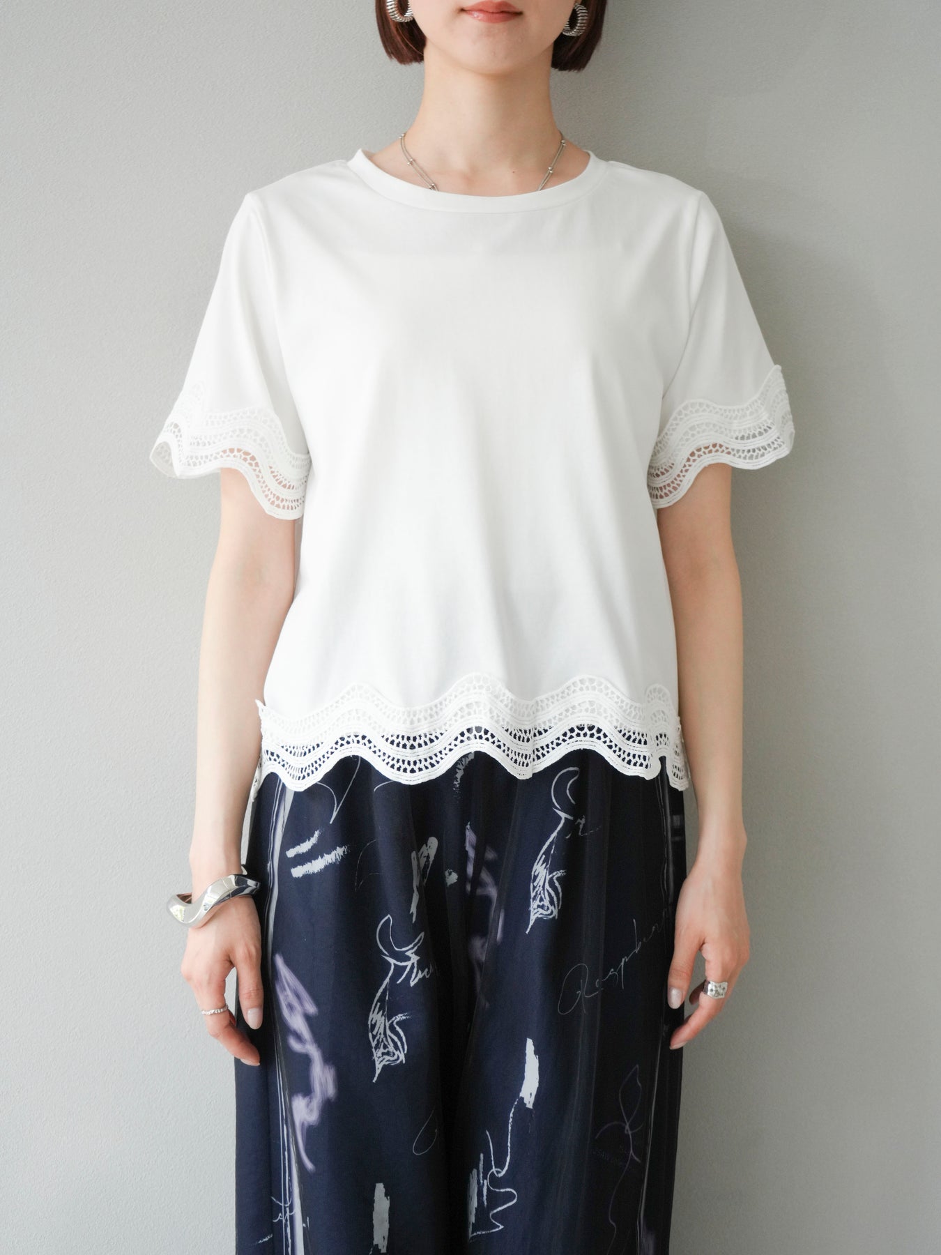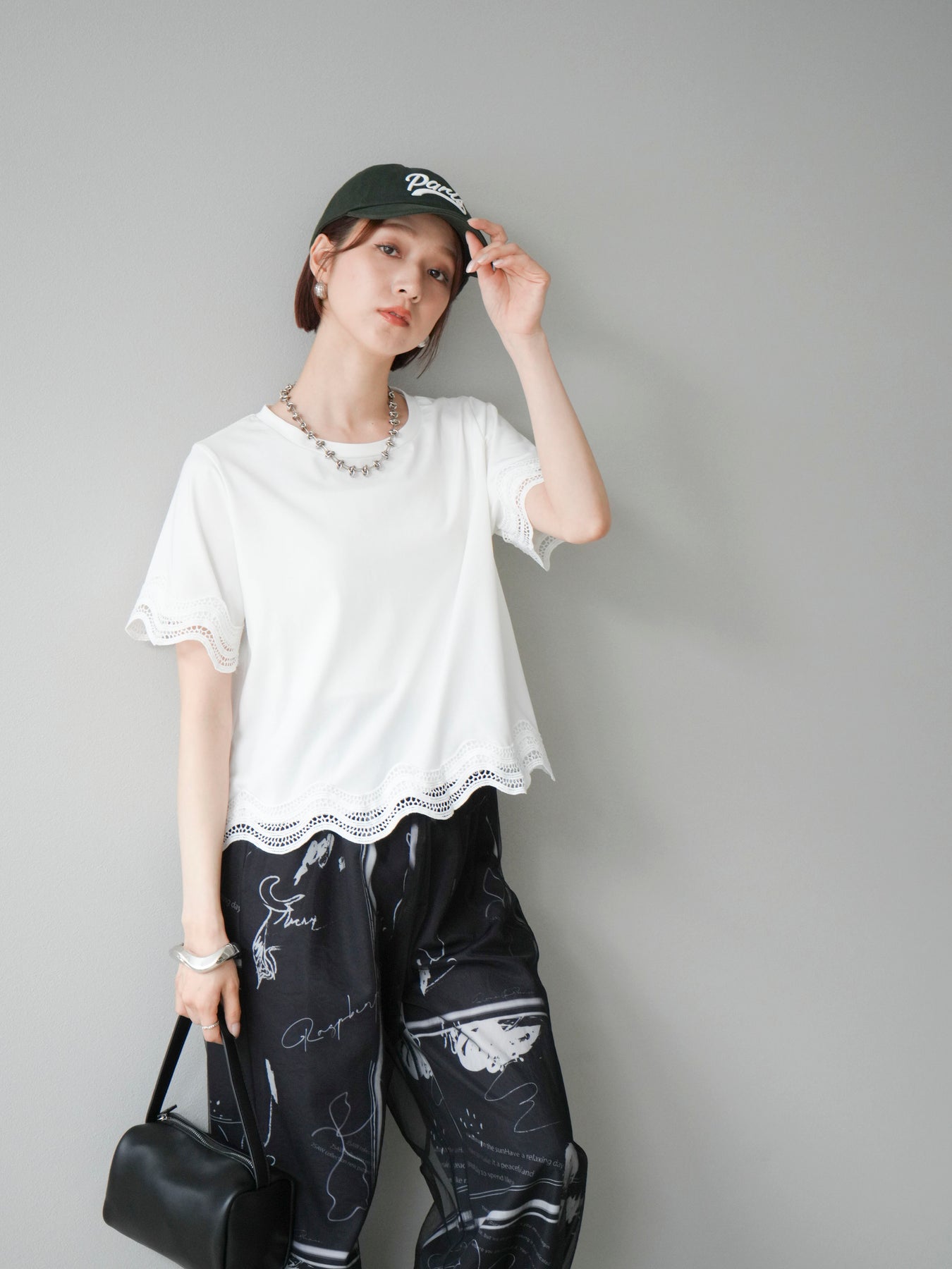 袖にあしらわれた繊細なレースが目を惹く、大人フェミニンなカットソー。 シンプルなボディに華やかなレースディテールをプラスし、1枚で着映えするデザインに仕上げました。 柔らかく肌触りの良いカット素材で、デイリーに着やすい快適な着心地。 レース部分は透けすぎず上品な印象を与え、甘すぎず洗練された雰囲気を演出します。 ジャンスカやサロペットのインナーとしてはもちろん、ボトムインしてもアウトで着ても様になる万能トップス。 カジュアルからきれいめまで、幅広いスタイリングにマッチします。