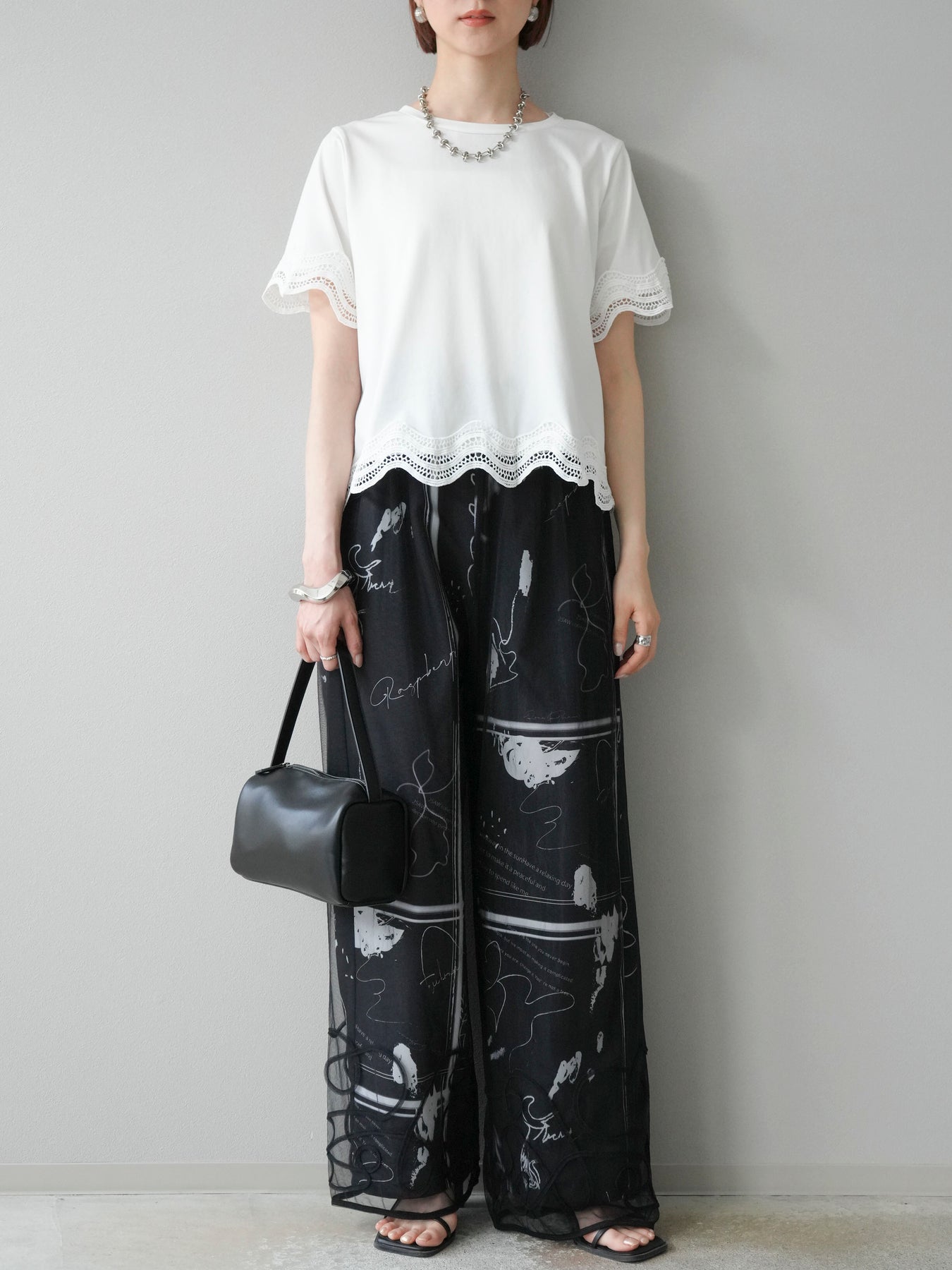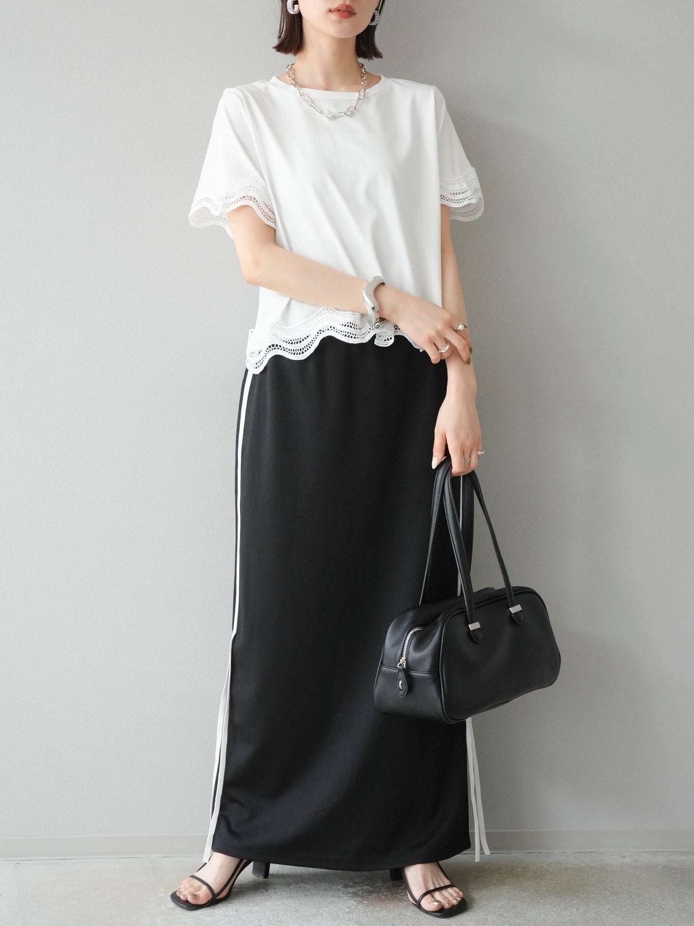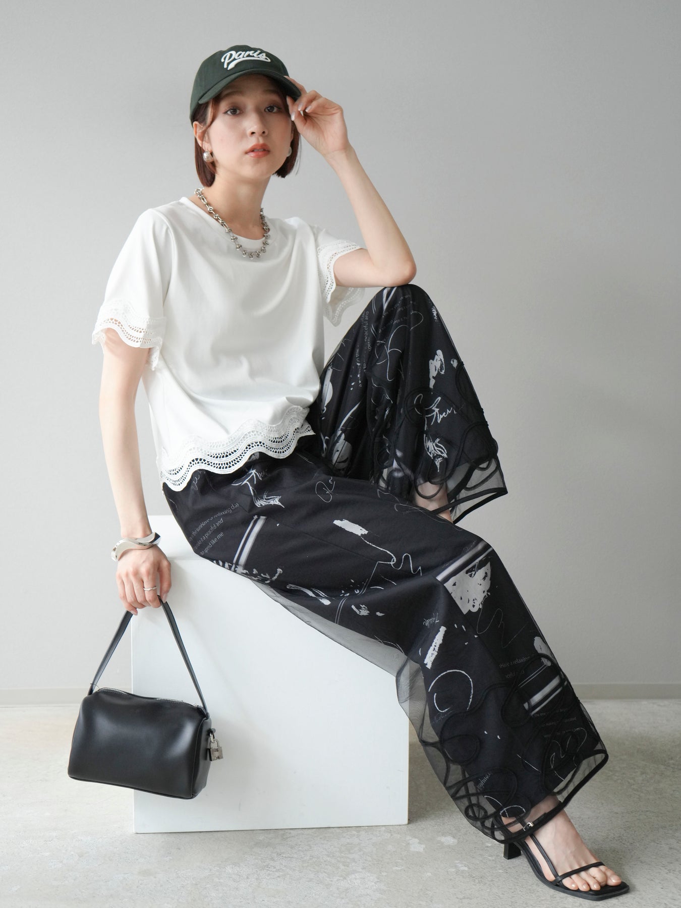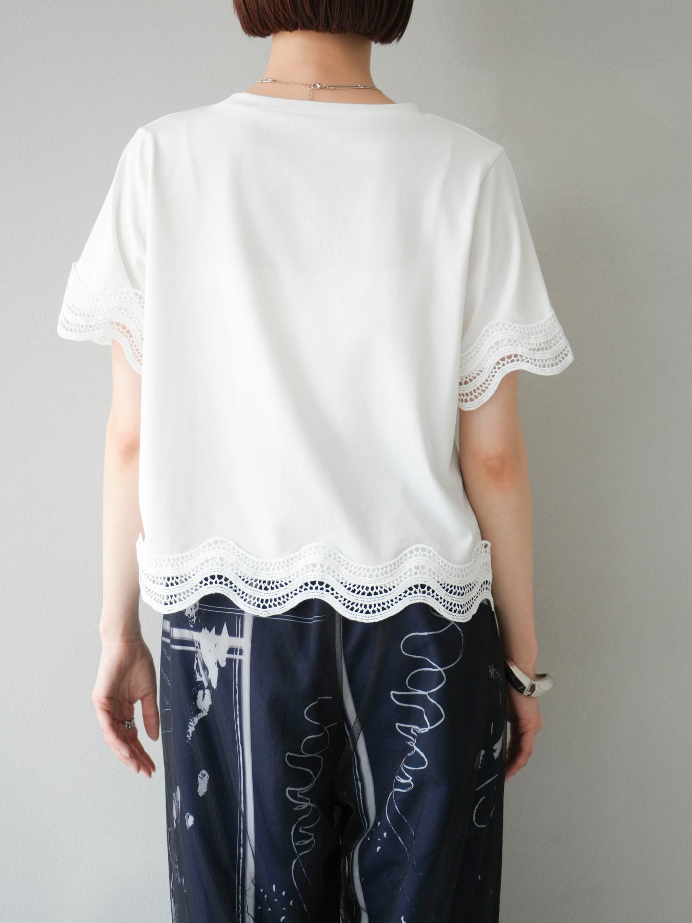 袖にあしらわれた繊細なレースが目を惹く、大人フェミニンなカットソー。 シンプルなボディに華やかなレースディテールをプラスし、1枚で着映えするデザインに仕上げました。 柔らかく肌触りの良いカット素材で、デイリーに着やすい快適な着心地。 レース部分は透けすぎず上品な印象を与え、甘すぎず洗練された雰囲気を演出します。 ジャンスカやサロペットのインナーとしてはもちろん、ボトムインしてもアウトで着ても様になる万能トップス。 カジュアルからきれいめまで、幅広いスタイリングにマッチします。