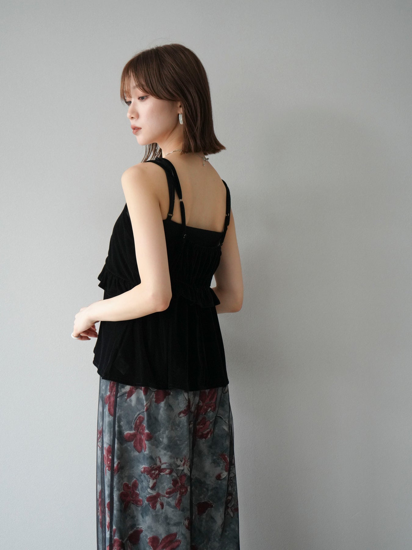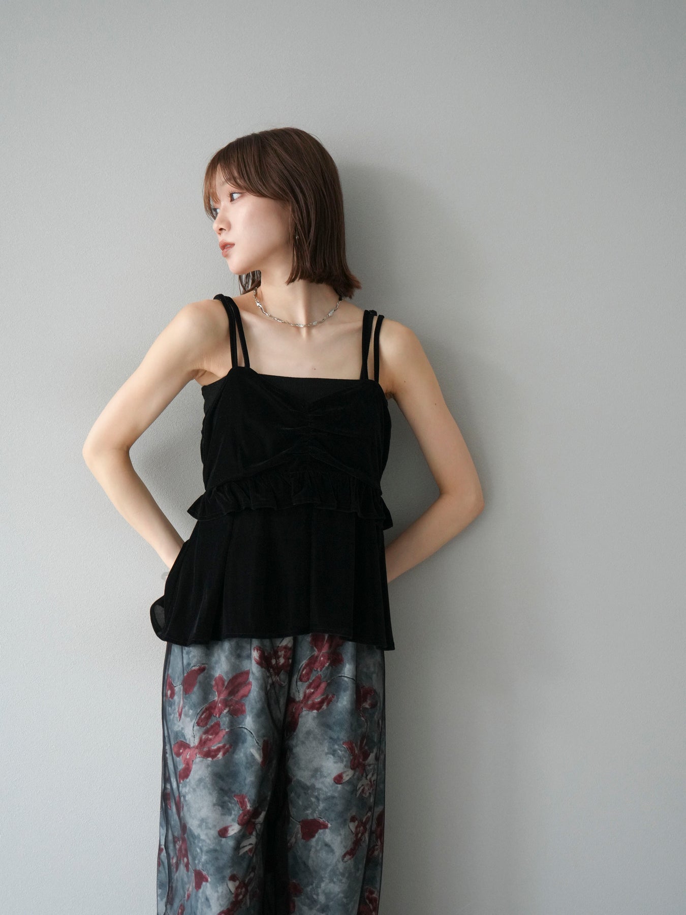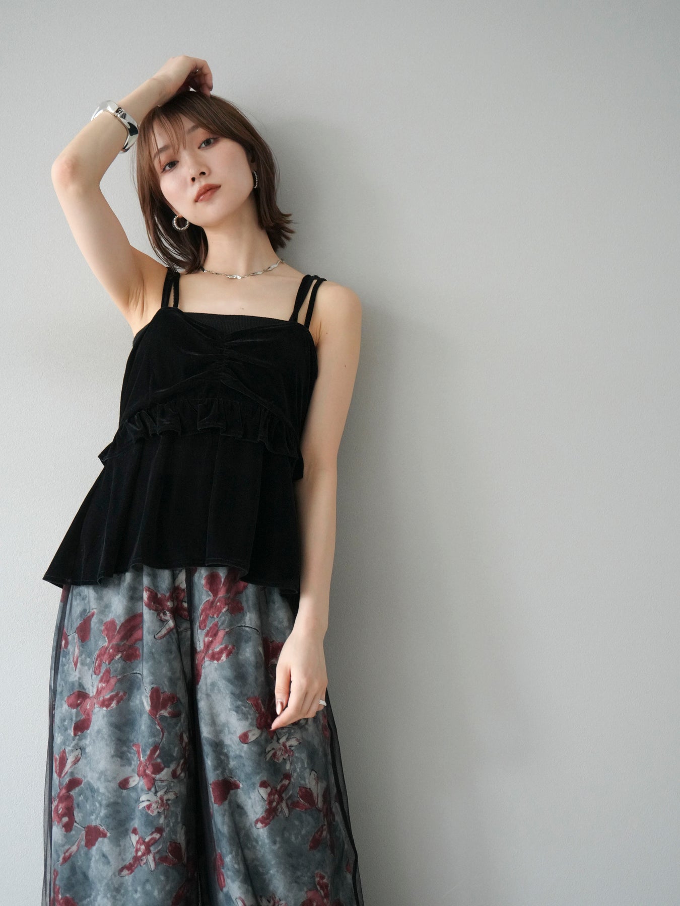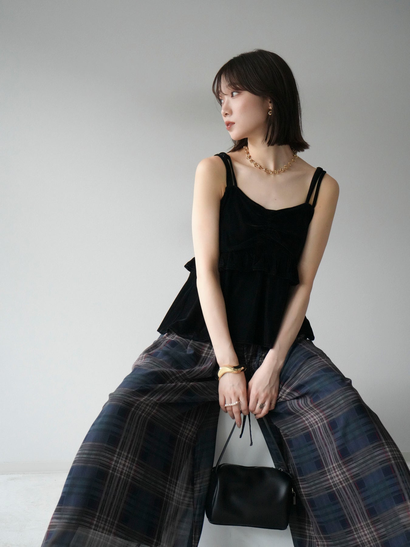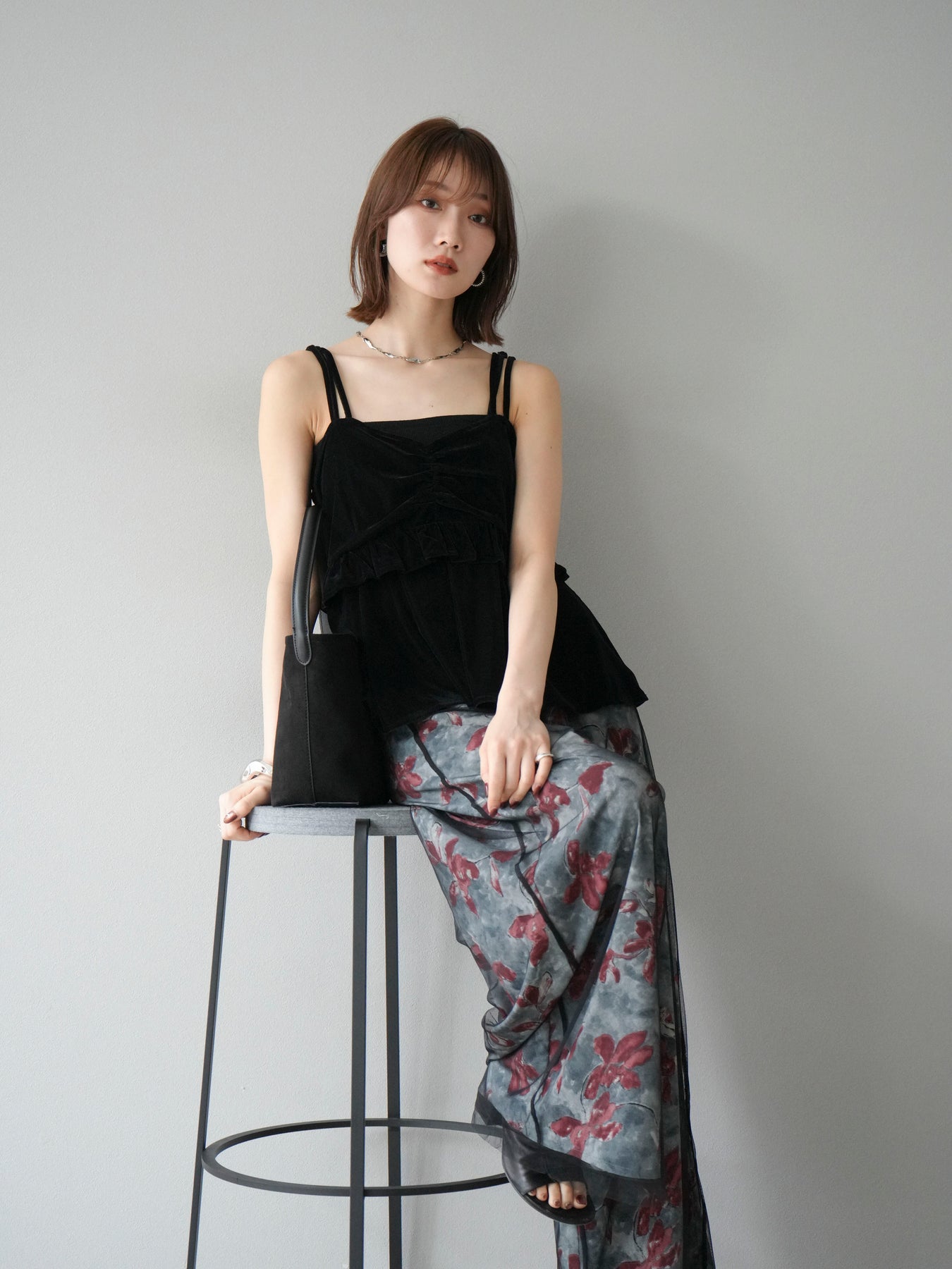 光沢感のあるベロア素材と繊細なフリルディテールが、大人フェミニンなムードを演出するビスチェ。 ギャザー入りの胸元デザインと2段フリルの切替が、立体感と華やかさをプラス。ダブルストラップ仕様がヘルシーな肌見せを叶え、抜け感のある印象に仕上げます。 インナーにTシャツをレイヤードしたり、ワンピースの上から重ねたりと、幅広いスタイリングに対応。シーズンレスに活躍するトレンド感あふれるアイテムです。
