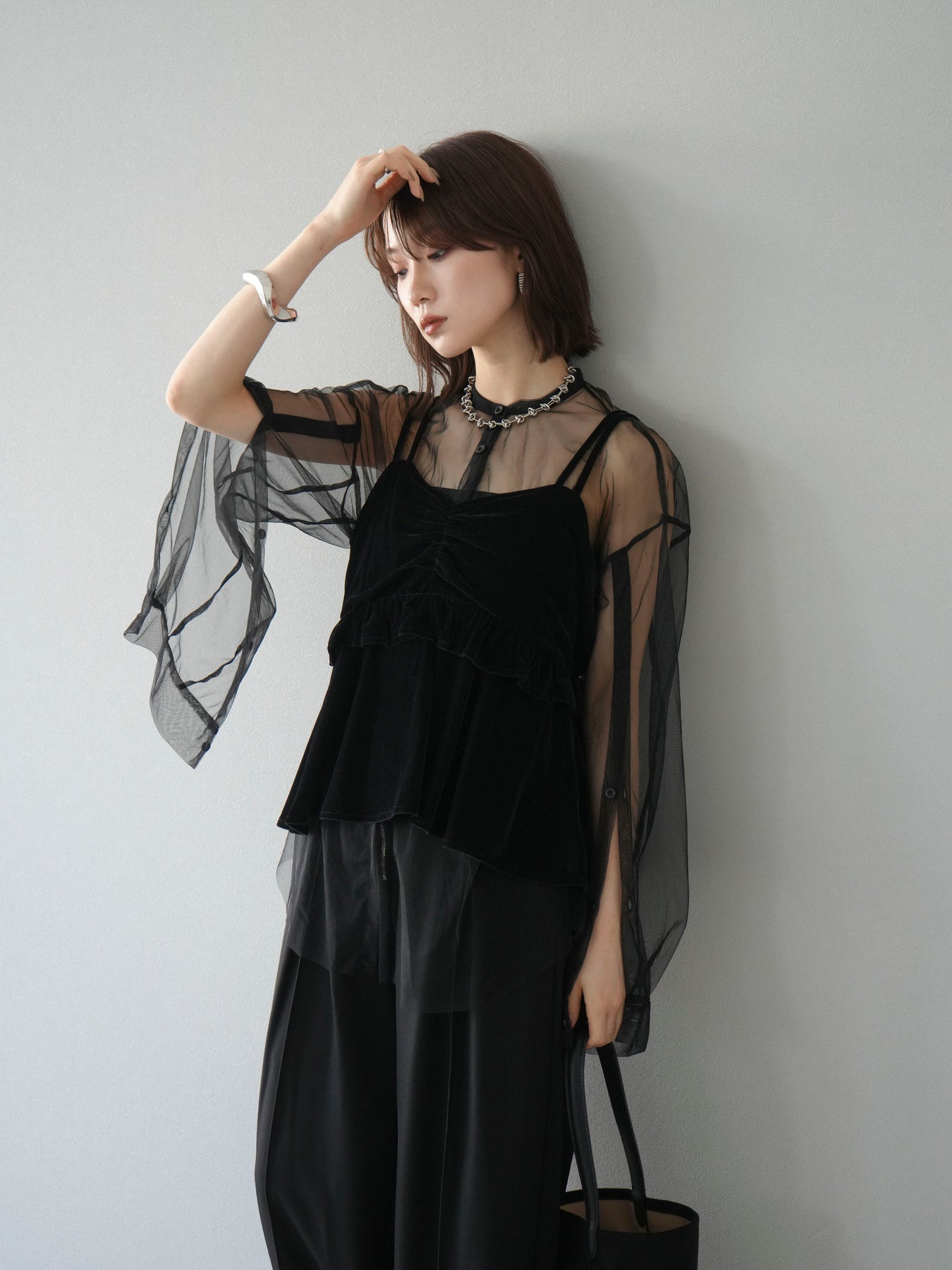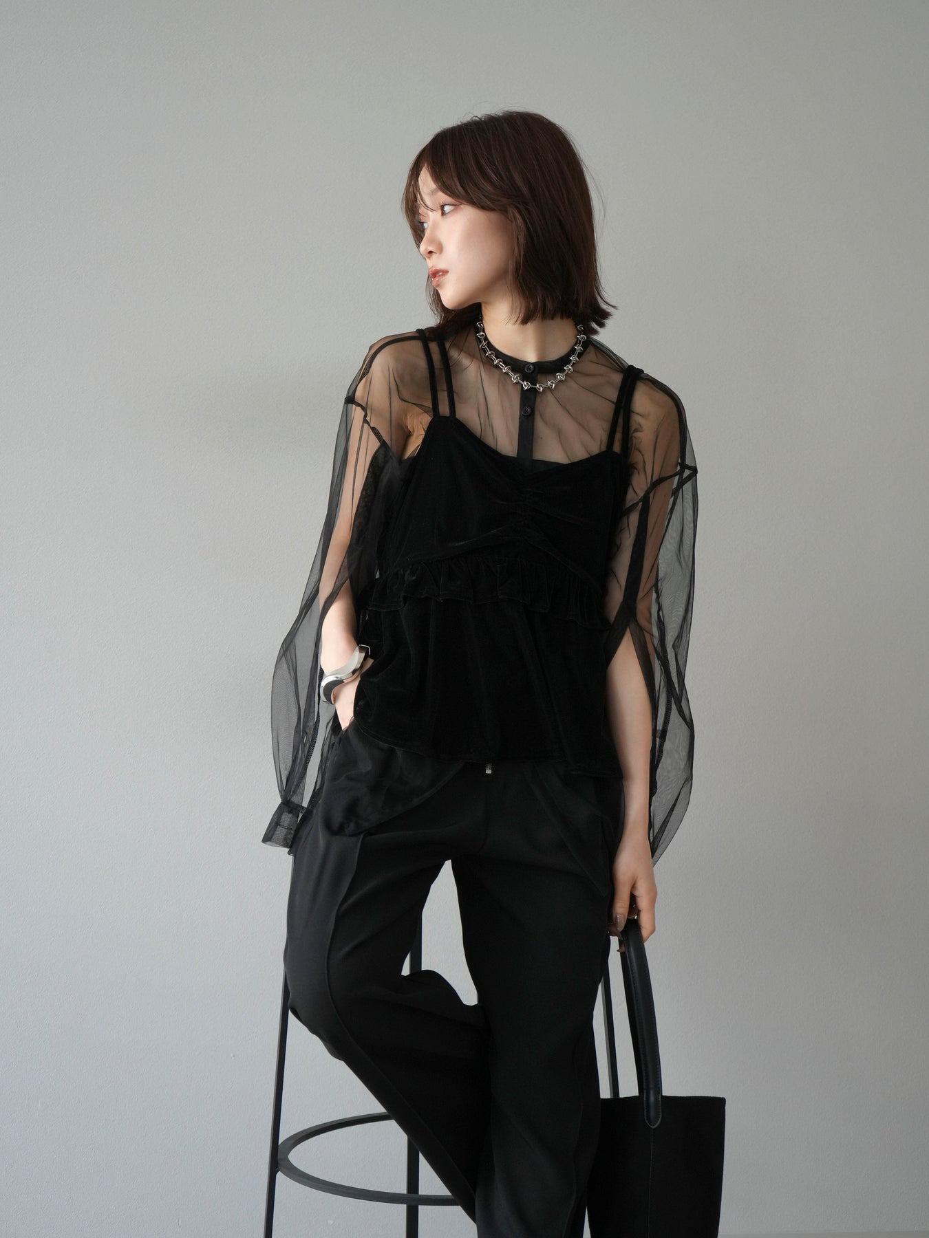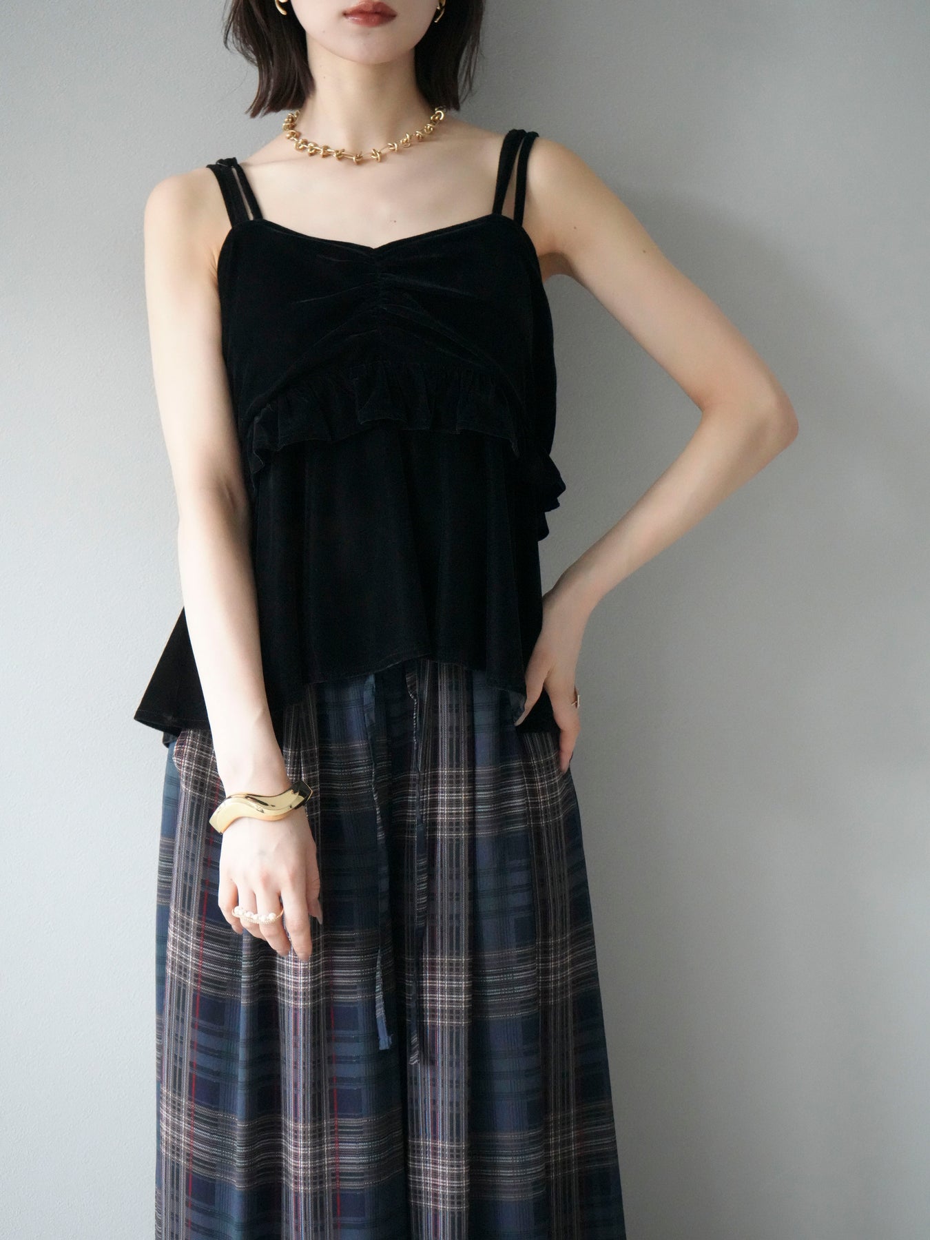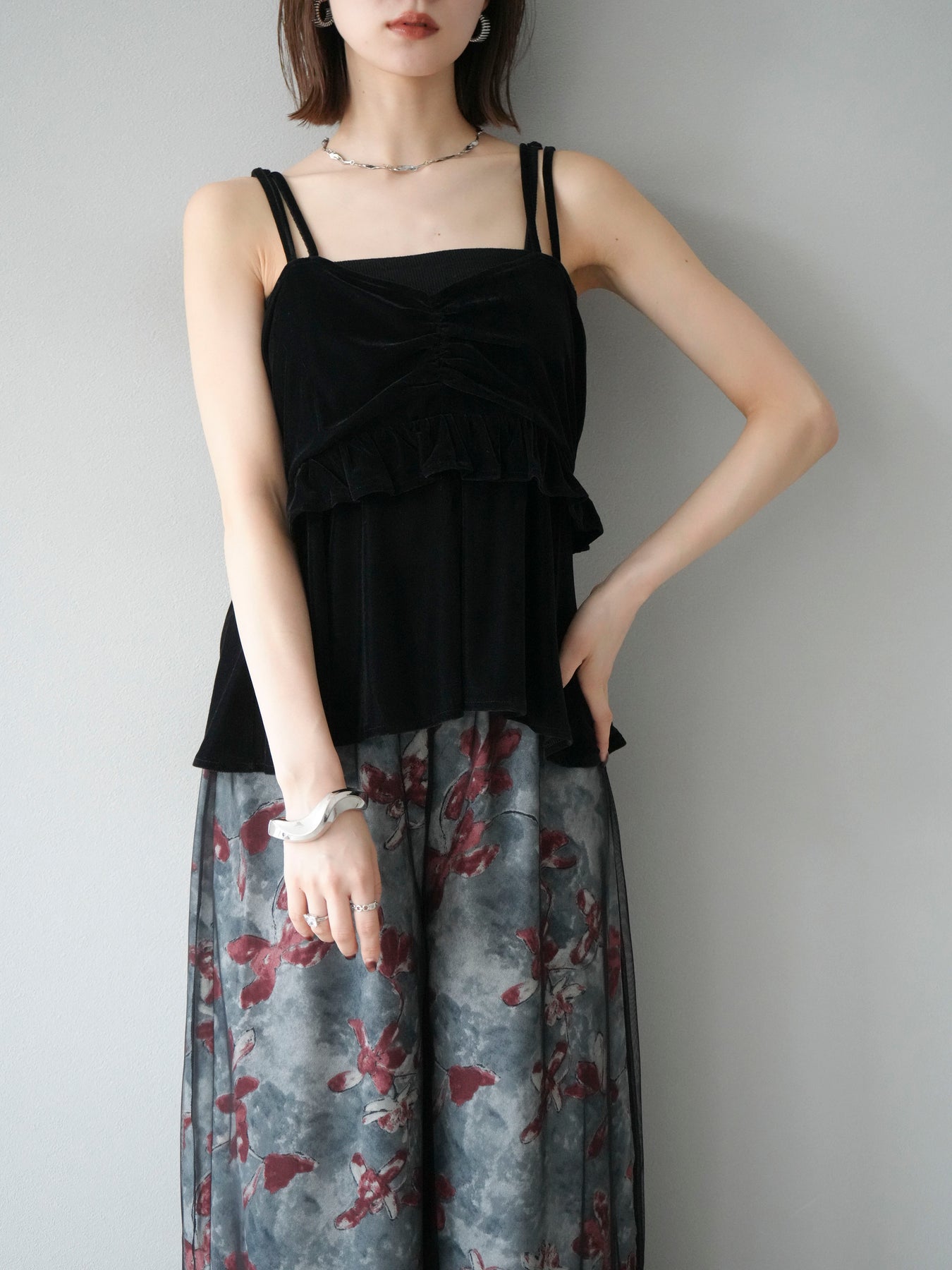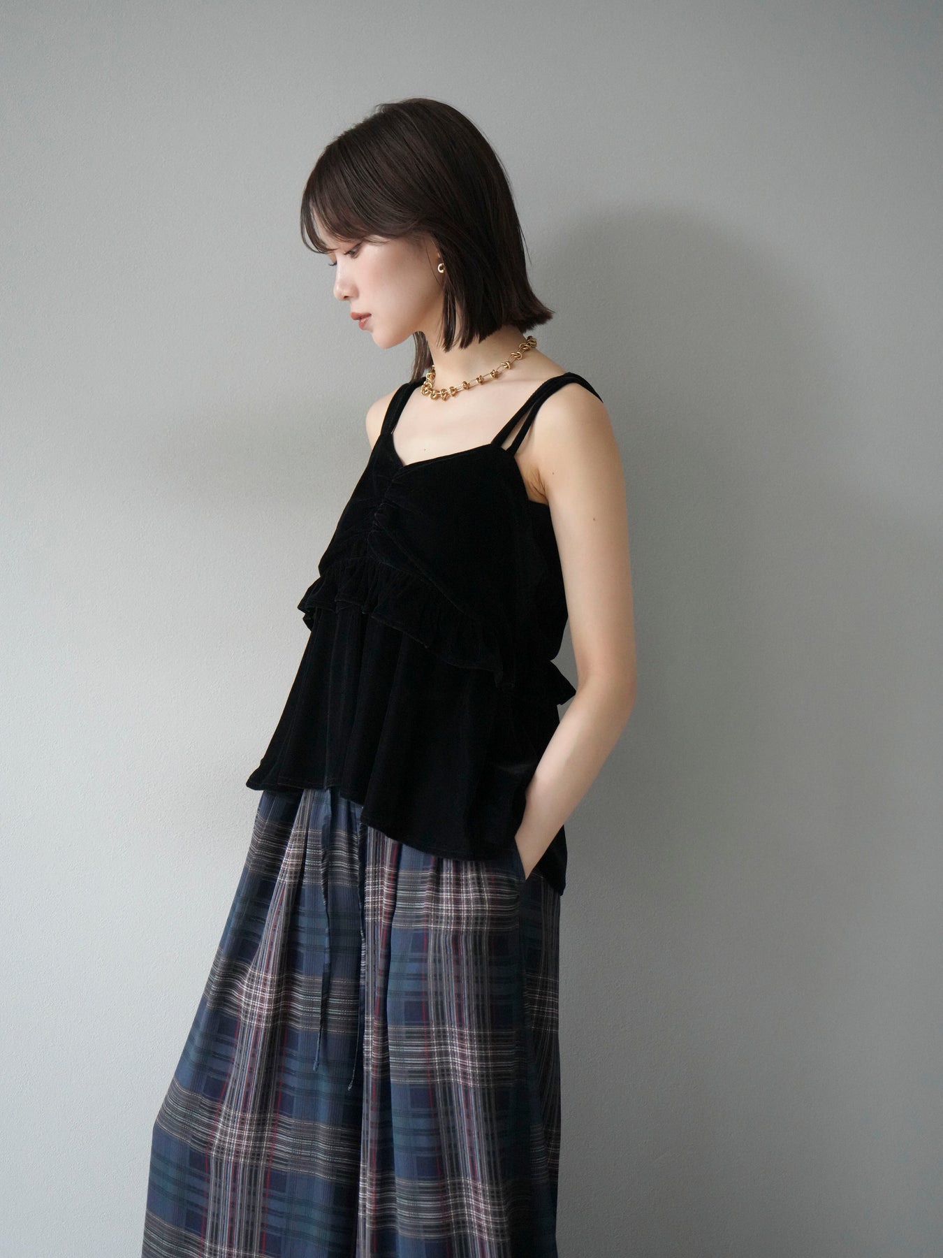 光沢感のあるベロア素材と繊細なフリルディテールが、大人フェミニンなムードを演出するビスチェ。 ギャザー入りの胸元デザインと2段フリルの切替が、立体感と華やかさをプラス。ダブルストラップ仕様がヘルシーな肌見せを叶え、抜け感のある印象に仕上げます。 インナーにTシャツをレイヤードしたり、ワンピースの上から重ねたりと、幅広いスタイリングに対応。シーズンレスに活躍するトレンド感あふれるアイテムです。
