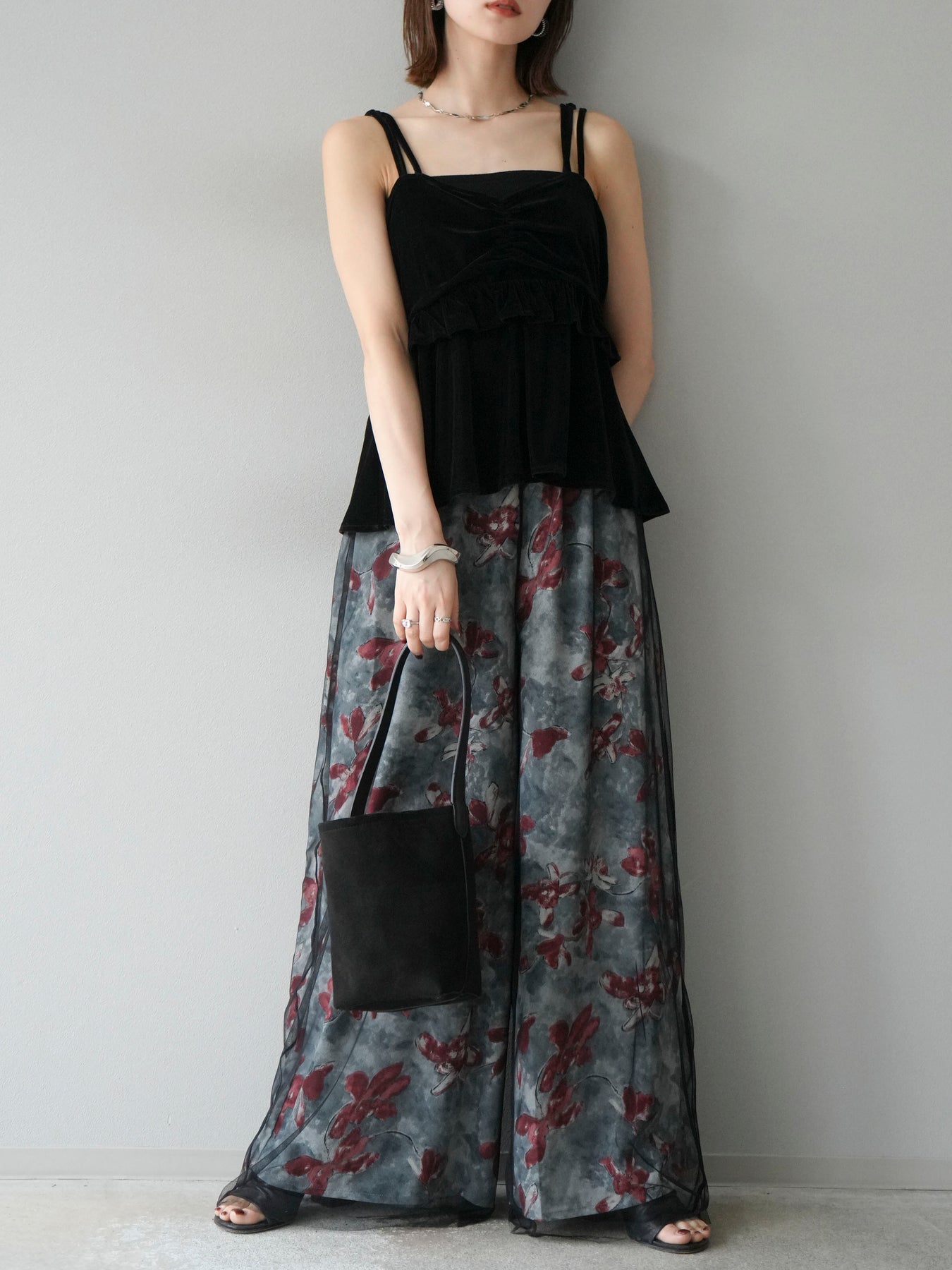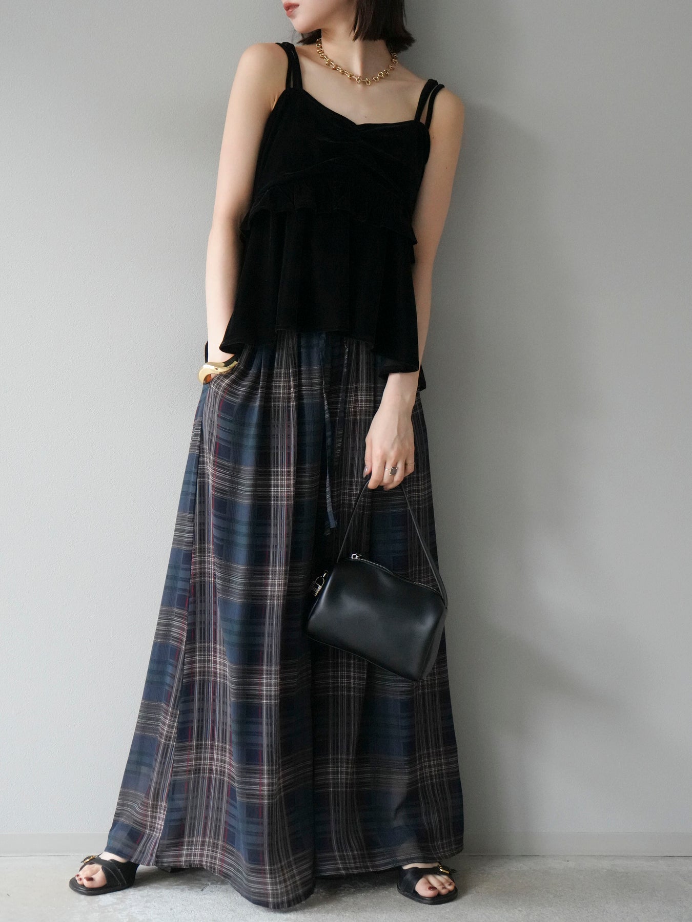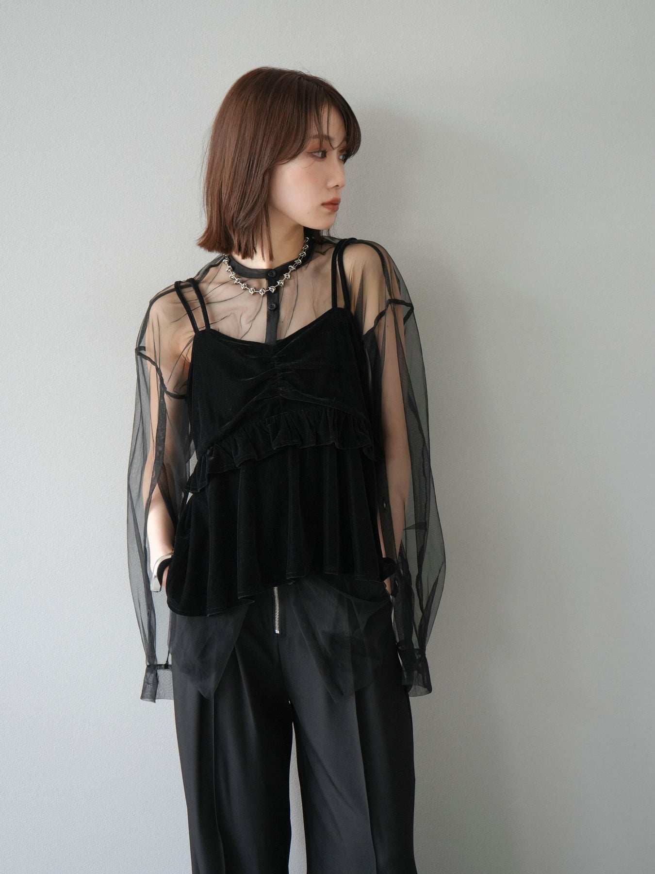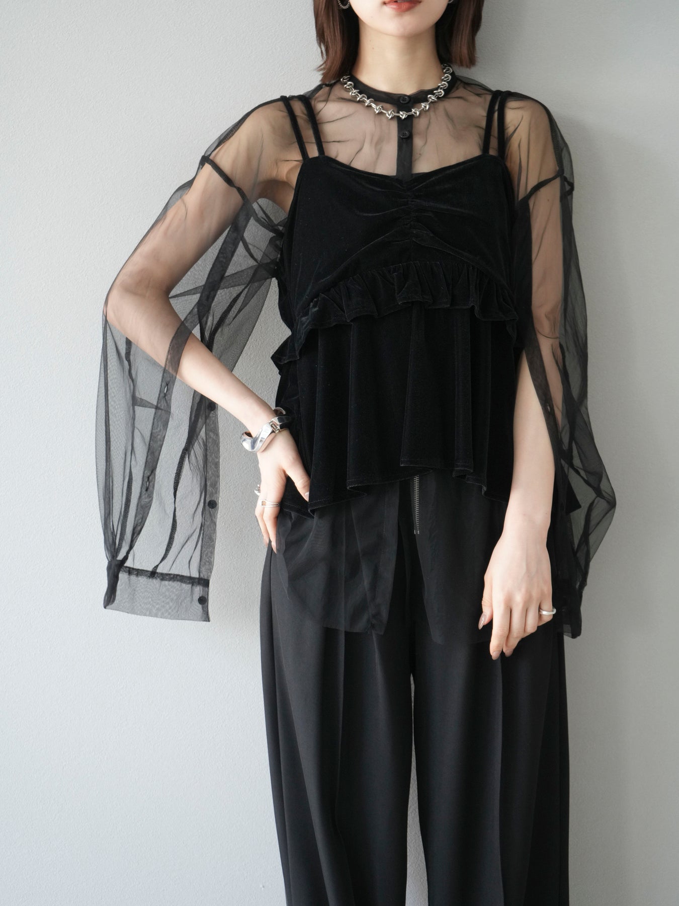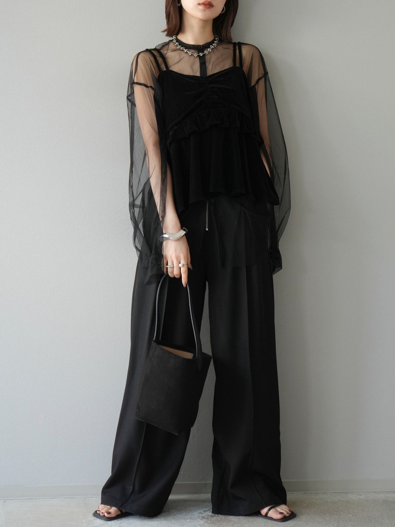 光沢感のあるベロア素材と繊細なフリルディテールが、大人フェミニンなムードを演出するビスチェ。 ギャザー入りの胸元デザインと2段フリルの切替が、立体感と華やかさをプラス。ダブルストラップ仕様がヘルシーな肌見せを叶え、抜け感のある印象に仕上げます。 インナーにTシャツをレイヤードしたり、ワンピースの上から重ねたりと、幅広いスタイリングに対応。シーズンレスに活躍するトレンド感あふれるアイテムです。
