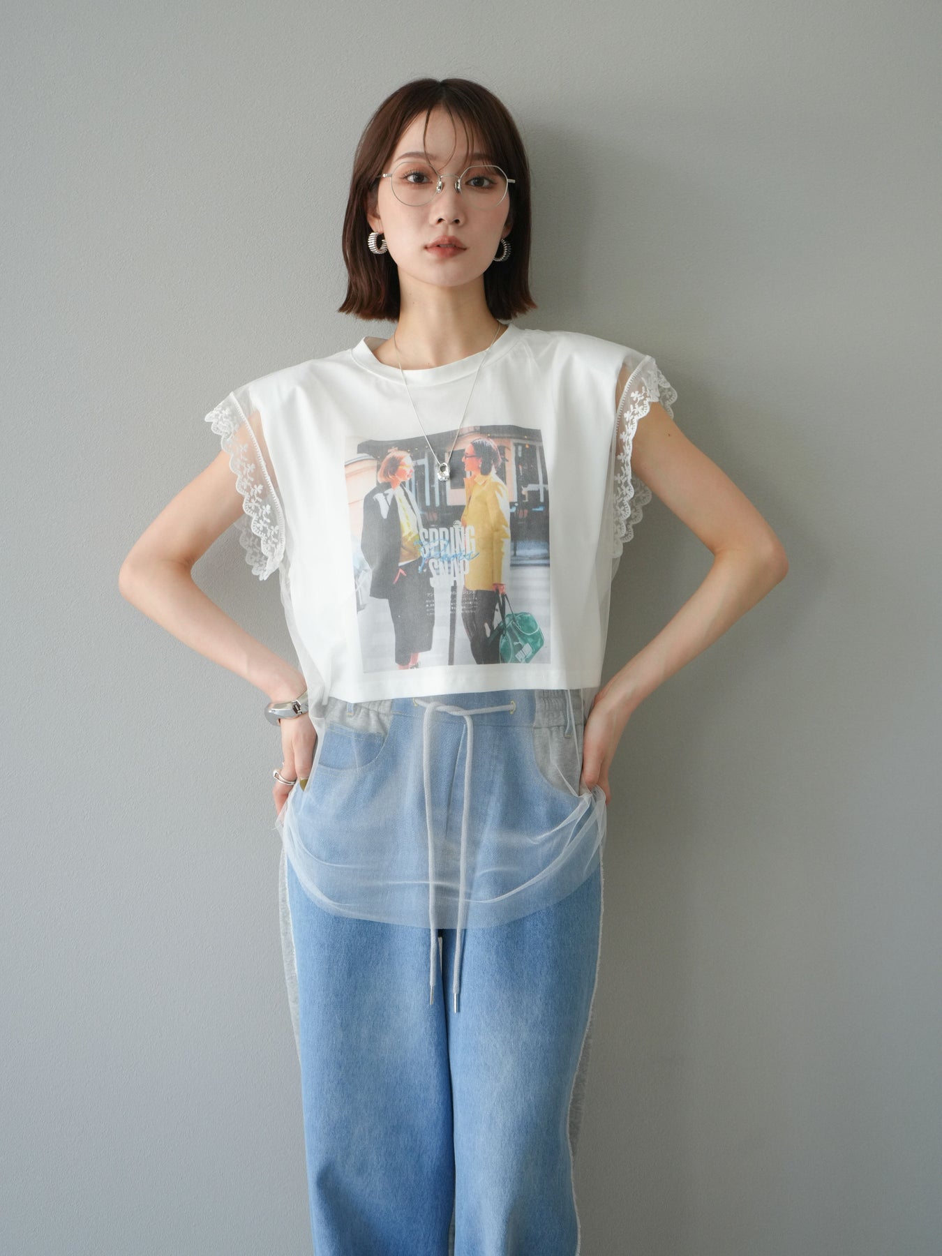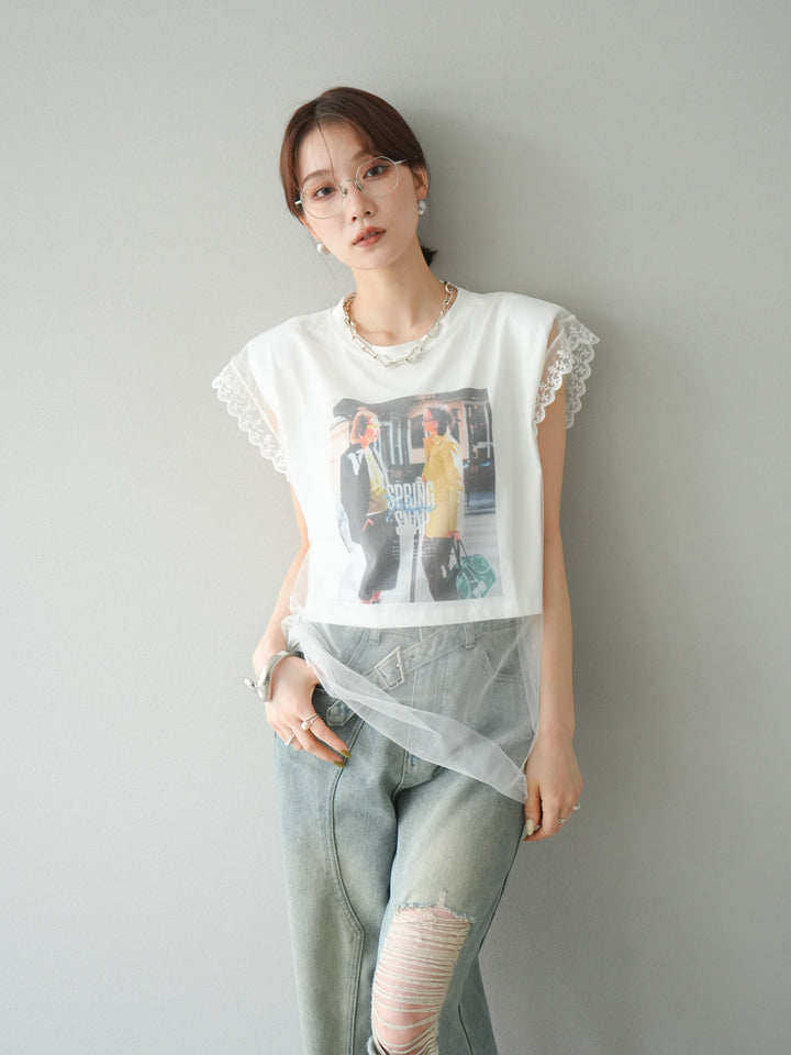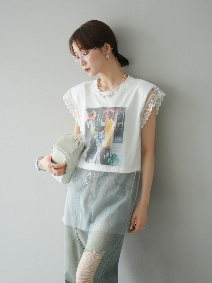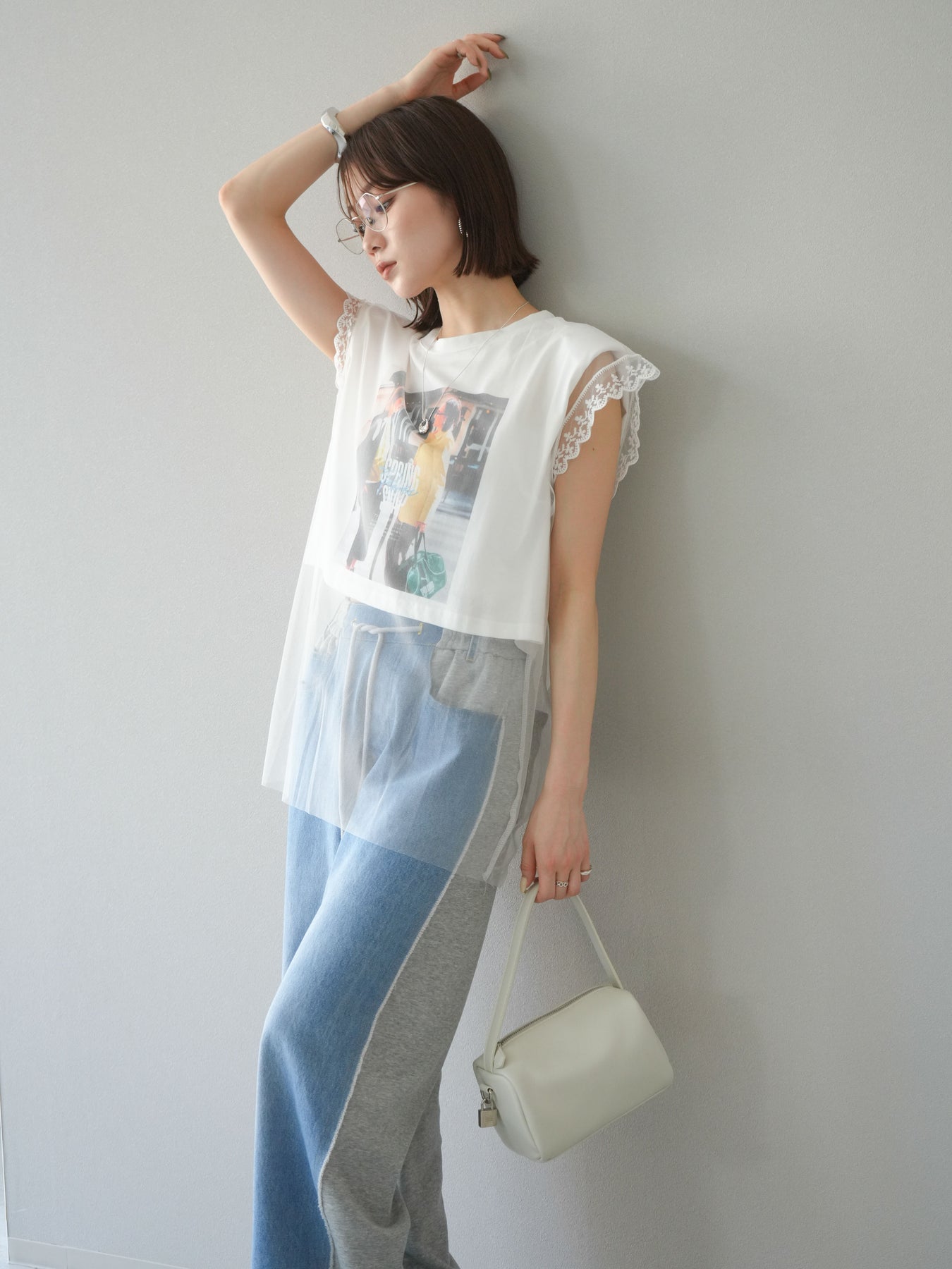 ロゴフォトプリント×チュールの異素材レイヤードが目を引く、大人可愛いデザインTシャツ。袖のスカラップレースや、チュールで切り替えられた裾がスタイリングに柔らかな女性らしさをプラスします。カジュアルながらもこなれ感のある1枚で、デニムはもちろん、スカートやワイドパンツとも好相性。シンプルな中に遊び心を効かせたスタイリングが楽しめます。 ※ボトムス、キャミソール(インナー)以外の商品は一律でインナーは付属していません。