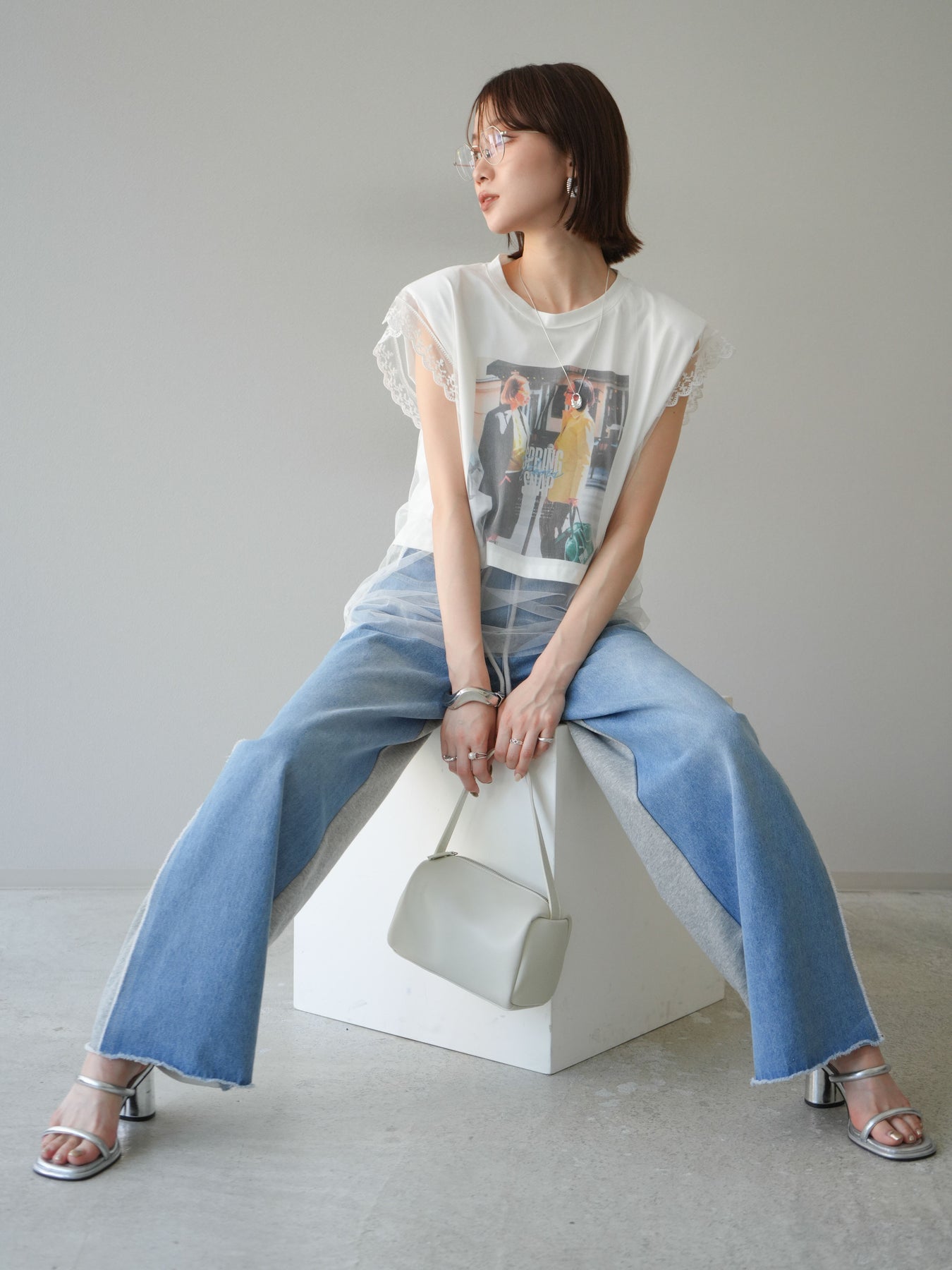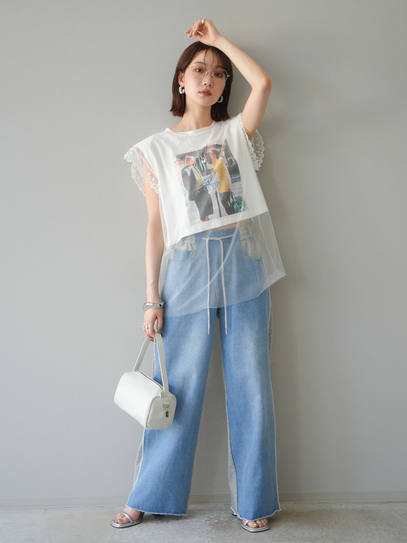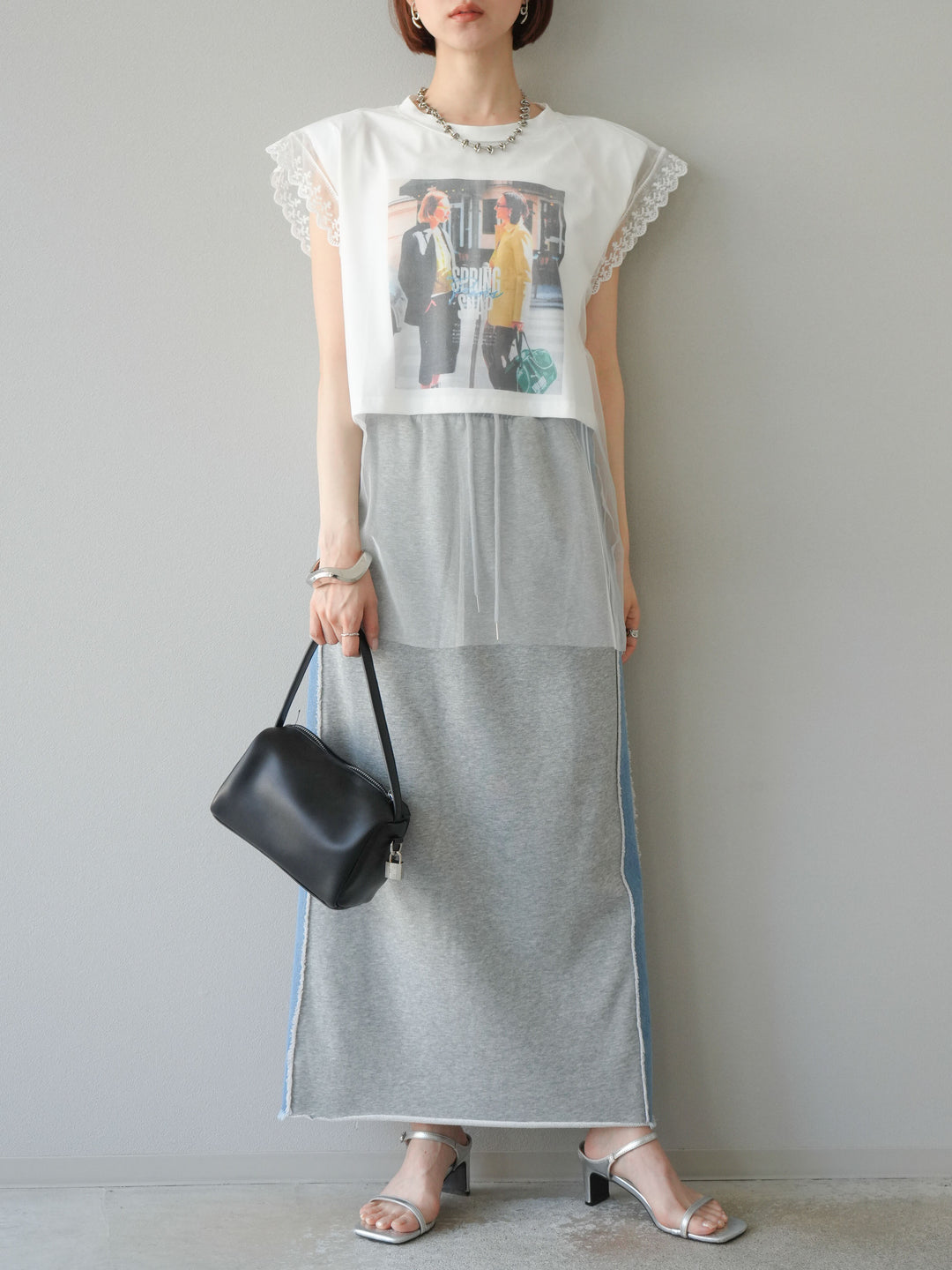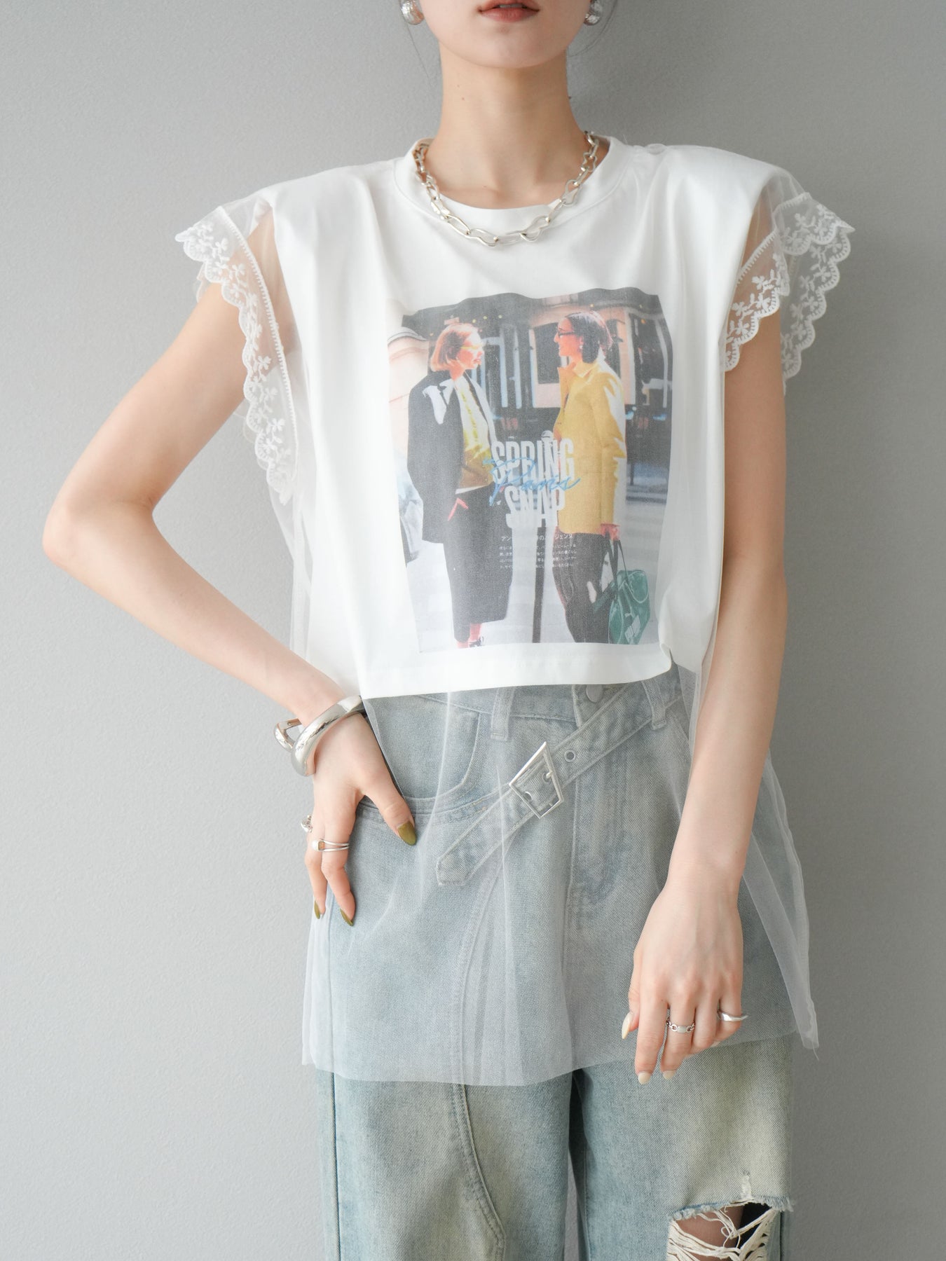 ロゴフォトプリント×チュールの異素材レイヤードが目を引く、大人可愛いデザインTシャツ。袖のスカラップレースや、チュールで切り替えられた裾がスタイリングに柔らかな女性らしさをプラスします。カジュアルながらもこなれ感のある1枚で、デニムはもちろん、スカートやワイドパンツとも好相性。シンプルな中に遊び心を効かせたスタイリングが楽しめます。 ※ボトムス、キャミソール(インナー)以外の商品は一律でインナーは付属していません。