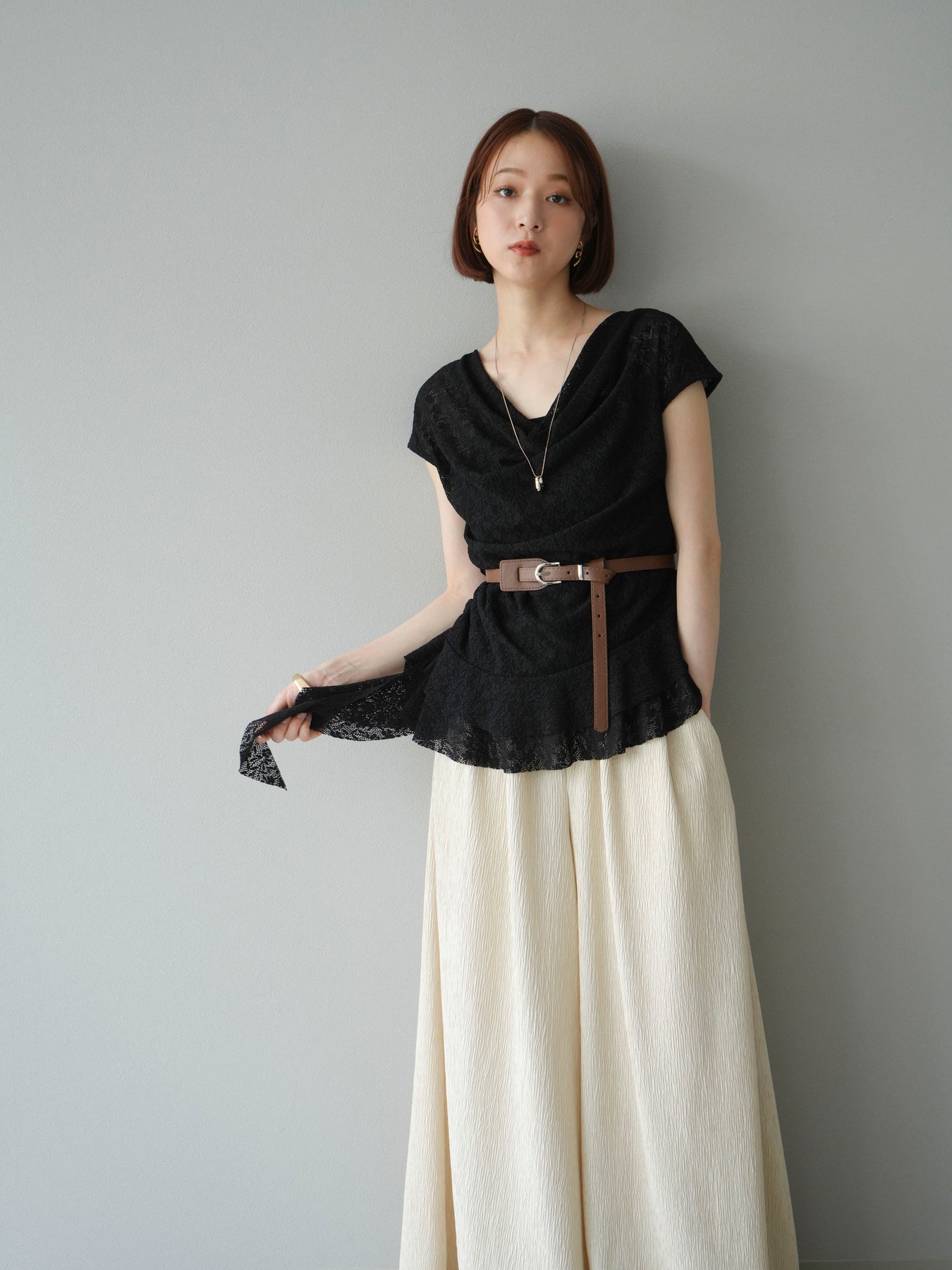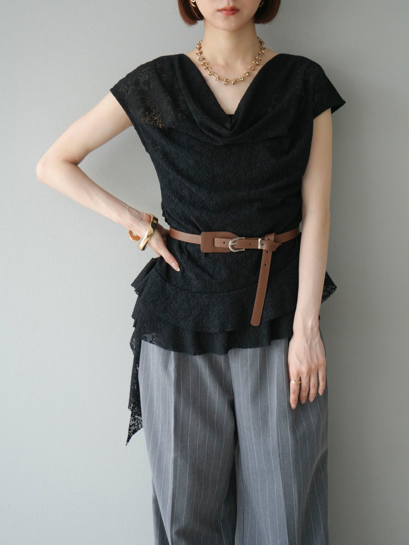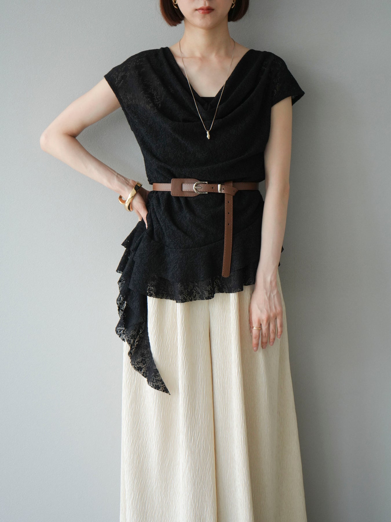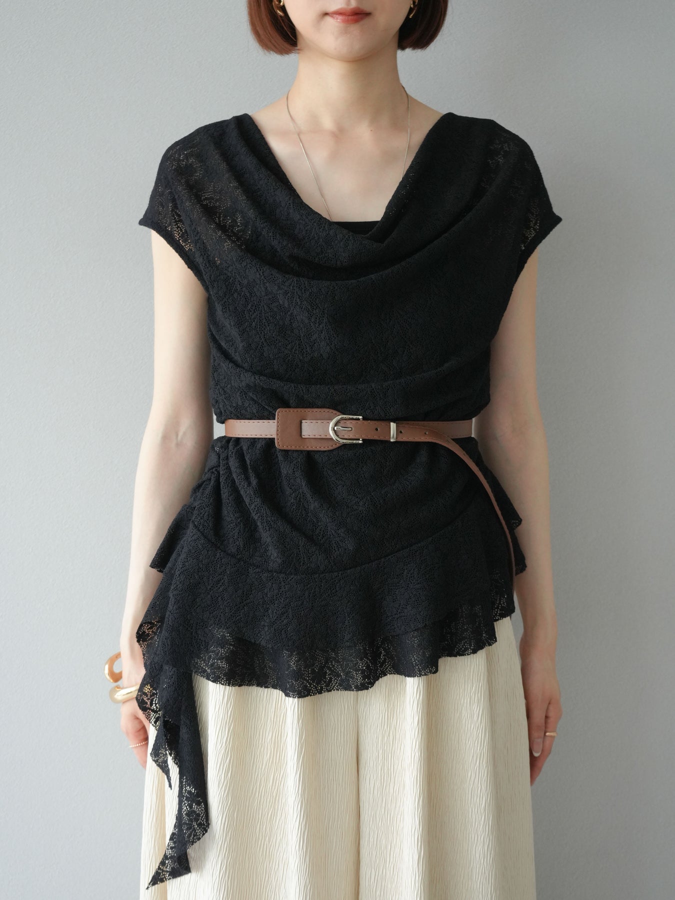 繊細なレース素材と美しいドレープデザインが魅力のレーストップス。 ウエストには取り外し可能な細ベルト付きで、シルエットの調整も自在に。 フェミニンな印象のアシンメトリーな裾フリルが、動くたびに表情をプラスしてくれます。 デニムやスラックスと合わせて、甘辛ミックスなスタイリングにもおすすめの一着。 ※ボトムス、キャミソール(インナー)以外の商品は一律でインナーは付属していません。