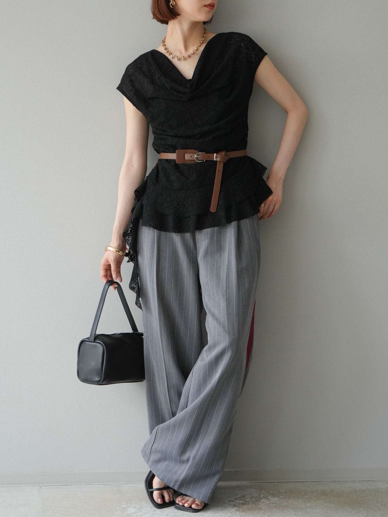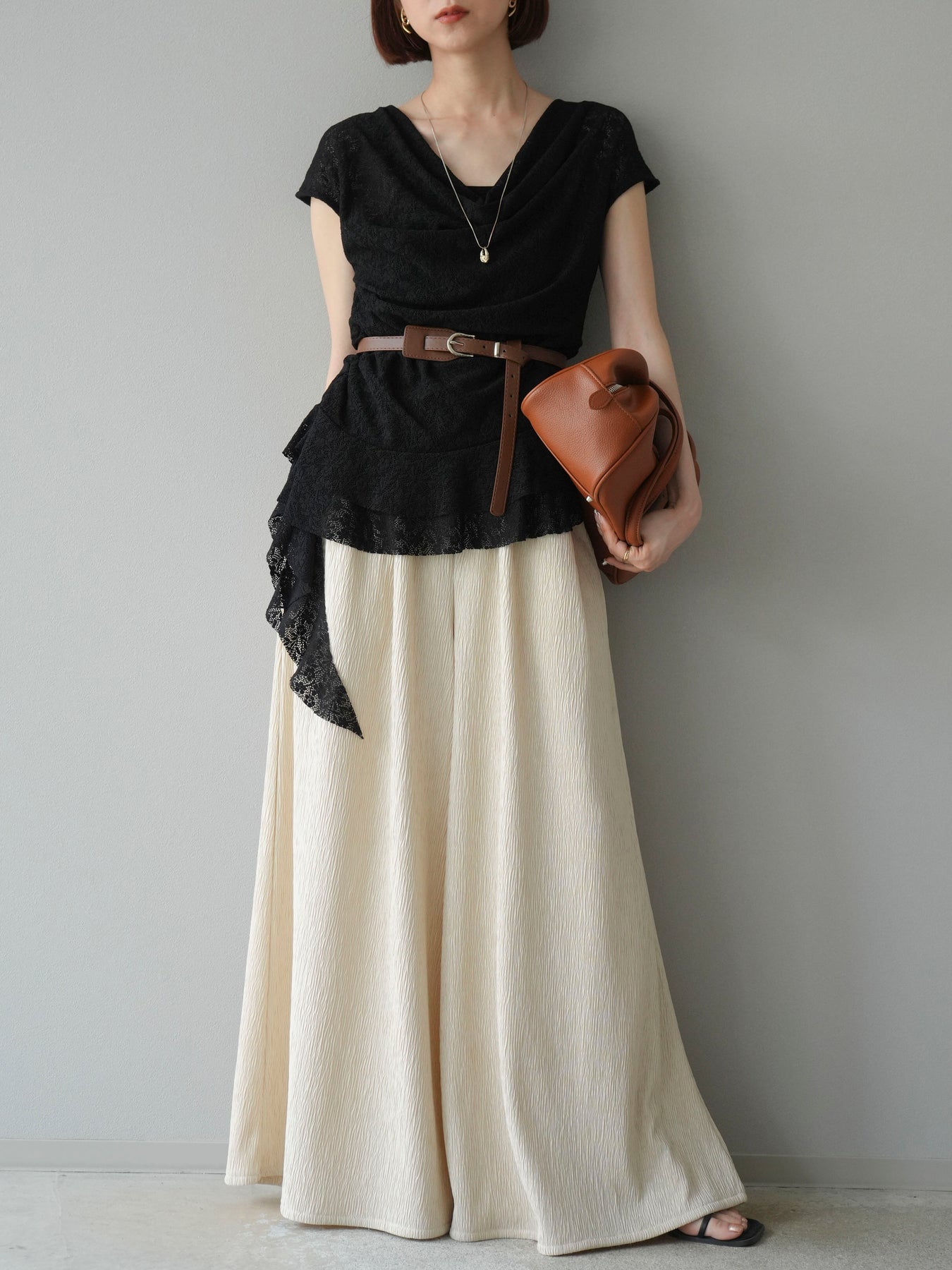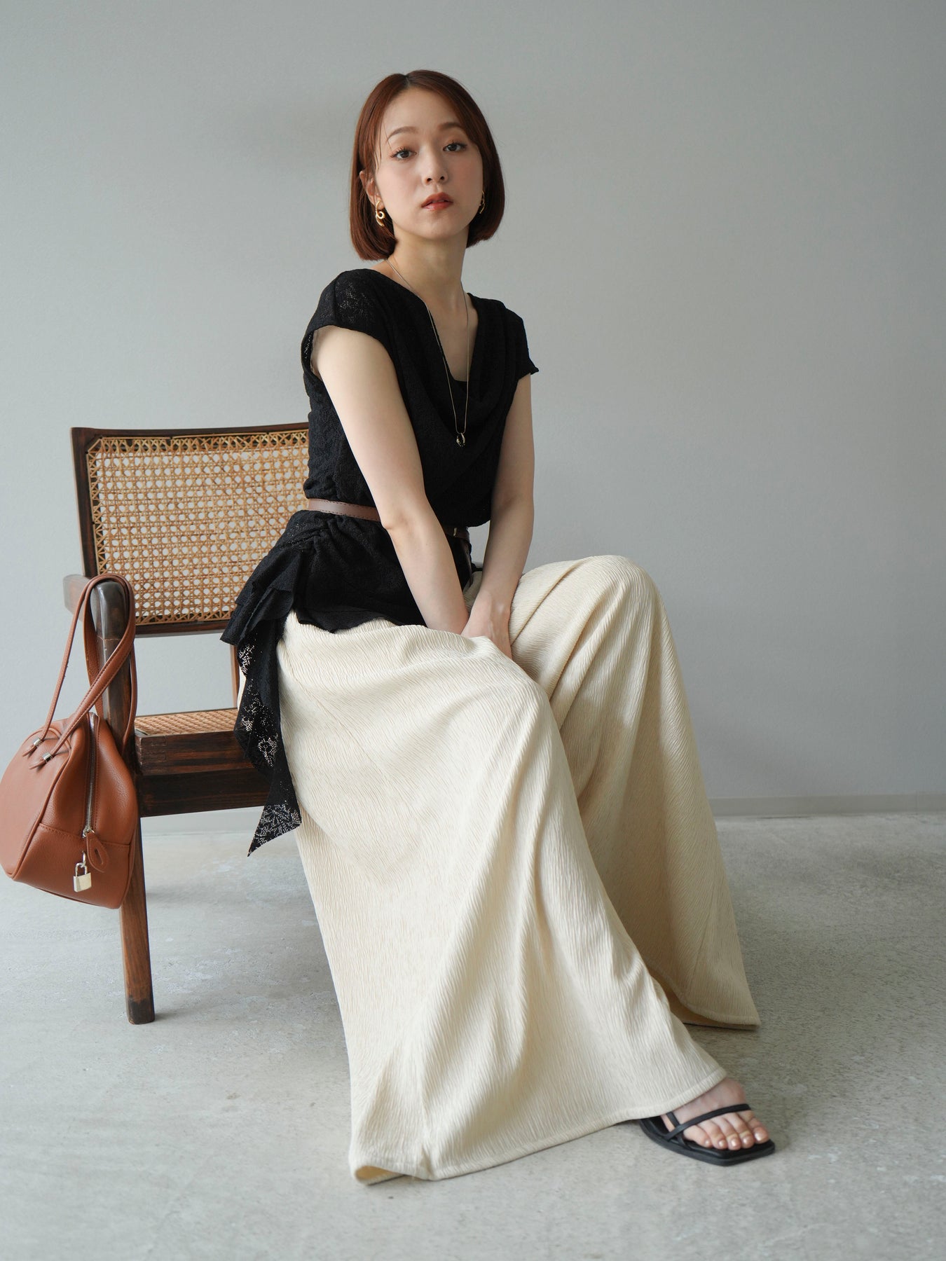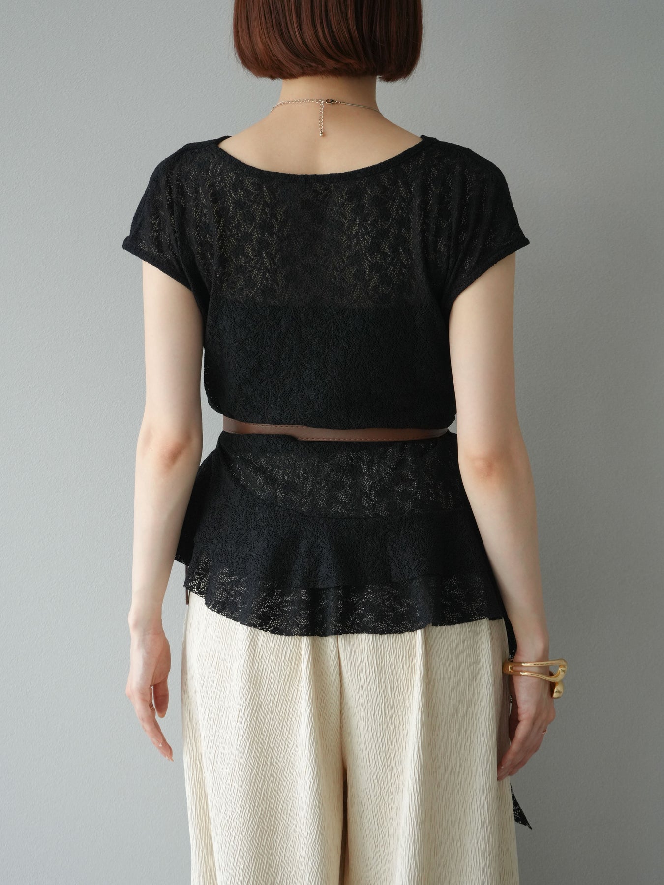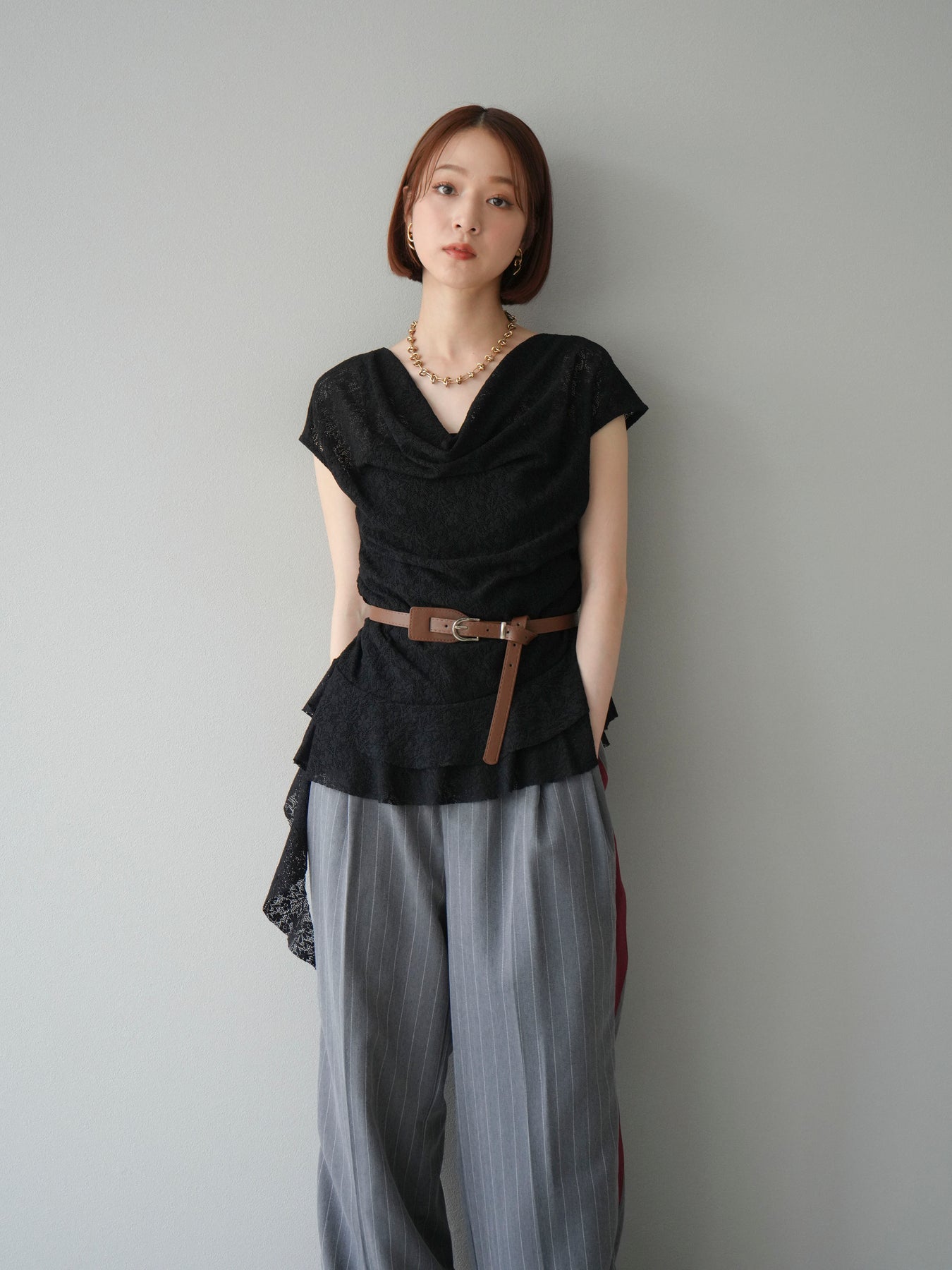 繊細なレース素材と美しいドレープデザインが魅力のレーストップス。 ウエストには取り外し可能な細ベルト付きで、シルエットの調整も自在に。 フェミニンな印象のアシンメトリーな裾フリルが、動くたびに表情をプラスしてくれます。 デニムやスラックスと合わせて、甘辛ミックスなスタイリングにもおすすめの一着。 ※ボトムス、キャミソール(インナー)以外の商品は一律でインナーは付属していません。