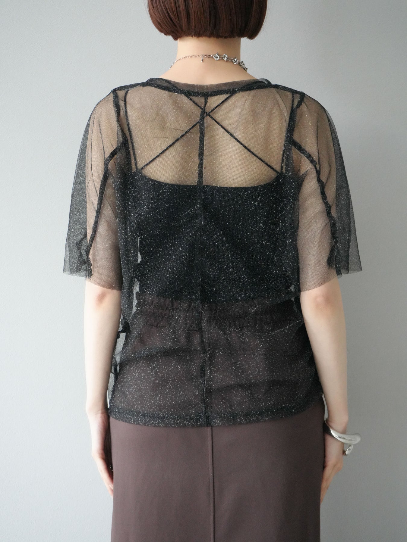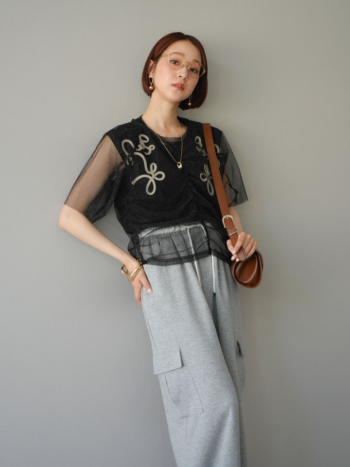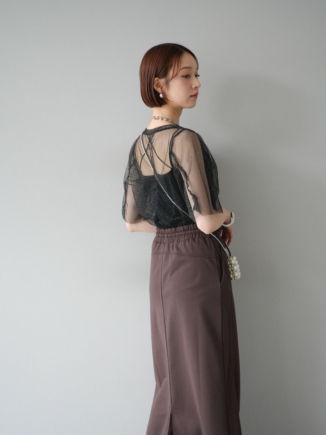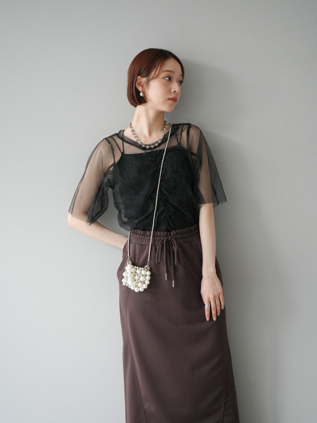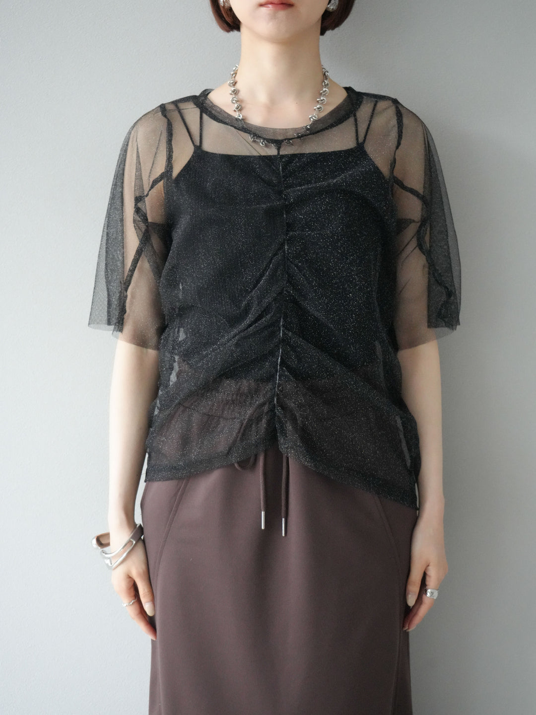繊細なラメチュールが華やかさを添えるシャーリングプルオーバー。程よい透け感と、フロント&ウエストのドロストギャザーが立体的なシルエットを演出します。レイヤードスタイルに最適で、キャミソールやワンピースの上からさらりと羽織るだけで、旬な着こなしが完成します。デイリーから特別なシーンまで幅広く活躍する一枚です。 ※ボトムス、キャミソール(インナー)以外の商品は一律でインナーは付属していません。