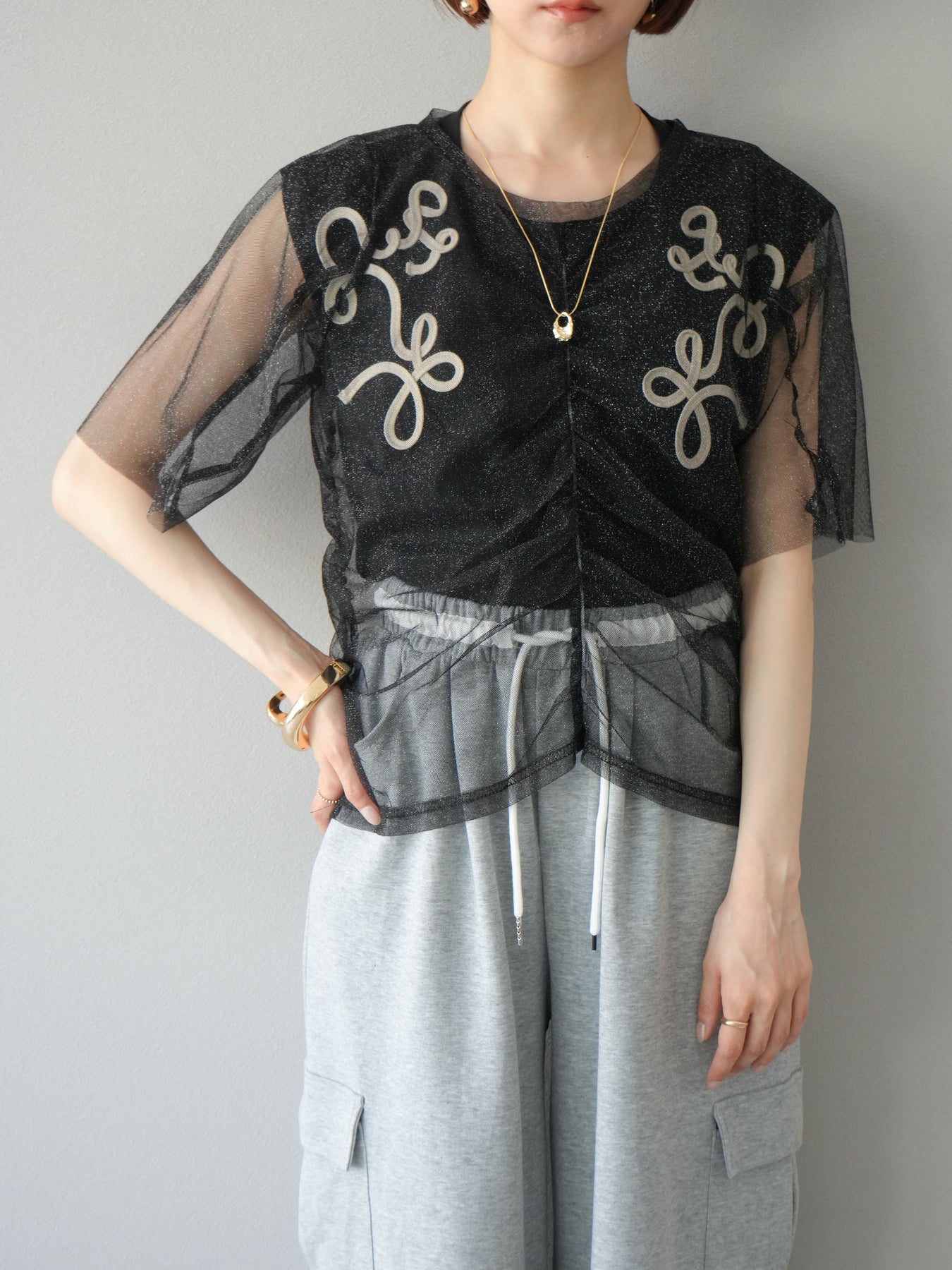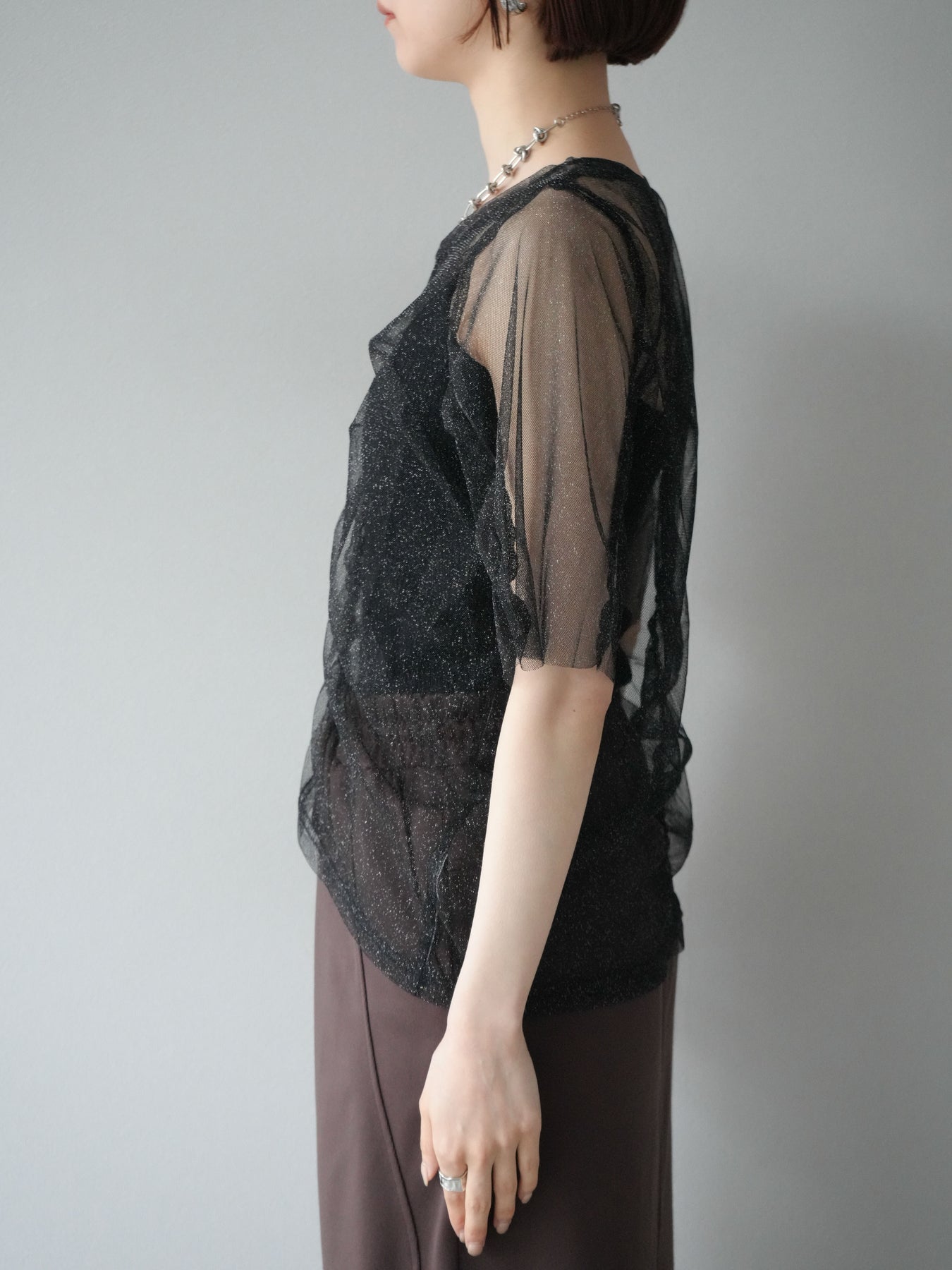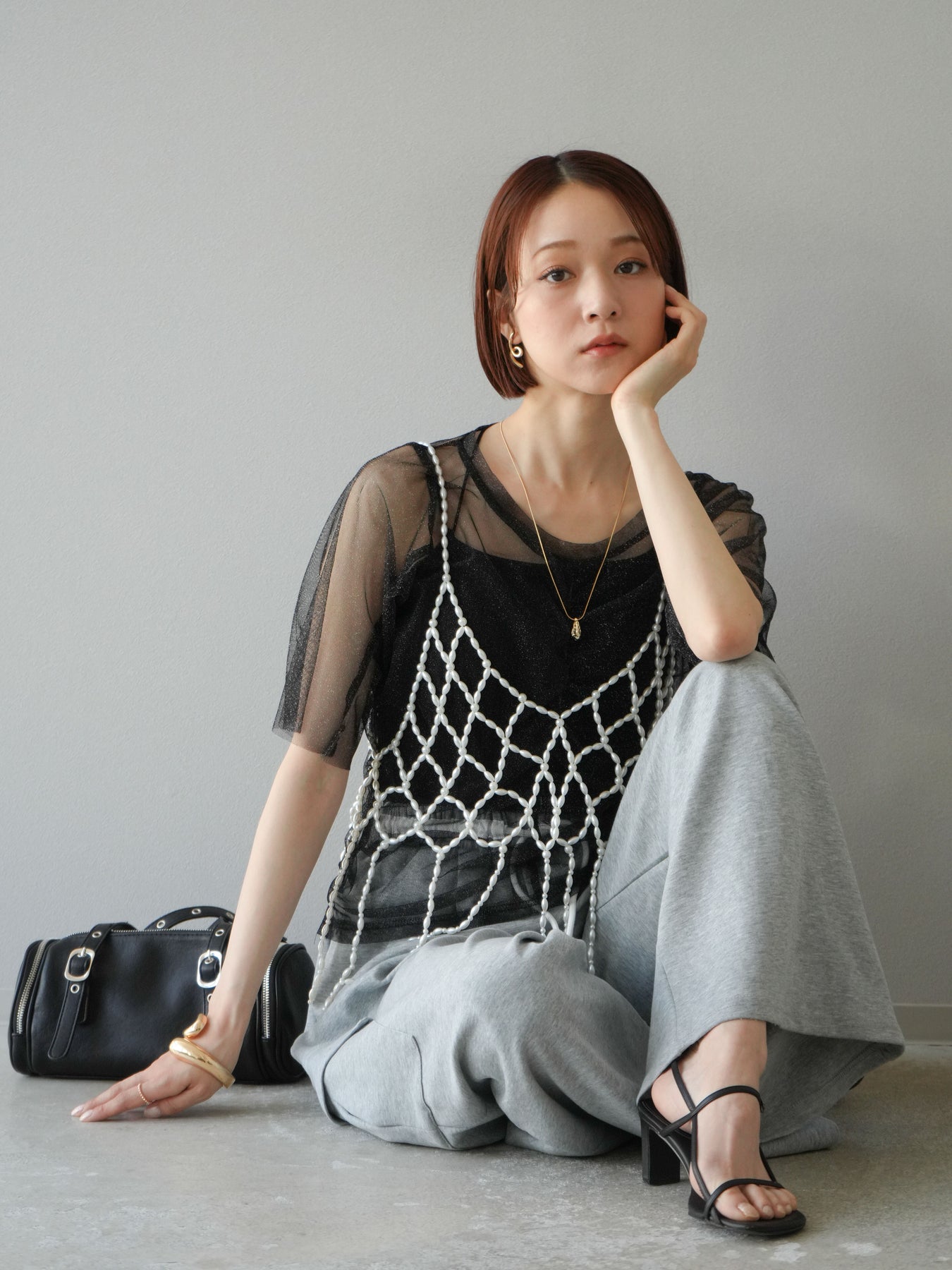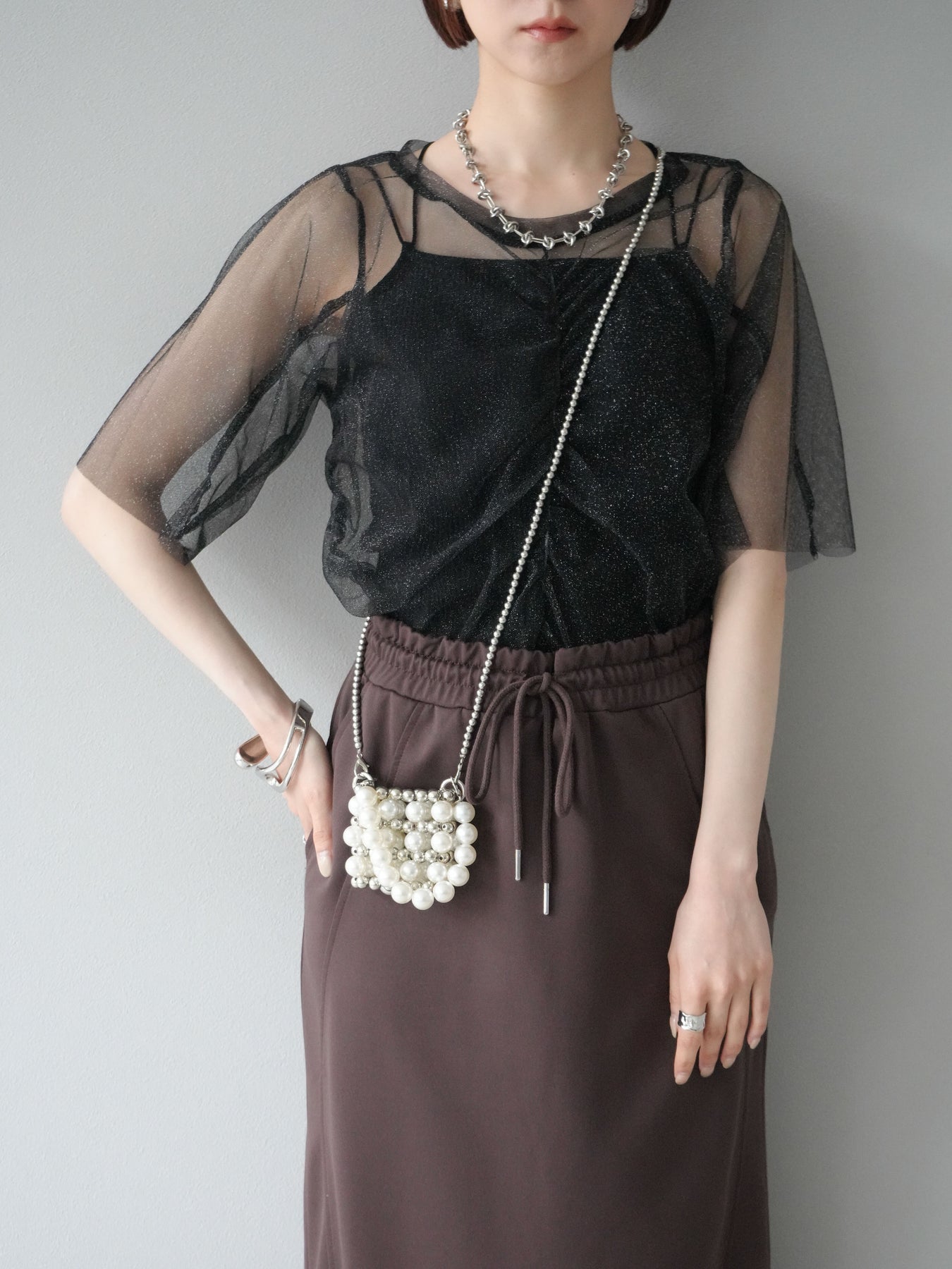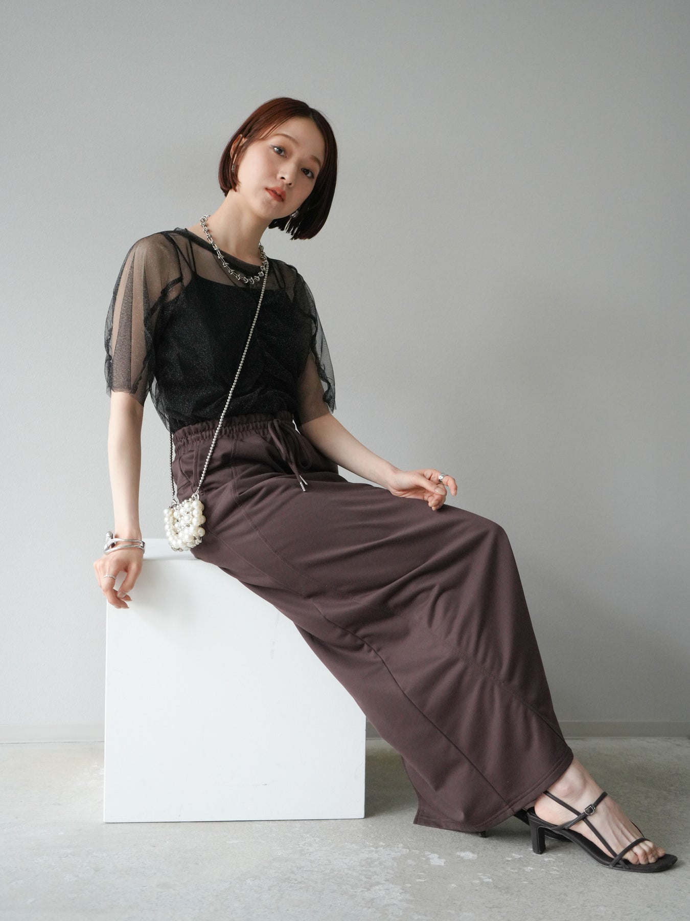 繊細なラメチュールが華やかさを添えるシャーリングプルオーバー。程よい透け感と、フロント&ウエストのドロストギャザーが立体的なシルエットを演出します。レイヤードスタイルに最適で、キャミソールやワンピースの上からさらりと羽織るだけで、旬な着こなしが完成します。デイリーから特別なシーンまで幅広く活躍する一枚です。 ※ボトムス、キャミソール(インナー)以外の商品は一律でインナーは付属していません。