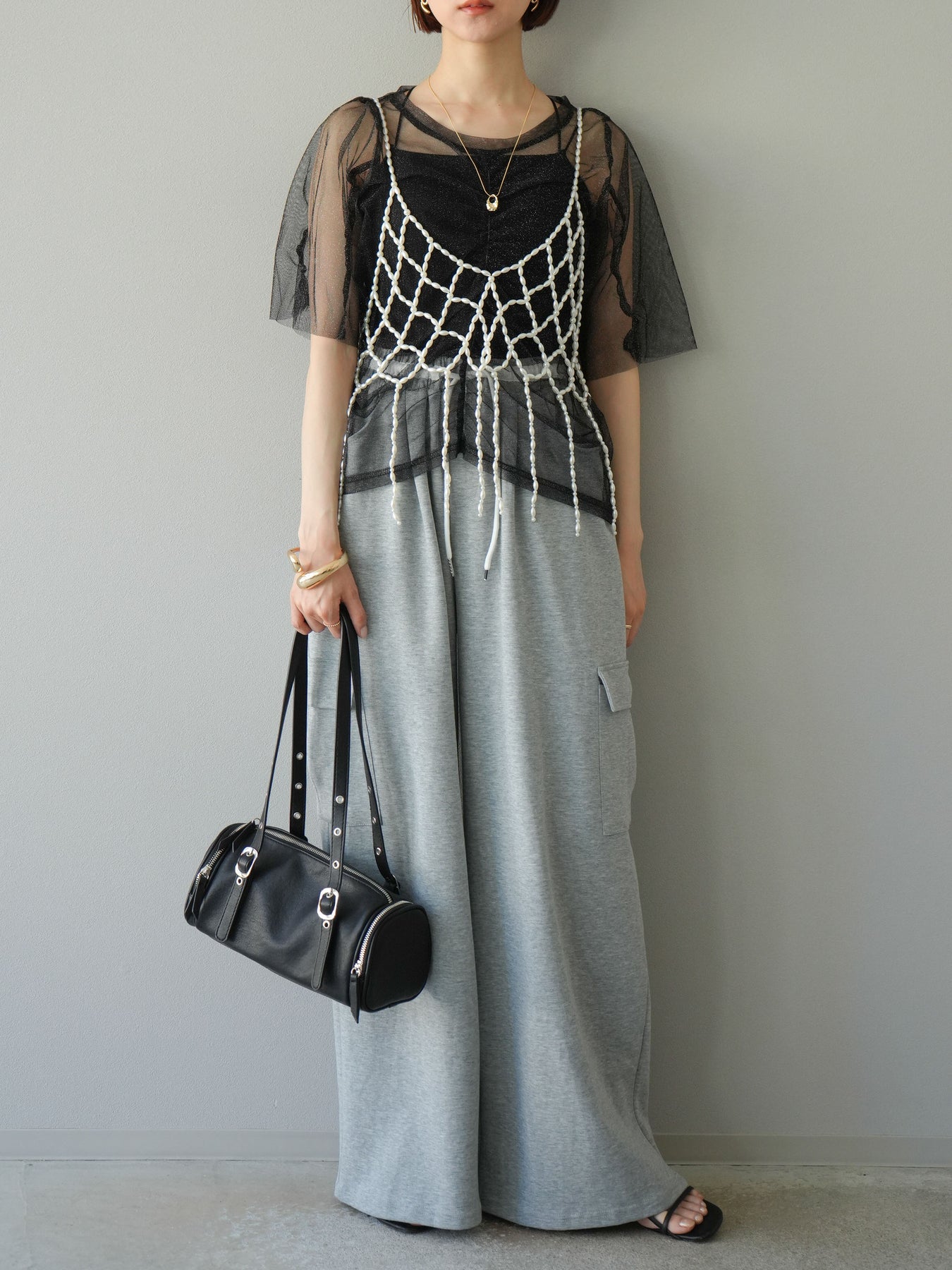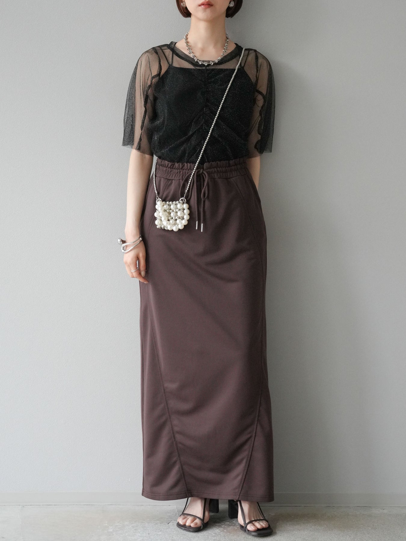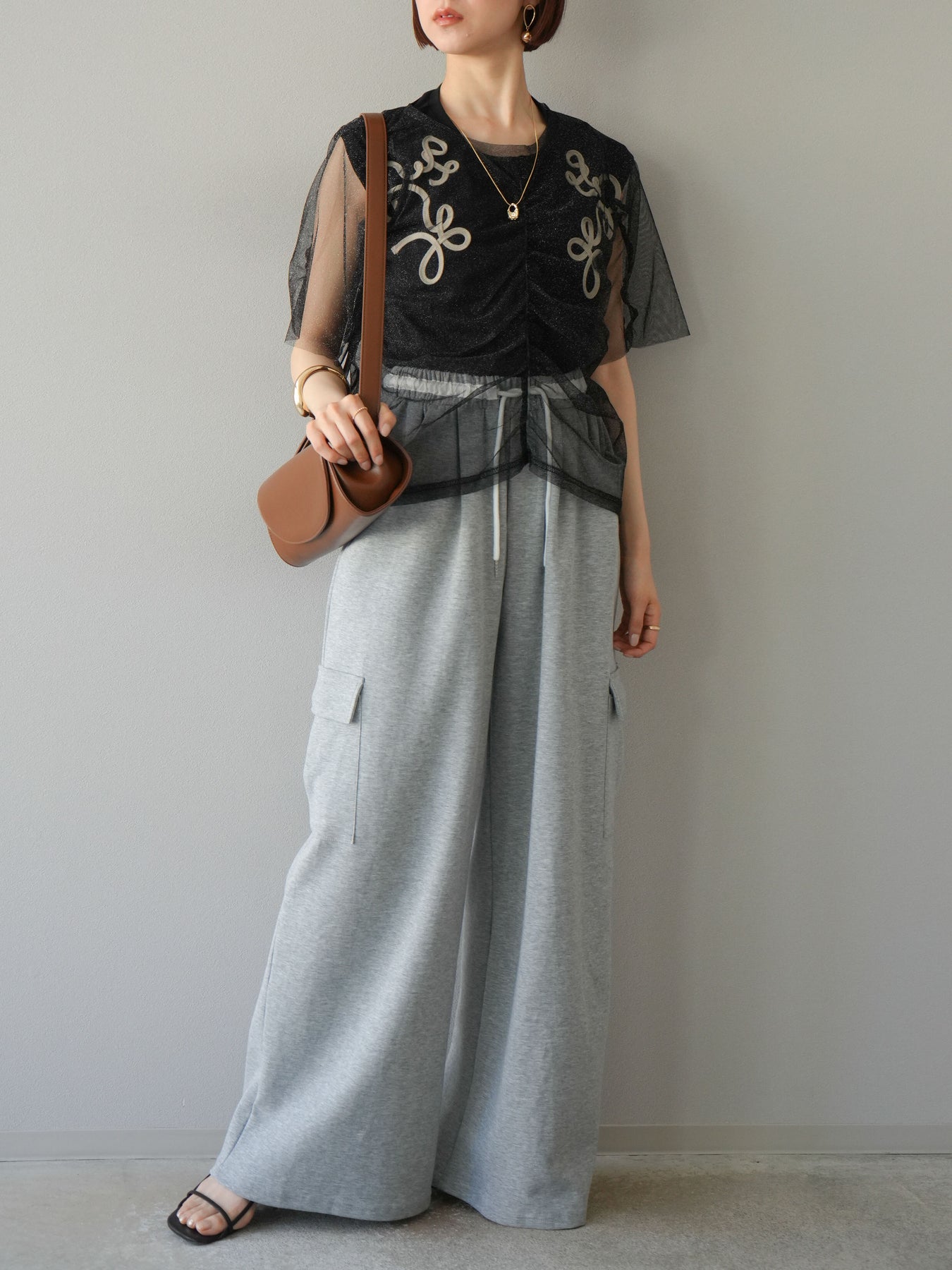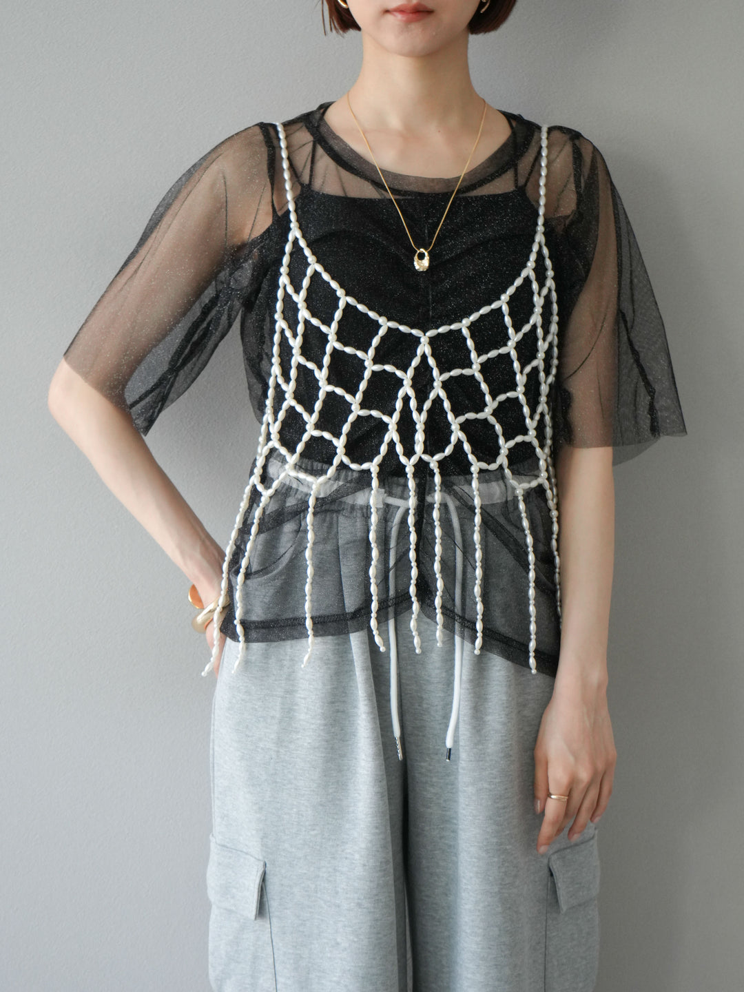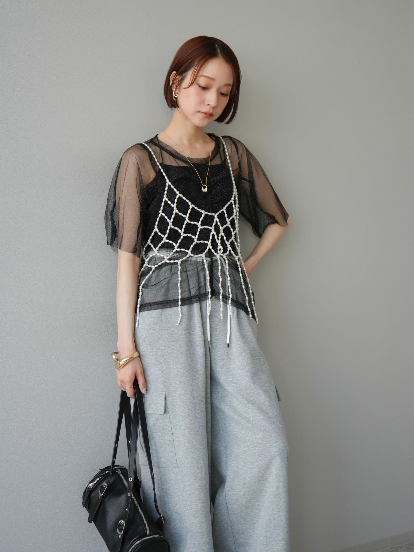 繊細なラメチュールが華やかさを添えるシャーリングプルオーバー。程よい透け感と、フロント&ウエストのドロストギャザーが立体的なシルエットを演出します。レイヤードスタイルに最適で、キャミソールやワンピースの上からさらりと羽織るだけで、旬な着こなしが完成します。デイリーから特別なシーンまで幅広く活躍する一枚です。 ※ボトムス、キャミソール(インナー)以外の商品は一律でインナーは付属していません。