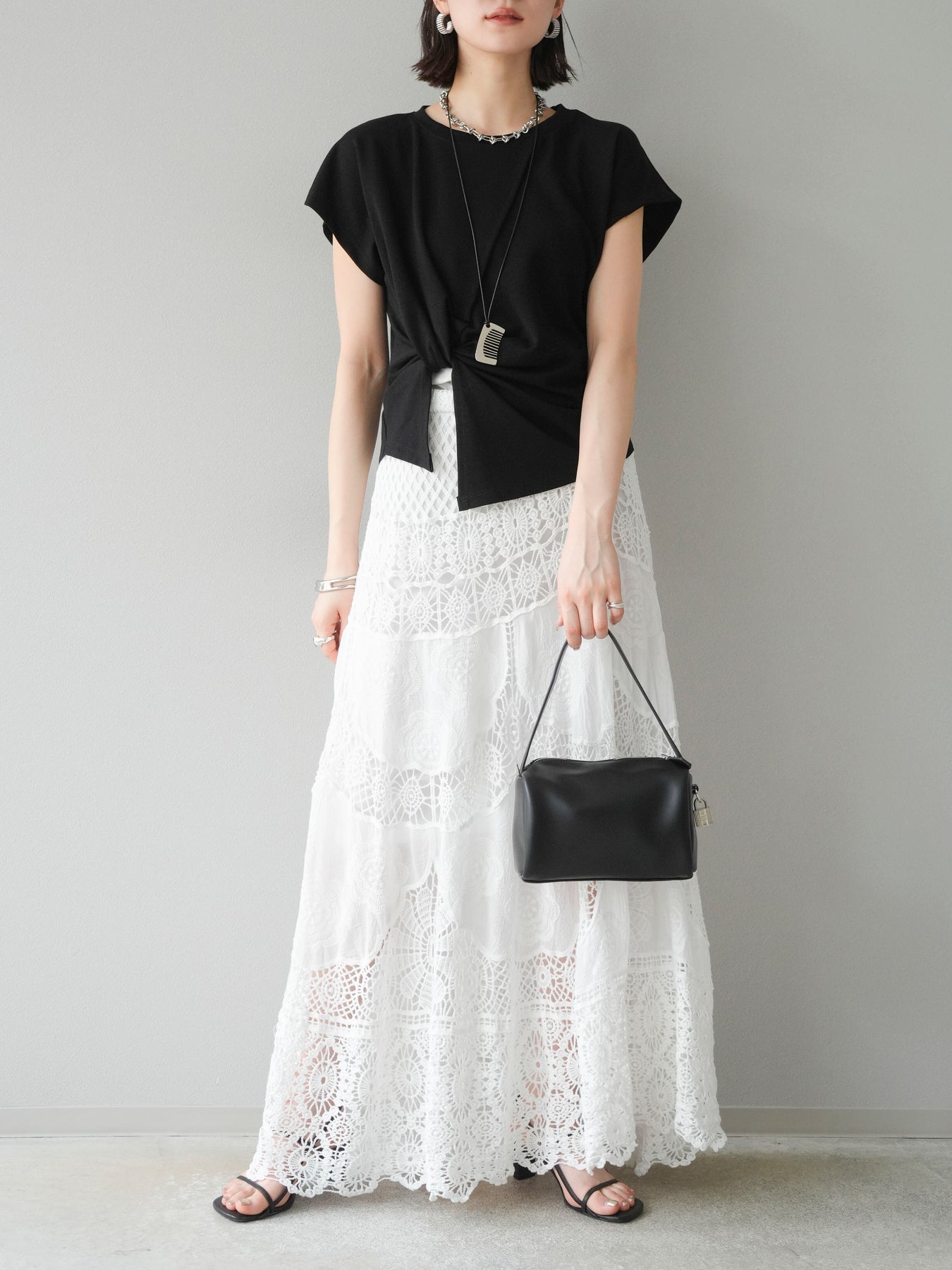 【トップス】肩幅57cm バスト102cm 袖口38cm フロント着丈最大65cm バック着丈63cm 透け感なし 伸縮性あり 【ネックレス】紐全長94cm モチーフ高さ5cm 幅2.5cm
