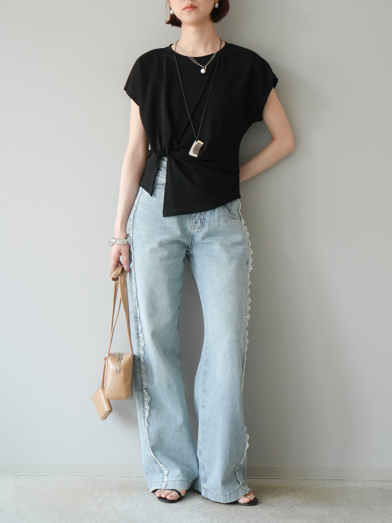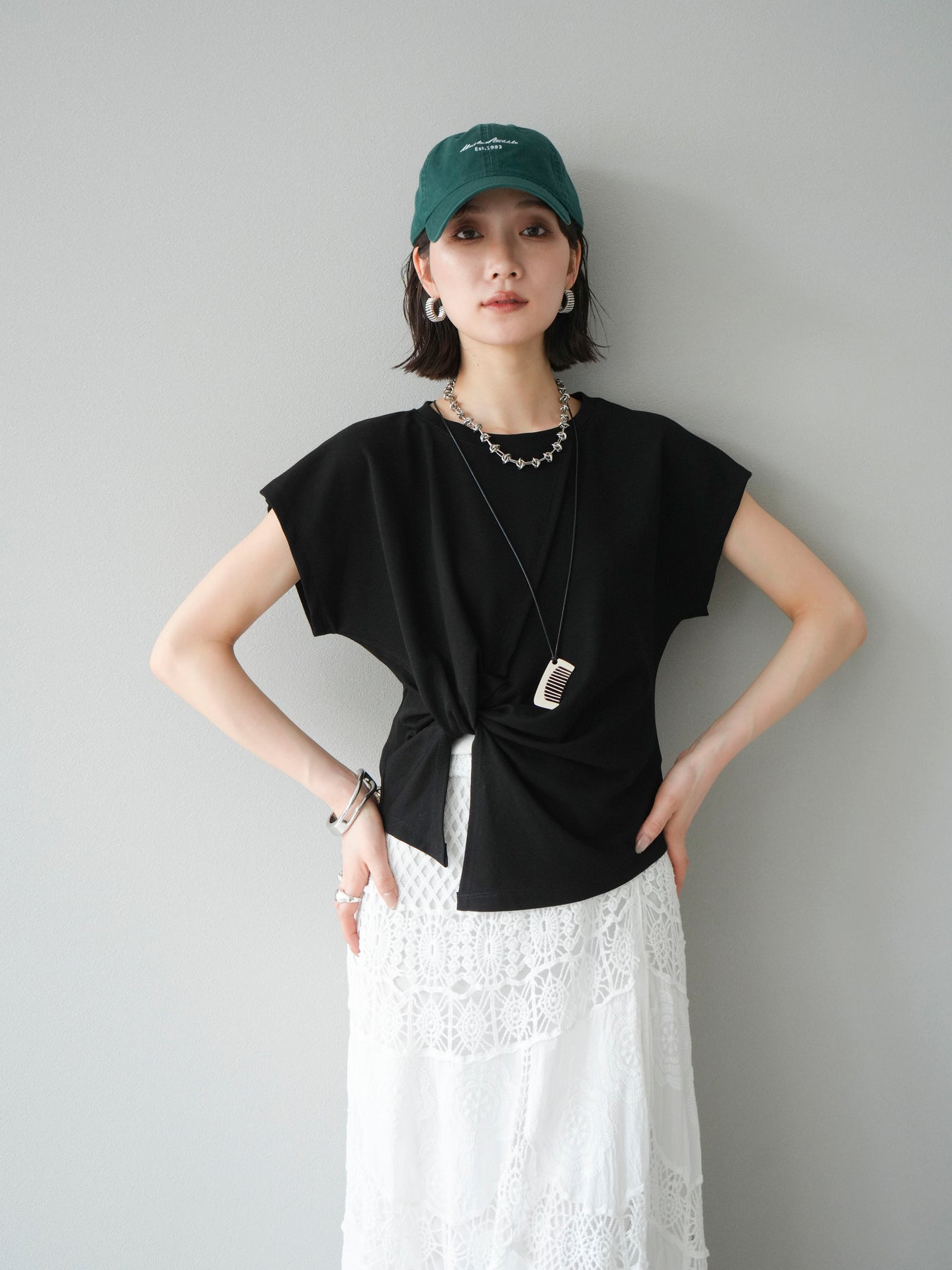フロントのカシュクールデザインが印象的なTシャツに、シンプルながら存在感のあるコームネックレスがセットになったアイテム。抜け感のあるシルエットで、ラフさと女性らしさを絶妙に両立。程よく二の腕をカバーしてくれる袖丈や、腰まわりにニュアンスを出せるクロスデザインで、着るだけでこなれた印象に仕上がります。ネックレス付きで、コーディネートに悩まず即スタイリングが完成。デニムからスカートまで、幅広いボトムと好相性な万能トップスです。 ※ボトムス、キャミソール(インナー)以外の商品は一律でインナーは付属していません。