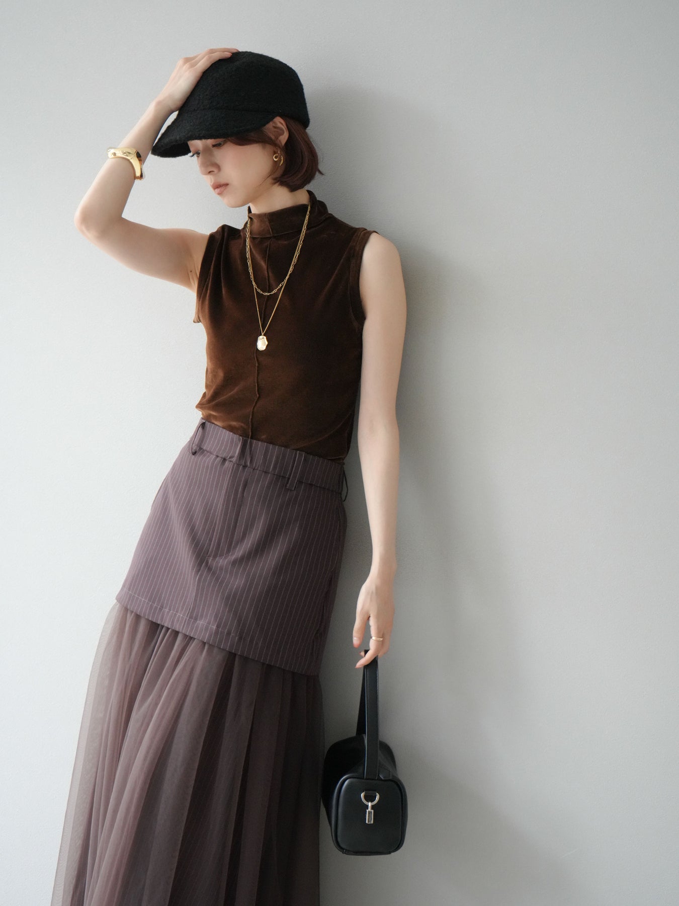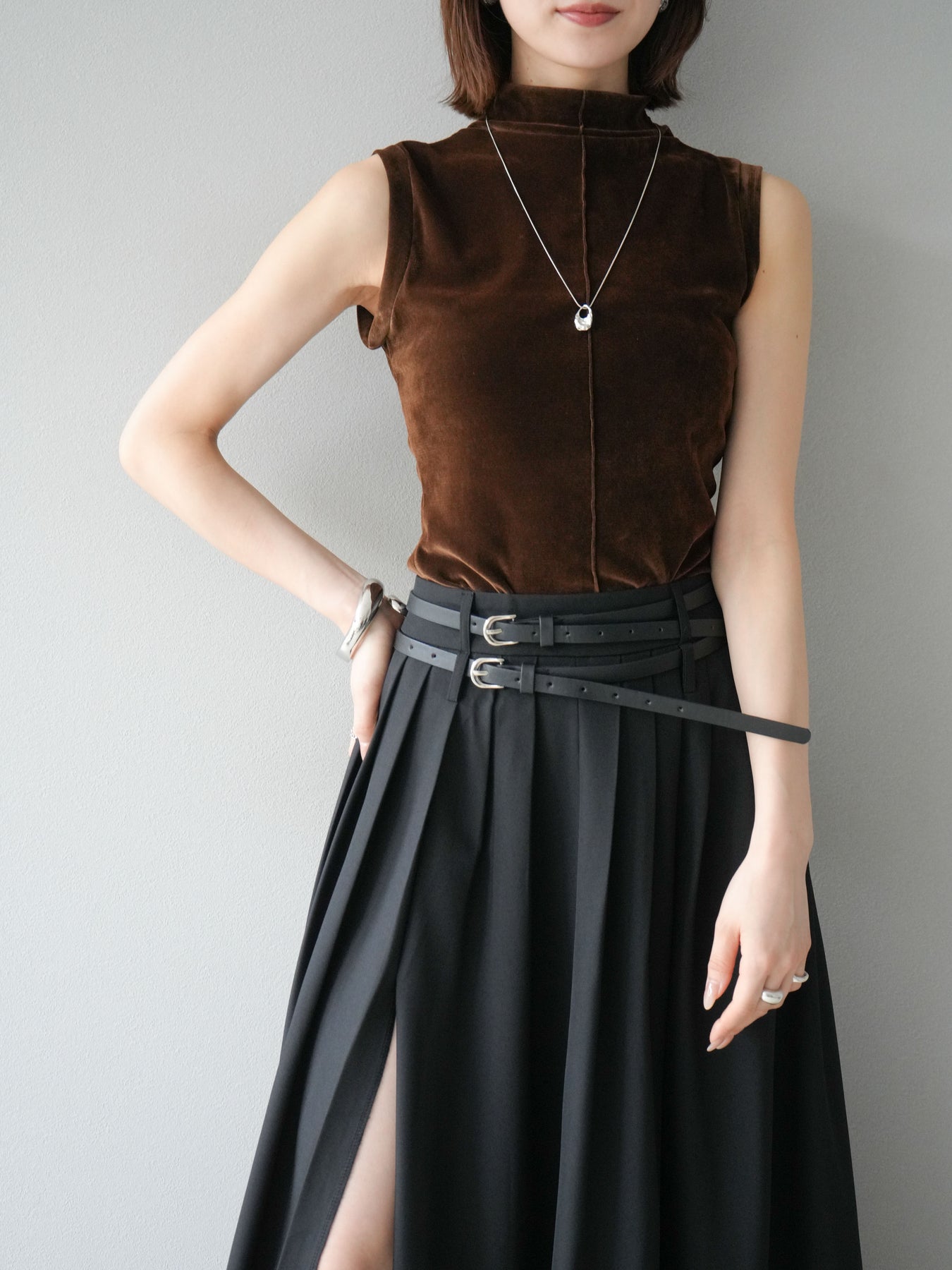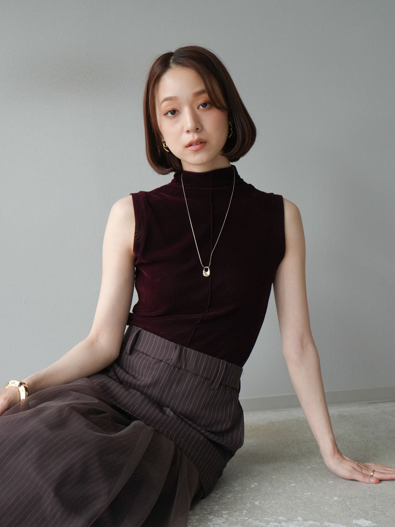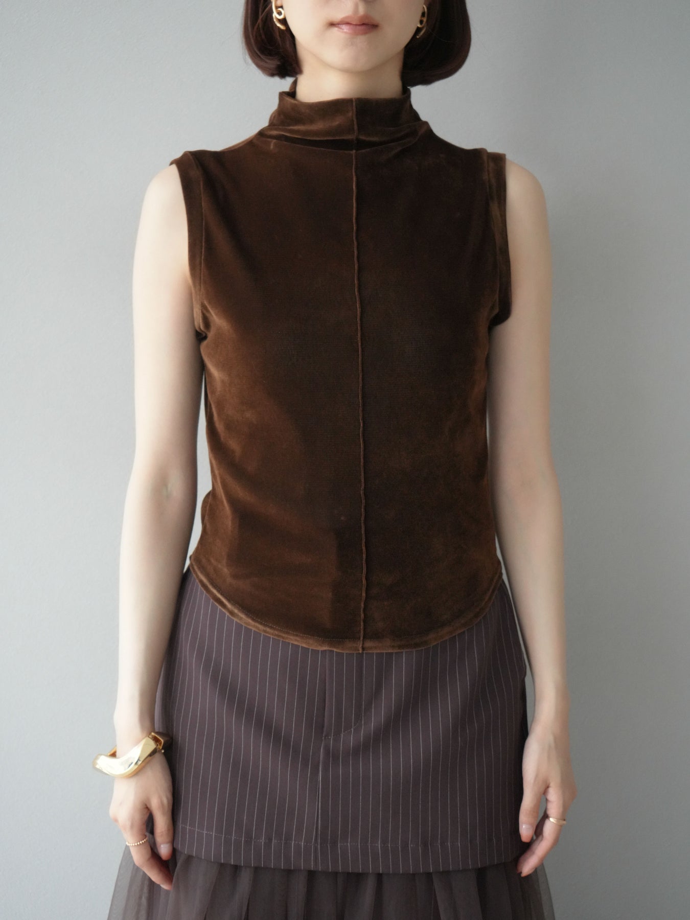 光沢感のあるベロア素材にシアー感をプラスしたプチネックトップス。首元を程よく覆うデザインが上品さを引き立て、コンパクトなシルエットでレイヤードにも重宝します。ノースリーブ仕様で抜け感があり、1枚での着用はもちろん、ジャケットやカーディガンのインナーとしても映える万能アイテム。素材の持つリッチな質感が女性らしい雰囲気を演出し、デイリーから特別なシーンまで幅広く活躍します。シンプルながらも着こなしに奥行きを与えてくれる一枚です。 ※ボトムス、キャミソール(インナー)以外の商品は一律でインナーは付属していません。