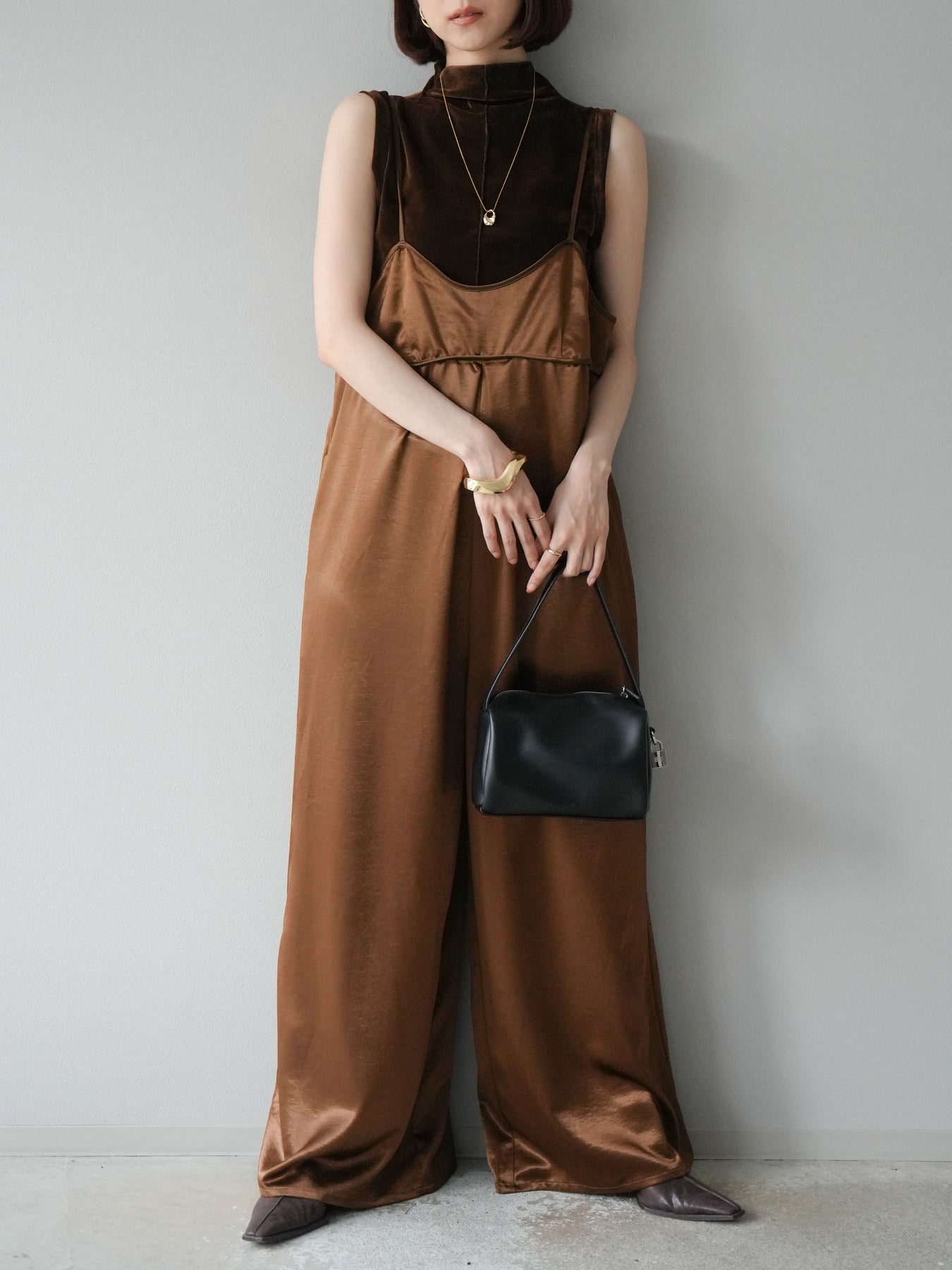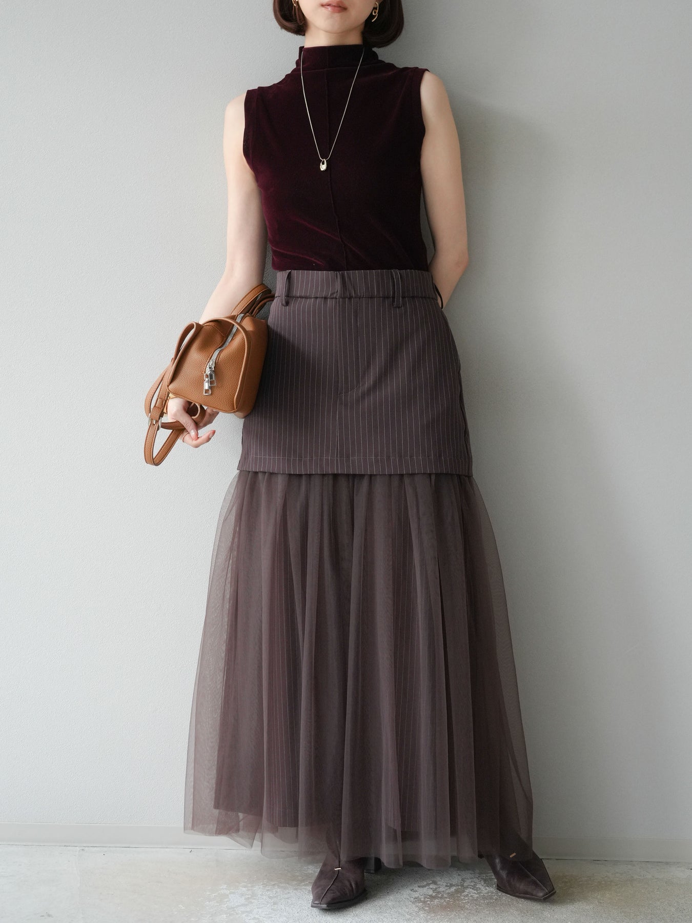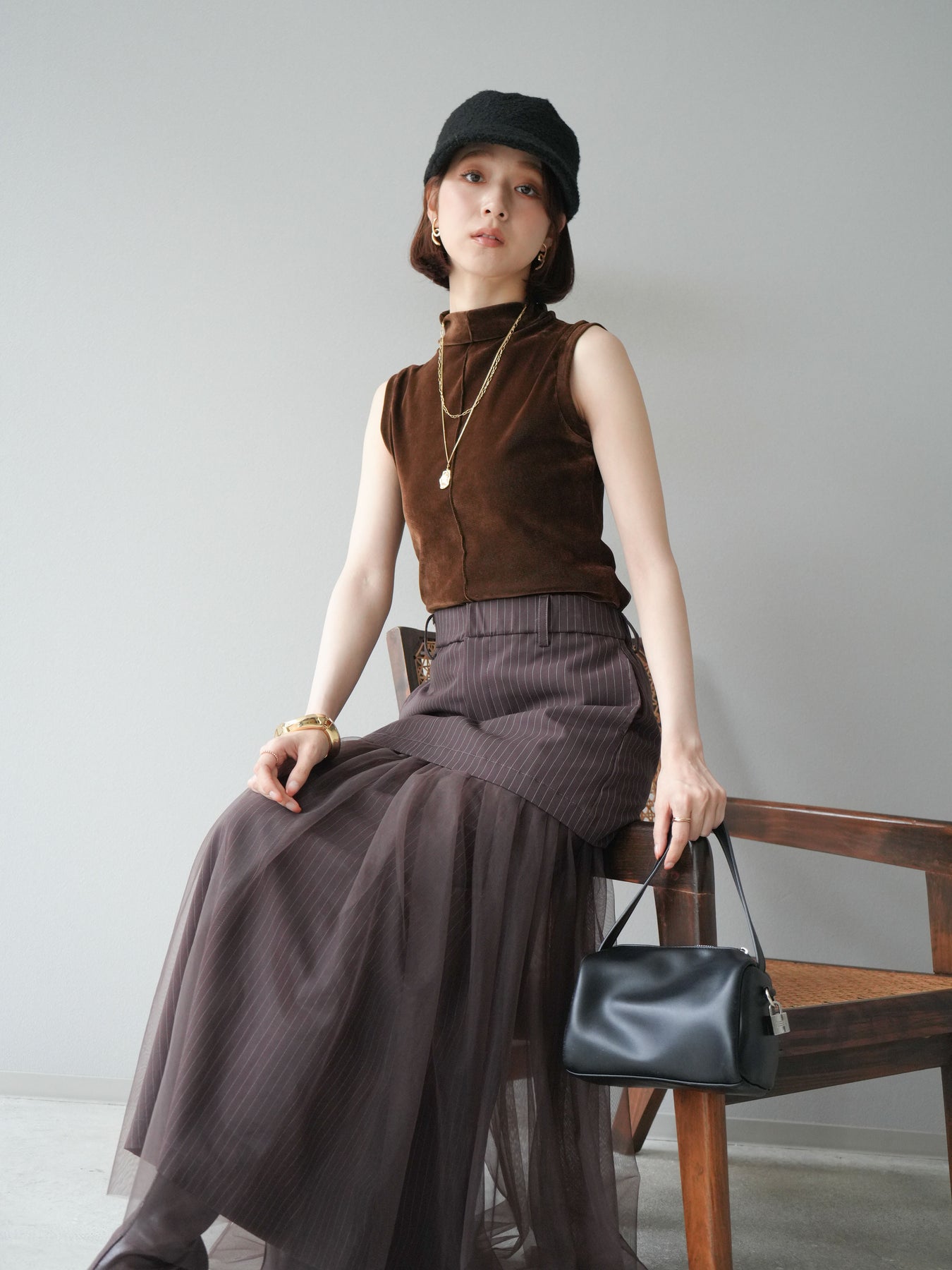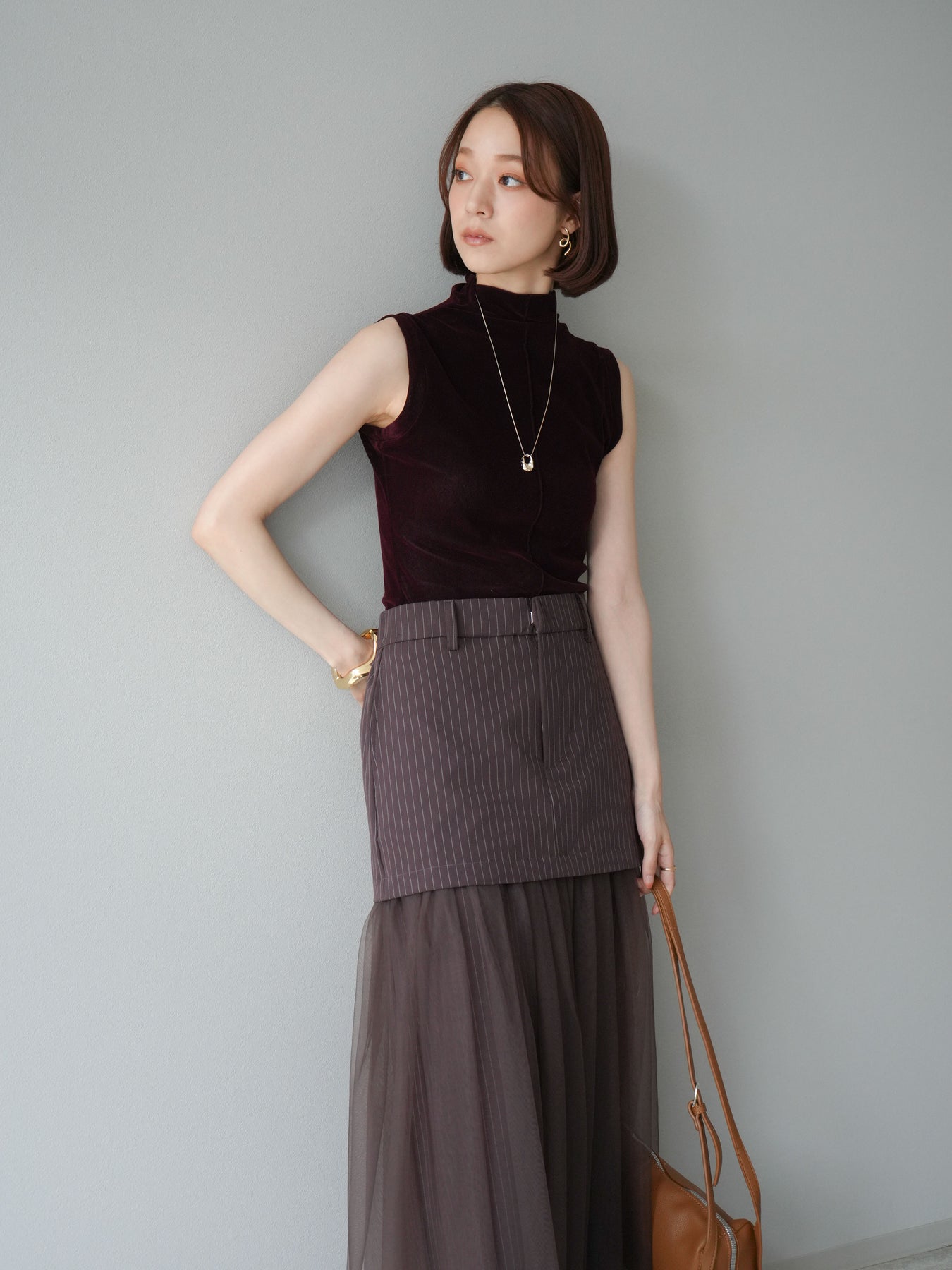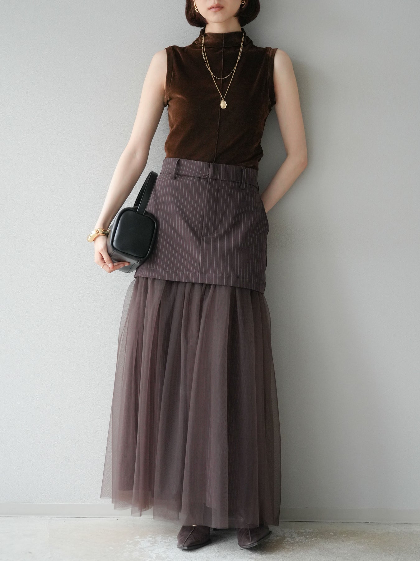 光沢感のあるベロア素材にシアー感をプラスしたプチネックトップス。首元を程よく覆うデザインが上品さを引き立て、コンパクトなシルエットでレイヤードにも重宝します。ノースリーブ仕様で抜け感があり、1枚での着用はもちろん、ジャケットやカーディガンのインナーとしても映える万能アイテム。素材の持つリッチな質感が女性らしい雰囲気を演出し、デイリーから特別なシーンまで幅広く活躍します。シンプルながらも着こなしに奥行きを与えてくれる一枚です。 ※ボトムス、キャミソール(インナー)以外の商品は一律でインナーは付属していません。