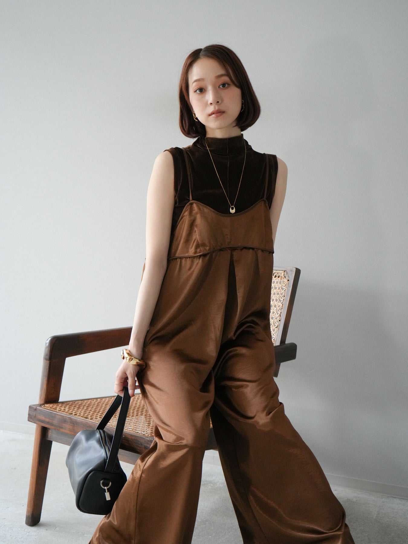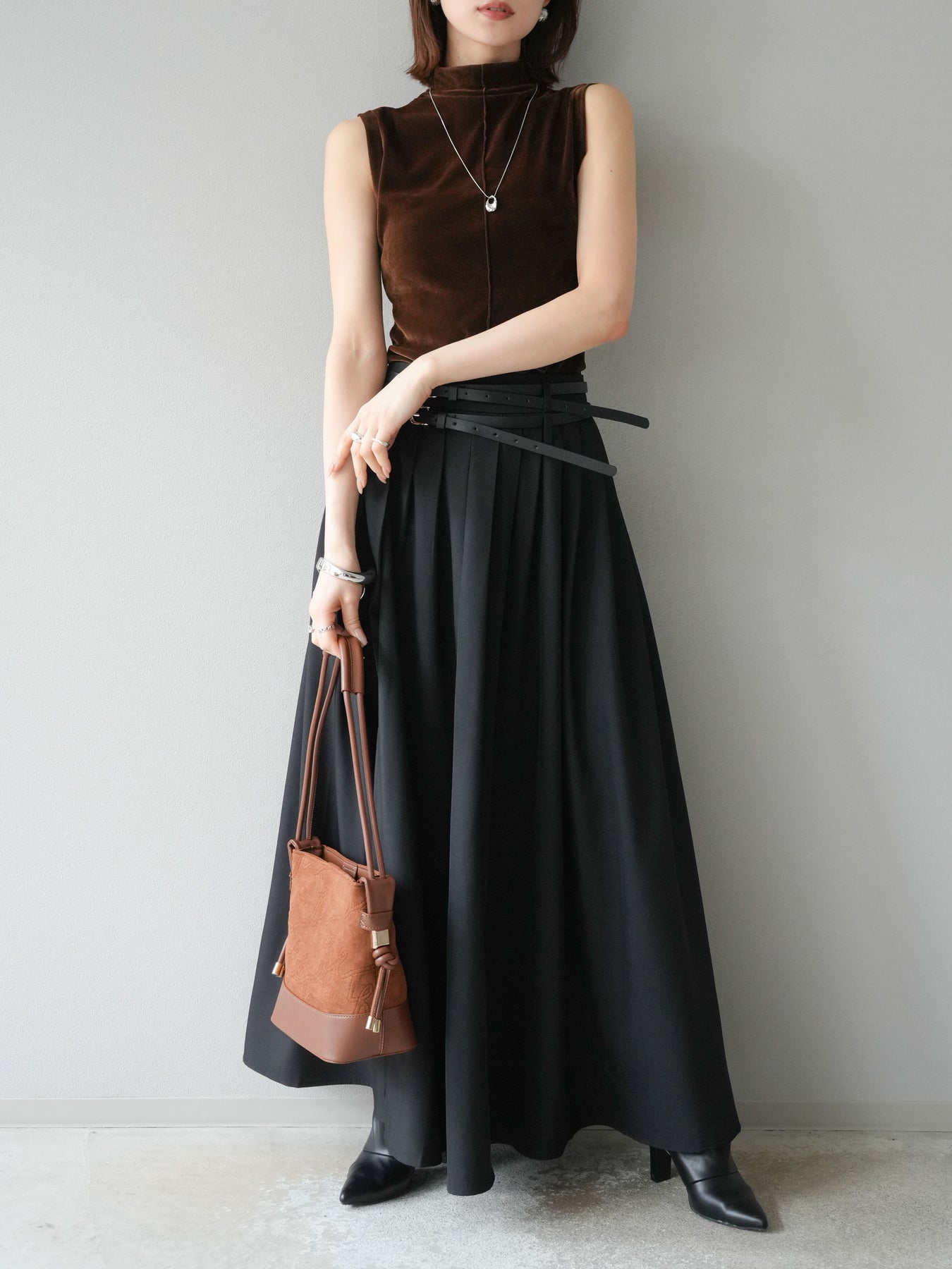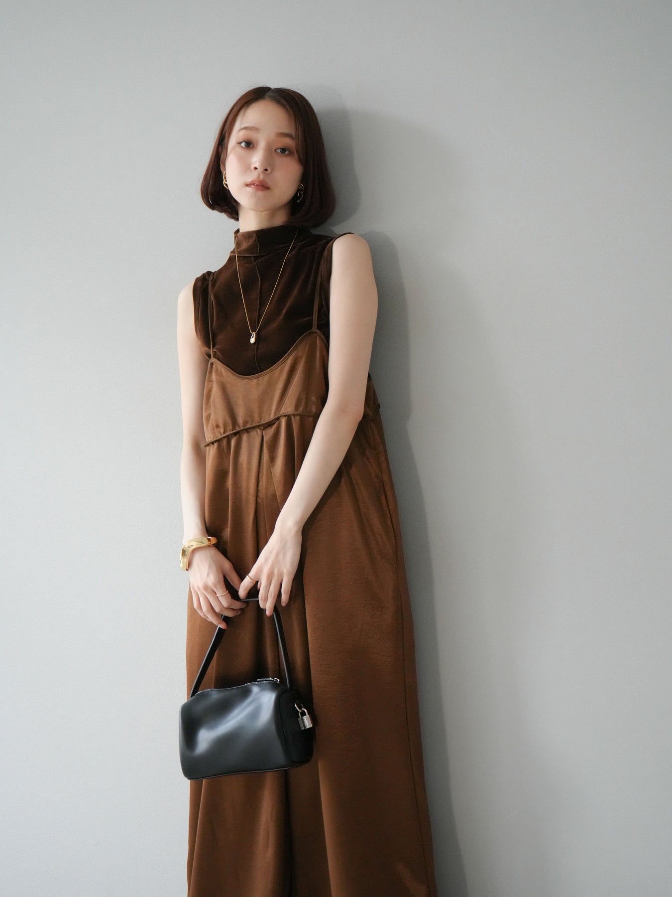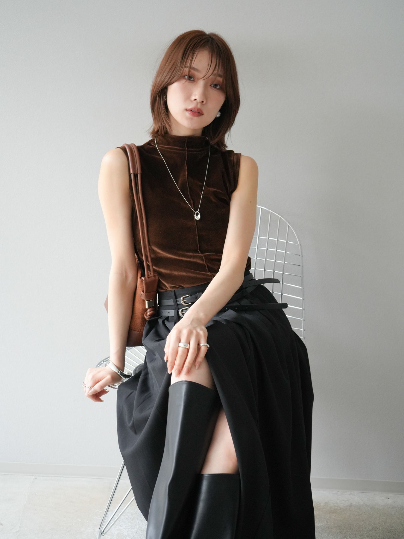 光沢感のあるベロア素材にシアー感をプラスしたプチネックトップス。首元を程よく覆うデザインが上品さを引き立て、コンパクトなシルエットでレイヤードにも重宝します。ノースリーブ仕様で抜け感があり、1枚での着用はもちろん、ジャケットやカーディガンのインナーとしても映える万能アイテム。素材の持つリッチな質感が女性らしい雰囲気を演出し、デイリーから特別なシーンまで幅広く活躍します。シンプルながらも着こなしに奥行きを与えてくれる一枚です。 ※ボトムス、キャミソール(インナー)以外の商品は一律でインナーは付属していません。
