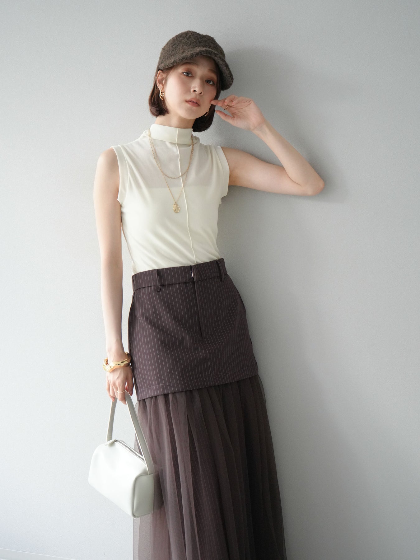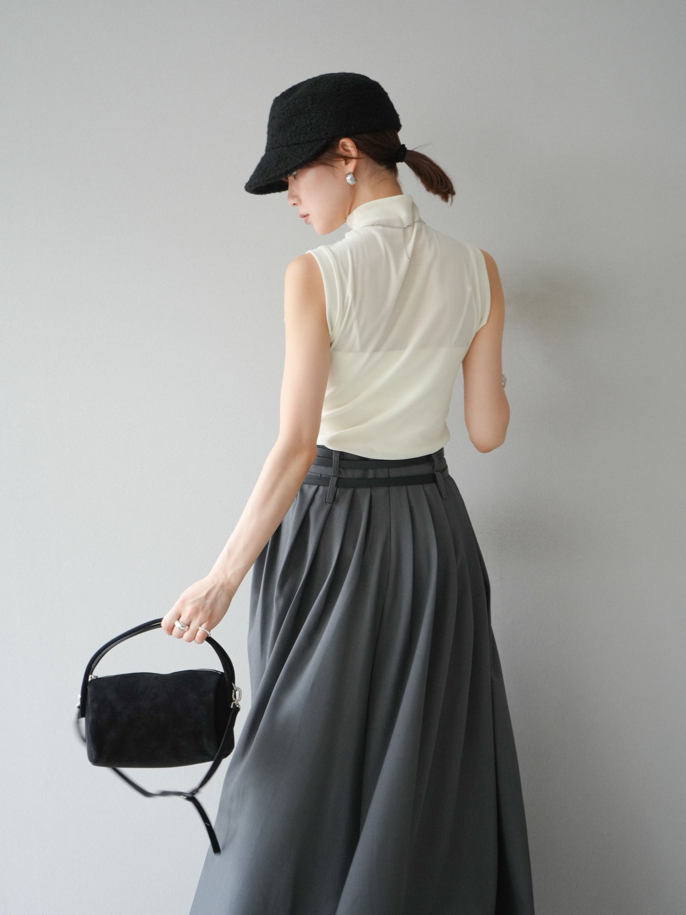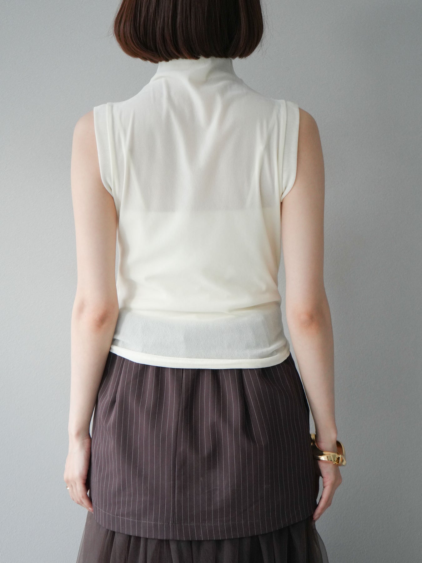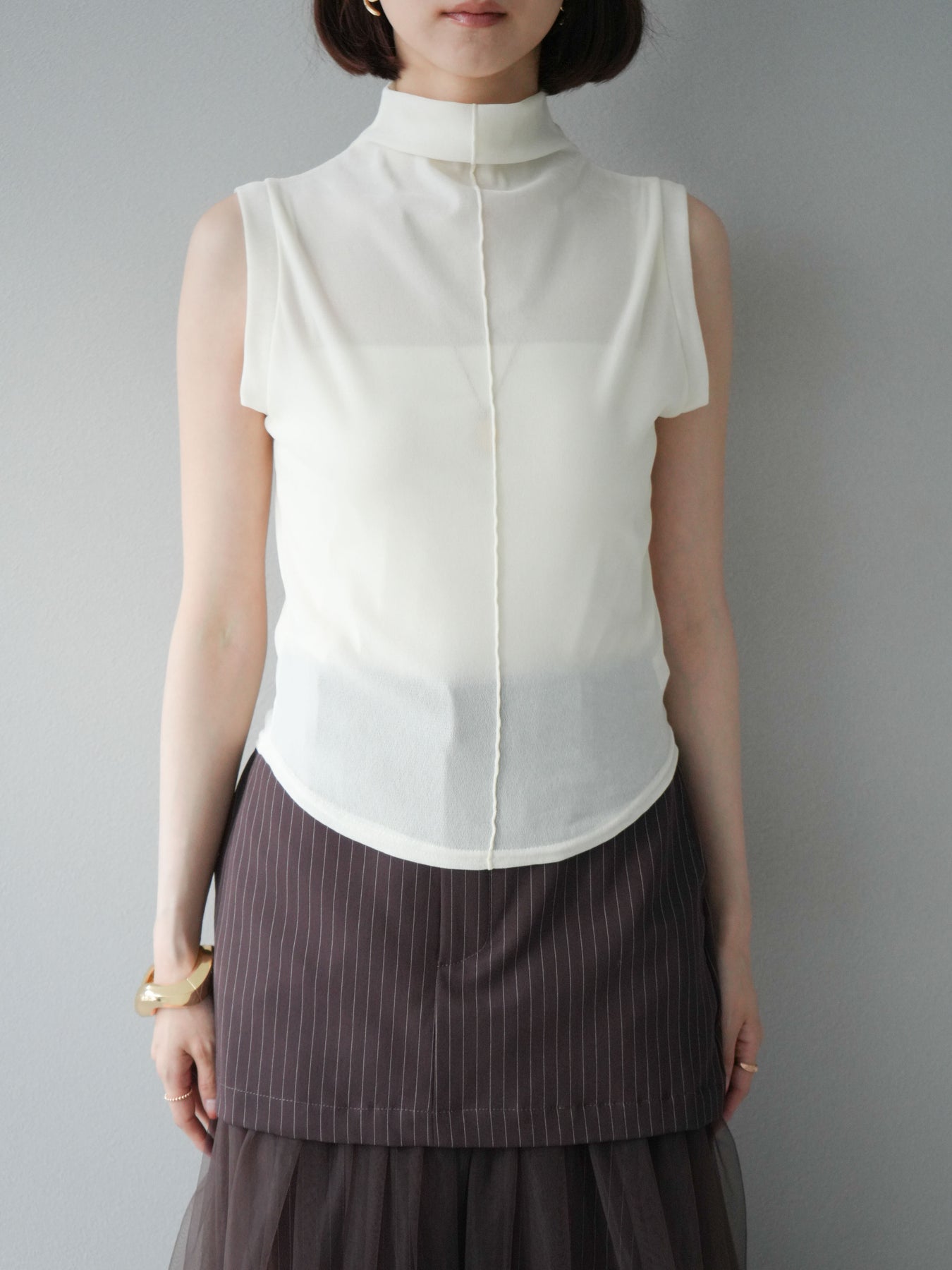 光沢感のあるベロア素材にシアー感をプラスしたプチネックトップス。首元を程よく覆うデザインが上品さを引き立て、コンパクトなシルエットでレイヤードにも重宝します。ノースリーブ仕様で抜け感があり、1枚での着用はもちろん、ジャケットやカーディガンのインナーとしても映える万能アイテム。素材の持つリッチな質感が女性らしい雰囲気を演出し、デイリーから特別なシーンまで幅広く活躍します。シンプルながらも着こなしに奥行きを与えてくれる一枚です。 ※ボトムス、キャミソール(インナー)以外の商品は一律でインナーは付属していません。