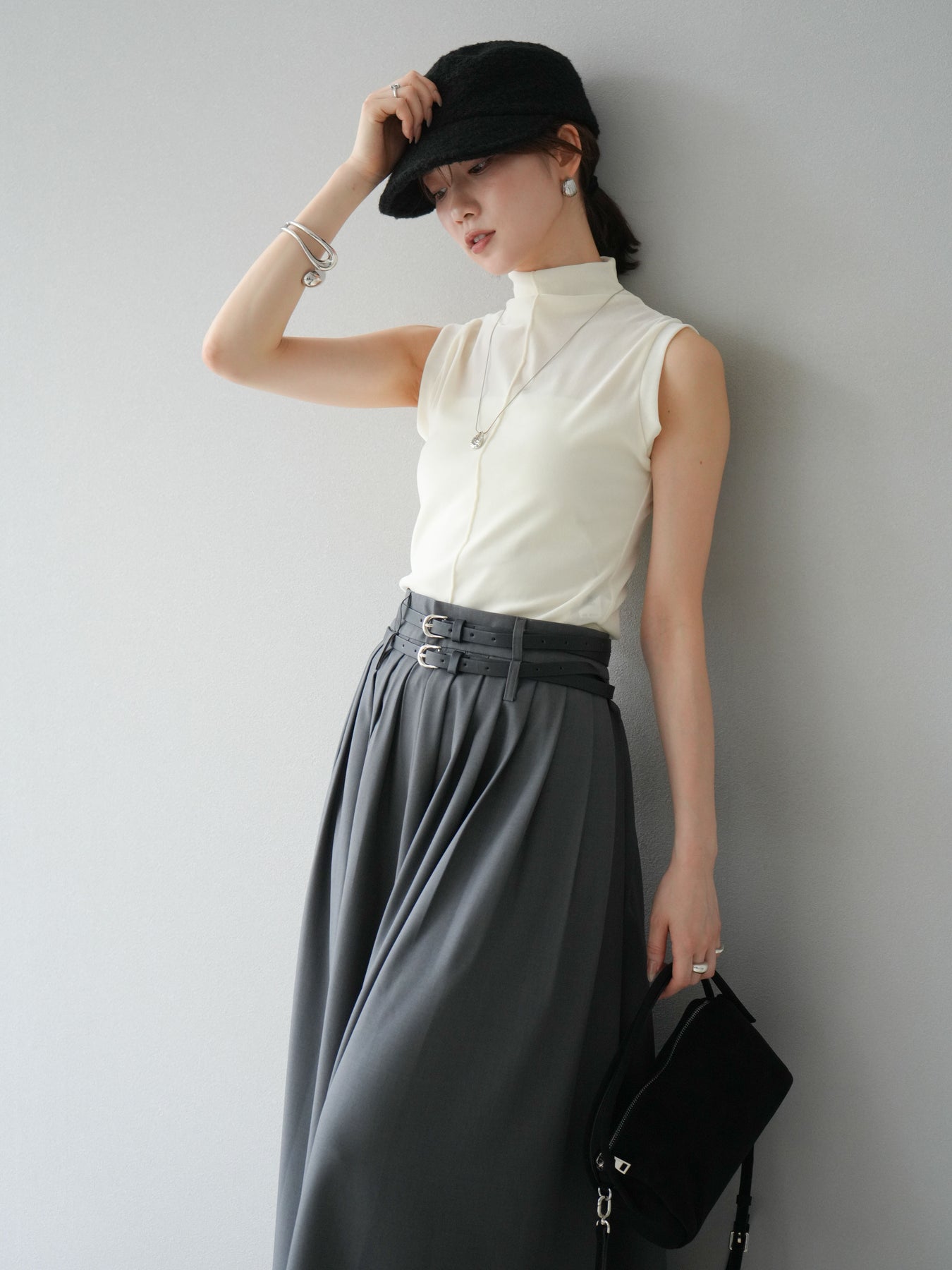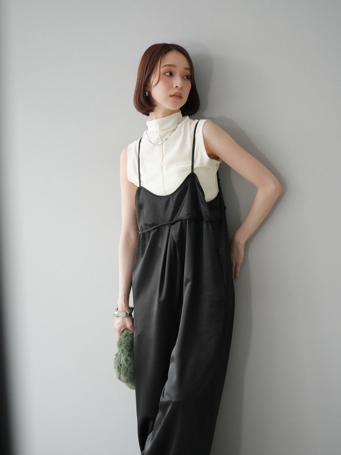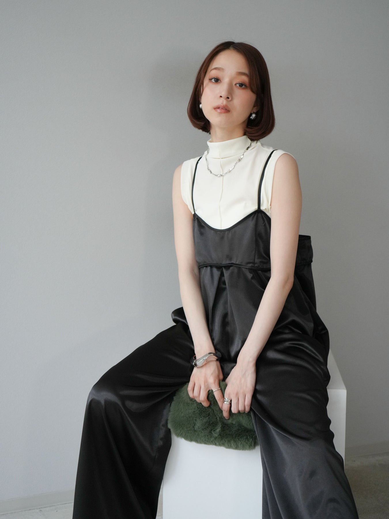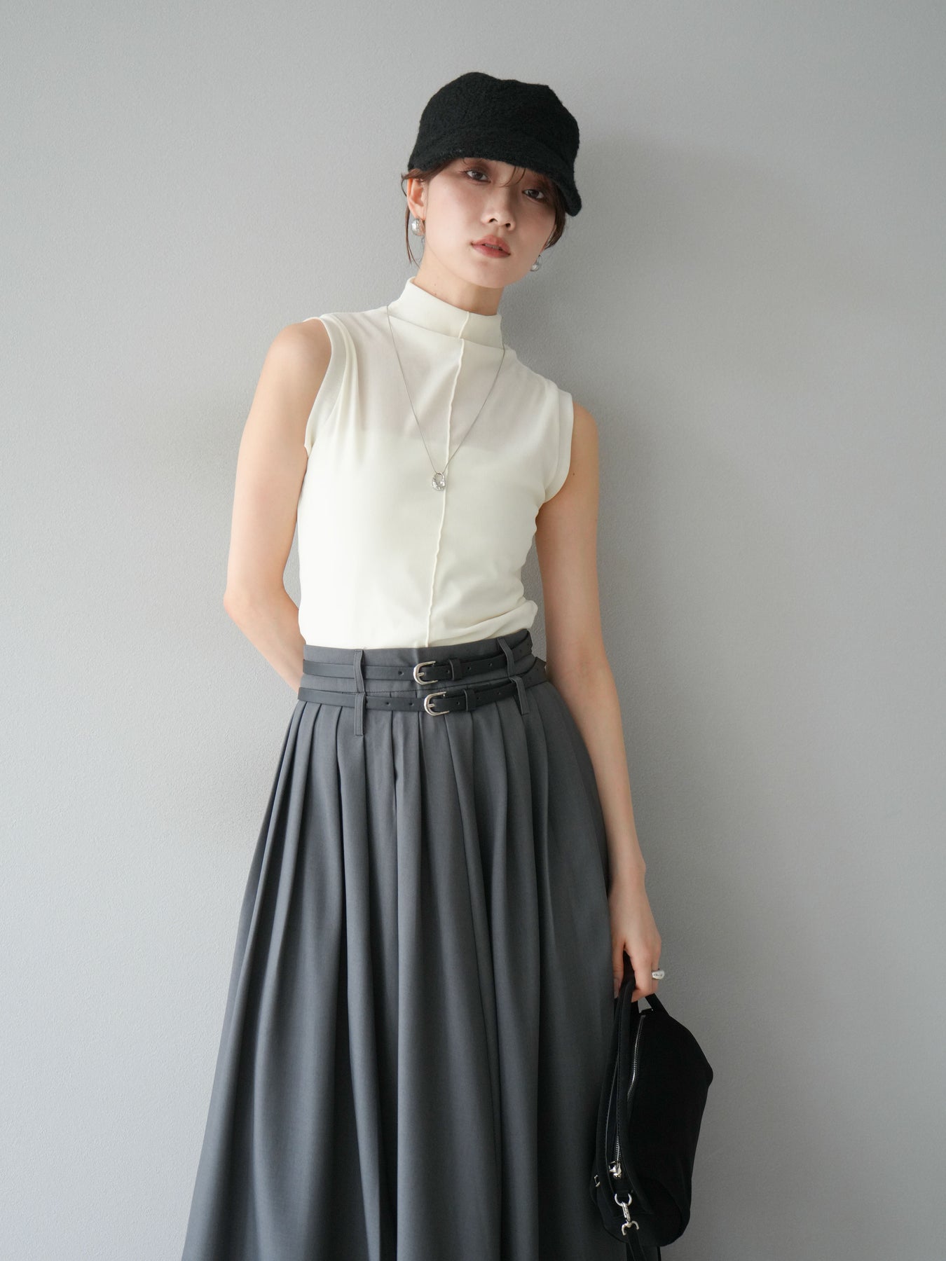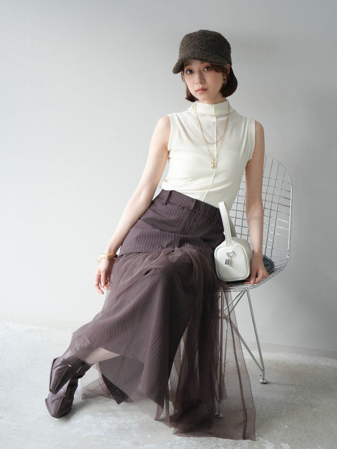 光沢感のあるベロア素材にシアー感をプラスしたプチネックトップス。首元を程よく覆うデザインが上品さを引き立て、コンパクトなシルエットでレイヤードにも重宝します。ノースリーブ仕様で抜け感があり、1枚での着用はもちろん、ジャケットやカーディガンのインナーとしても映える万能アイテム。素材の持つリッチな質感が女性らしい雰囲気を演出し、デイリーから特別なシーンまで幅広く活躍します。シンプルながらも着こなしに奥行きを与えてくれる一枚です。 ※ボトムス、キャミソール(インナー)以外の商品は一律でインナーは付属していません。