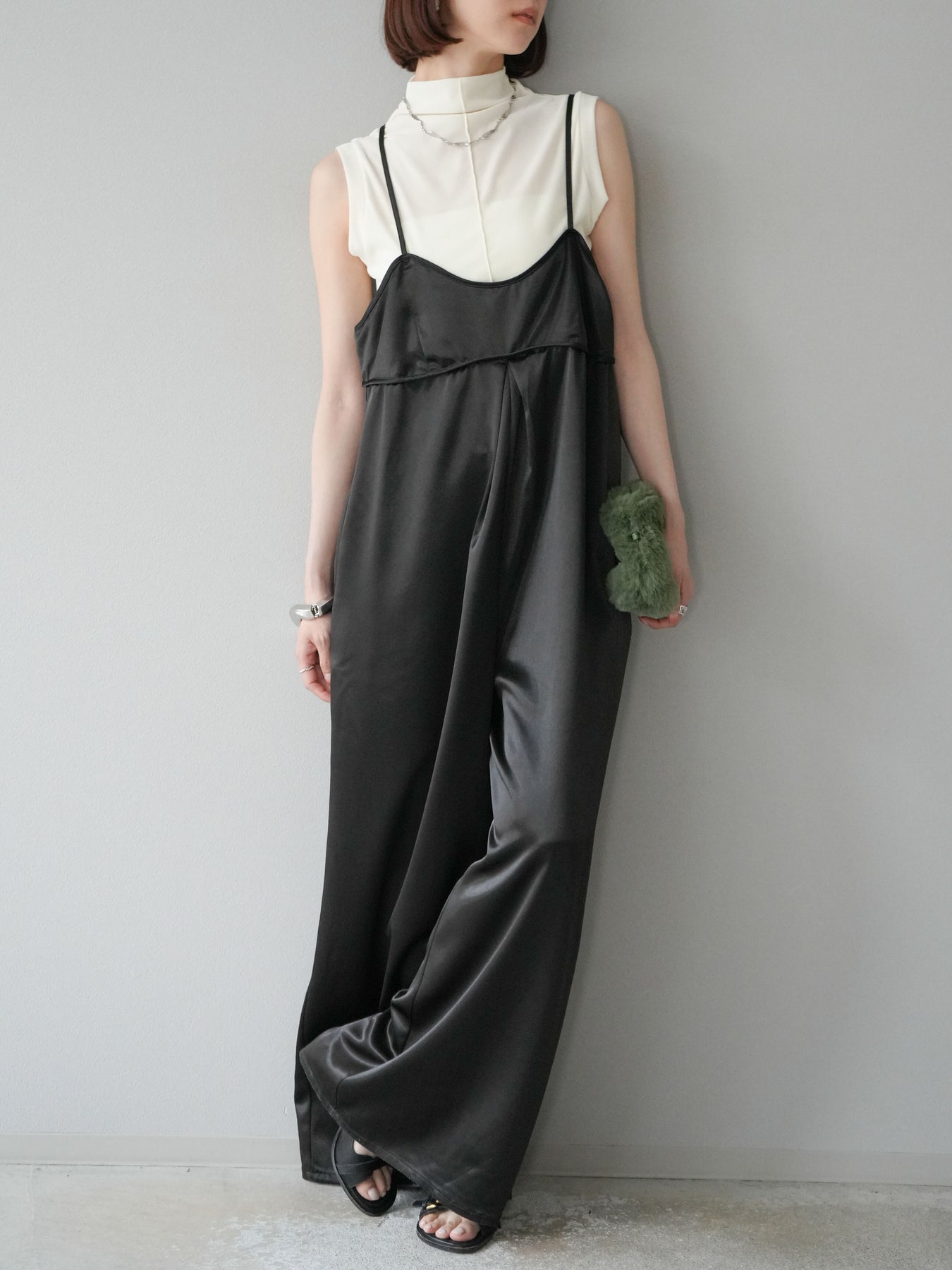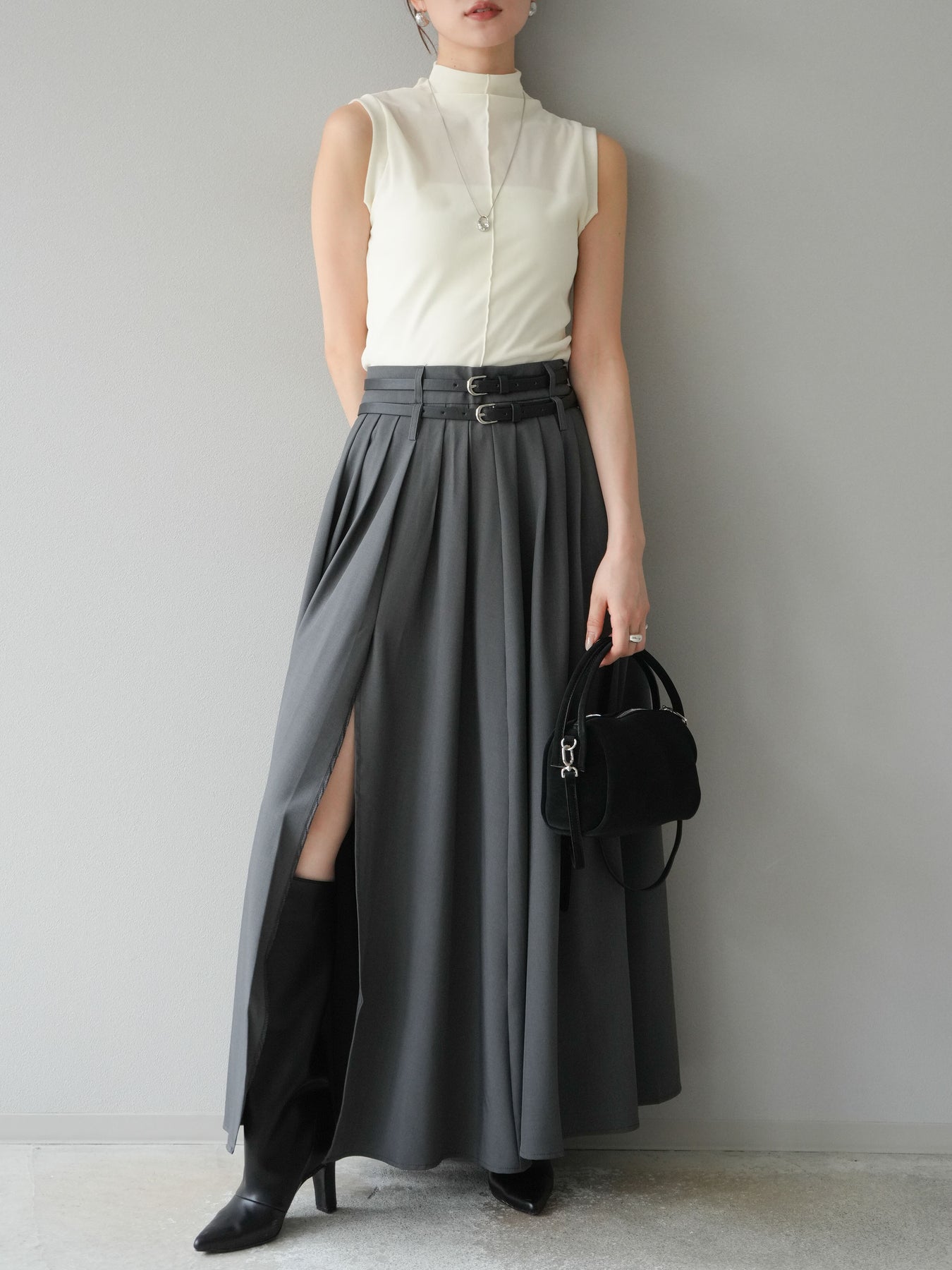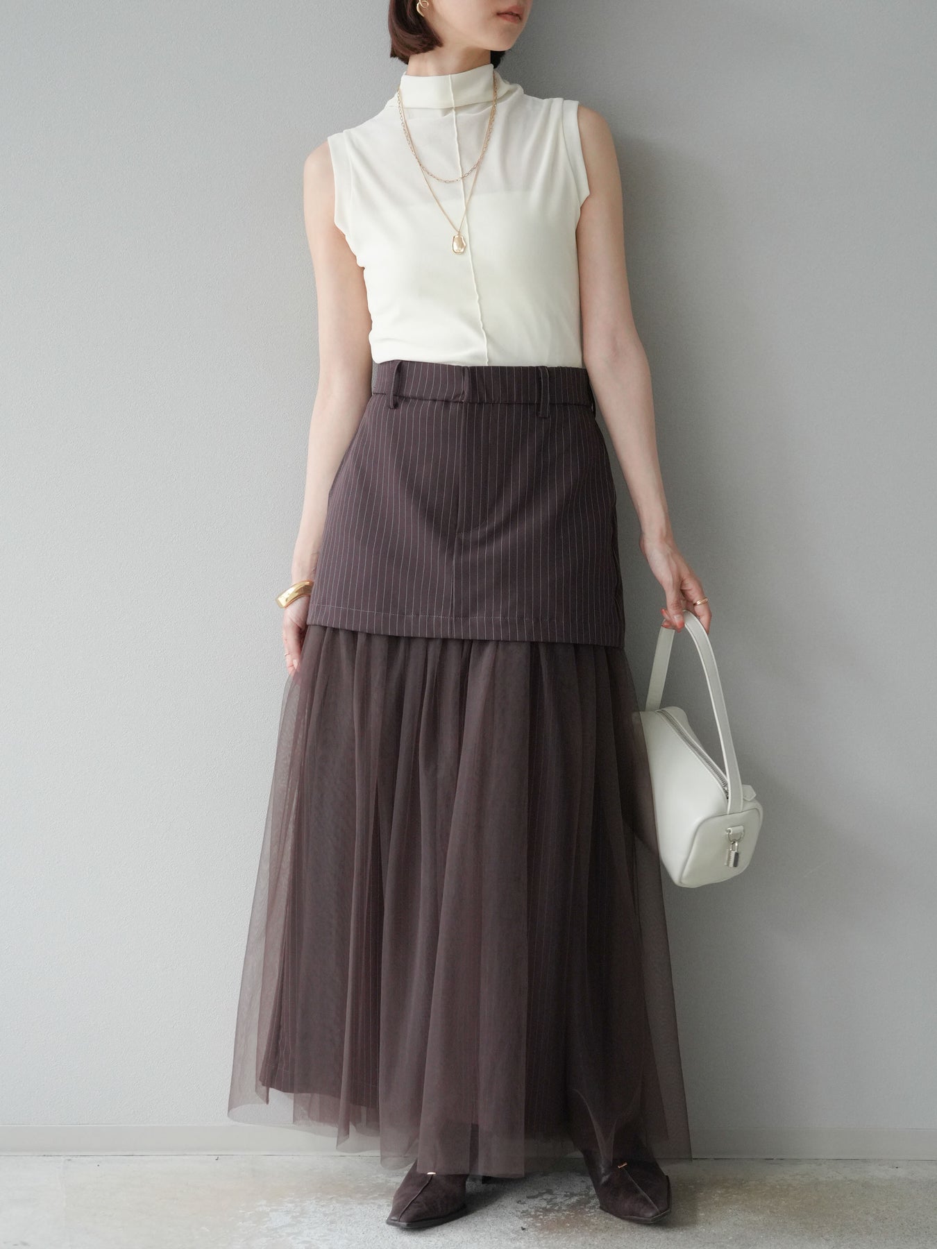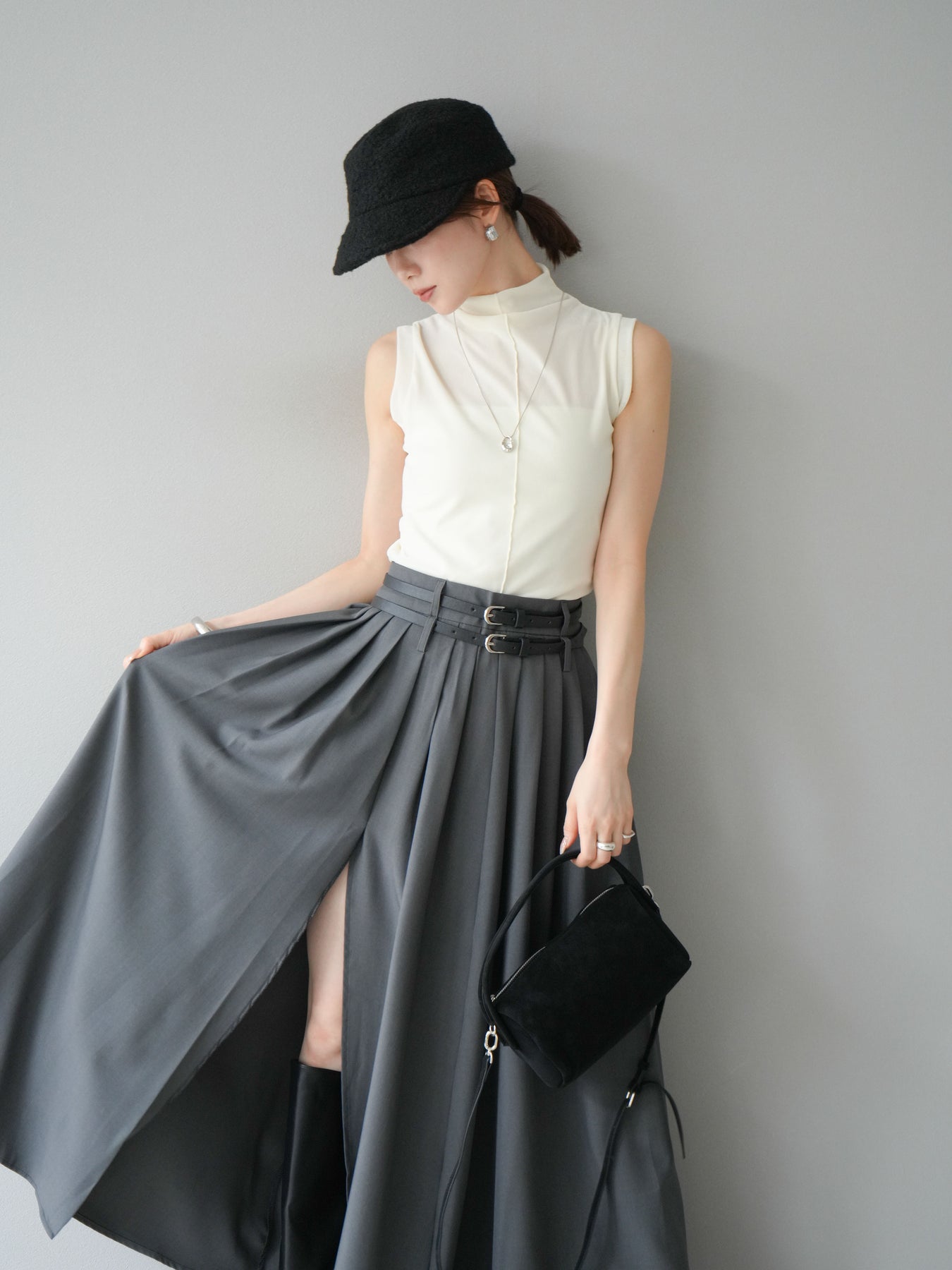 光沢感のあるベロア素材にシアー感をプラスしたプチネックトップス。首元を程よく覆うデザインが上品さを引き立て、コンパクトなシルエットでレイヤードにも重宝します。ノースリーブ仕様で抜け感があり、1枚での着用はもちろん、ジャケットやカーディガンのインナーとしても映える万能アイテム。素材の持つリッチな質感が女性らしい雰囲気を演出し、デイリーから特別なシーンまで幅広く活躍します。シンプルながらも着こなしに奥行きを与えてくれる一枚です。 ※ボトムス、キャミソール(インナー)以外の商品は一律でインナーは付属していません。