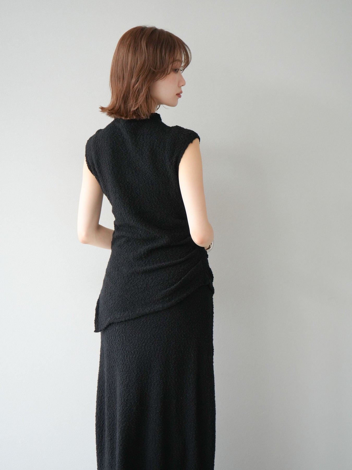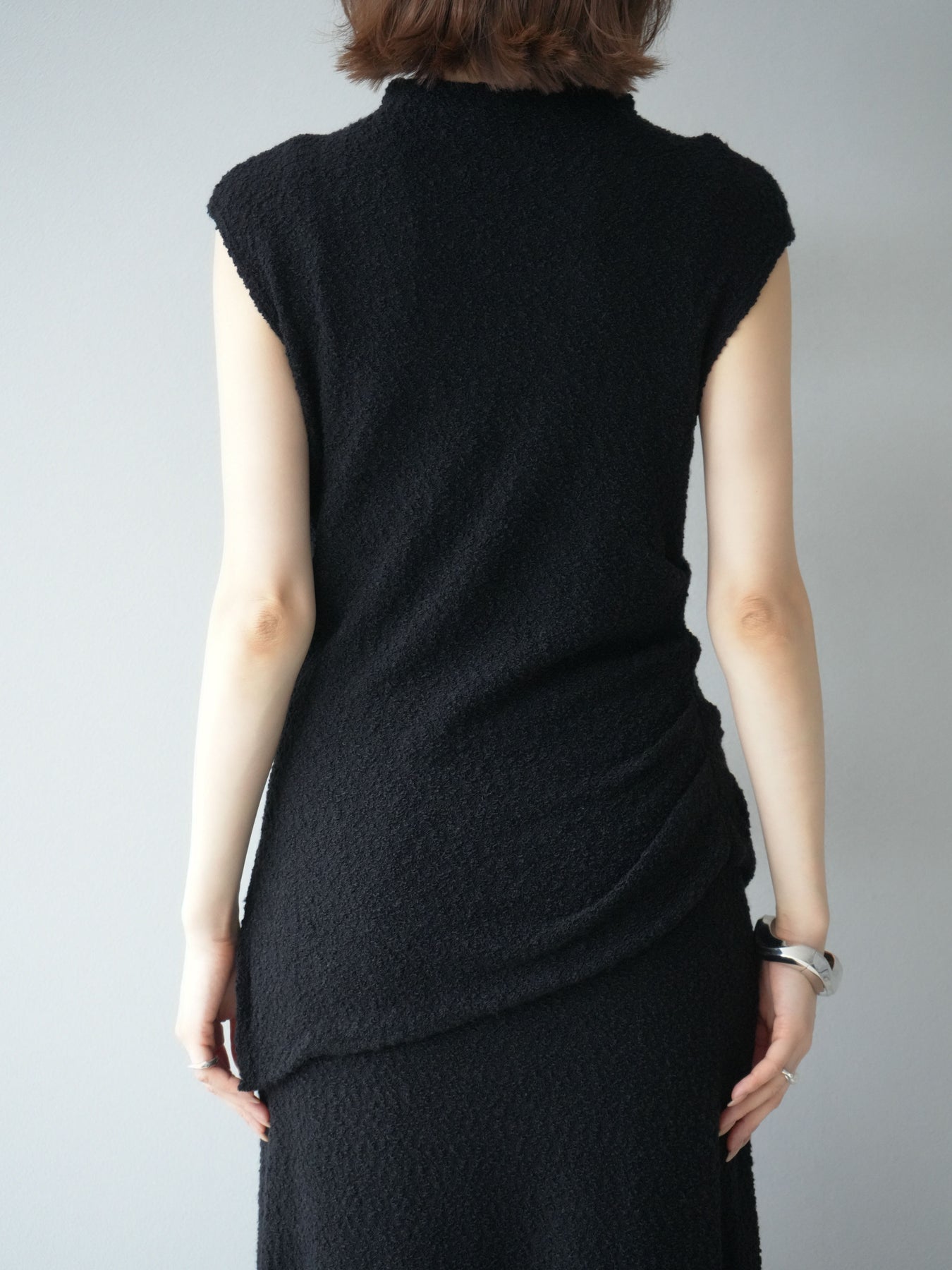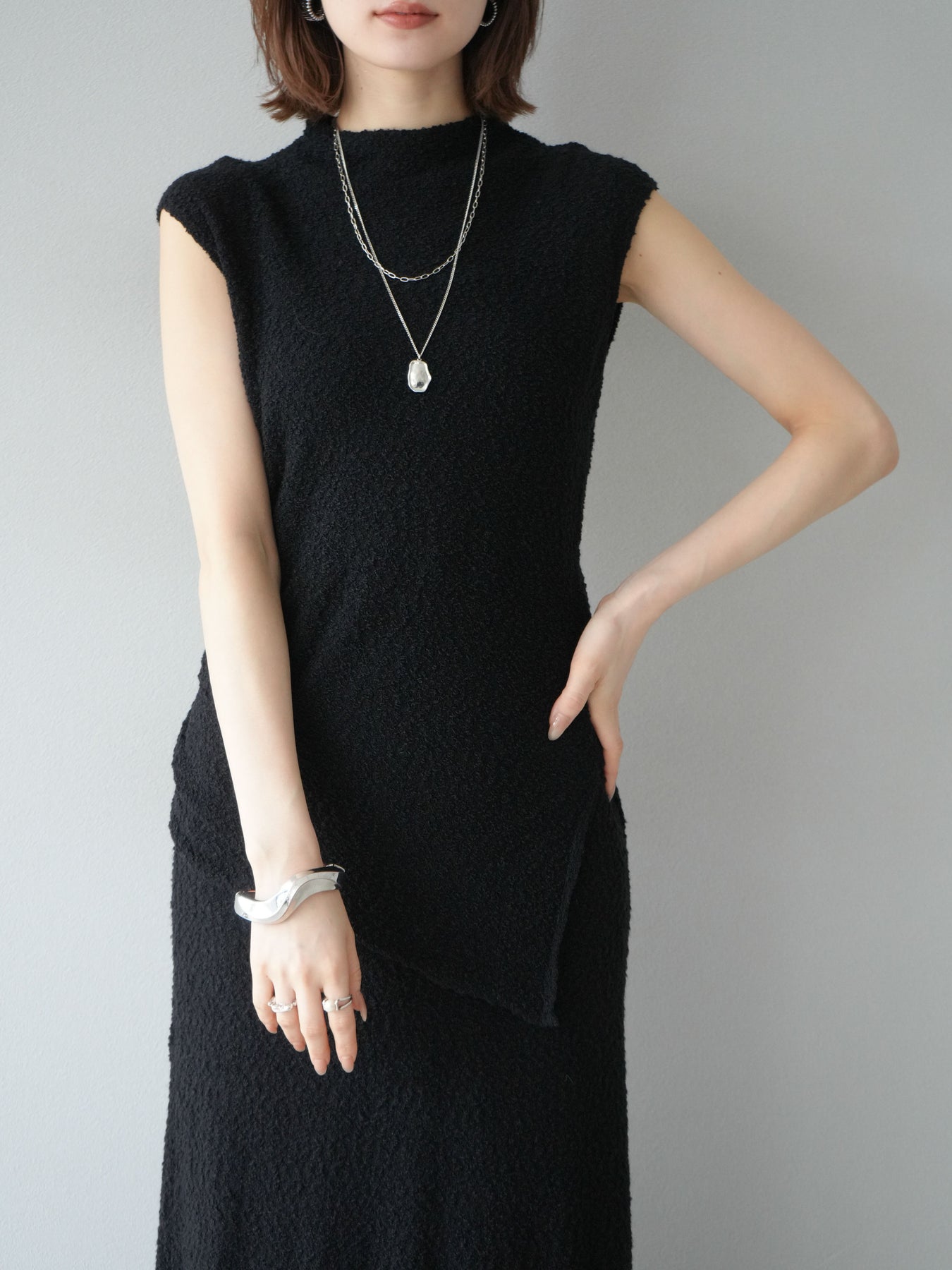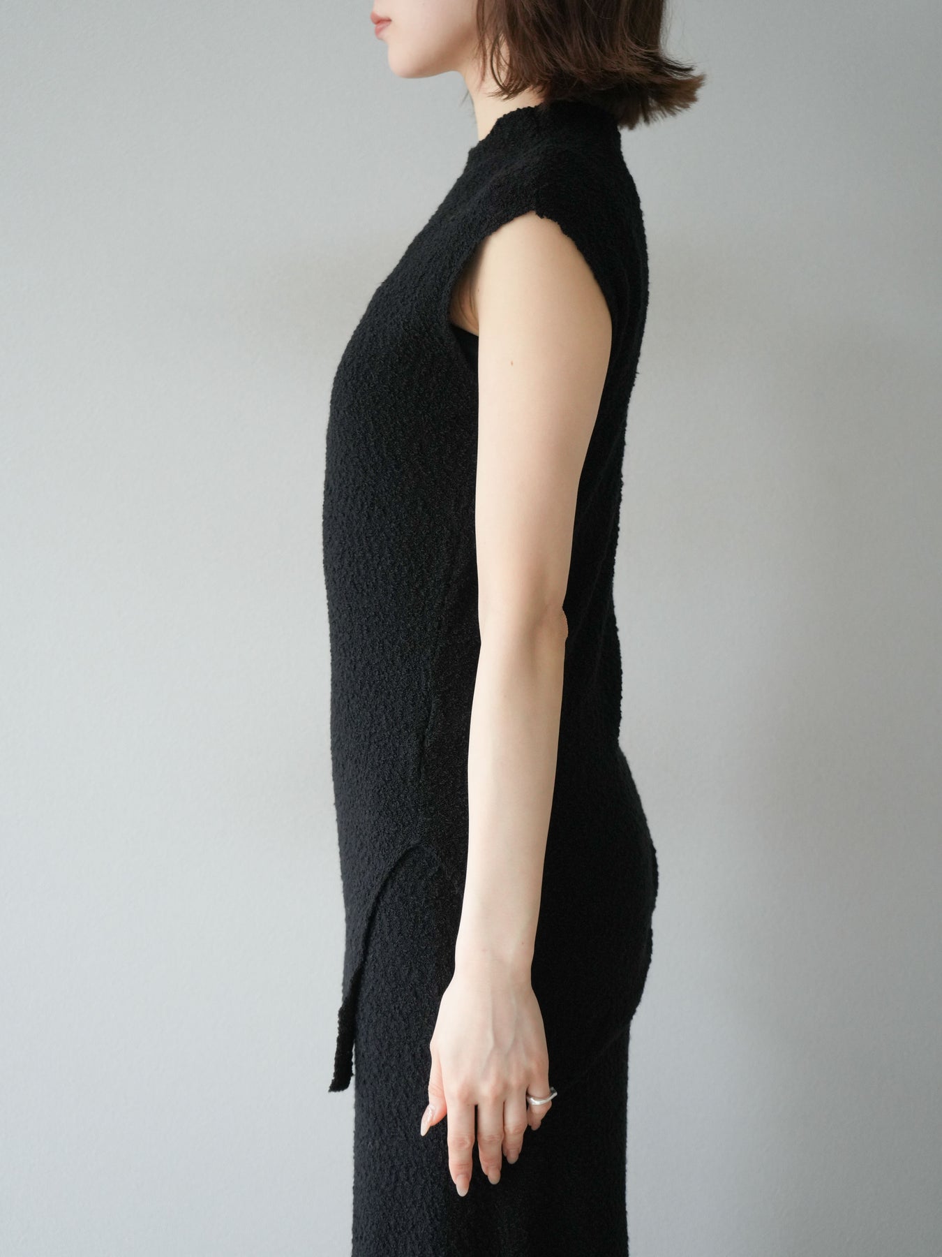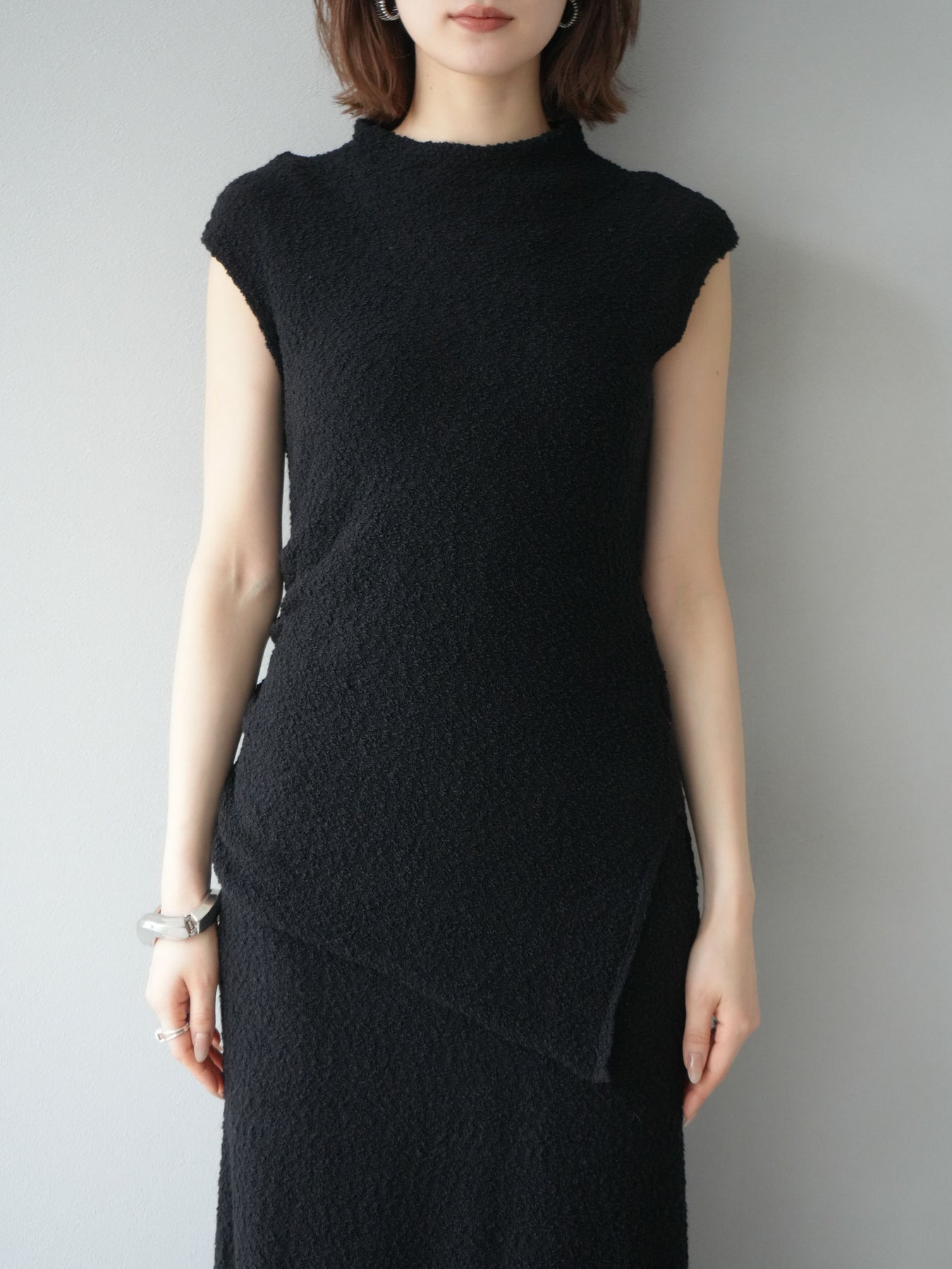 立体感のあるブークレ素材を使用したノースリーブトップス。シンプルなシルエットながら、ウエスト部分に入ったアシンメトリーな切替デザインがスタイルにモードなニュアンスをプラスしています。程よい厚みで体のラインを拾いにくく、着心地も快適。コンパクトな丈感でボトムスとのバランスが取りやすく、パンツにもスカートにも合わせやすい万能さが魅力です。同素材のスカートとセットアップで着用すれば、より洗練されたスタイリングに仕上がります。 ※ボトムス、キャミソール(インナー)以外の商品は一律でインナーは付属していません。