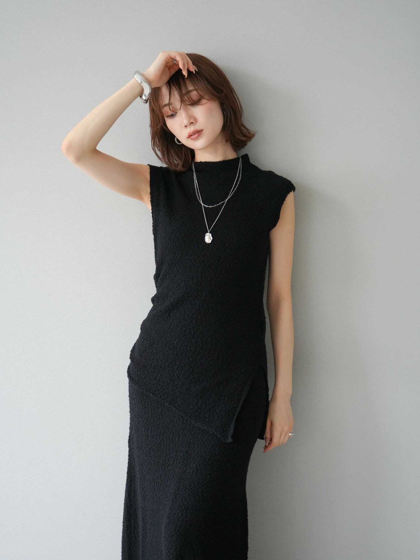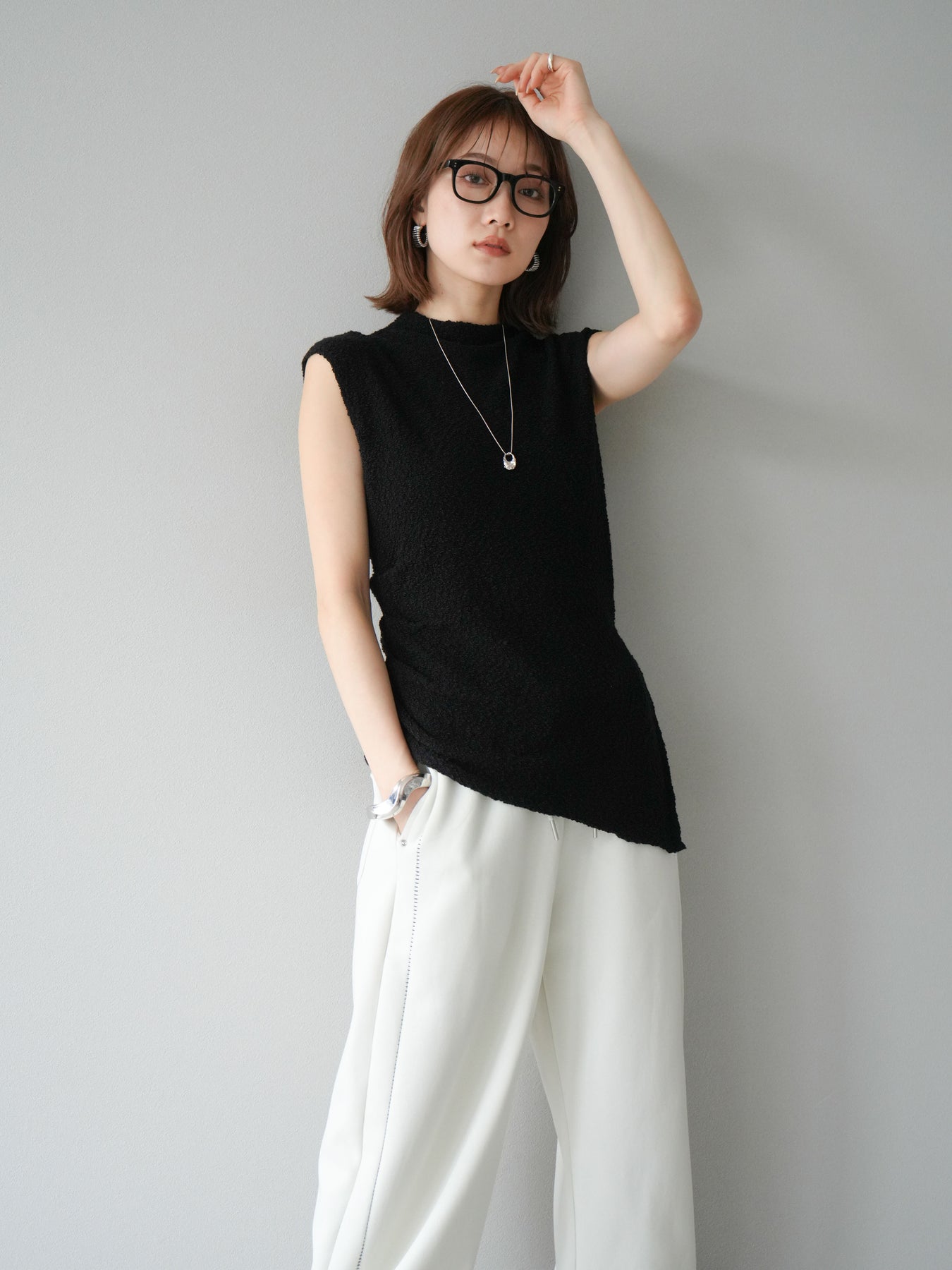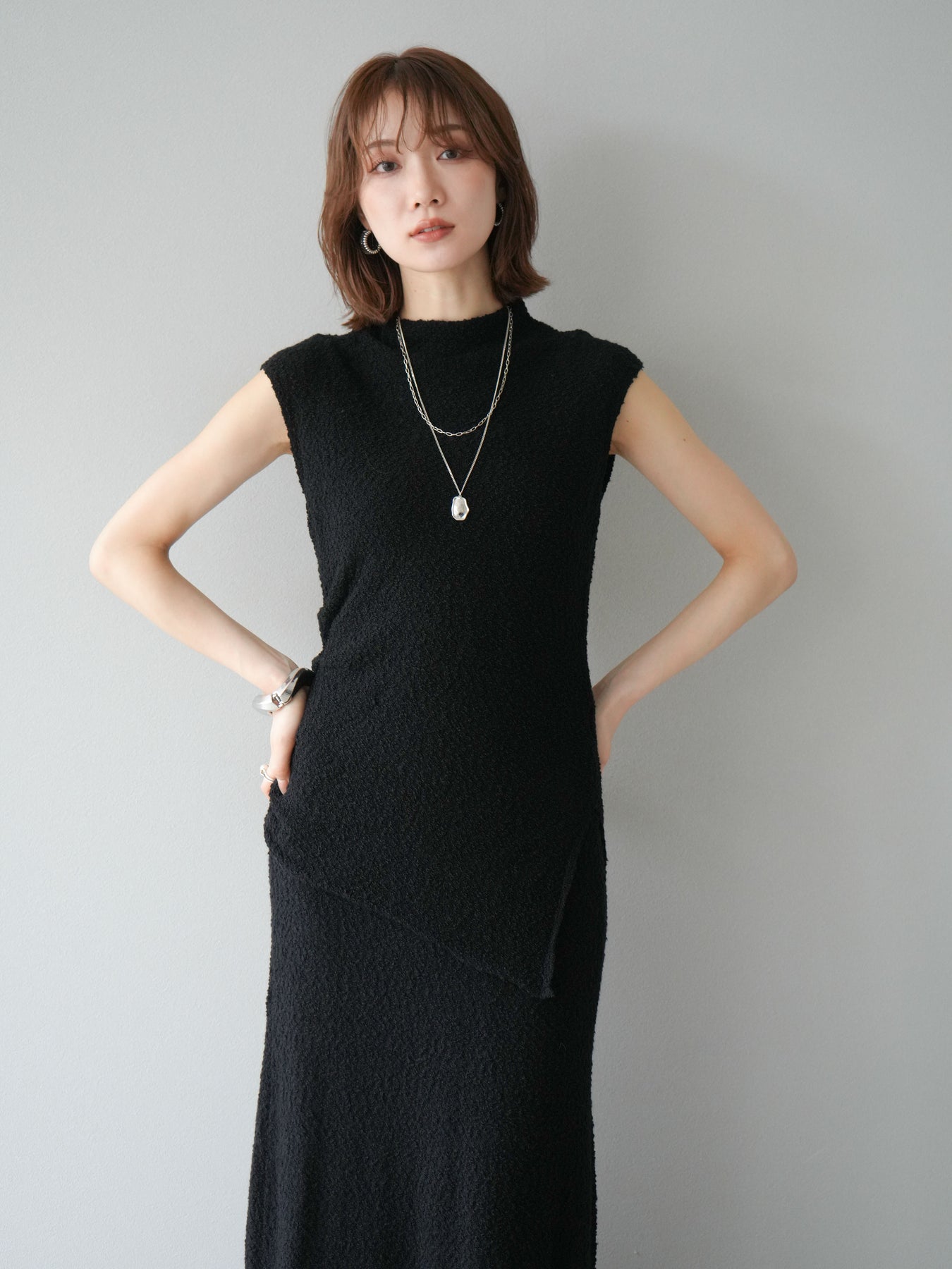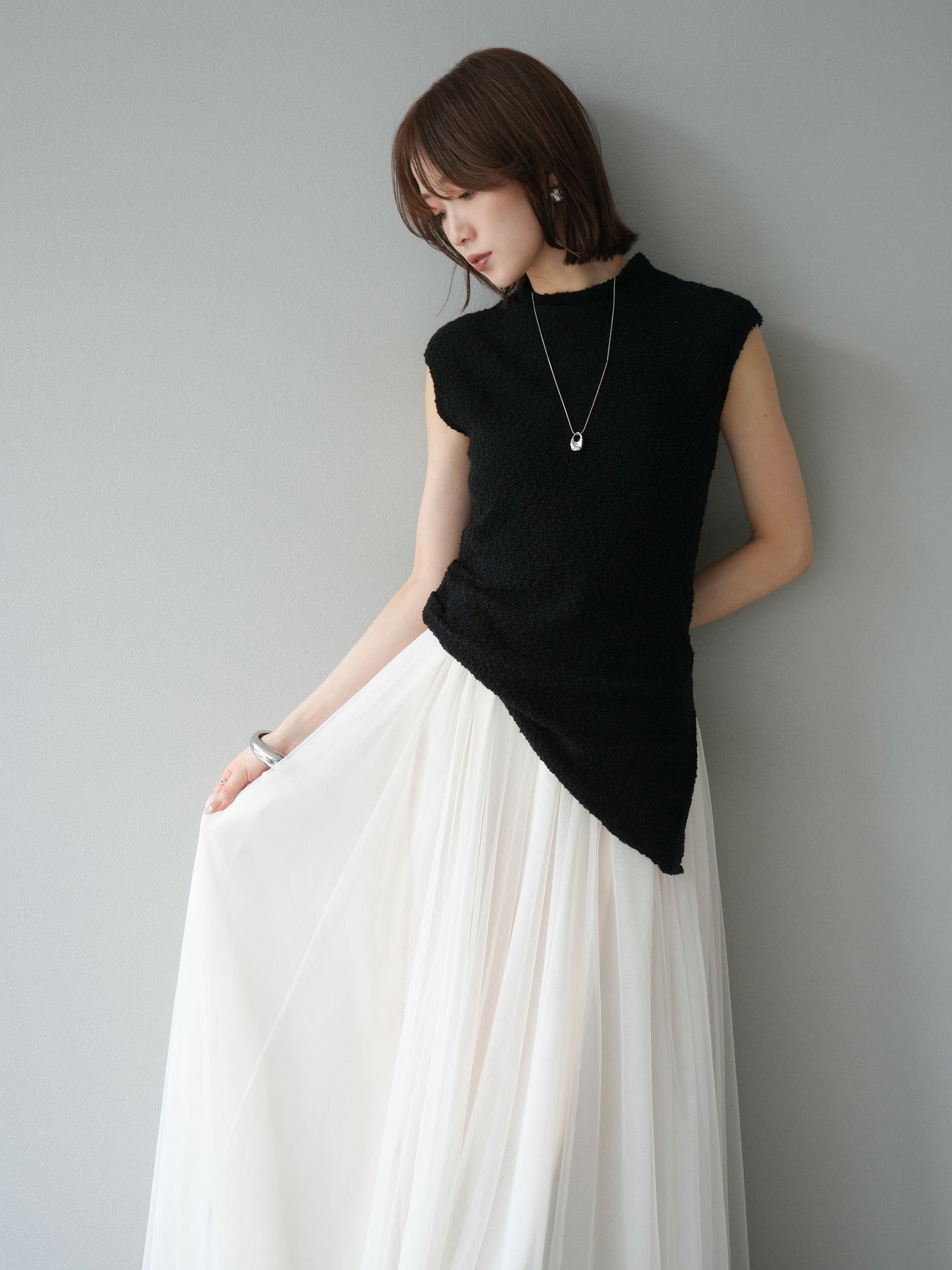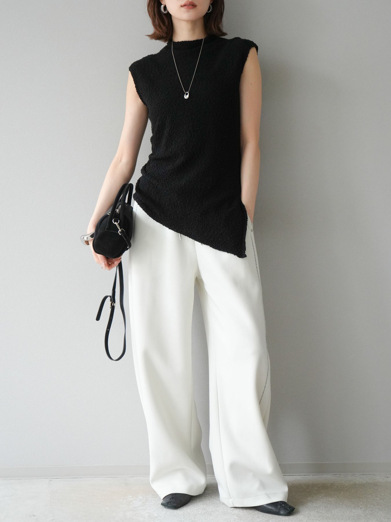 立体感のあるブークレ素材を使用したノースリーブトップス。シンプルなシルエットながら、ウエスト部分に入ったアシンメトリーな切替デザインがスタイルにモードなニュアンスをプラスしています。程よい厚みで体のラインを拾いにくく、着心地も快適。コンパクトな丈感でボトムスとのバランスが取りやすく、パンツにもスカートにも合わせやすい万能さが魅力です。同素材のスカートとセットアップで着用すれば、より洗練されたスタイリングに仕上がります。 ※ボトムス、キャミソール(インナー)以外の商品は一律でインナーは付属していません。