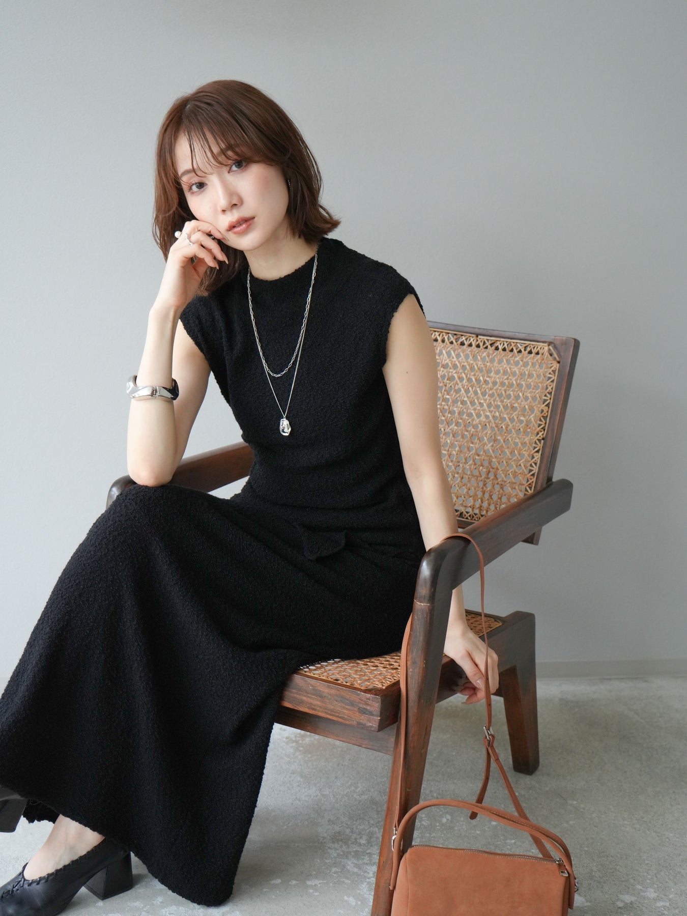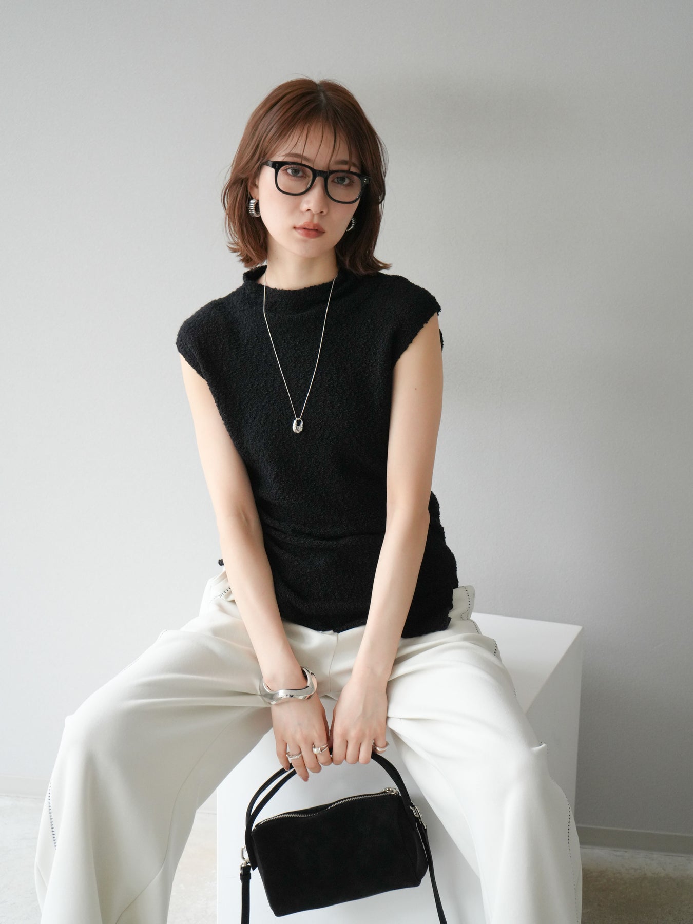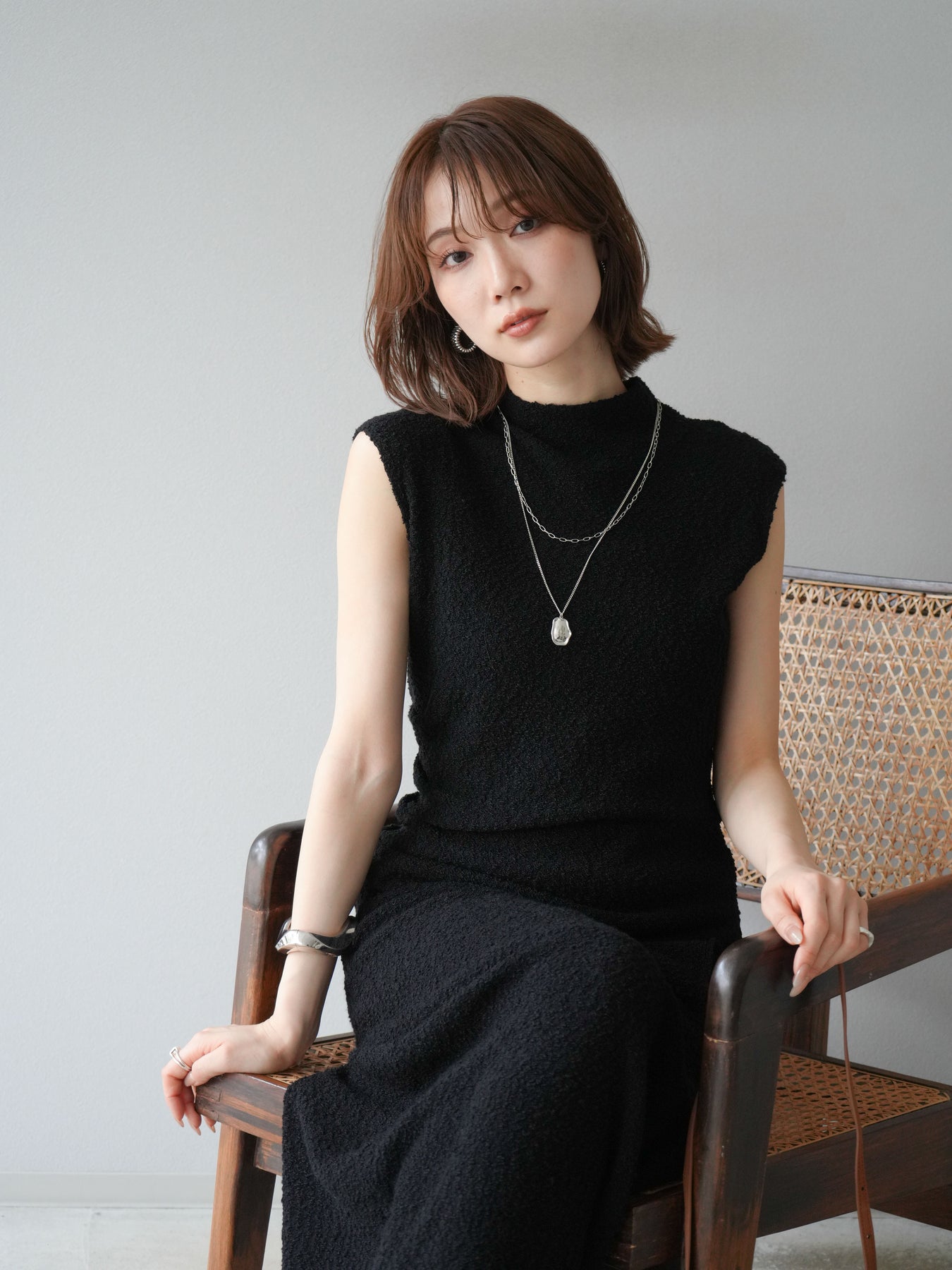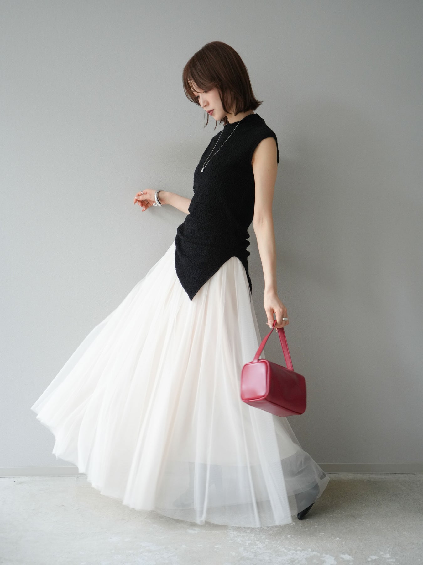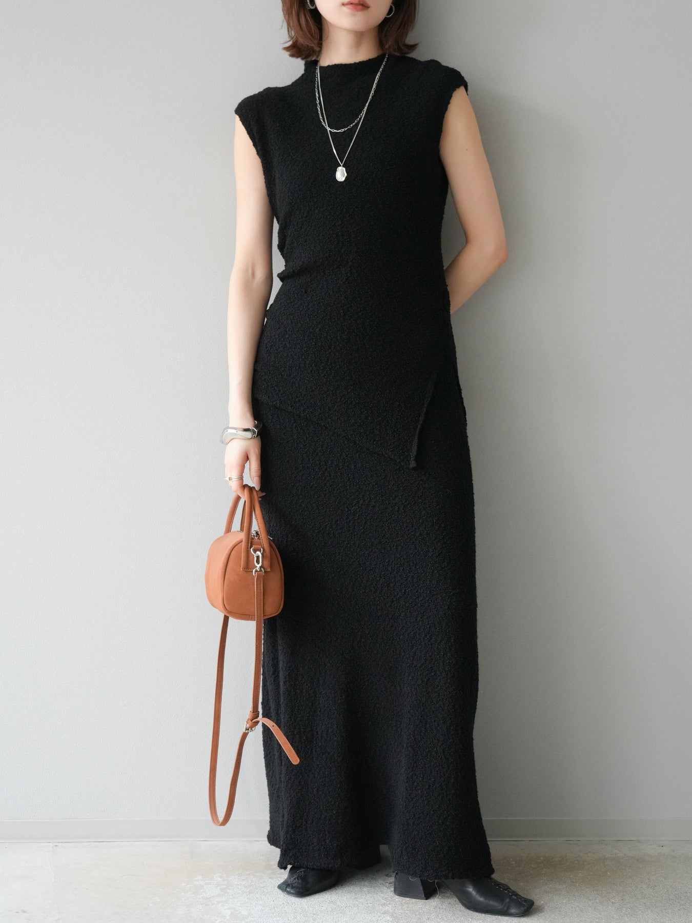 立体感のあるブークレ素材を使用したノースリーブトップス。シンプルなシルエットながら、ウエスト部分に入ったアシンメトリーな切替デザインがスタイルにモードなニュアンスをプラスしています。程よい厚みで体のラインを拾いにくく、着心地も快適。コンパクトな丈感でボトムスとのバランスが取りやすく、パンツにもスカートにも合わせやすい万能さが魅力です。同素材のスカートとセットアップで着用すれば、より洗練されたスタイリングに仕上がります。 ※ボトムス、キャミソール(インナー)以外の商品は一律でインナーは付属していません。