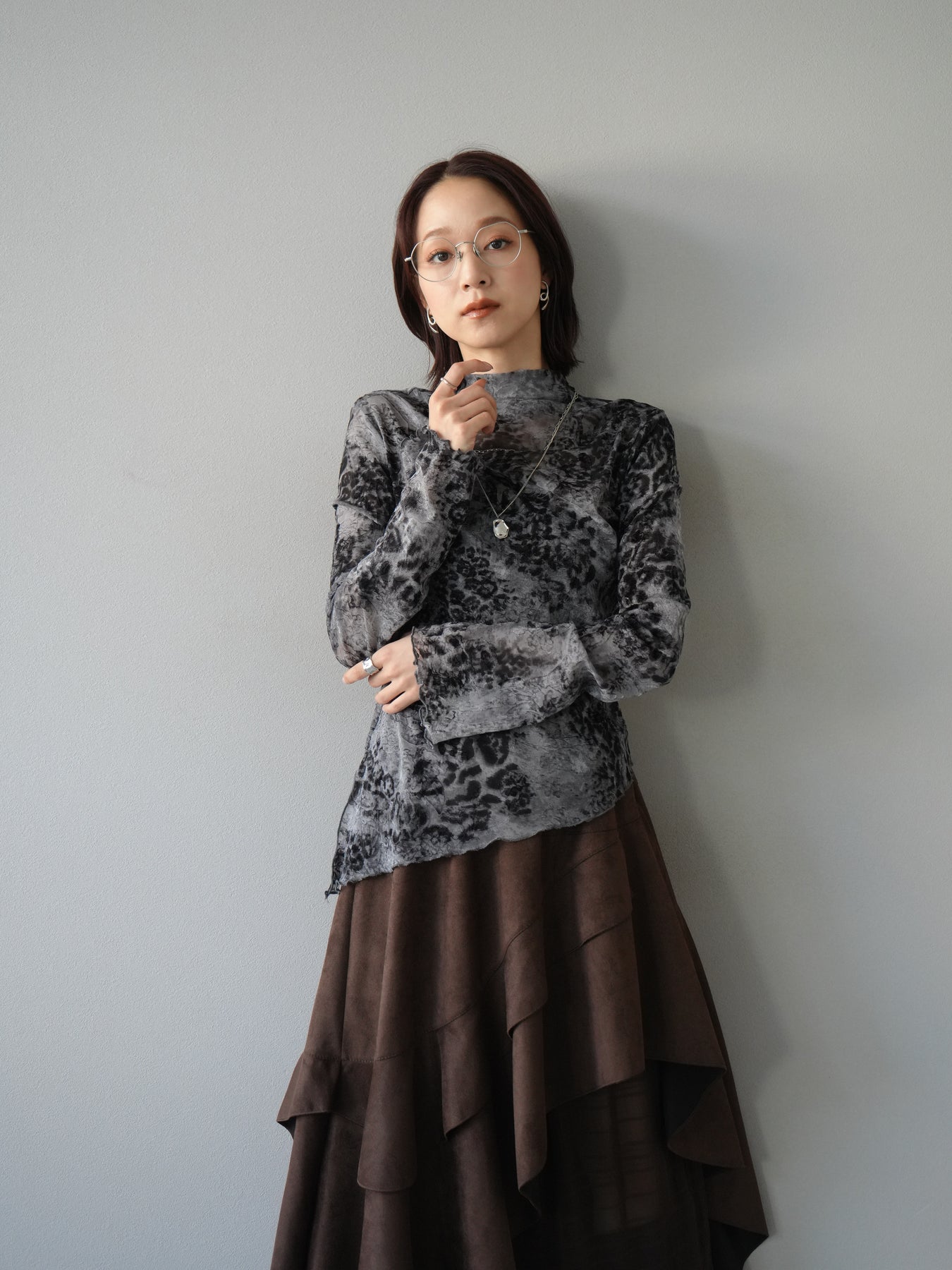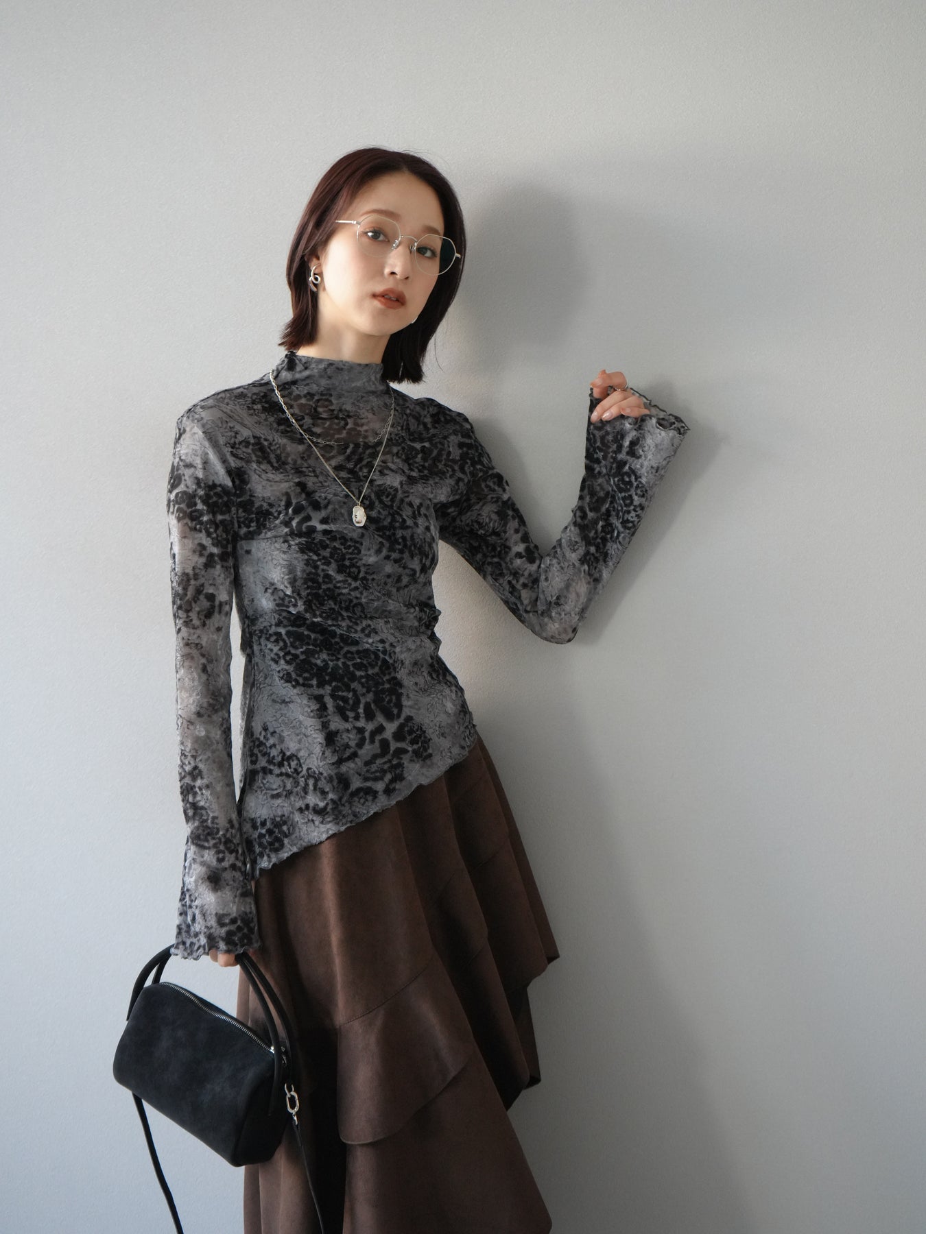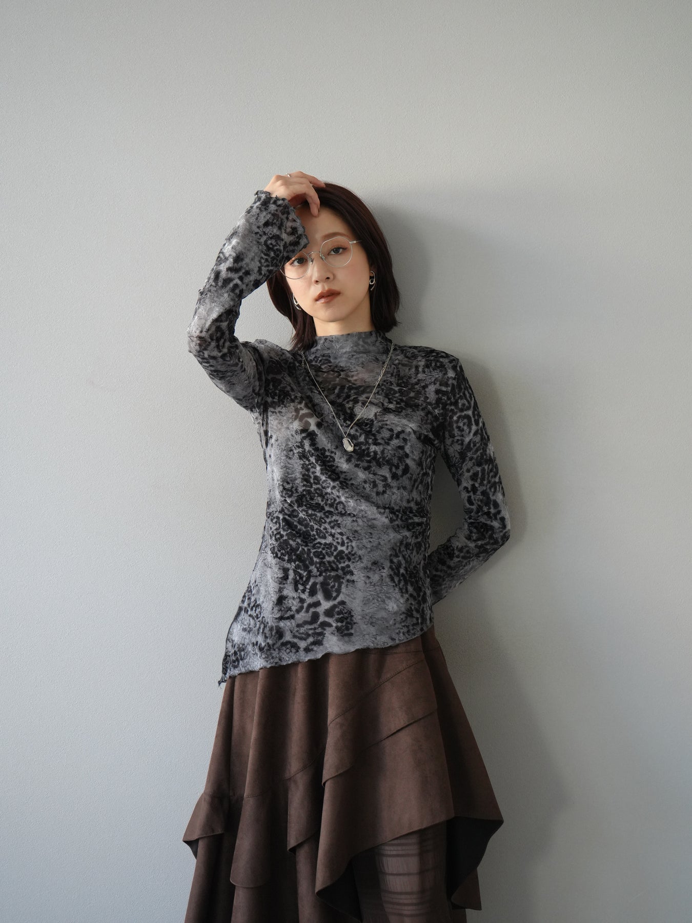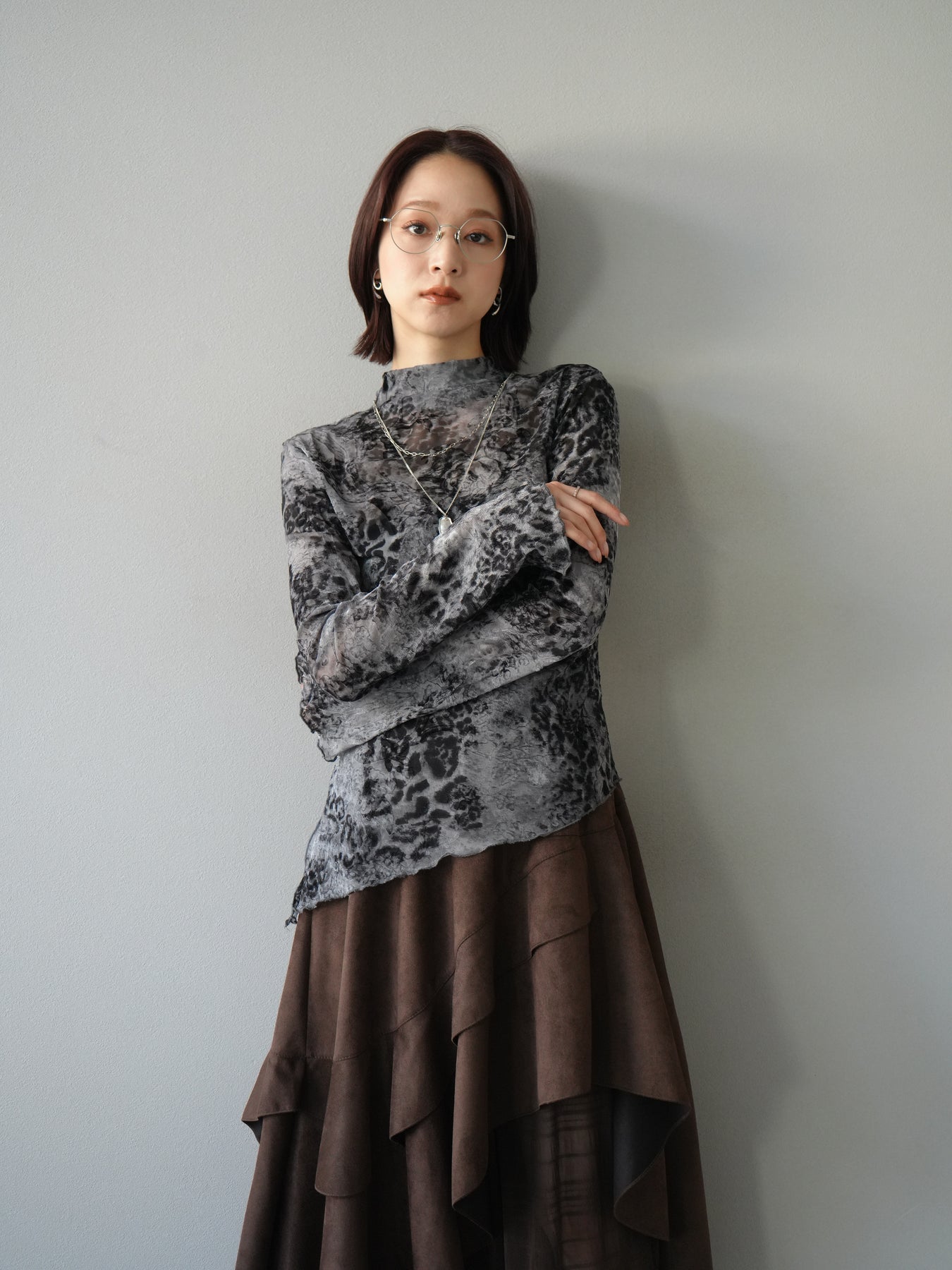 [予約]アシンメトリーアニマル柄シアートップス/グレー