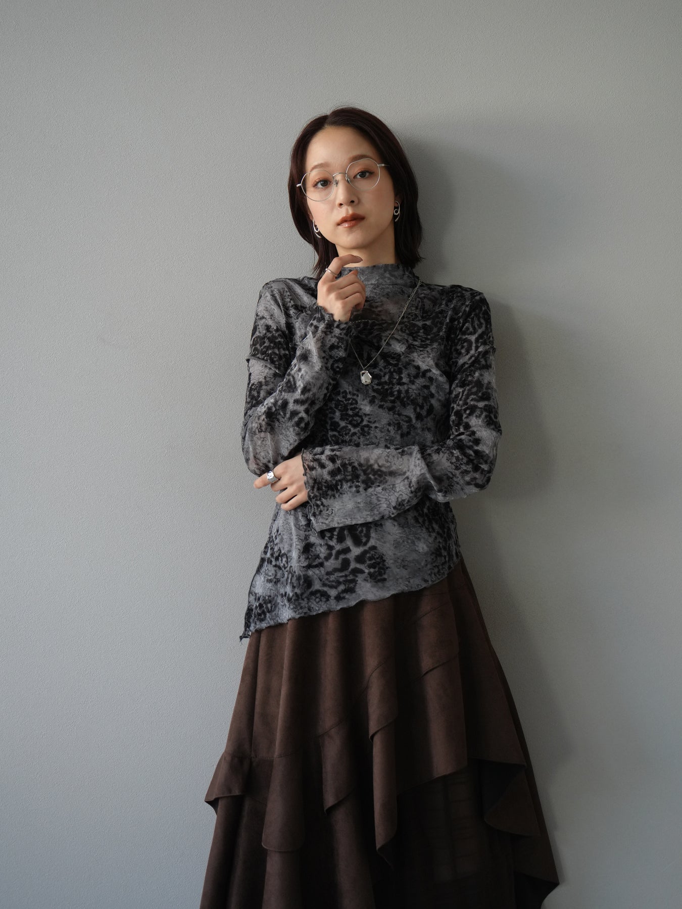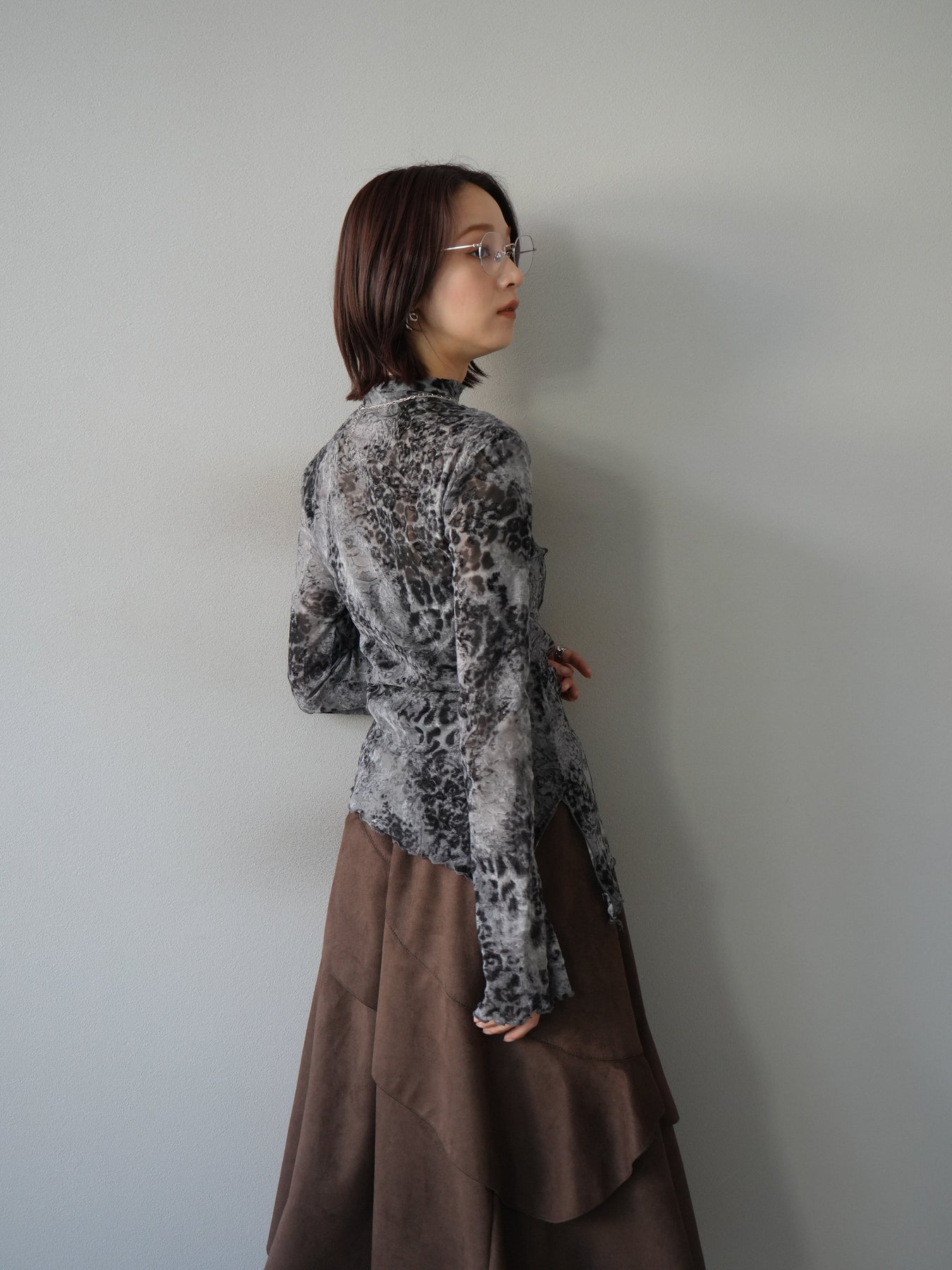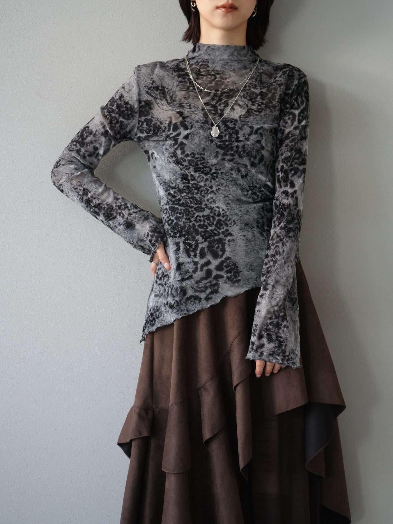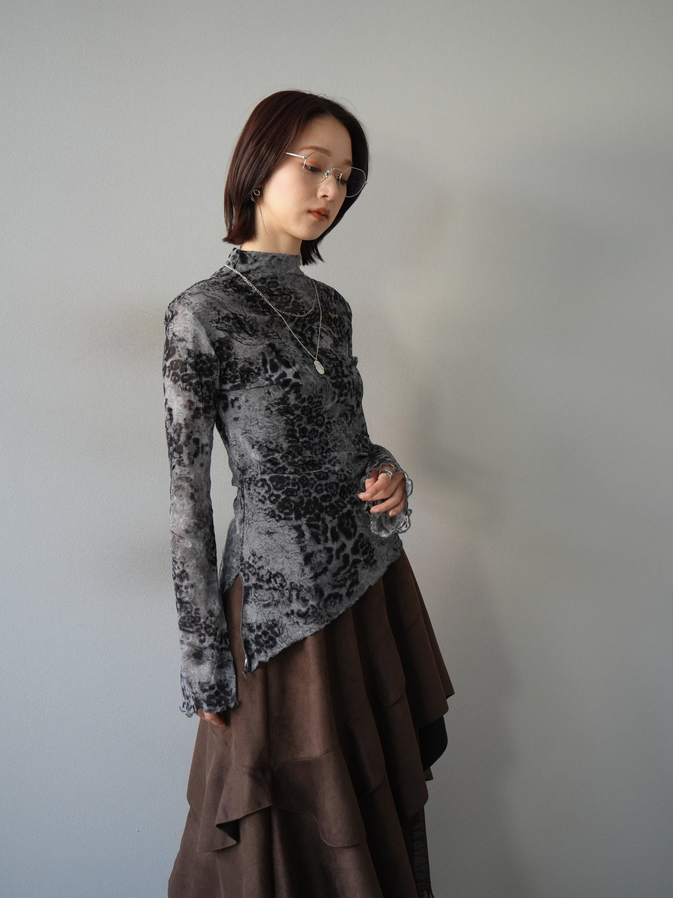 [予約]アシンメトリーアニマル柄シアートップス/グレー