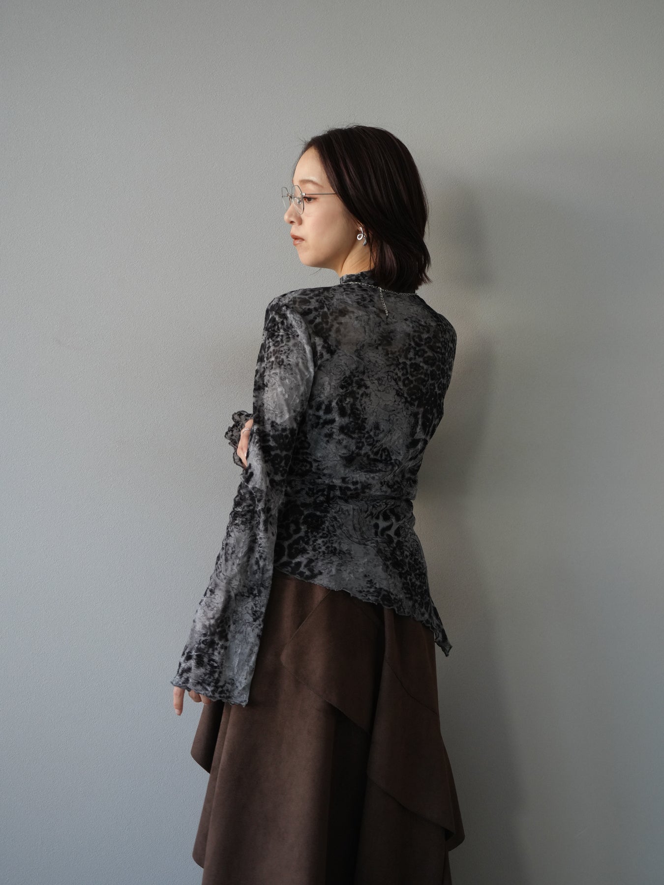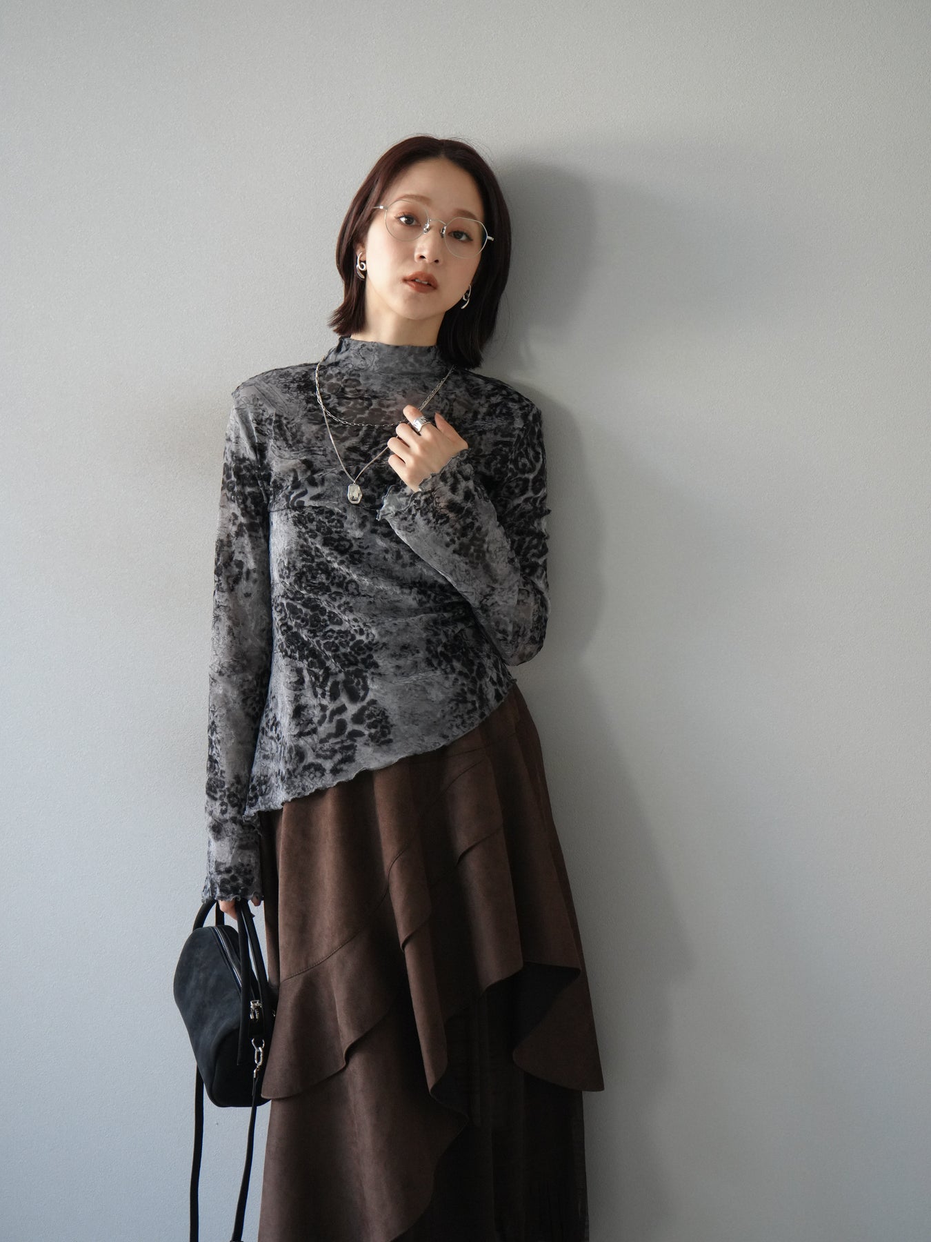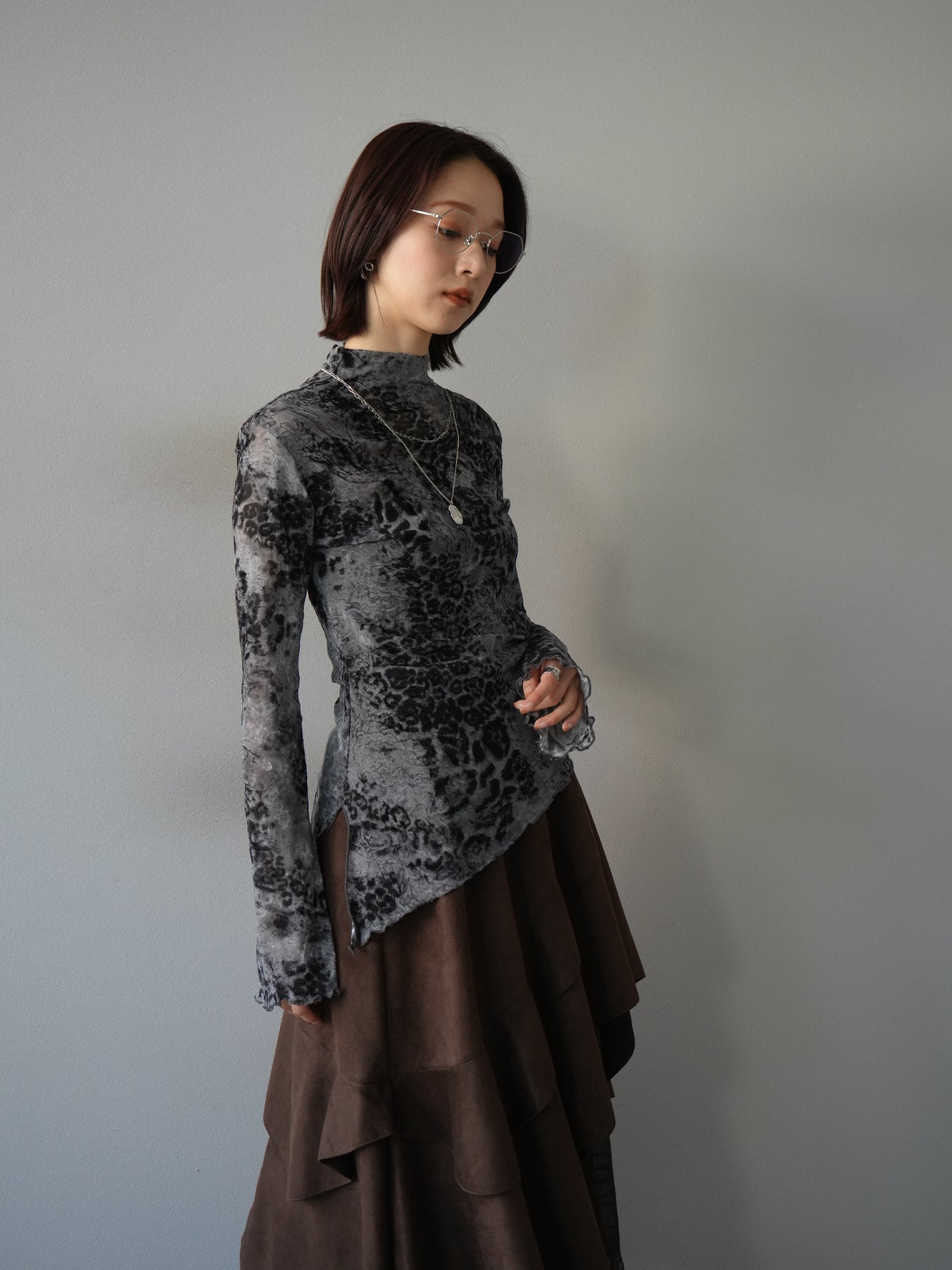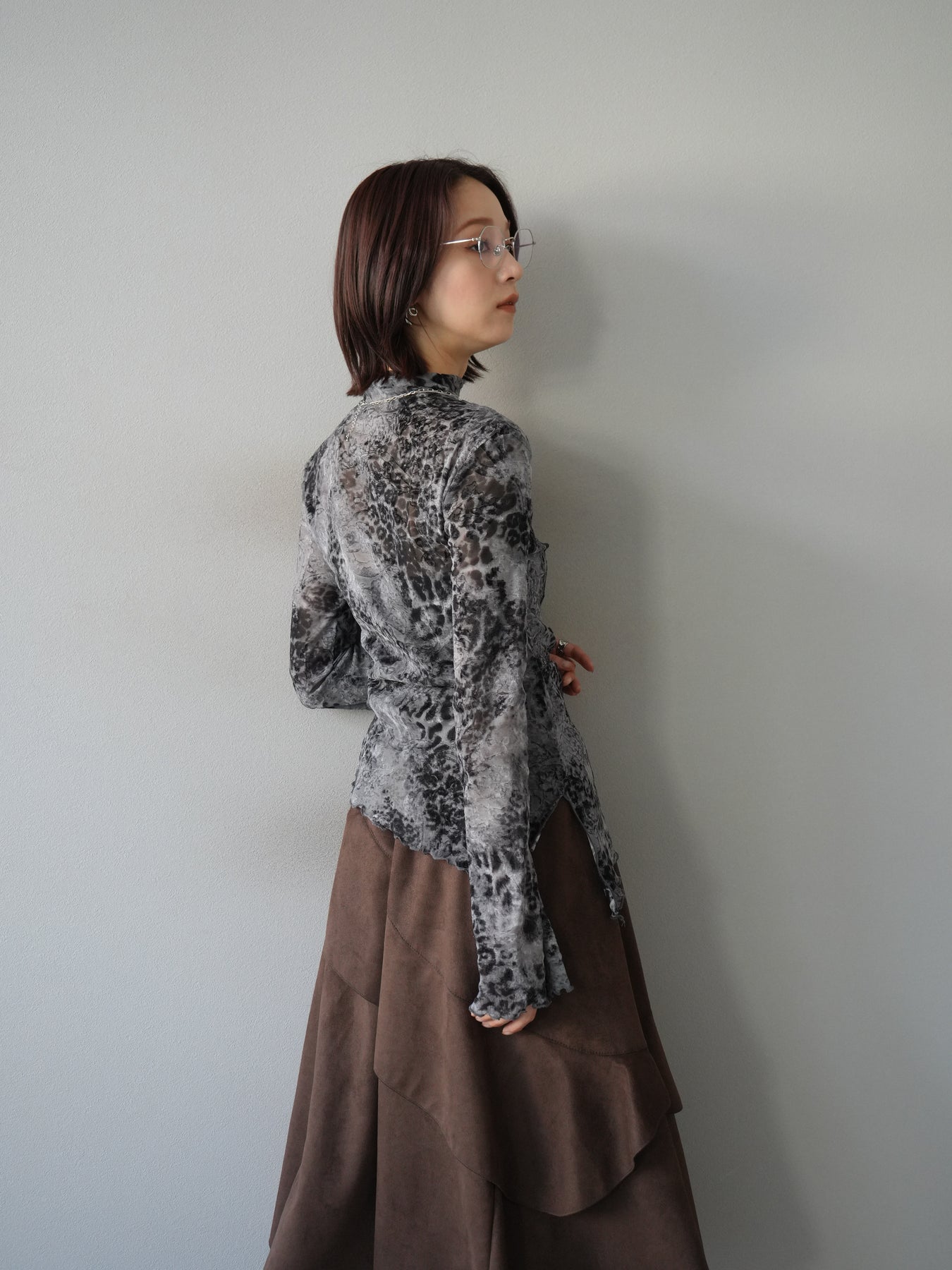 [予約]アシンメトリーアニマル柄シアートップス/グレー
