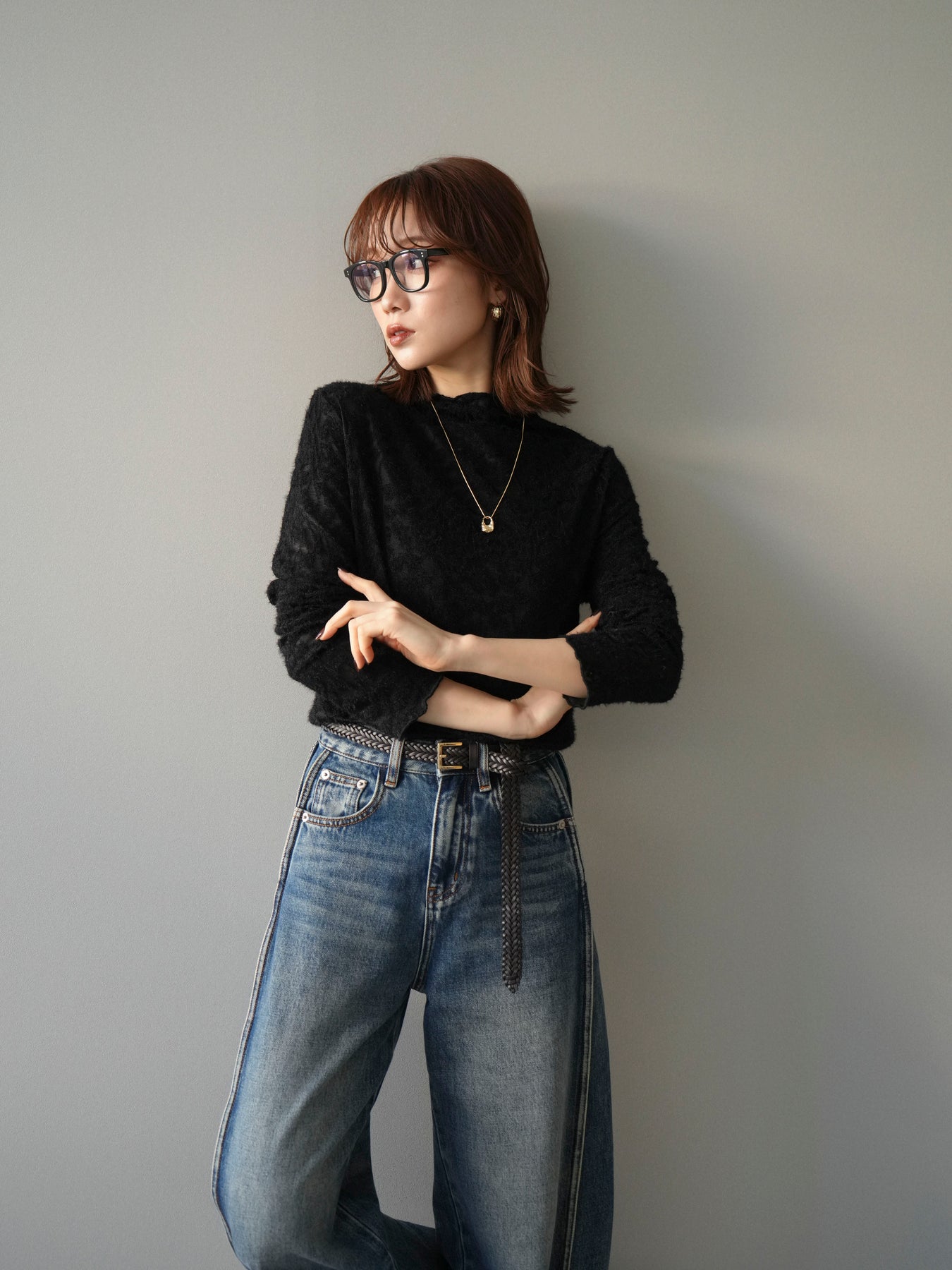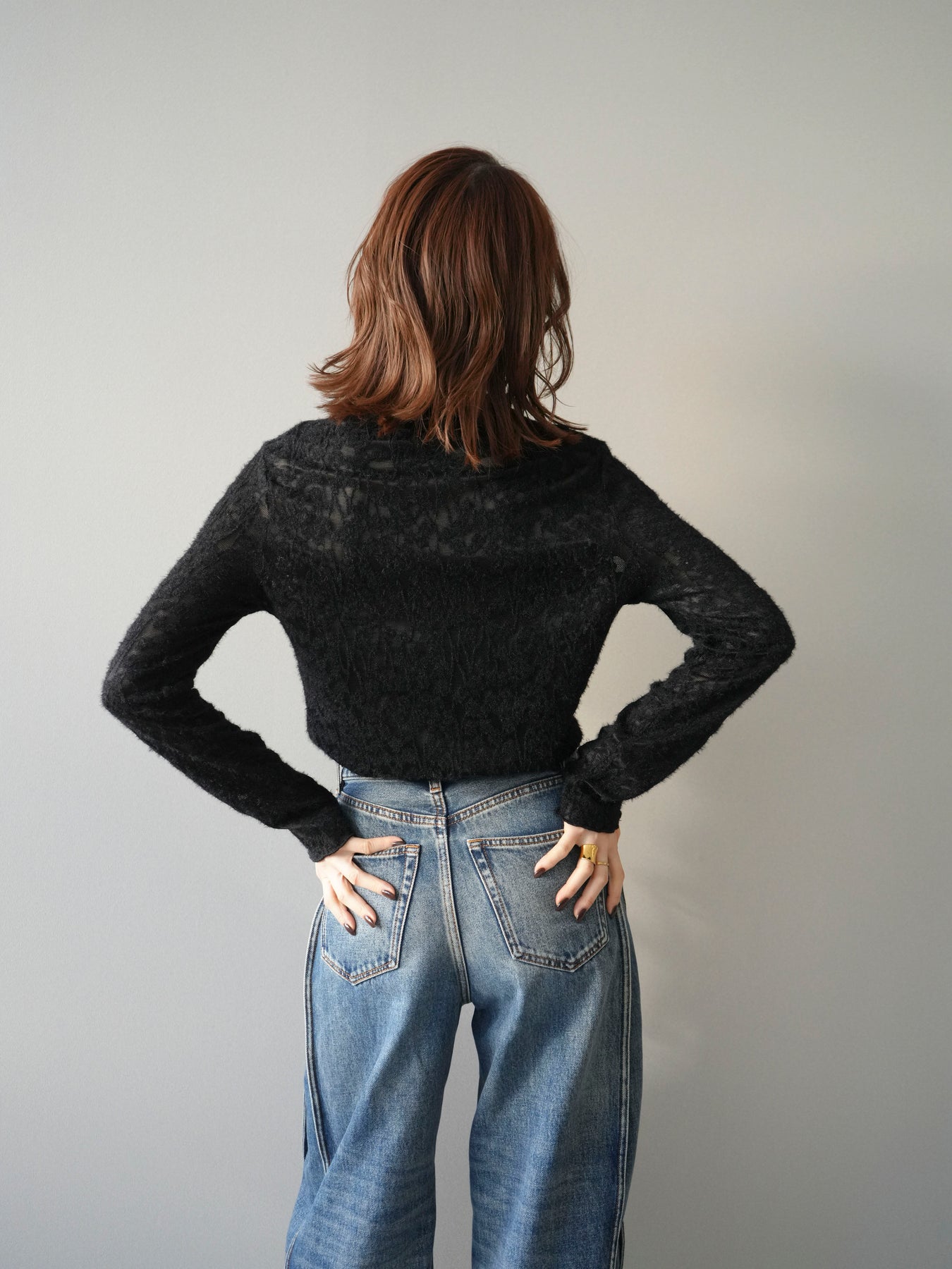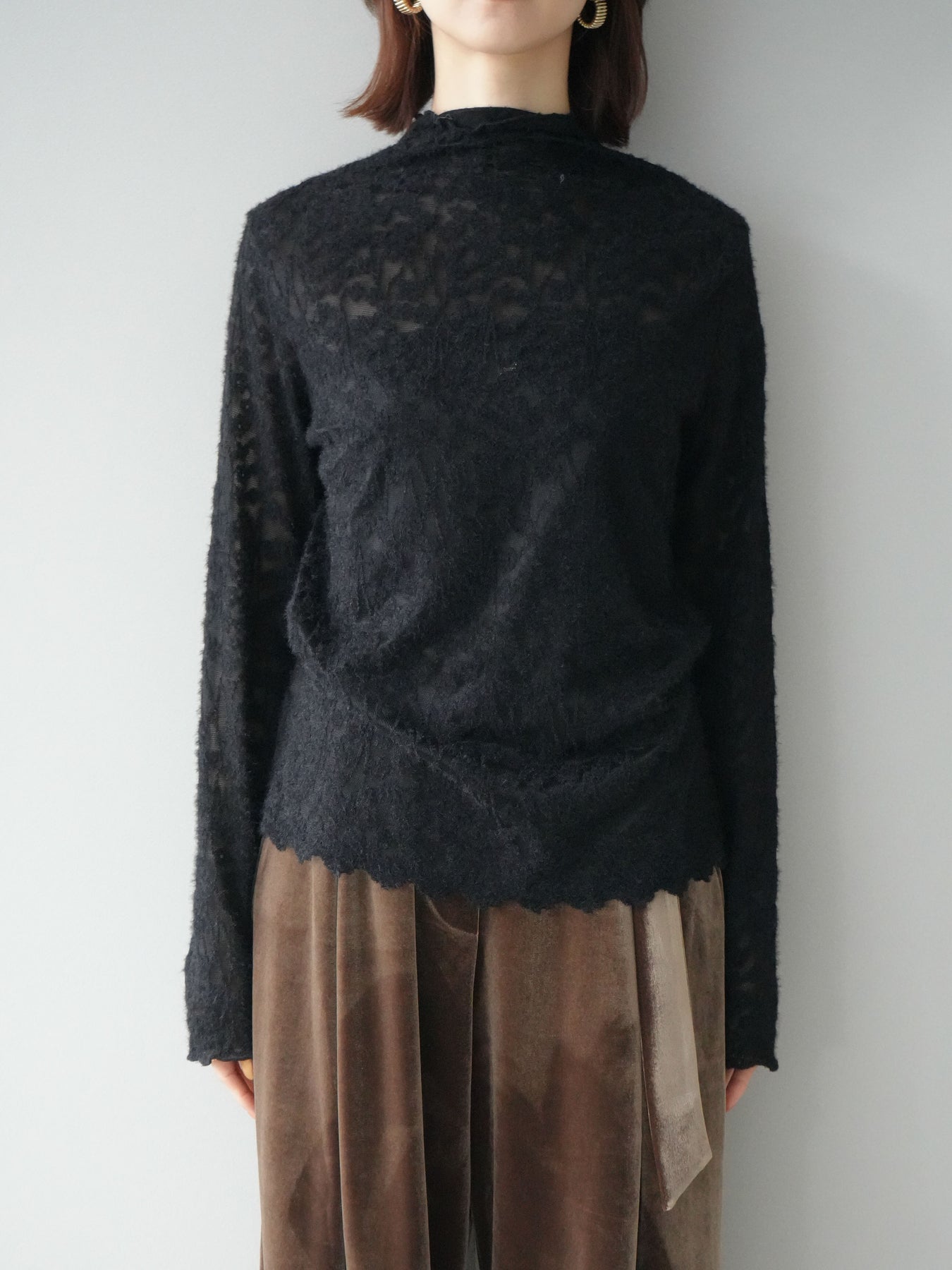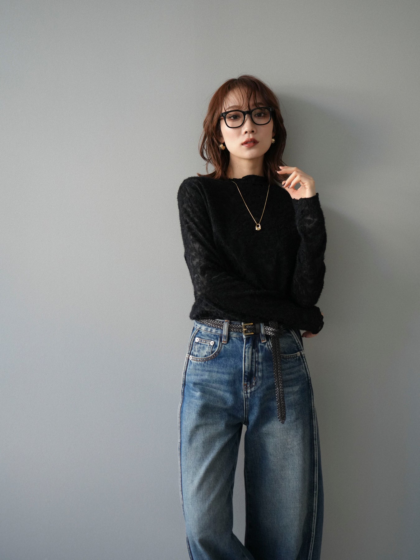 繊細なレースに起毛加工を施した、シーズンライクなプチネックトップス。 程よい透け感と柔らかな起毛の質感が、上品さとあたたかみを兼ね備えています。 ネックと裾、袖口のメローデザインがさりげないアクセントとなり、女性らしい印象に。 インナーとしてはもちろん、キャミソールやワンピースとのレイヤードにも活躍します。 1枚あると着こなしの幅が広がる、万能なレーストップスです。 ※ボトムス、キャミソール(インナー)以外の商品は一律でインナーは付属していません。