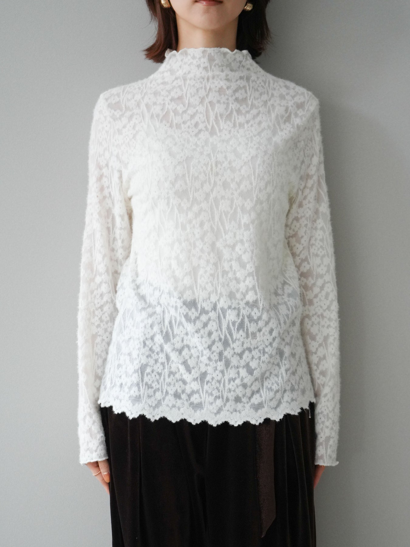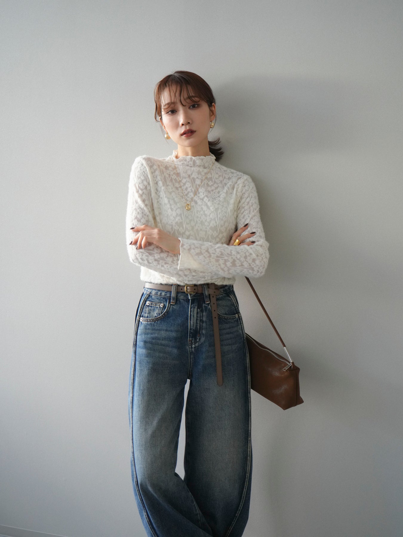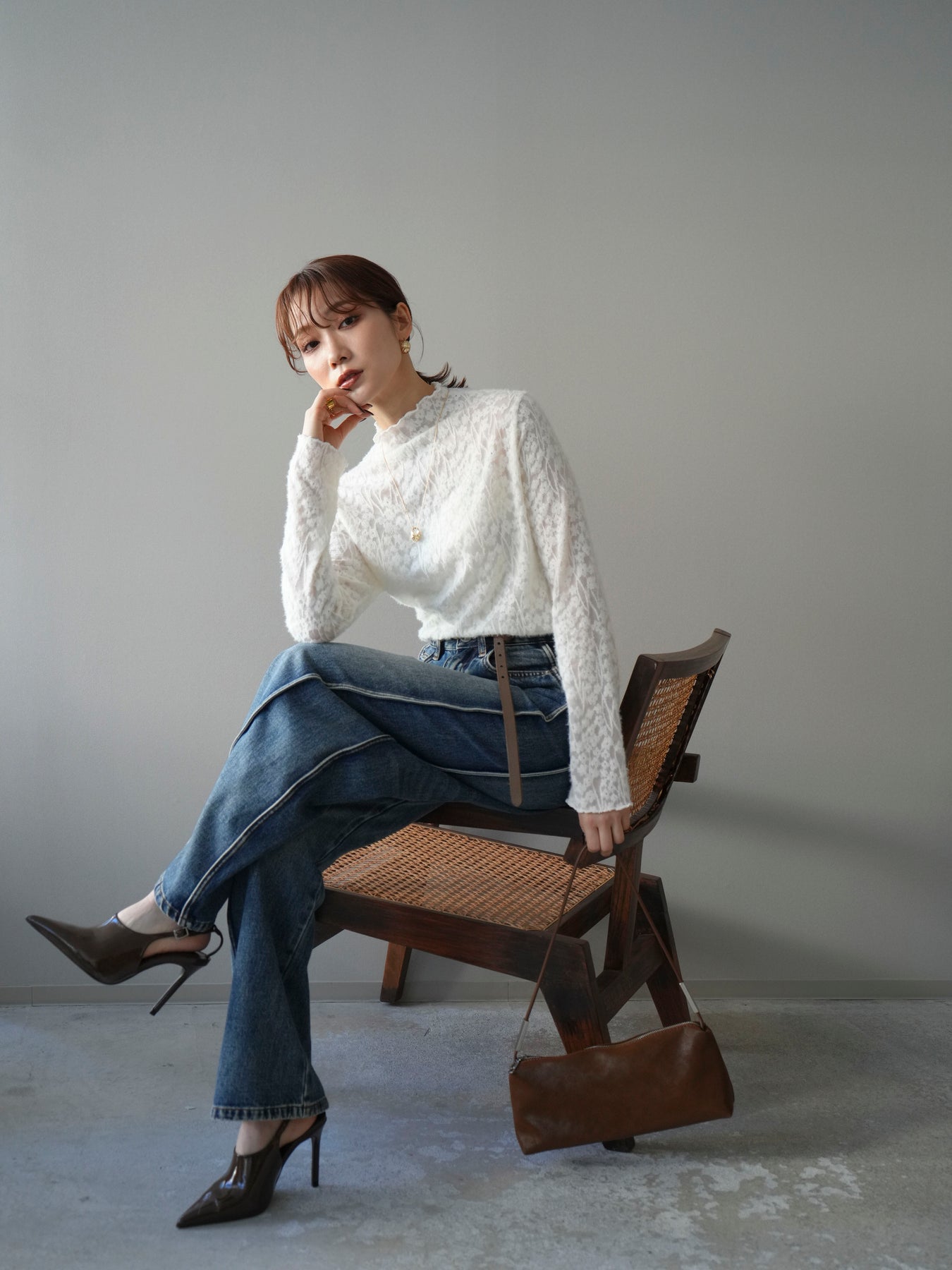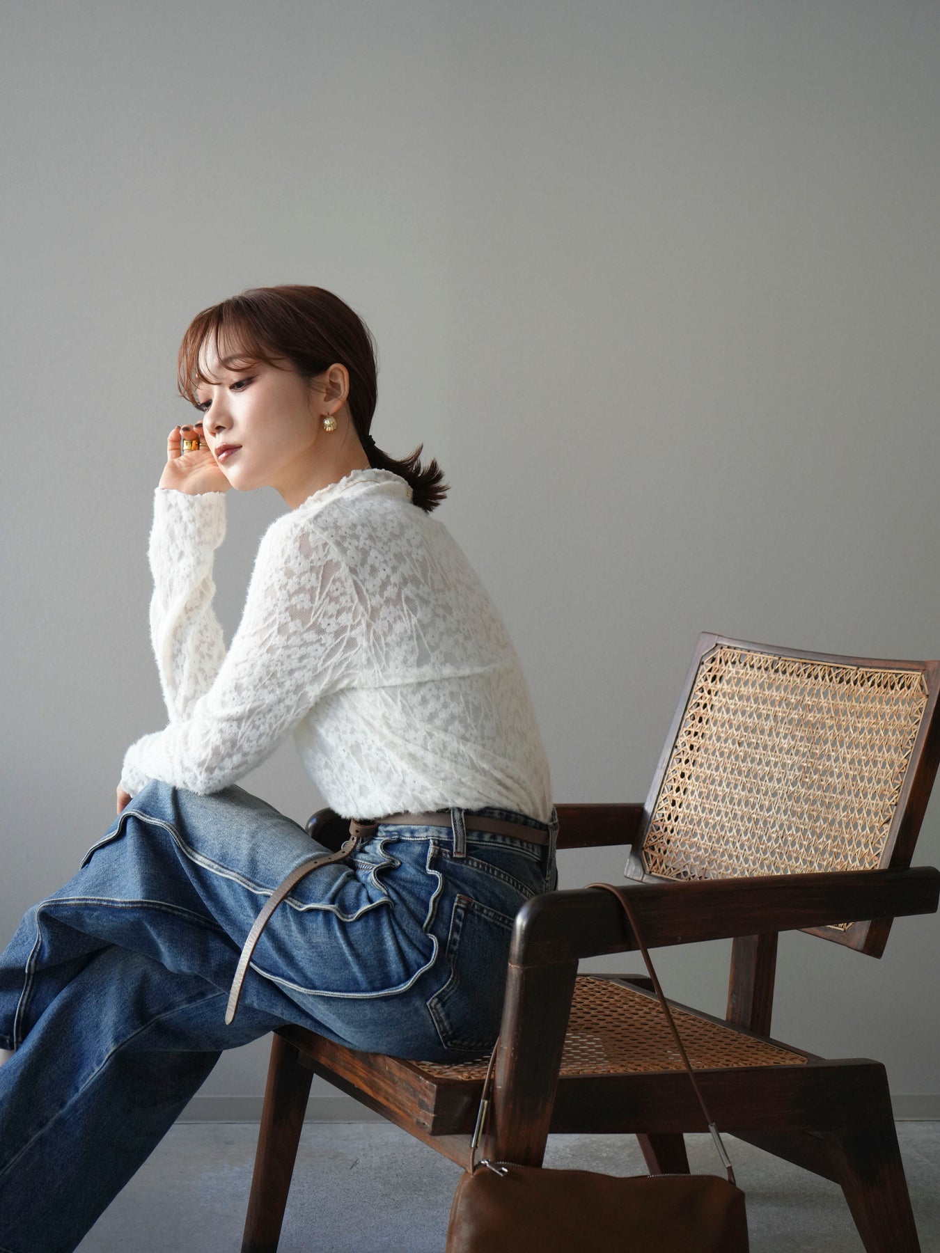 繊細なレースに起毛加工を施した、シーズンライクなプチネックトップス。 程よい透け感と柔らかな起毛の質感が、上品さとあたたかみを兼ね備えています。 ネックと裾、袖口のメローデザインがさりげないアクセントとなり、女性らしい印象に。 インナーとしてはもちろん、キャミソールやワンピースとのレイヤードにも活躍します。 1枚あると着こなしの幅が広がる、万能なレーストップスです。 ※ボトムス、キャミソール(インナー)以外の商品は一律でインナーは付属していません。