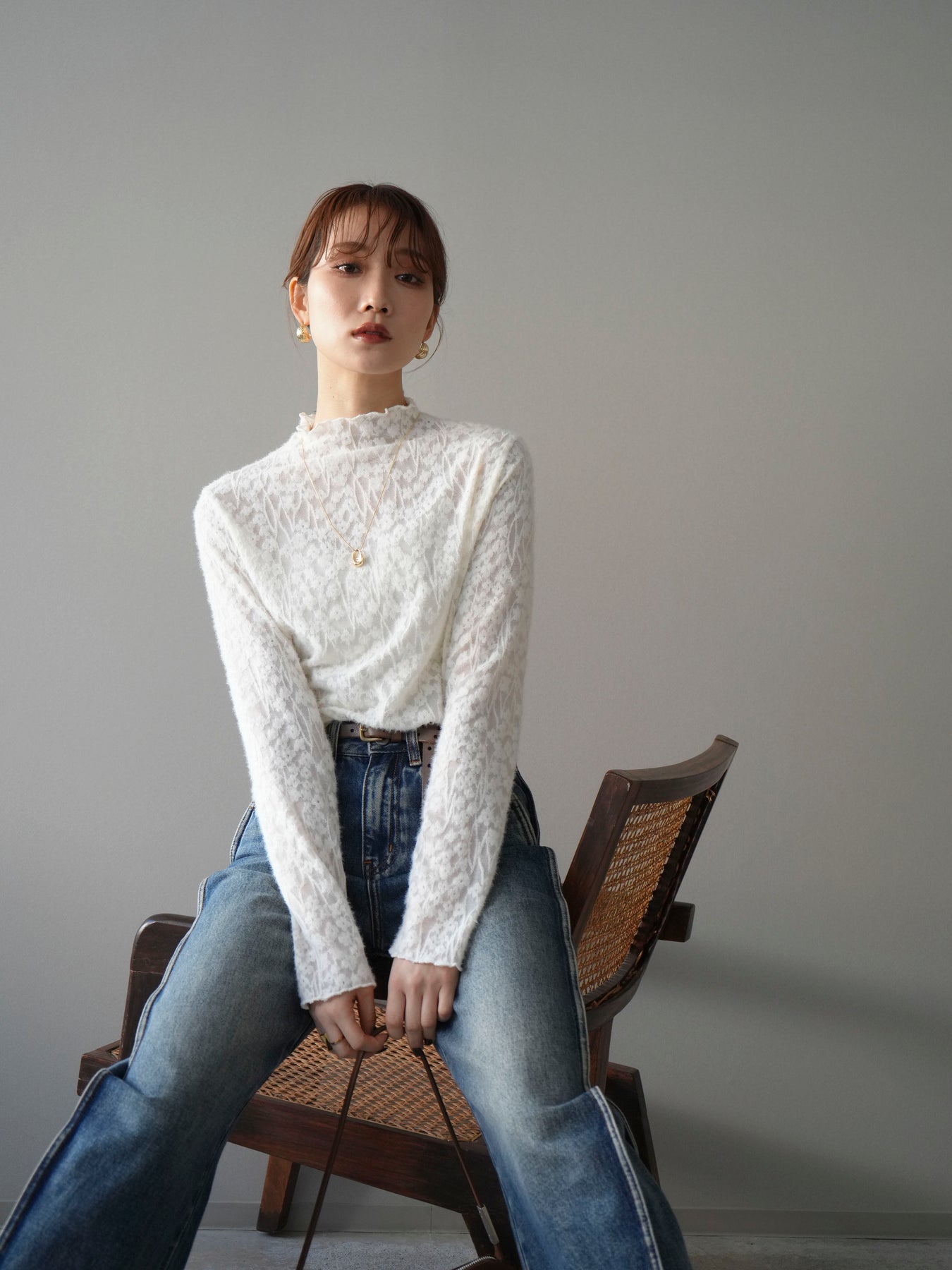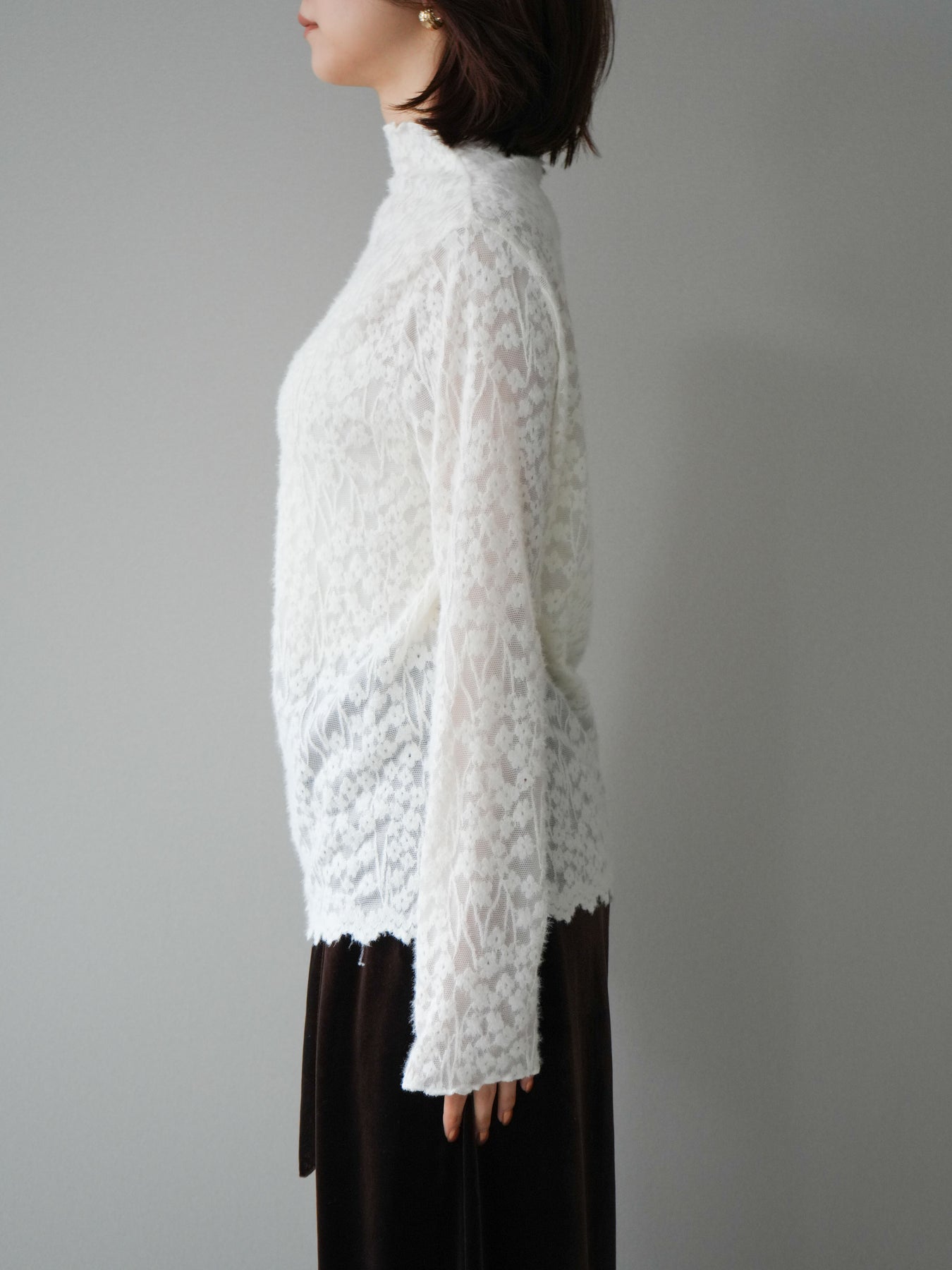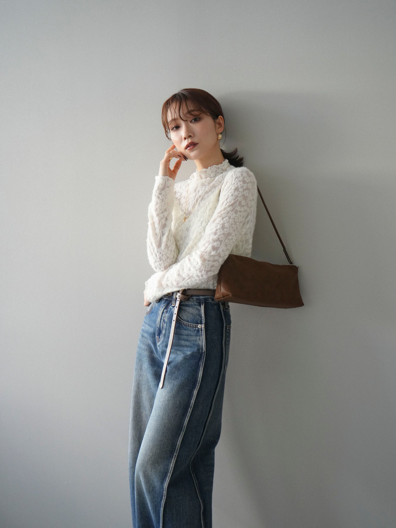 繊細なレースに起毛加工を施した、シーズンライクなプチネックトップス。 程よい透け感と柔らかな起毛の質感が、上品さとあたたかみを兼ね備えています。 ネックと裾、袖口のメローデザインがさりげないアクセントとなり、女性らしい印象に。 インナーとしてはもちろん、キャミソールやワンピースとのレイヤードにも活躍します。 1枚あると着こなしの幅が広がる、万能なレーストップスです。 ※ボトムス、キャミソール(インナー)以外の商品は一律でインナーは付属していません。