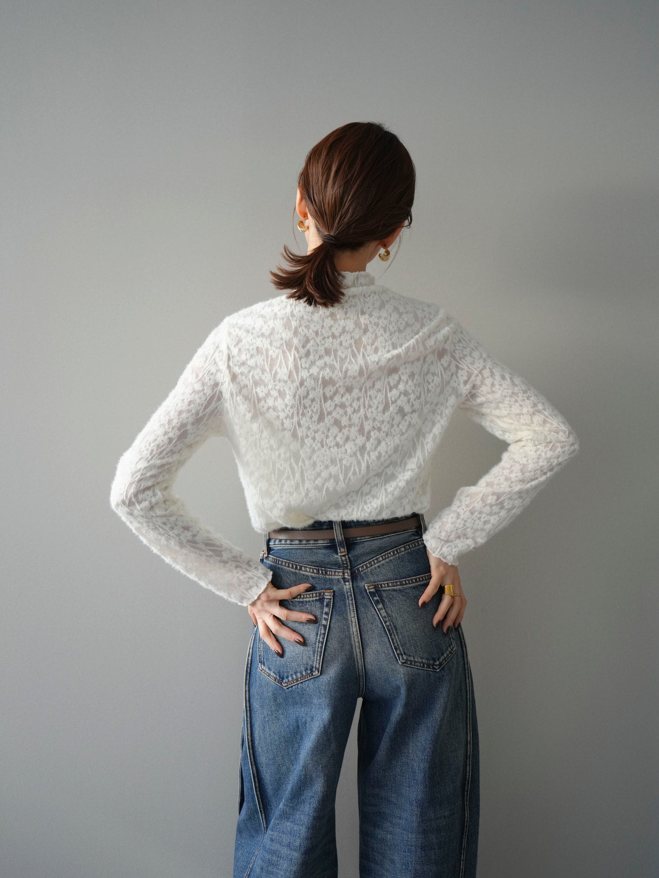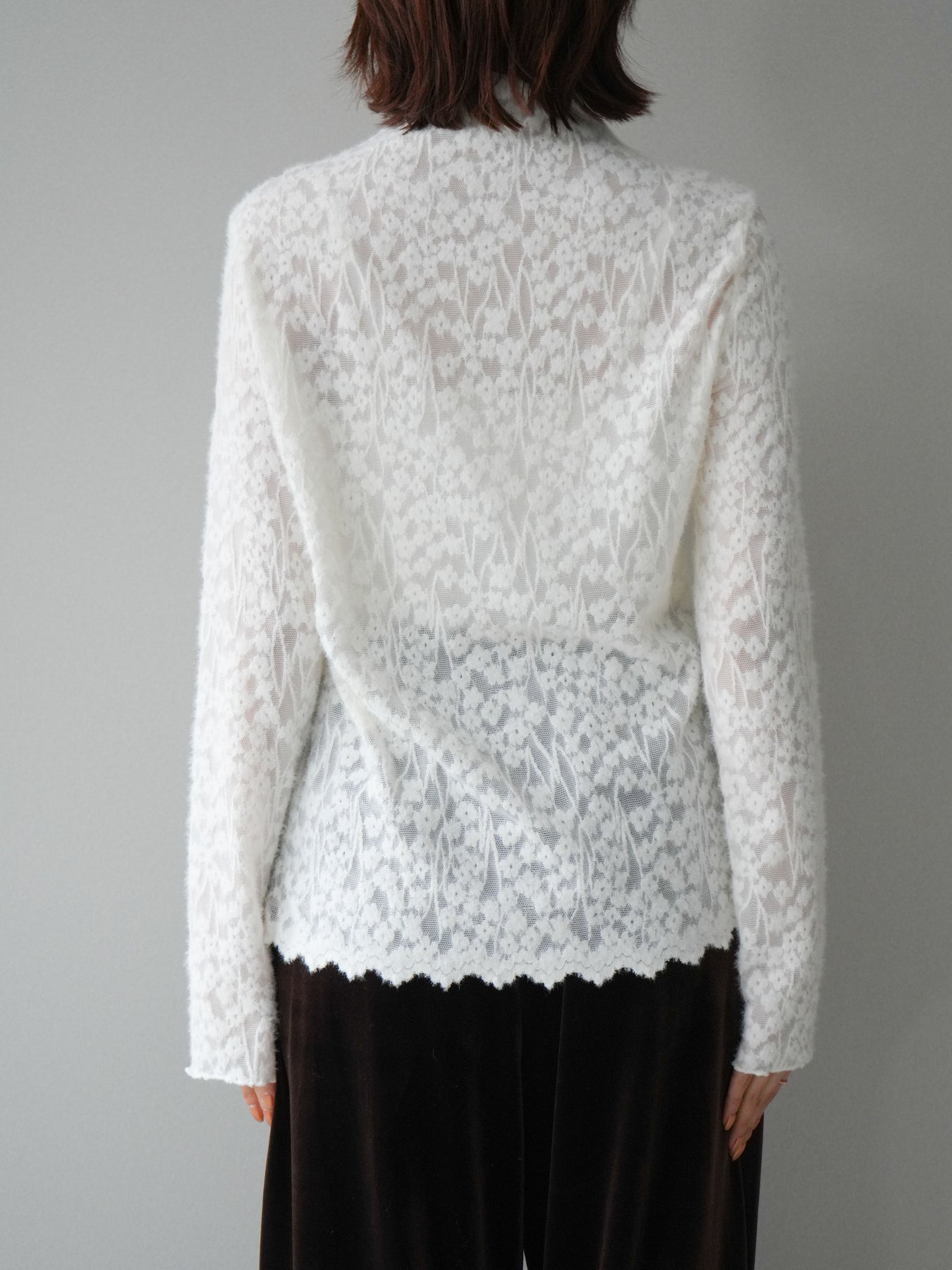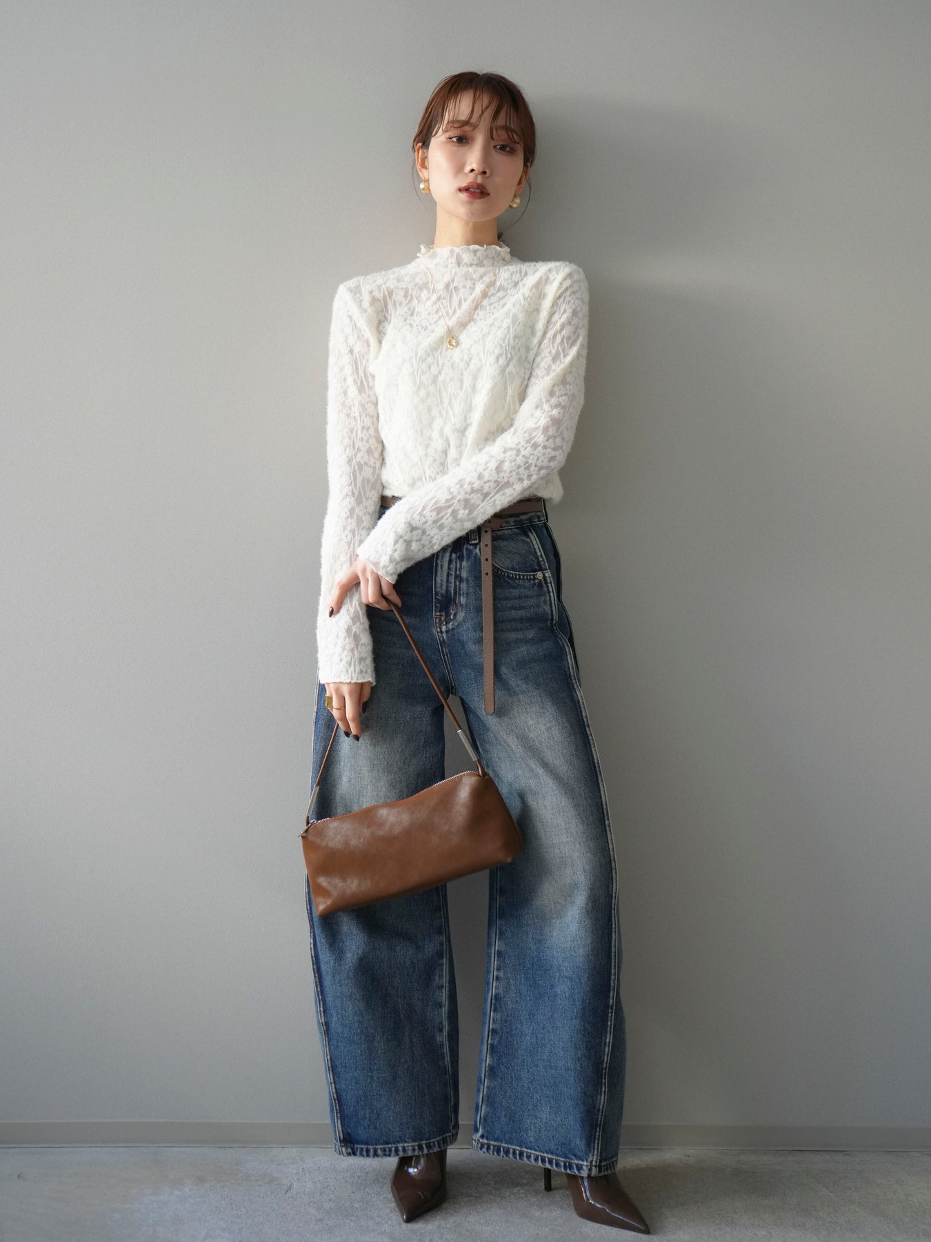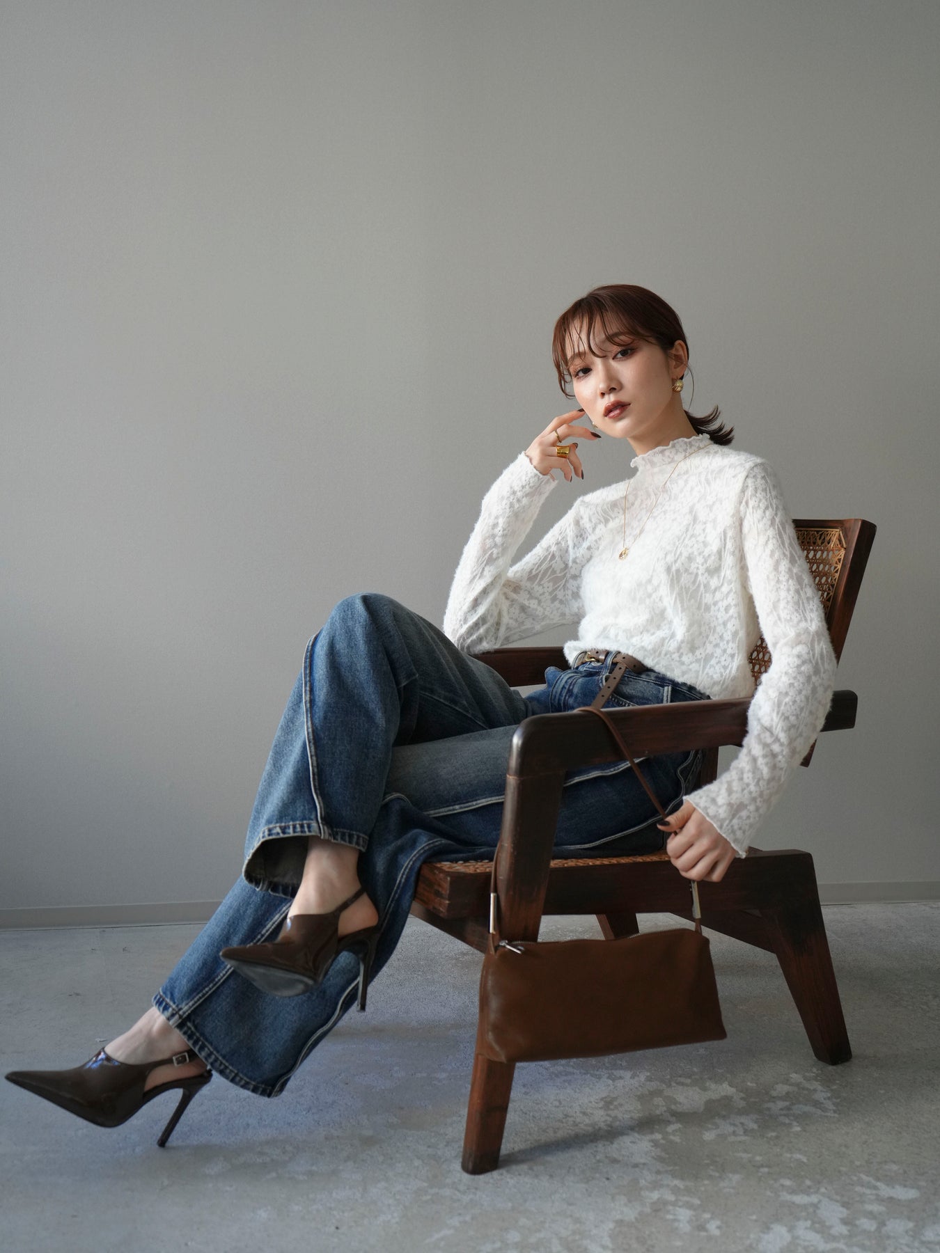 繊細なレースに起毛加工を施した、シーズンライクなプチネックトップス。 程よい透け感と柔らかな起毛の質感が、上品さとあたたかみを兼ね備えています。 ネックと裾、袖口のメローデザインがさりげないアクセントとなり、女性らしい印象に。 インナーとしてはもちろん、キャミソールやワンピースとのレイヤードにも活躍します。 1枚あると着こなしの幅が広がる、万能なレーストップスです。 ※ボトムス、キャミソール(インナー)以外の商品は一律でインナーは付属していません。